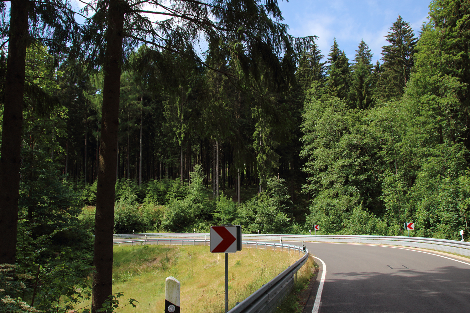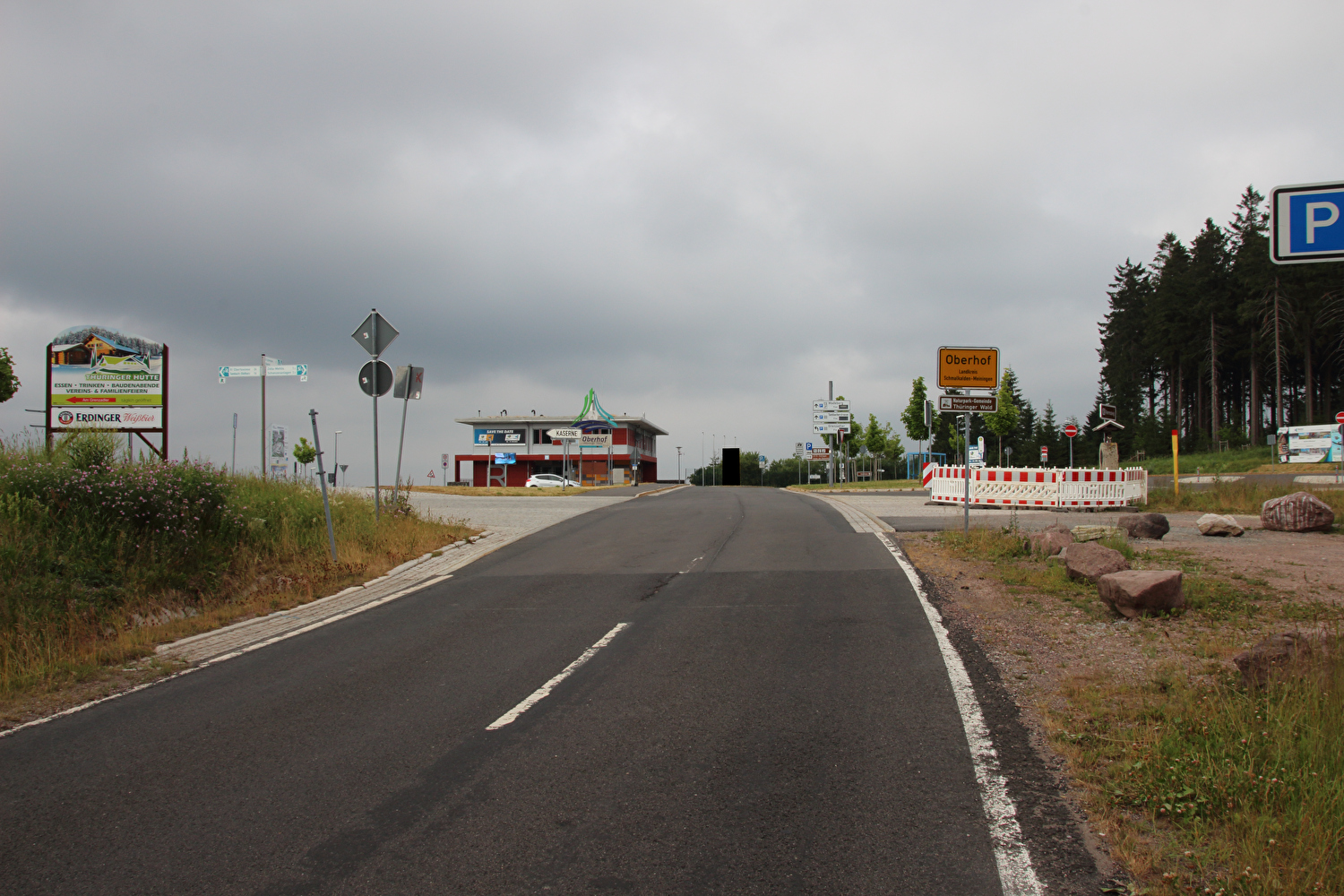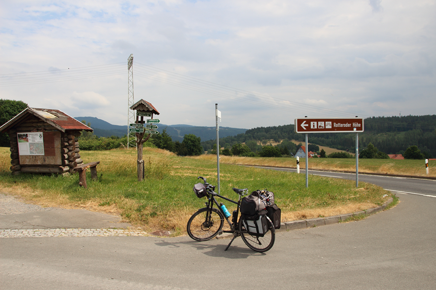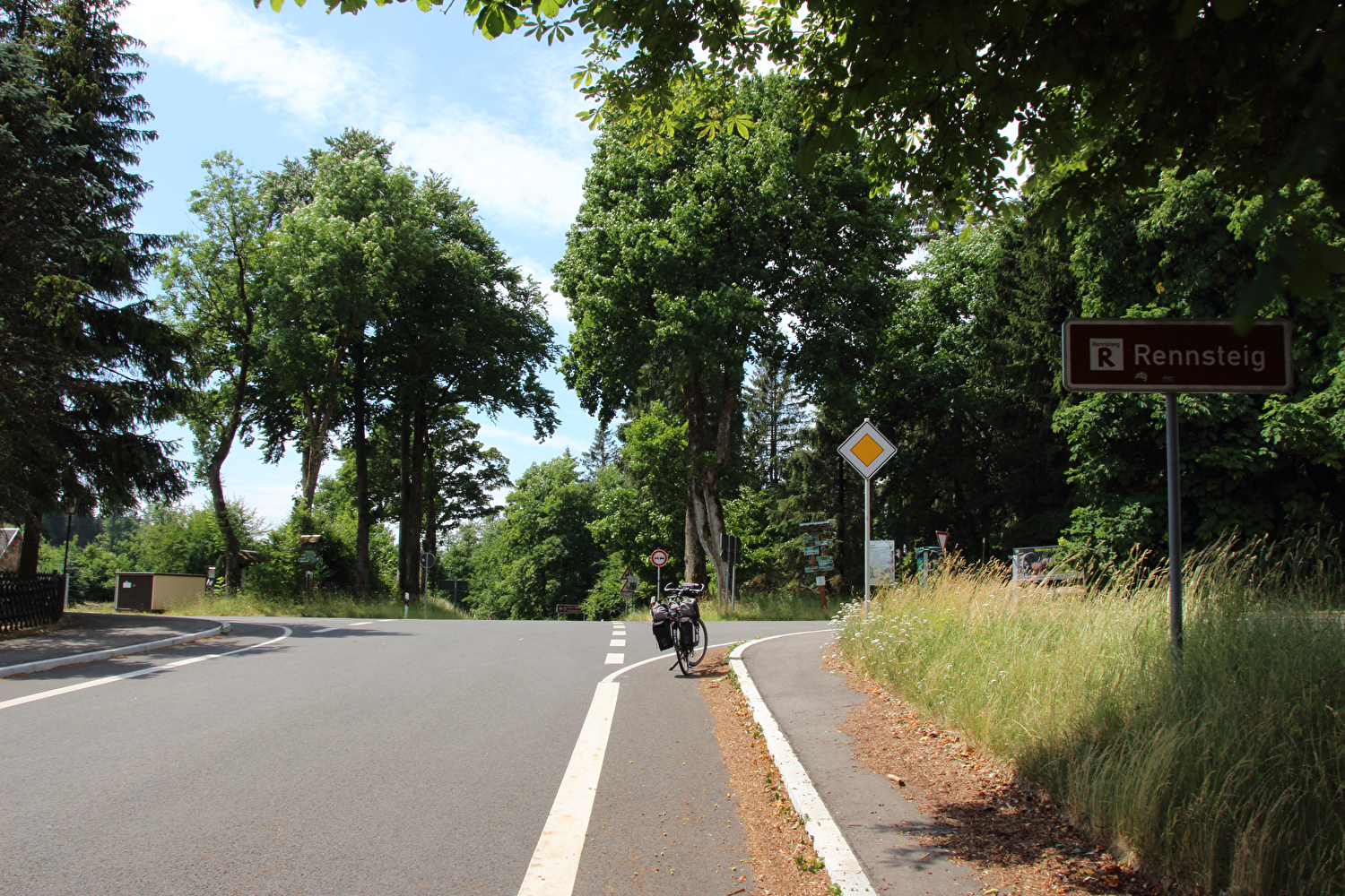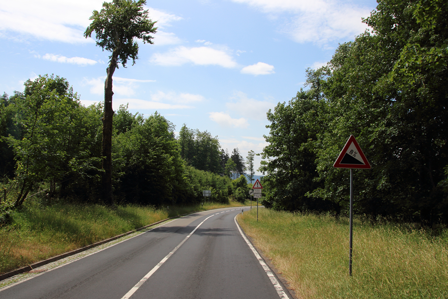Beschreibung | Der Himmel zeigte sich etwas wolkiger als am Vortag, was bei der Wärme vor allem bergauf ganz angenehm war. Immerhin stand die Königsetappe, also die Etappe mit den meisten Höhenmetern bergauf an. Kurz nach Etappenstart musste in Bad Tabarz einer Umleitung gefolgt werden. Wieder auf der geplanten Strecke führte die Etappe am Endpunkt Tabarz der Thüringerwaldbahn vorbei. Die Thüringerwaldbahn ist eine meterspurige Überlandstraßenbahn, die vom Straßenbahnetz Gotha ausgehend in Bad Tabarz endet. Das teilweise historisch anmutende Rollmaterial verkehrt im Regelbetrieb. Zwischen Bad Tabarz und Friedrichroda begann der erste Anstieg der Etappe. Auf der Passhöhe Heuberghaus wäre eigentlich Zeit zum Mittagessen gewesen, aber das dortige Restaurant war – mittlerweile wenig überraschend – geschlossen. Auch in den in der Abfahrt talwärts gelegenen Orten gab es kein einziges geöffnetes Restaurant. Somit blieb es bei einer geschmacklich grenzwertigen Bratwurst beim Fleischer neben einem Supermarkt in Floh-Seligenthal. Nach der Überquerung eines namenlosen Passes am Südrand von Struth-Helmershof gefolgt von einer kurzen kurvigen und recht steilen Abfahrt schloss sich der Anstieg zur Rotteroder Höhe an, der sich etwas in die Länge zieht. In Steinbach-Hallenberg war eine Sperrung der Straße nach Oberhof samt Umleitung über Zella-Mehlis ausgeschildert. Diese Umleitung hätte zusätzlich 8,8 km Strecke und 190 Höhenmeter bergauf mit sich gebracht, was zeitlich kaum zu schaffen gewesen wäre und zu einer Spätankunft in Oberhof geführt hätte. Daher wurde wie geplant weiter gefahren. Tatsächlich bestand die Straßensperrung aus einer ca. 300 m langen Straßenbaustelle am oberen Ende von Oberschönau, die schiebend passiert werden konnte und mit entsprechender Ortskenntnis hätte umfahren werden können. Im Bereich der „Schanzenanlage im Kanzlersgrund“, aber auch an einer Stelle im Bereich des Grenzadler war extrem aufdringlich Werbung für ein Produkt mit hohem Suchtpotential platziert, die in den Fotos geschwärzt ist. Nach der Überquerung der bereits in Oberhof liegenden Passhöhe Grenzadler, auf der auch ein „Grenzadler“, ein Grenzstein mit dem (historischen) preußischen Staatswappen steht, war das Abendessen wenigstens kein Problem. Oberhof war der erste Ort im Rahmen der Tour, der über ein breiteres gastronomisches Angebot verfügte. |