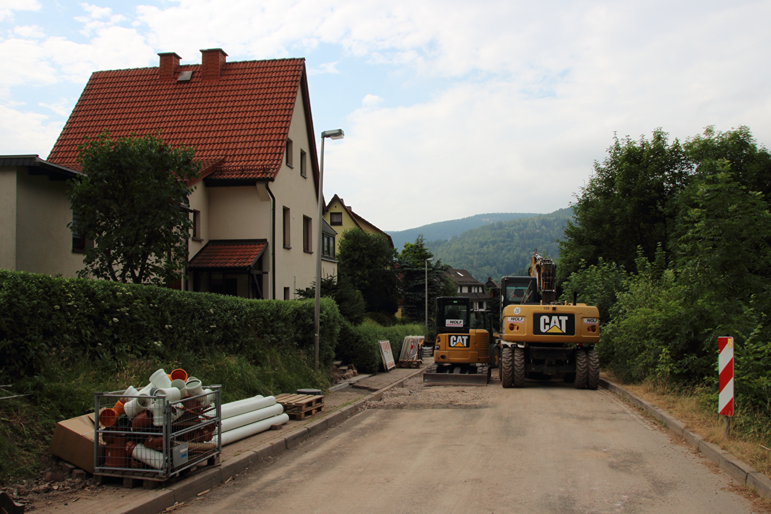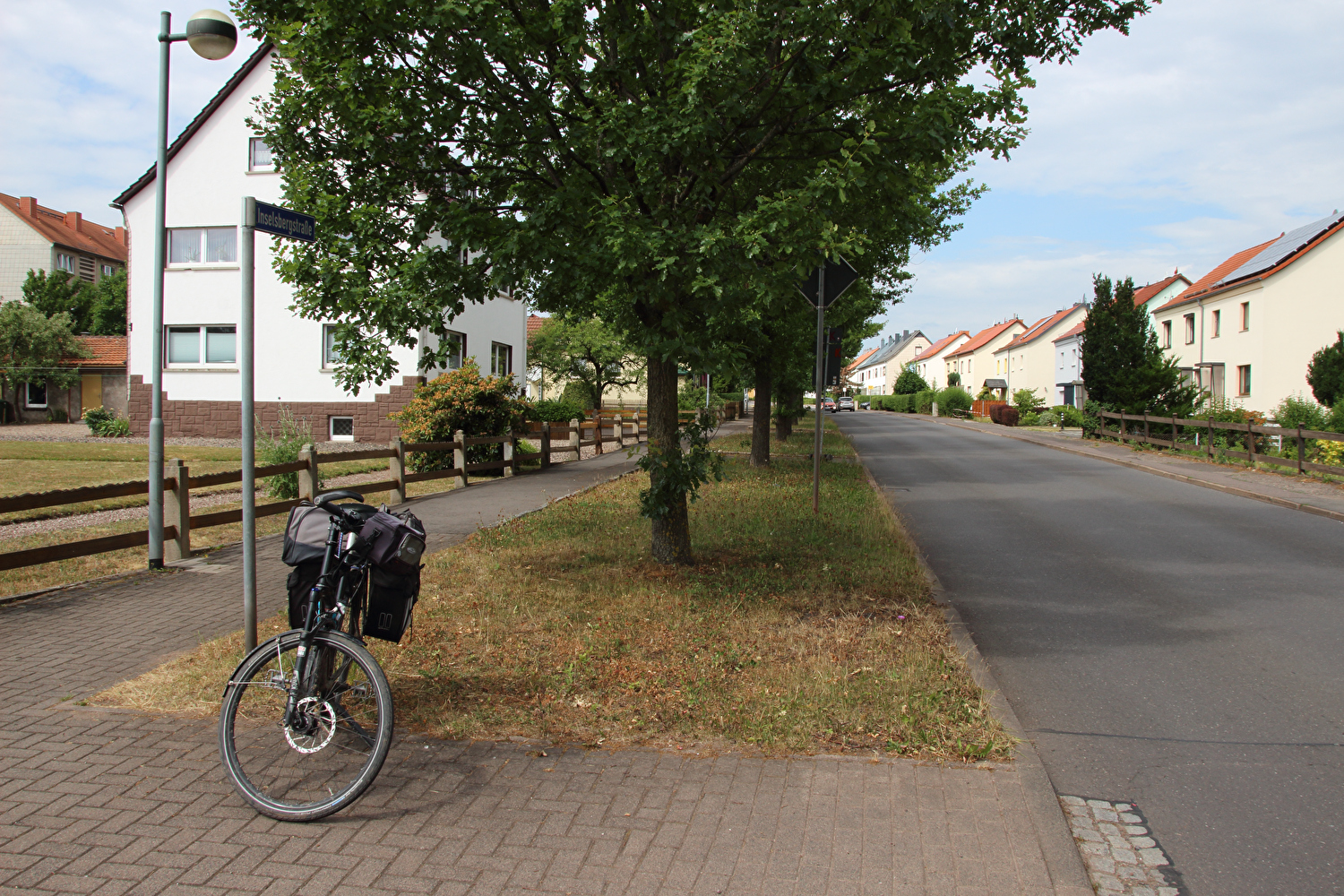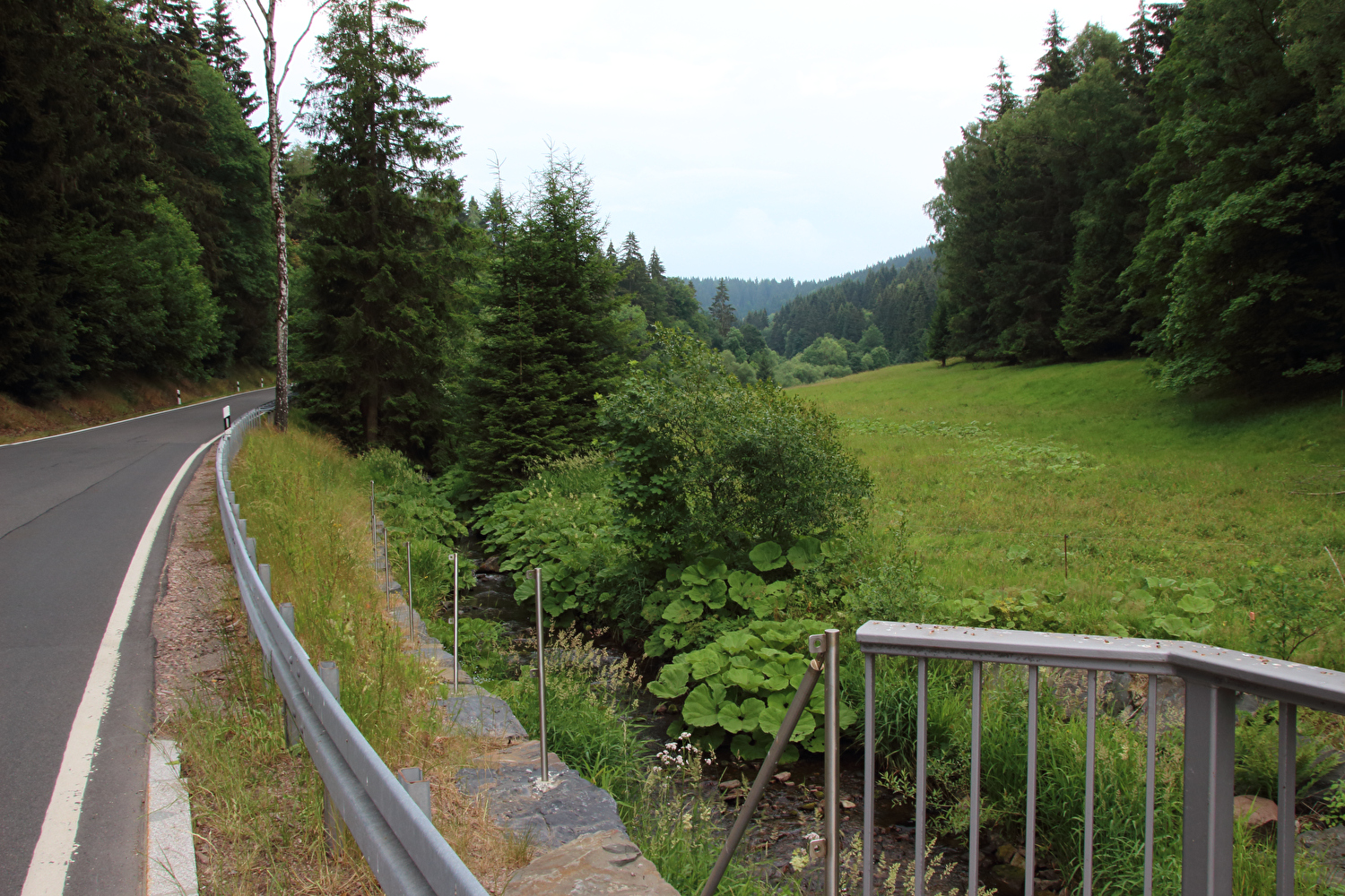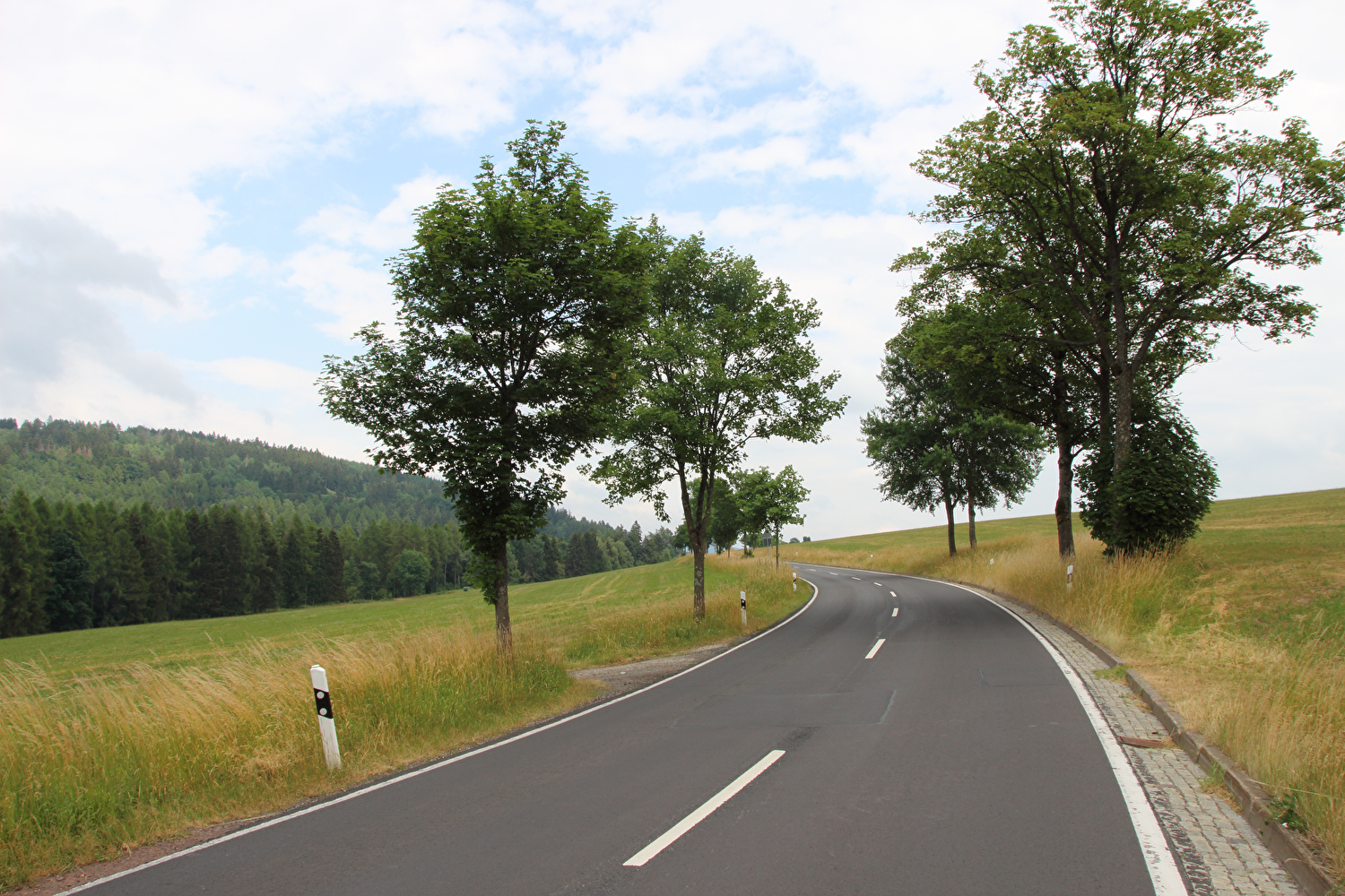 Beschreibung | Der Himmel zeigte sich etwas wolkiger als am Vortag, was bei der Wärme vor allem bergauf ganz angenehm war. Immerhin stand die Königsetappe, also die Etappe mit den meisten Höhenmetern bergauf an. Kurz nach Etappenstart musste in Bad Tabarz einer Umleitung gefolgt werden. Wieder auf der geplanten Strecke führte die Etappe am Endpunkt Tabarz der Thüringerwaldbahn vorbei. Die Thüringerwaldbahn ist eine meterspurige Überlandstraßenbahn, die vom Straßenbahnetz Gotha ausgehend in Bad Tabarz endet. Das teilweise historisch anmutende Rollmaterial verkehrt im Regelbetrieb. Zwischen Bad Tabarz und Friedrichroda begann der erste Anstieg der Etappe. Auf der Passhöhe Heuberghaus wäre eigentlich Zeit zum Mittagessen gewesen, aber das dortige Restaurant war – mittlerweile wenig überraschend – geschlossen. Auch in den in der Abfahrt talwärts gelegenen Orten gab es kein einziges geöffnetes Restaurant. Somit blieb es bei einer geschmacklich grenzwertigen Bratwurst beim Fleischer neben einem Supermarkt in Floh-Seligenthal. Nach der Überquerung eines namenlosen Passes am Südrand von Struth-Helmershof gefolgt von einer kurzen kurvigen und recht steilen Abfahrt schloss sich der Anstieg zur Rotteroder Höhe an, der sich etwas in die Länge zieht. In Steinbach-Hallenberg war eine Sperrung der Straße nach Oberhof samt Umleitung über Zella-Mehlis ausgeschildert. Diese Umleitung hätte zusätzlich 8,8 km Strecke und 190 Höhenmeter bergauf mit sich gebracht, was zeitlich kaum zu schaffen gewesen wäre und zu einer Spätankunft in Oberhof geführt hätte. Daher wurde wie geplant weiter gefahren. Tatsächlich bestand die Straßensperrung aus einer ca. 300 m langen Straßenbaustelle am oberen Ende von Oberschönau, die schiebend passiert werden konnte und mit entsprechender Ortskenntnis hätte umfahren werden können. Im Bereich der „Schanzenanlage im Kanzlersgrund“, aber auch an einer Stelle im Bereich des Grenzadler war extrem aufdringlich Werbung für ein Produkt mit hohem Suchtpotential platziert, die in den Fotos geschwärzt ist. Nach der Überquerung der bereits in Oberhof liegenden Passhöhe Grenzadler, auf der auch ein „Grenzadler“, ein Grenzstein mit dem (historischen) preußischen Staatswappen steht, war das Abendessen wenigstens kein Problem. Oberhof war der erste Ort im Rahmen der Tour, der über ein breiteres gastronomisches Angebot verfügte. |