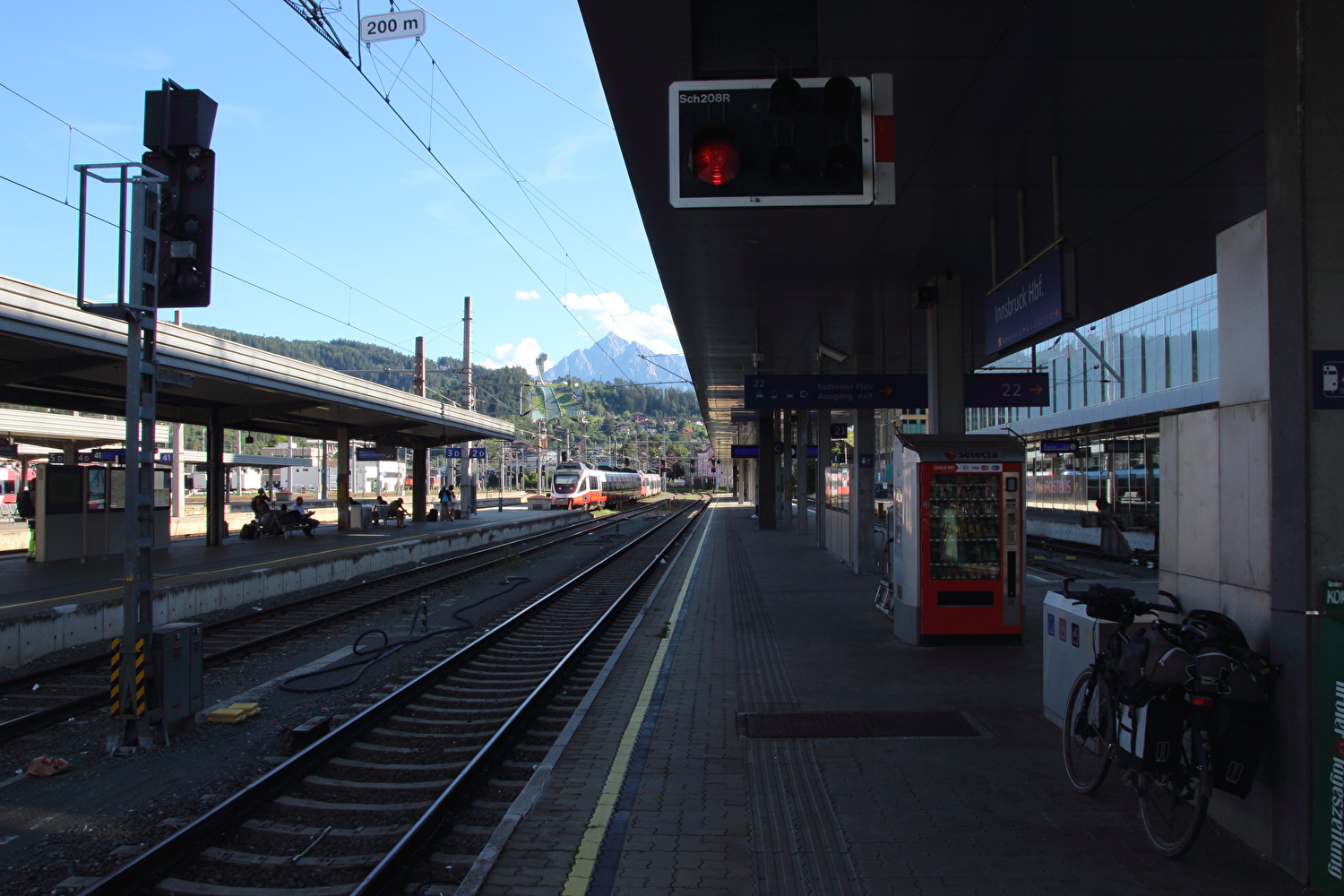 Beschreibung | Eigentlich sollte diese Tour in Mittenwald starten, aber da hatte die Bahn etwas dagegen. Am 03.06.2022 hatte sich auf der Bahnstrecke München–Garmisch-Partenkirchen zwischen Farchant und Garmisch-Partenkirchen ein Unfall ereignet, dessen Schäden an der Strecke noch nicht beseitigt worden waren. Als Endpunkt für die Züge war Oberau ausgewiesen worden. Zudem war die Mittenwaldbahn wegen irgendeiner Baumaßnahme zwischen Garmisch-Partenkirchen und Mittenwald gesperrt. Der Schienenersatzverkehr, also Busse zwischen Oberau und Mittenwald war ohne Fahrradmitnahme ausgewiesen. Somit wäre ein Prolog von Oberau nach Mittenwald zu fahren gewesen. 26,2 km mit 339 Höhenmetern bergauf wären machbar gewesen. Dann kamen aber wenige Wochen vor Tourstart die Bahngesellschaften auf deutscher Seite (Bahnstrecke München–Garmisch-Partenkirchen) und österreichischer Seite (Mittenwaldbahn) auf den Bolzen wegen der schon bestehenden Streckensperrungen noch weitere Streckenabschnitte für Bausmaßnahmen zu sperren. Als Endpunkt für die Züge war nun Murnau ausgewiesen worden. 42,9 km mit 371 Höhenmetern bergauf wären als Prolog mit Start am Nachmittag zu lang gewesen. Von Österreich aus wäre Mittenwald ab Innsbruck Hbf. auch nur mit Schienenersatzverkehr und entsprechend langer Fahrzeit, immerhin mit Fahrradmitnahme erreichbar gewesen. Daher wurde entschieden, die Anreise nach Innsbruck Hbf. umzubuchen, was immerhin noch möglich war und auch deshalb ging, weil das Quartier in Mittenwald kostenfrei storniert werden konnte und in Innsbruck ein Quartier gebucht werden konnte. Die Bahnfahrten verliefen einigermaßen pünktlich, alle Anschlüsse wurden erreicht. Während bis Kufstein nur Masken in den Zügen saßen, saßen ab Kufstein wieder Menschen in den Zügen. In Österreich galt kein Maskentragezwang in den Zügen. Trotzdem war Österreich nicht gerade dabei sich auszurotten. In Innsbruck wurde zunächst das Quartier, das kein Restaurant betrieb, angefahren. Das Restaurant im Einkaufszentrum gegenüber war schon geschlossen. Da es auch in unmittelbarer Nähe kein weiteres Restaurant gab, wurde nochmal zurück in die Innenstadt gefahren, um dort etwas zu essen. Die Innenstadt war sehr voll. Die Coronaviruspandemie spielte da keine Rolle mehr. In den Gassen der Innenstadt und damit auch im Restaurant stand die Hitze des Tages. Und wieder eine FFP2-Maske für die Tonne … ☹ |
