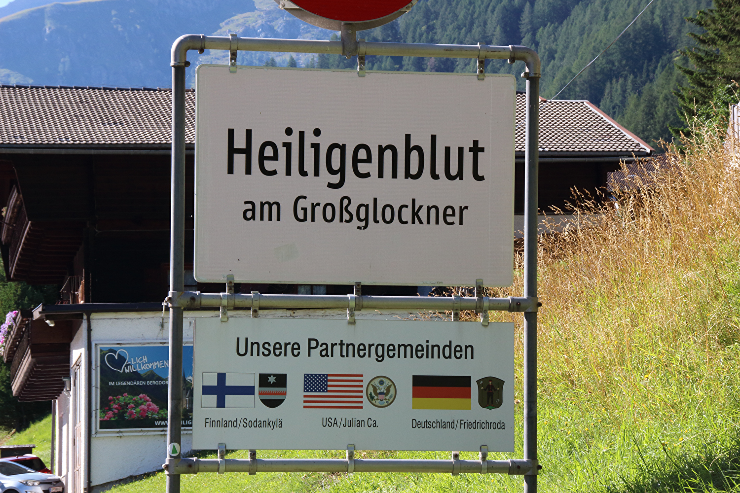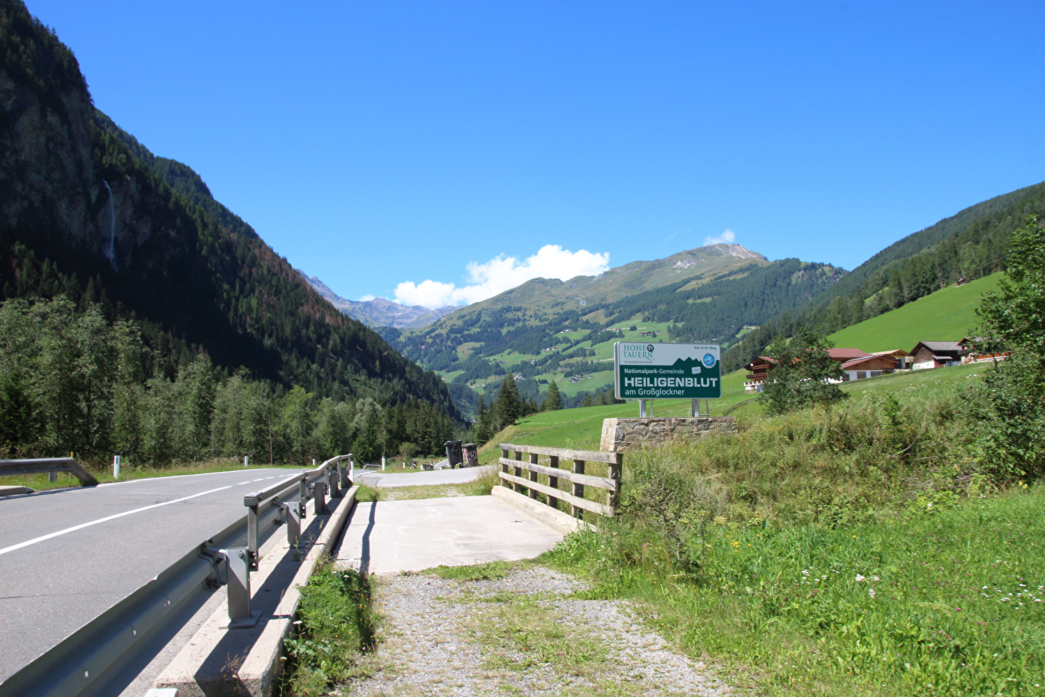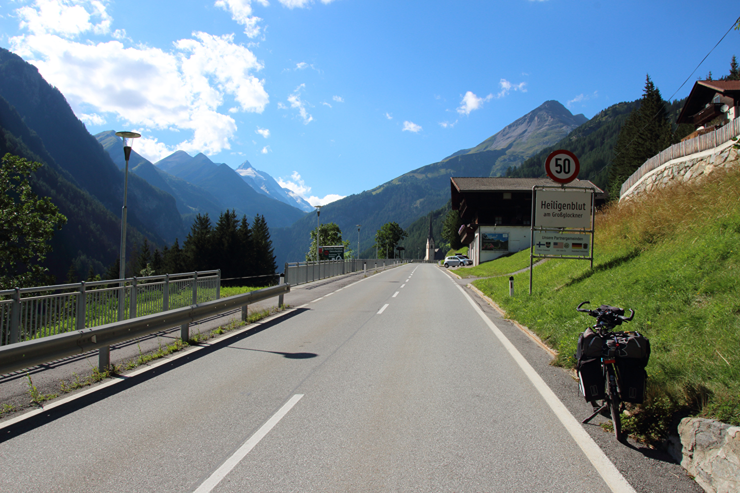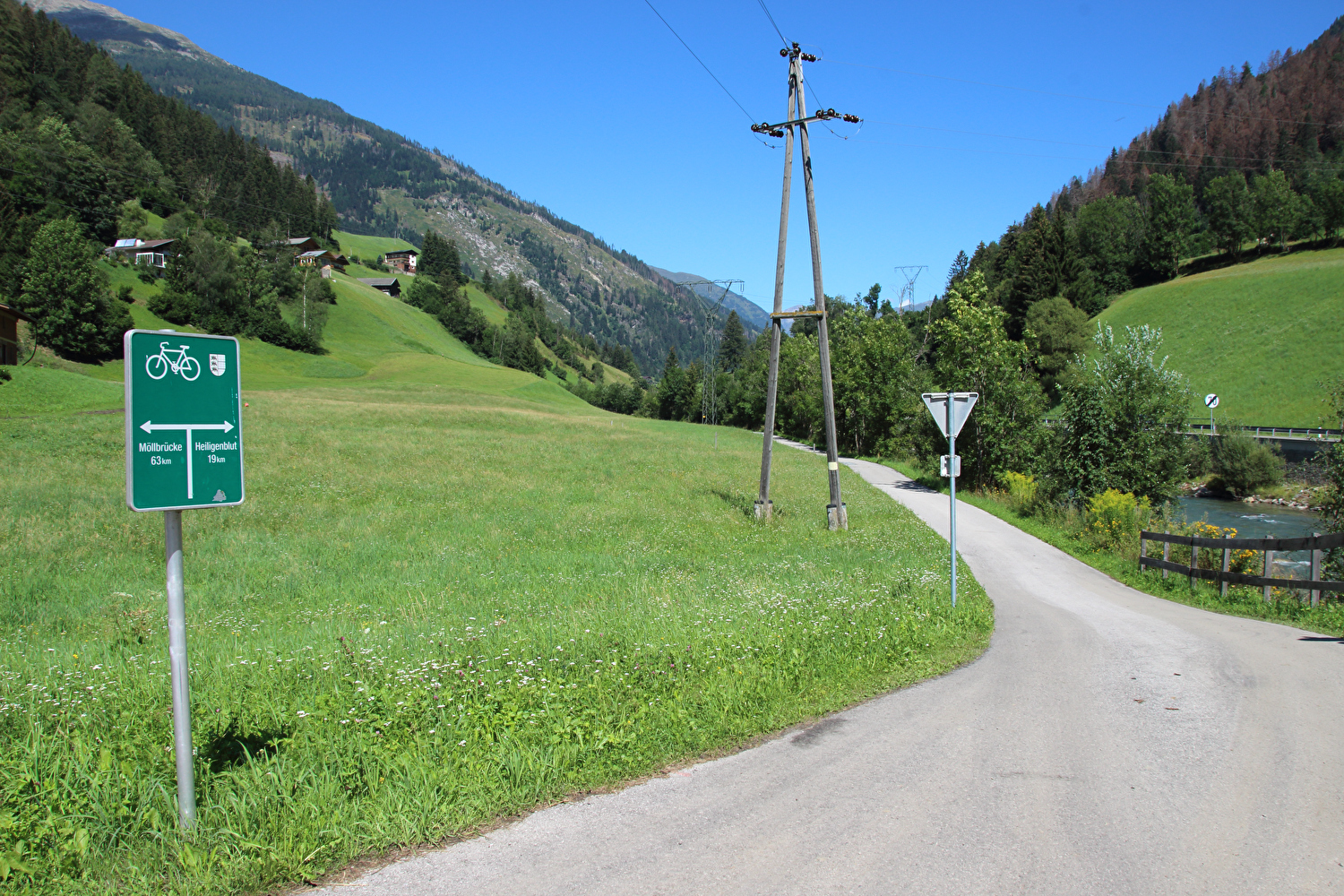 Beschreibung | Über Nacht hatte sich eine Hochdruckwetterlage eingestellt. Der Tag begann sonnig und dabei blieb es auch. Der erste Abschnitt der Etappe bis zum Iselsbergpass war schon einmal am 07.08.2014 gefahren worden. Dieses Mal wurde der Iselsbergpass komplett überquert. Die Nordrampe des Iselsbergpasses fällt mitunter sehr steil nach Winklern im Mölltal ab. Winklern ist der südliche Talort des Hochtors, dessen (natürliche) Passhöhe von der Großglockner-Hochalpenstraße mit einem Scheiteltunnel (Passhöhe der Straße) unterquert wird. Alle von Winklern aus erreichbaren höher und weiter nördlich gelegenen Orte können auf der Straße nur nach Winklern oder über das Hochtor verlassen werden. Vom Etappenstart bis zur Möllbrücke nördlich von Winklern wurde auf der Großglocknerstraße, die in Kärnten „Großglockner Straße (B 107)“ genannt wird, gefahren. Danach wurde auf den „Glockner Radweg R8“, auch Mölltalradweg genannt, gewechselt, der in diesen Abschnitt asphaltiert ist. In Großkirchheim wurde dieser Radweg wieder verlassen, da der Fahrbahnbelag von Asphalt auf Schotter wechselt. Der Rest der Etappe wurde auf der „Großglockner Straße (B 107)“ fortgesetzt. Von Pockhorn aus wurde der Großglockner, der mit einer Höhe von 3798 m.ü.A. höchste Berg Österreichs, sichtbar. Unter dem Ortsschild Heiligenblut findet sich unter anderem der Hinweis auf die Partnergemeinde Friedrichsroda. Dieser Ort war am 29.06.2022 bergauf fahrend durchquert worden. Am unteren Ortseingang in Friedrichsroda findet sich ein entsprechender Hinweis auf Heiligenblut. Damals stand bereits die Planung der Alpenfahrradtour, aber sie war eben noch nicht gefahren worden, weshalb Heiligenblut bei der damals gefahrenen Etappe nicht erwähnt wird. Die Etappe endete mit der fünften Bergankunft im Rahmen der Tour. Beim Fußweg vom Quartier zum Abendessen in einem Restaurant zeigte sich, dass Heiligenblut in den Hang gebaut wurde. |