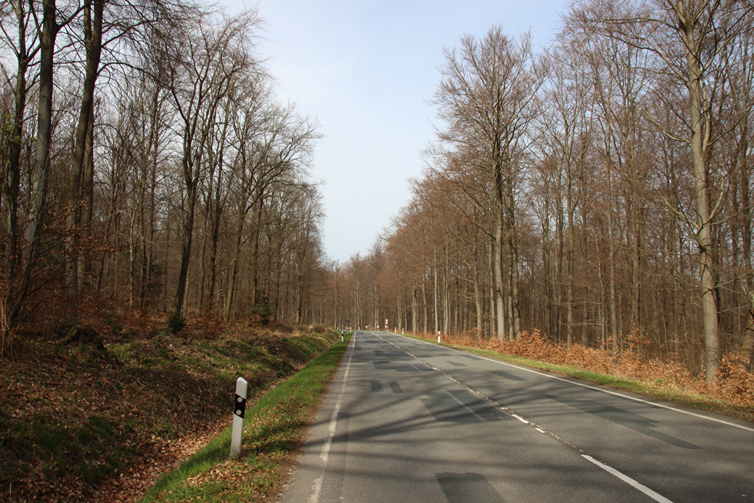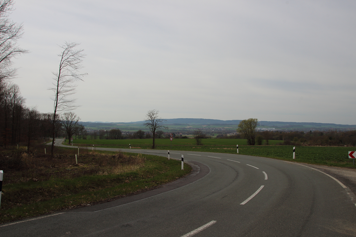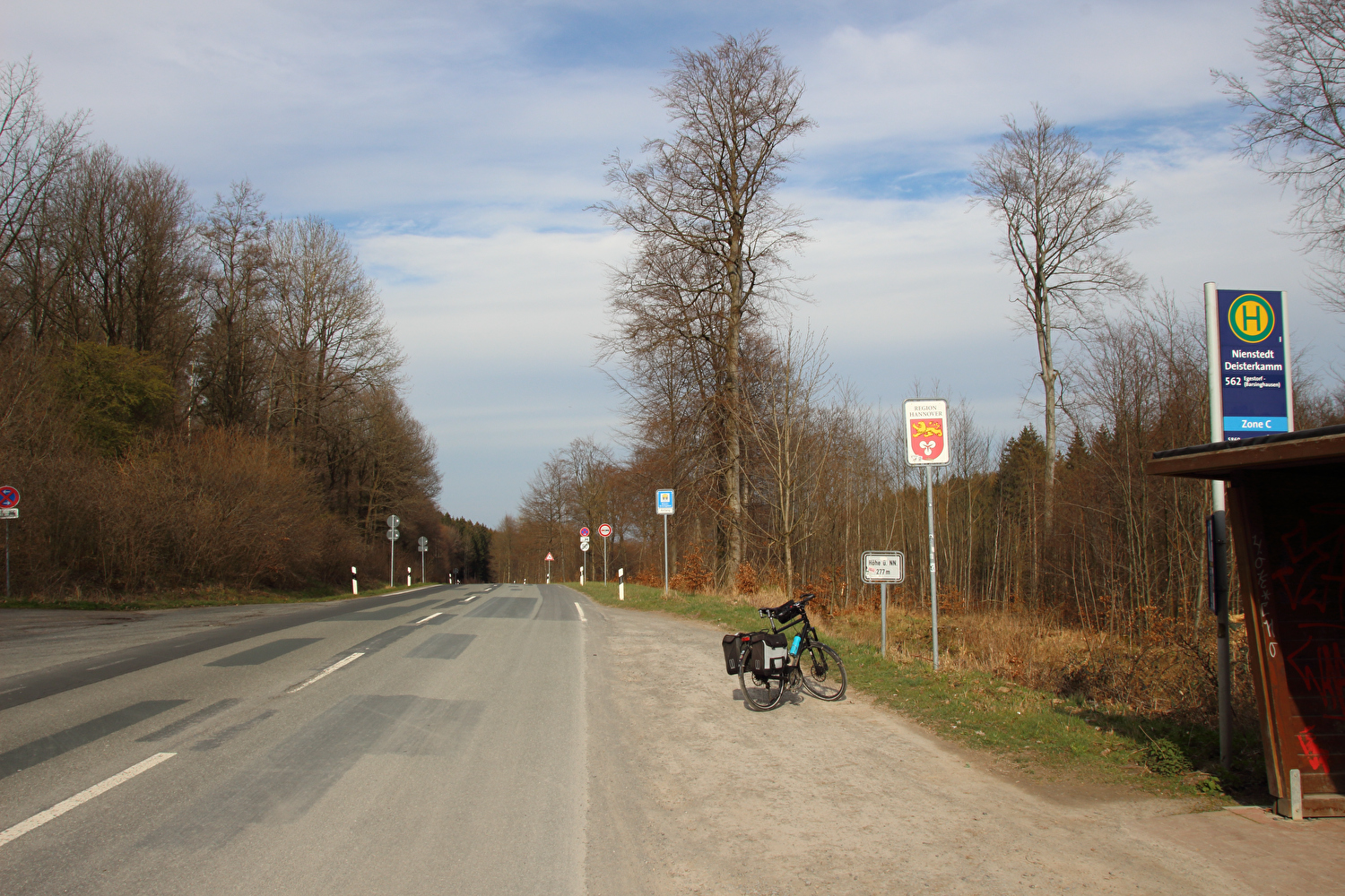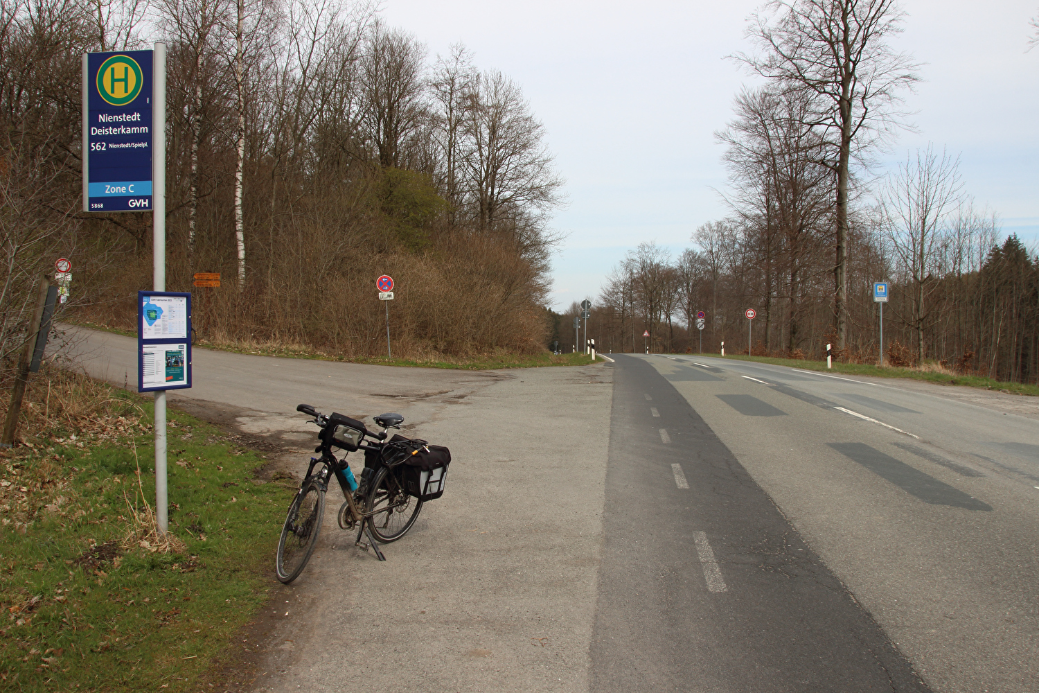 Beschreibung | Diese Tour sollte eigentlich weiter südlich im Leinebergland gefahren werden, aber die Bahnen feierten mal wieder Chaostage. Für den für die Anreise nach Kreiensen geplanten Regionalexpress wurden bei der Ankunft im Hauptbahnhof Hannover 40 min Verspätung angezeigt. Kurz darauf wechselte die Anzeige auf „Zug fällt aus“. Der fahrplanmäßig eine Stunde später verkehrende Zug wurde gleich mit 30 min Verspätung angezeigt. Damit hatte sich eine Tour mit Bahnanreise erledigt. ☹ Deshalb wurde am Hauptbahnhof auf eine Deistertour ohne Bahnfahrt(en) umgeplant, da diese wenigstens entsprechend Höhenmeter bergauf bot und zudem ohne Zuhilfenahme einer Landkarte gefahren werden konnte. Nach der lästigen Ausfahrt aus der Stadt gen Westen wurden Benther Berg und Gehrdener Berg überquert, um letztlich über den Nienstedter Pass und die dahinter liegenden Orte Nienstedt, Messenkamp und Eimbeckhausen zu fahren. Ab dem Nienstedter Pass hat diese Route etwa die Form eines Triangels. Die Orte Nienstedt, Messenkamp und Eimbeckhausen bilden die Ecken des Triangels, wobei Nienstedt im oberen Winkel liegt und dieses Triangel am Nienstedter Pass aufgehängt ist. Die Straße zwischen Eimbeckhausen und Nienstedt ist trotz des recht geringen Höhenunterschieds von nur 113 m zwischen ihrem unteren Ende in Eimbeckhausen und der namenlosen Passhöhe als für Zugtiergespanne taugliche Bergstrecke mit insgesamt zehn Kehren trassiert. Acht dieser Kehren liegen zwischen Eimbeckhausen und Passhöhe. Mit dem Nienstedter Pass wurde das „Dach der Tour“ an diesem Tag zweimal überquert. Die Tour startete bei sonnigem Wetter. Im Tagesverlauf zogen vermehrt Wolken auf, zunächst Federwolken, dann Schleierwolken und zum Ende der Tour hin Schichtwolken, welche die Sonne schließlich vollständig verdeckten. Während sich die größeren Laubbäume noch kahl zeigten, war an Sträuchern und jungen Bäumen teilweise erster Laubaustrieb zu erkennen. |