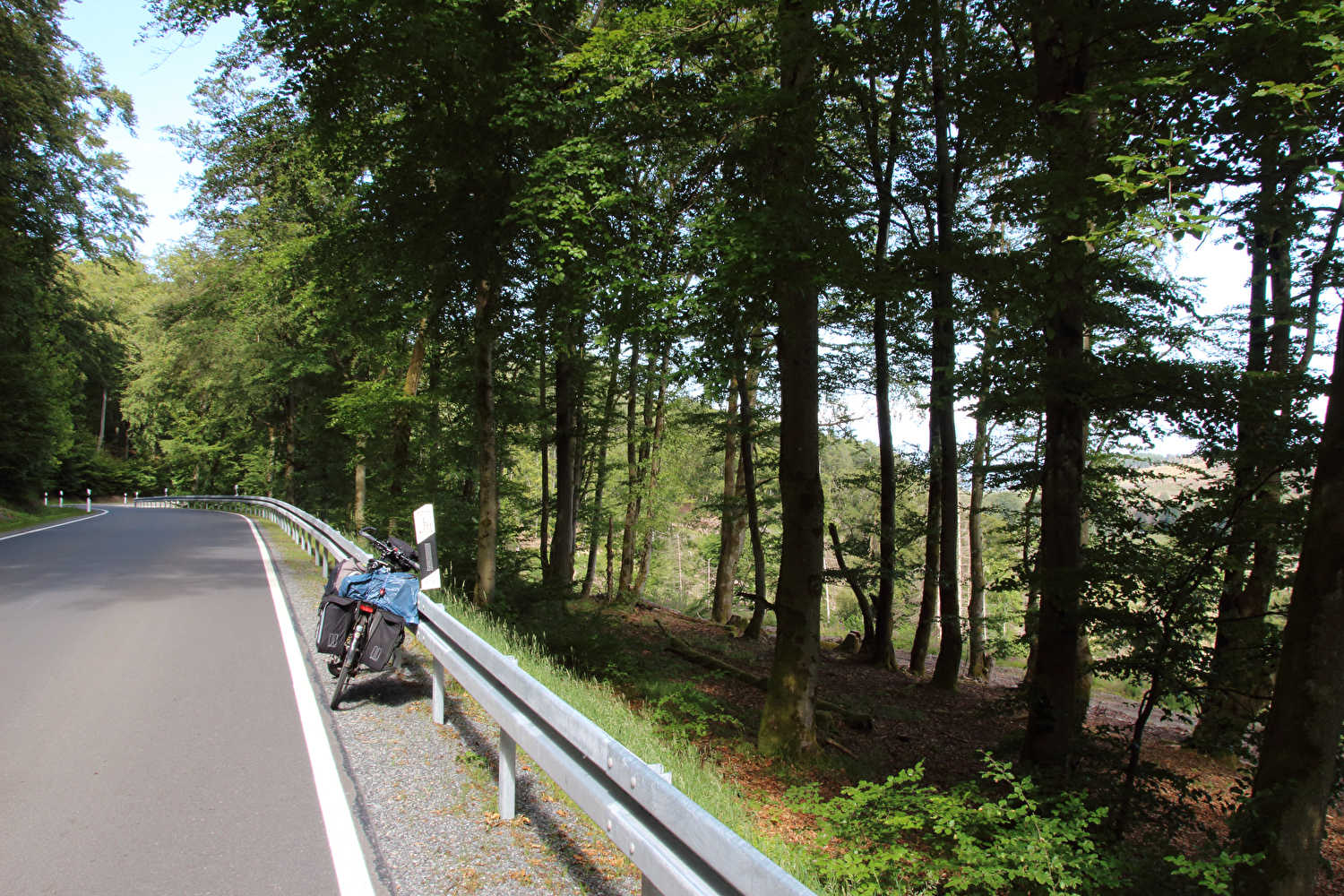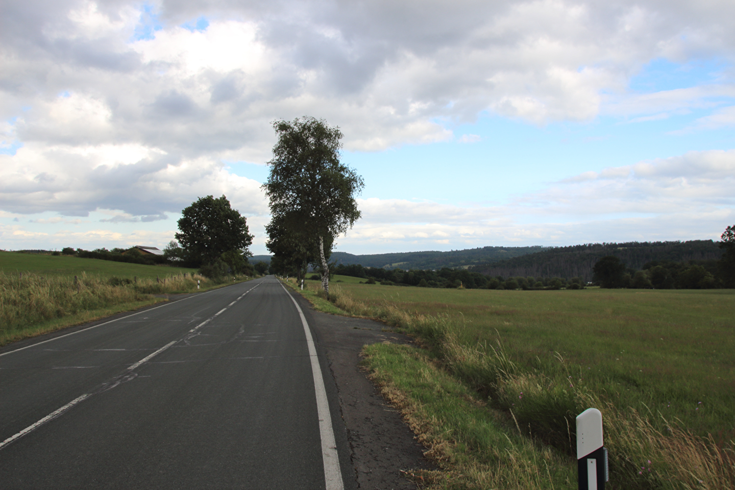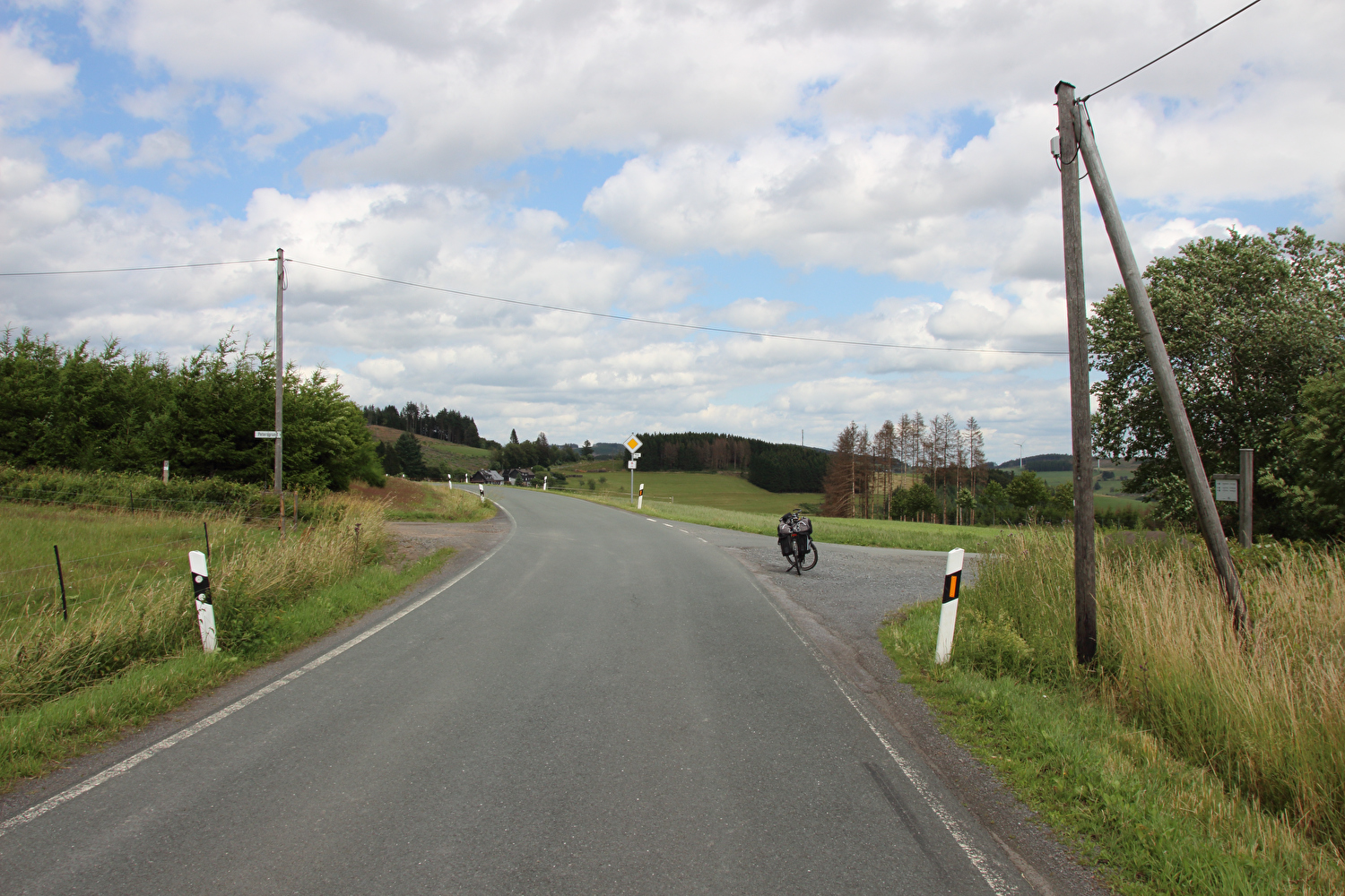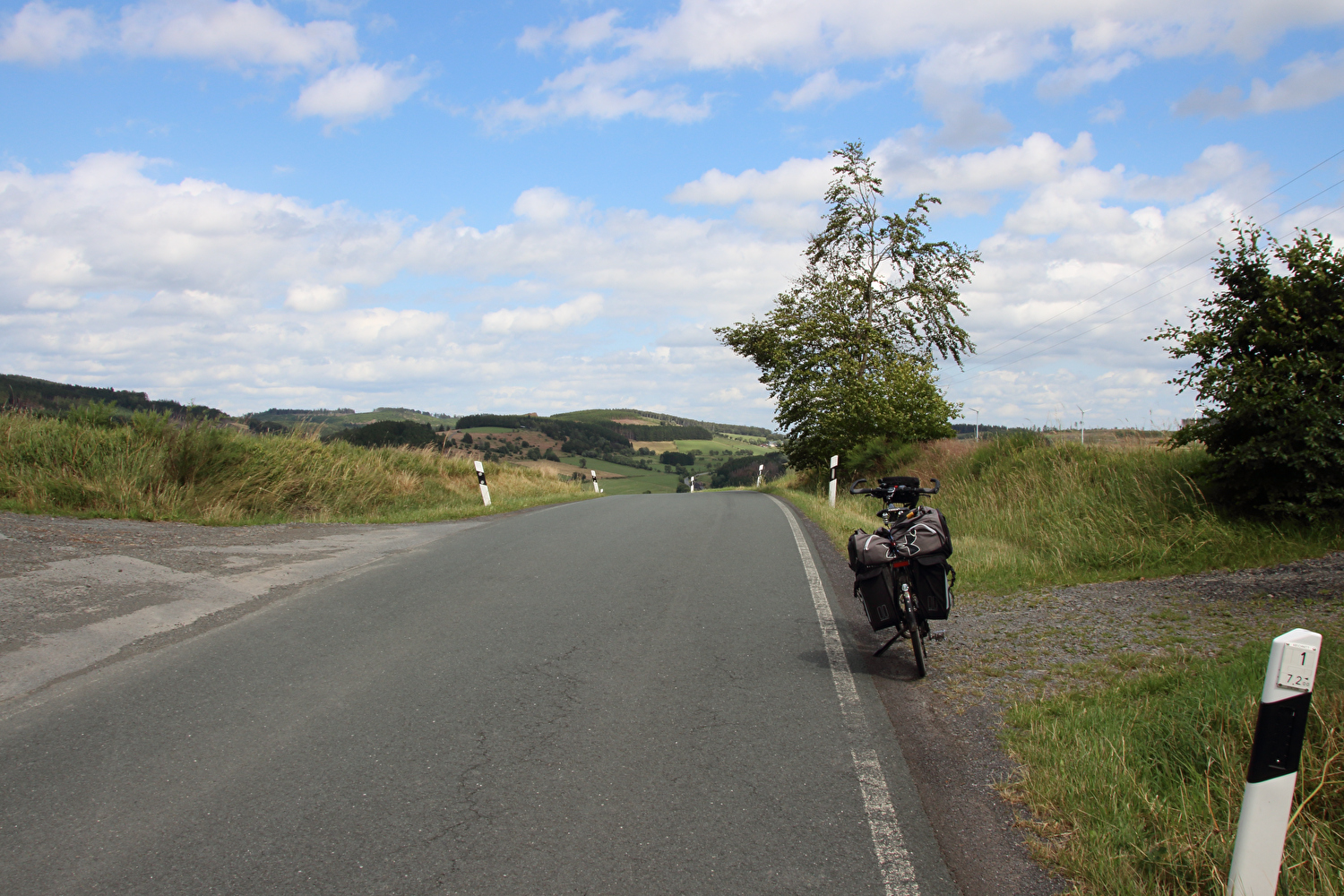 Beschreibung | Über Nacht war ein Sturmtief durchgezogen. Der damit gekommene Regen hörte am Morgen auf. Der starke Wind lies jedoch erst zum Abend hin etwas nach. Die Etappe begann bei bedecktem Himmel. Für die Jahreszeit war es zu kalt. Erst gegen Mittag zeigten sich erste Wolkenlücken. Wenigstens blieb es die meiste Zeit trocken. Am Nachmittag fiel ein kurzer Regenschauer. Zum Abend hin zeigte sich vermehrt die Sonne und kündigte den kommenden Wetterwechsel an. Wegen des Wetters startete die Etappe recht spät. Auf dem Kahlen Asten kam auch keine Eile auf. Die Schotterpiste vom Gipfelrundweg zur Lennequelle wurde zu Fuß gegangen. Der recht grobe Schotter in Kombination mit einer mittleren Neigung von knapp 8 % ist für Reiseräder wenig geeignet. Es gibt zwei Flüsse mit dem Namen „Lenne“ in Deutschland. Die längere und wasserreichere Lenne mündet in die Ruhr, die kürzere und wasserärmere in die Weser. Zur Unterscheidung werden die Flüsse daher auch Lenne (Ruhr) und Lenne (Weser) genannt. Im Rahmen dieser Tour ist mit „Lenne“ die Lenne (Ruhr) gemeint. Wie oft an diesem Tag die Rhein-Weser-Wasserscheide überquert wurde, bleibt unklar, da mit Ausnahme der Lenne im Gipfelbereich des Kahlen Asten und auch im Bereich der Straße zum Gipfel keine Fließgewässer vorhanden sind. Im Rahmen dieser Tour erfolgte die letzte Überquerung der Rhein-Weser-Wasserscheide im Bereich des Einmündung der L640 auf die B236/B480 zwischen dem Kahlen Asten und Neuastenberg bzw. Winterberg in der anderen Fahrtrichtung. Der Rest der Tour verlief auf der „Weserseite“ der Wasserscheide, genauer eingegrenzt im Einzugsbereich der Eder. Wegen des starken Windes, der in der Abfahrt von Neuastenberg die meiste Zeit von vorne blies, zog sich diese Abfahrt in die Länge. Im oberen steileren Bereich musste die Geschwindigkeit zur Aufrechterhaltung der Fahrsicherheit reduziert werden. Im unteren flacheren Bereich wurde der Hangabtrieb vom Gegenwind praktisch kompensiert, was zu einer geringeren Geschwindigkeit führte. Ab Wemlighausen wechselte die Fahrtrichtung nach Osten, womit der Wind nicht mehr von vorne blies. Zum Ausgleich dafür ging es erst mal wieder bergauf. Im Weiler Kraftsholz liegen einige Steilstücke mit mehr als 10 % Steigung, in denen geschoben wurde. Der namenlose Pass im Verlauf der K51 östlich von Landebach ist trotz der geringen Höhendifferenz zu Landebach topografisch eine Passhöhe. Diese Passhöhe, die Passhöhe Kraftsholz und das dazwischen in einer Senke liegende Landebach würden im Hochgebirge sicherlich zu einer „ausgedehnten“ Passhöhe zusammen gefasst werden. Das Sauerland ist aber schon lange kein Hochgebirge mehr. Die Passhöhe im Verlauf der L717 östlich von Wunderthausen ist recht unauffällig, was unter anderem daran liegt, dass die L717 östlich der Passhöhe noch weiter ansteigt, um dann vom unauffälligen Sattelpunkt nach Hallenberg abzusteigen. Bei Hallenberg, das im dort im in Nord-Süd-Richtung verlaufenden Nuhnetal liegt, wechselt die Landschaft recht abrupt. Das Nuhnetal trennt hier das Hochsauerland im Westen vom Ostsauerländer Gebirgsrand. Mit dem Verlassen des Hochsauerlandes endete der landschaftlich schönste Teil der Tour. In Hallenberg wurde per Schild auf eine Straßensperrung hingewiesen, die die geplante Route betraf. Aus Zeitgründen wäre die geplante Route über Liesen, Hesborn und Dreislar aber ohnehin problematisch geworden, weshalb ohne lange Überlegung direkt nach Braunshausen weiter gefahren wurde. Nach der Überquerung der Nuhne lauerte in Rengershausen noch ein zu schiebendes Steilstück. Oberhalb von Rengershausen bot sich ein erster Weitblick über den Ostsauerländer Gebirgsrand zum Hochsauerland. Die Breite Struth ist ziemlich breit und auch recht wellig. Somit zog sich die Fahrt bis Frankenberg (Eder) noch ziemlich hin und die Ankunft erfolgte recht spät. |