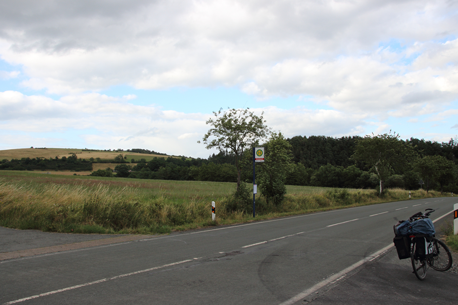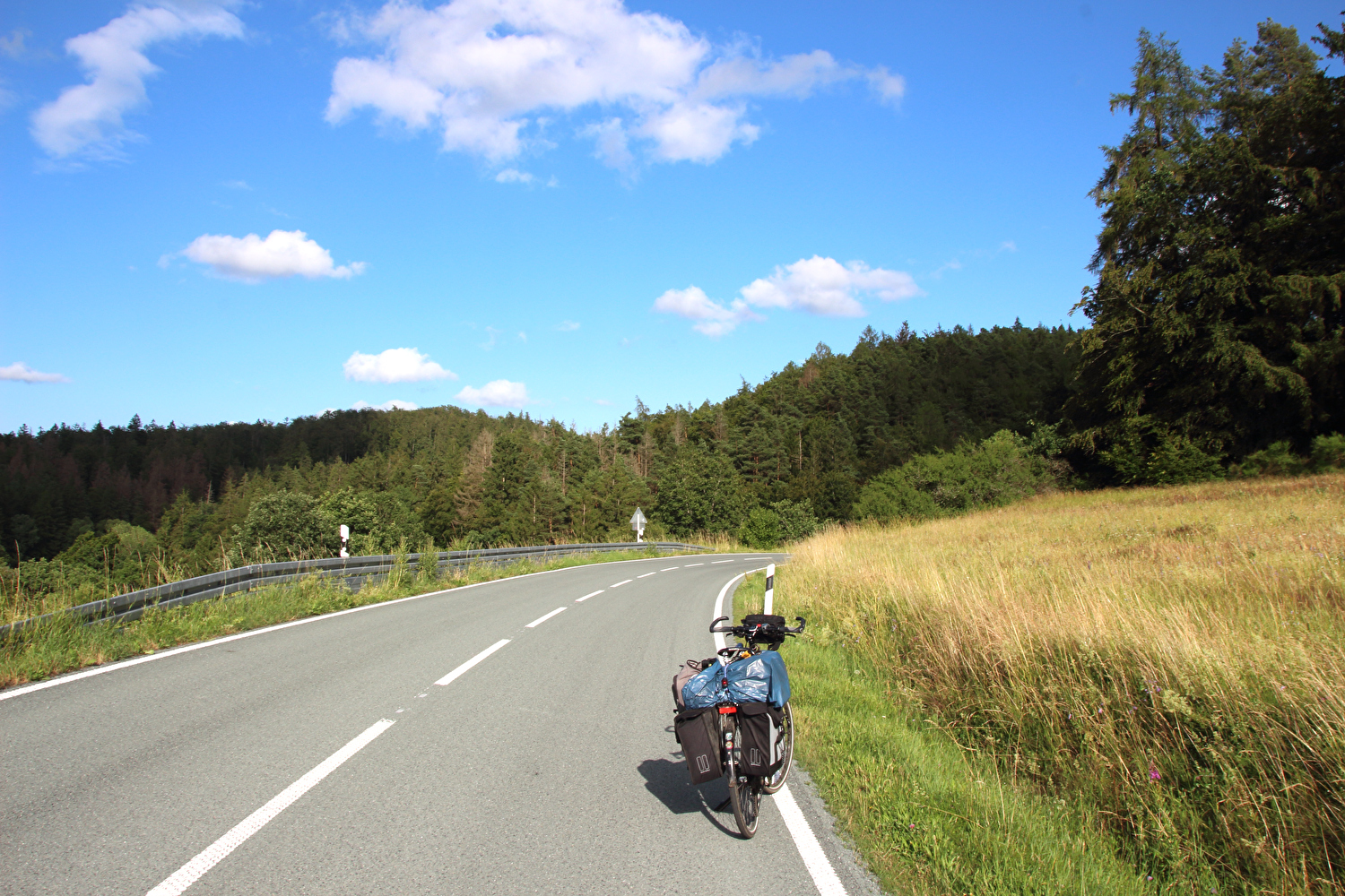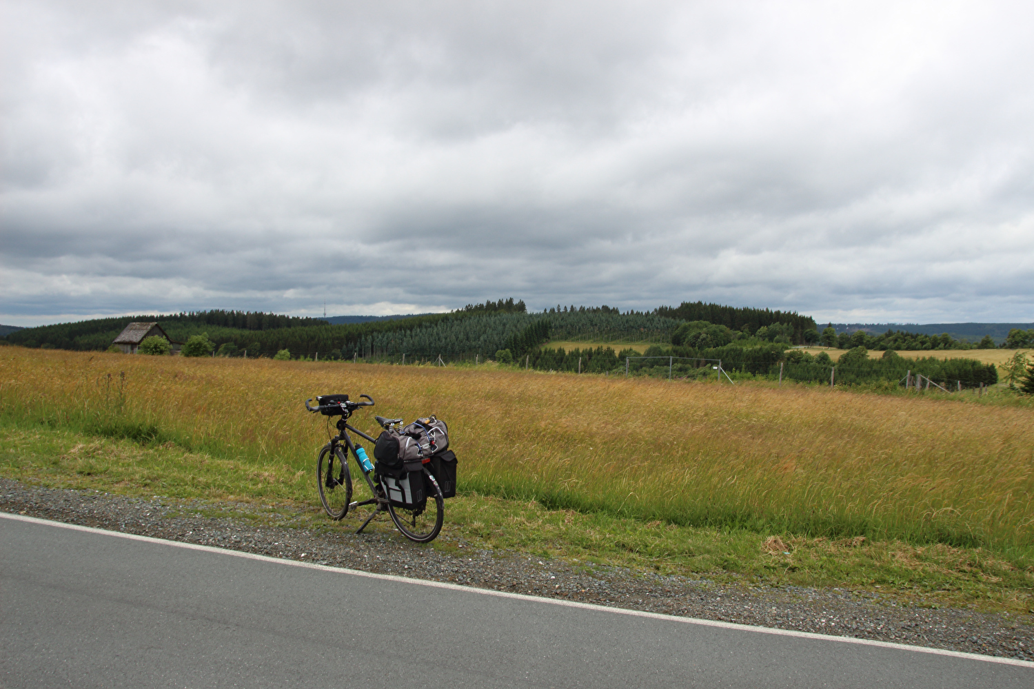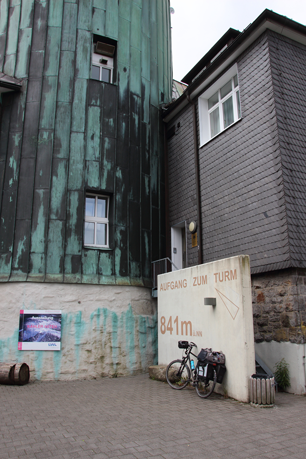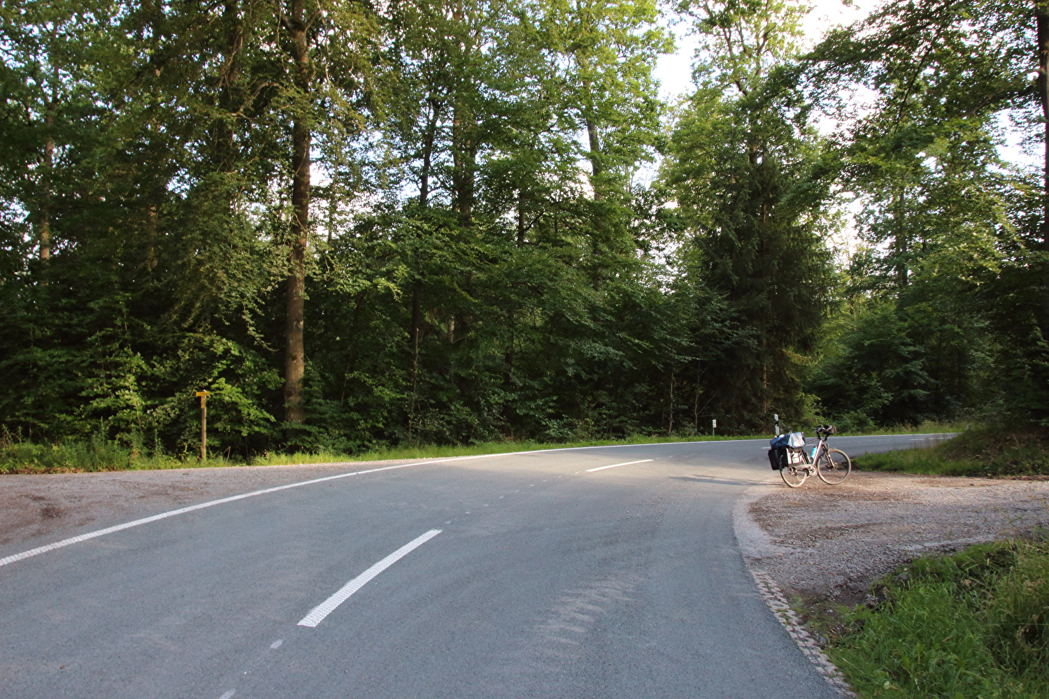Beschreibung | Über Nacht war ein Sturmtief durchgezogen. Der damit gekommene Regen hörte am Morgen auf. Der starke Wind lies jedoch erst zum Abend hin etwas nach. Die Etappe begann bei bedecktem Himmel. Für die Jahreszeit war es zu kalt. Erst gegen Mittag zeigten sich erste Wolkenlücken. Wenigstens blieb es die meiste Zeit trocken. Am Nachmittag fiel ein kurzer Regenschauer. Zum Abend hin zeigte sich vermehrt die Sonne und kündigte den kommenden Wetterwechsel an. Wegen des Wetters startete die Etappe recht spät. Auf dem Kahlen Asten kam auch keine Eile auf. Die Schotterpiste vom Gipfelrundweg zur Lennequelle wurde zu Fuß gegangen. Der recht grobe Schotter in Kombination mit einer mittleren Neigung von knapp 8 % ist für Reiseräder wenig geeignet. Es gibt zwei Flüsse mit dem Namen „Lenne“ in Deutschland. Die längere und wasserreichere Lenne mündet in die Ruhr, die kürzere und wasserärmere in die Weser. Zur Unterscheidung werden die Flüsse daher auch Lenne (Ruhr) und Lenne (Weser) genannt. Im Rahmen dieser Tour ist mit „Lenne“ die Lenne (Ruhr) gemeint. Wie oft an diesem Tag die Rhein-Weser-Wasserscheide überquert wurde, bleibt unklar, da mit Ausnahme der Lenne im Gipfelbereich des Kahlen Asten und auch im Bereich der Straße zum Gipfel keine Fließgewässer vorhanden sind. Im Rahmen dieser Tour erfolgte die letzte Überquerung der Rhein-Weser-Wasserscheide im Bereich des Einmündung der L640 auf die B236/B480 zwischen dem Kahlen Asten und Neuastenberg bzw. Winterberg in der anderen Fahrtrichtung. Der Rest der Tour verlief auf der „Weserseite“ der Wasserscheide, genauer eingegrenzt im Einzugsbereich der Eder. Wegen des starken Windes, der in der Abfahrt von Neuastenberg die meiste Zeit von vorne blies, zog sich diese Abfahrt in die Länge. Im oberen steileren Bereich musste die Geschwindigkeit zur Aufrechterhaltung der Fahrsicherheit reduziert werden. Im unteren flacheren Bereich wurde der Hangabtrieb vom Gegenwind praktisch kompensiert, was zu einer geringeren Geschwindigkeit führte. Ab Wemlighausen wechselte die Fahrtrichtung nach Osten, womit der Wind nicht mehr von vorne blies. Zum Ausgleich dafür ging es erst mal wieder bergauf. Im Weiler Kraftsholz liegen einige Steilstücke mit mehr als 10 % Steigung, in denen geschoben wurde. Der namenlose Pass im Verlauf der K51 östlich von Landebach ist trotz der geringen Höhendifferenz zu Landebach topografisch eine Passhöhe. Diese Passhöhe, die Passhöhe Kraftsholz und das dazwischen in einer Senke liegende Landebach würden im Hochgebirge sicherlich zu einer „ausgedehnten“ Passhöhe zusammen gefasst werden. Das Sauerland ist aber schon lange kein Hochgebirge mehr. Die Passhöhe im Verlauf der L717 östlich von Wunderthausen ist recht unauffällig, was unter anderem daran liegt, dass die L717 östlich der Passhöhe noch weiter ansteigt, um dann vom unauffälligen Sattelpunkt nach Hallenberg abzusteigen. Bei Hallenberg, das im dort im in Nord-Süd-Richtung verlaufenden Nuhnetal liegt, wechselt die Landschaft recht abrupt. Das Nuhnetal trennt hier das Hochsauerland im Westen vom Ostsauerländer Gebirgsrand. Mit dem Verlassen des Hochsauerlandes endete der landschaftlich schönste Teil der Tour. In Hallenberg wurde per Schild auf eine Straßensperrung hingewiesen, die die geplante Route betraf. Aus Zeitgründen wäre die geplante Route über Liesen, Hesborn und Dreislar aber ohnehin problematisch geworden, weshalb ohne lange Überlegung direkt nach Braunshausen weiter gefahren wurde. Nach der Überquerung der Nuhne lauerte in Rengershausen noch ein zu schiebendes Steilstück. Oberhalb von Rengershausen bot sich ein erster Weitblick über den Ostsauerländer Gebirgsrand zum Hochsauerland. Die Breite Struth ist ziemlich breit und auch recht wellig. Somit zog sich die Fahrt bis Frankenberg (Eder) noch ziemlich hin und die Ankunft erfolgte recht spät. |