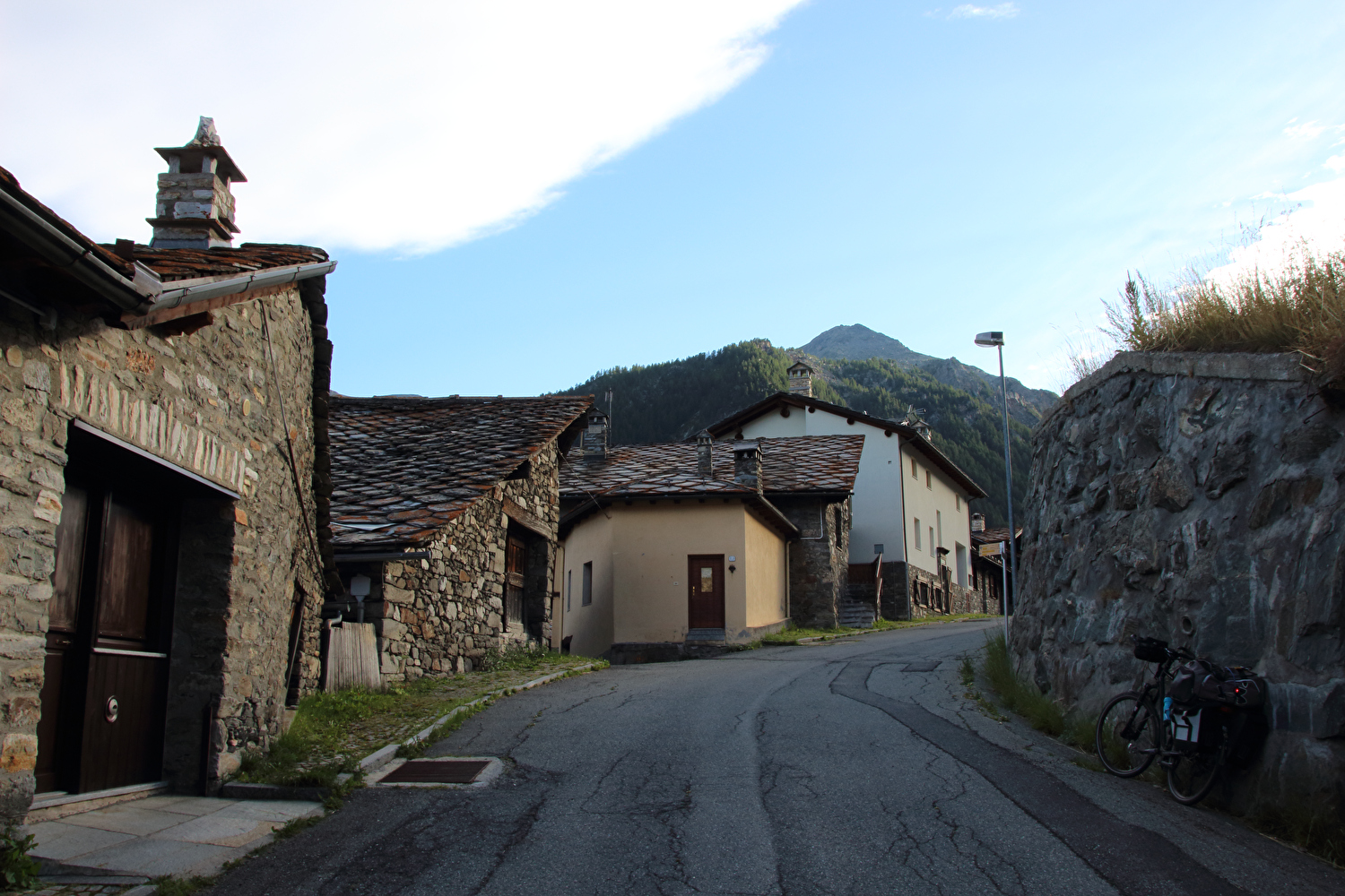 Beschreibung | Mit dem Col du Grand Saint-Bernard stand die erste Passüberquerung der Tour an. Die Etappe verlief bei fast wolkenlosem Himmel. Während der gesamten Etappe blies wieder ein starker Südwestwind. Bis zum Abzweig der Tunnelstraße durch den Tunnel du Grand Saint-Bernard (fra.) | Traforo del Gran San Bernardo (ita.) lässt sich die Passstraße bergauf gut treten, ist dafür aber stark mit Stinkeverkehr inklusive Schwerverkehr belastet. Auf der Passstraße oberhalb der Tunnelstraße verkehrt deutlich weniger Stinkeverkehr und insbesondere nahezu kein Schwerverkehr. Dafür beinhaltet die Passstraße das eine oder andere Steilstück. Diese Steilstücke wurden wie auch im späteren Verlauf der Tour materialschonend schiebend überwunden. Kurz oberhalb des Abzweigs der Tunnelstraße fällt beim Blick über den Lac des Toules (Durchschnittshöhe Wasserspiegel = 1810 m.) die auf dem Stausee schwimmende Solaranlage auf. Dazu im harten Kontrast steht die an der Passstraße gelegene Ruine SUPER-Saint-Bernard, eine aufgegebene und zunehmend verfallende Skistation. Während der Wasserspiegel des Stausees etwa auf Höhe der montanen Waldgrenze liegt, liegt die montane Baumgrenze im Bereich der Nordrampe des Col du Grand Saint-Bernard etwa 400 Meter höher. Mit dem Grand Combin rückt ein Viertausender von der Nordrampe aus ins Blickfeld. Die Passhöhe selbst ist sehr hässlich, da sie komplett überbaut ist. Über die Passhöhe verläuft die Rhône-Po-Wasserscheide. Knapp südlich der Passhöhe wurde die Staatsgrenze zwischen der Schweiz und Italien überquert. An den Namen der Ortschaften und geografischen Objekte (Berge, Flüsse, …) auf italienischer Seite ist davon aber kaum etwas zu merken, denn die tragen bis auf wenige Ausnahmen französischsprachige Namen. In der «Regione Autonoma Valle d’Aosta – Région Autonome Vallée d’Aoste», durch die der in Italien verlaufende Abschnitt dieser Tour führte, sind Italienisch und Französisch die beiden Amtssprachen. Die meisten Ortschaften und geografischen Objekte erhielten ihre Namen offenbar zu einer Zeit, als in dem Gebiet hauptsächlich Französisch gesprochen wurde. Obwohl aktuell die italienische Sprache vorherrscht, wurden die französischsprachigen Namen der Ortschaften und geografischen Objekten beibehalten. Lediglich für einige überregional bekannte Ortschaften und geografische Objekte bestehen Namen in beiden Amtssprachen. Die betrifft unter anderem den höchsten Berg der Alpen, den Mont Blanc (fra.) | Monte Bianco (ita.), die in die Region führenden Pässe Col du Grand Saint-Bernard (fra.) | Colle del Gran San Bernardo (ita.) und Col du Petit Saint-Bernard (fra.) | Colle del Piccolo San Bernardo (ita.) sowie die Regionshauptstadt Aoste (fra.) | Aosta (ita.), wobei lediglich für die Regionshauptstadt der italienischsprachige Name gebräuchlicher ist als der französischsprachige Name. Daher werden nachfolgend mit der Ausnahme Aosta die französischsprachigen Namen der Ortschaften und geografischen Objekte verwendet. Am Ende der Abfahrt auf der Südrampe des Col du Grand Saint-Bernard gab es in Bosses und auch in den an der Südrampe gelegenen Nachbarorten keine vorab buchbaren Quartiere. Das Quartier in Couchepache lag deutlich suboptimal, denn dorthin waren nochmal 160 Höhenmeter bergauf inklusive längerer Steilstücke zu überwinden. Die vorab buchbaren Alternativquartiere hätten auf der Passhöhe oder in Aosta gelegen, was beides nicht in den Etappenplan der Tour gepasst hätte. |