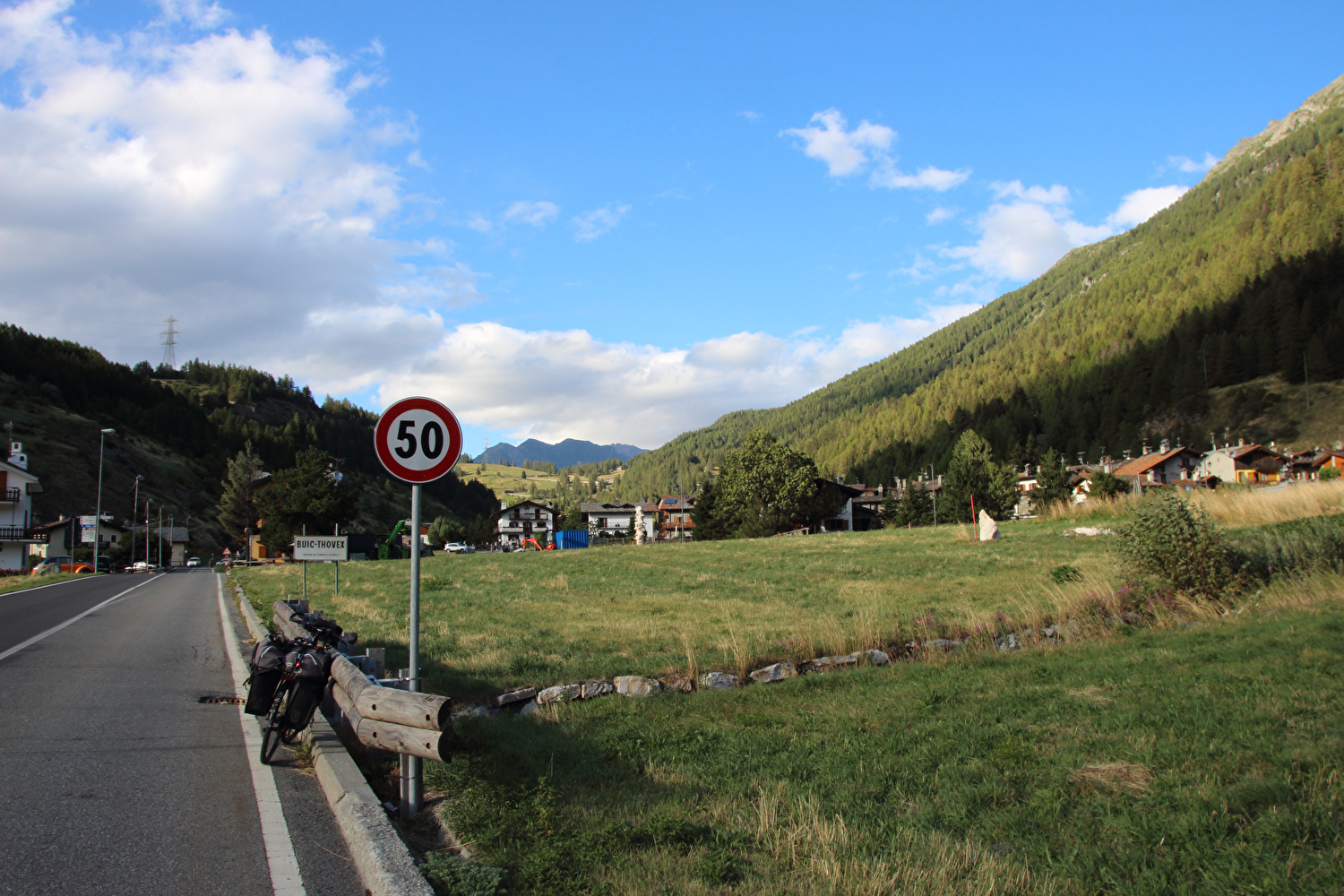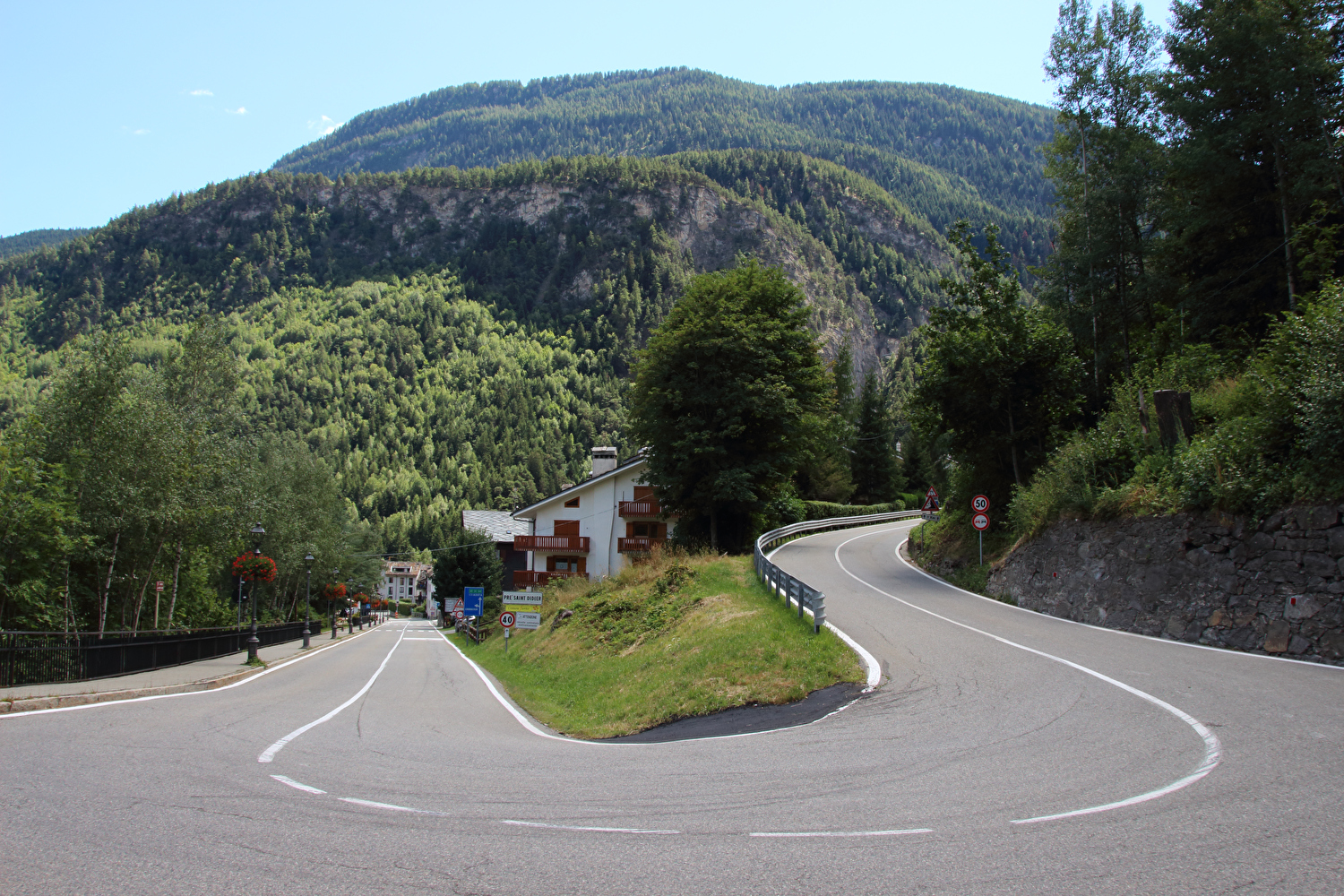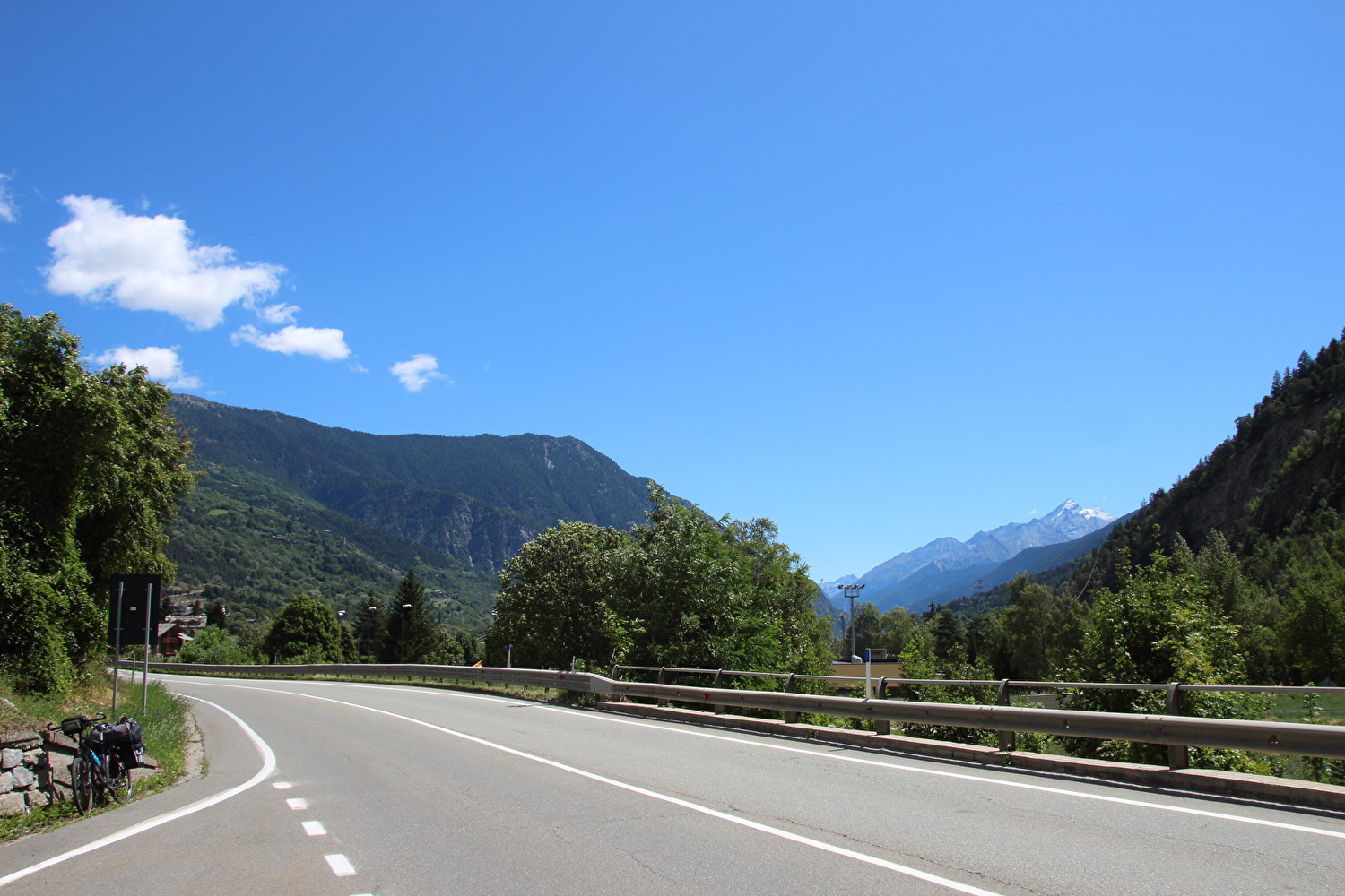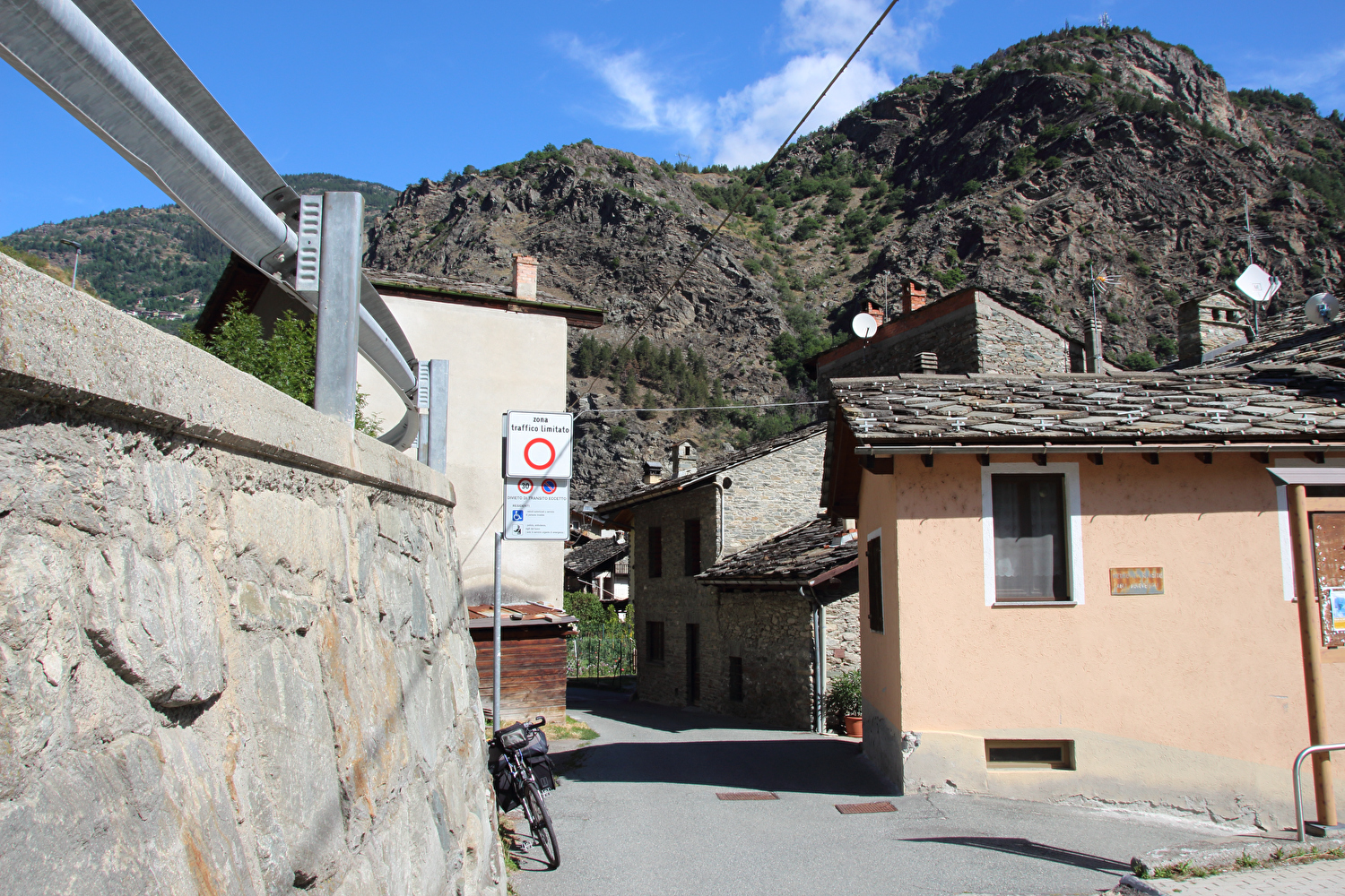 Beschreibung | Diese Etappe verlief zunächst mit durchweg nur geringer Steigung bis Pré-Saint-Didier, wo der eigentliche Anstieg Richtung Col du Petit Saint-Bernard begann. Die Etappe verlief bei sonnigem Wetter. Während der gesamten Etappe blies wieder ein starker Südwestwind. Bei der Ausfahrt aus Leverogne waren zahlreiche Häuser zu sehen, die sich in unterschiedlichen Stadien des Verfalls befanden. Offensichtlich ist Leverogne als Wohnort nicht mehr gefragt. Im Vallée d’Aoste liegt talaufwärts gleich oberhalb von Leverogne eine Talenge, die die Straße in einem Tunnel durchquert. Kurz nach der Tunneldurchfahrt fällt der Blick auf ein auffallend weißes Bergmassiv. Dabei handelt es sich um das Massif du Mont-Blanc. Der Gipfel des Mont Blanc, des höchsten Berges der Alpen, ist von diesem Punkt aus sichtbar. Der von diesem Punkt aus scheinbar höchste Gipfel ist der dem Hauptgipfel südöstlich vorgelagerte Nebengipfel Mont Blanc de Courmayeur. Der vollständig schneebedeckte Hauptgipfel liegt rechts dahinter. Die gute Sichtbarkeit des Massif du Mont-Blanc ergibt sich nicht allein aus seiner Höhe, sondern auch daraus, dass die umliegenden Berge allesamt deutlich niedriger sind und das Bergmassiv somit sehr exponiert steht. Erst ab Morgex talaufwärts verstellen andere Berge aufgrund der sich ändernden Perspektive zunehmend die Sicht auf das Massif du Mont-Blanc, ohne dass dieses bis Pré-Saint-Didier vollständig verdeckt wird. Von der Straße aus fällt der Blick auch immer mal wieder auf vor sich hin gammelnde Trassenabschnitte der Ligne d'Aoste à Pré-Saint-Didier (fra.) | Ferrovia Aosta-Pré-Saint-Didier (ita.), auf der der Betrieb am 24.12.2015 eingestellt wurde. Eine Reaktivierung der Strecke wird diskutiert. Allerdings wächst mit dem Gestrüpp zwischen und neben den Gleisen auch der Aufwand dafür. Das untere Ende der Nordostrampe des Col du Petit Saint-Bernard wird üblicherweise an der Gabelung der von Aosta kommenden Straße in Pré-Saint-Didier verortet. An dieser Gabelung müssen sich Kraftfahrer für die Weiterfahrt Richtung Col du Petit Saint-Bernard über La Thuile oder Richtung Tunnel du Mont-Blanc (fra.) | Traforo del Monte Bianco (ita.) über Courmayeur entscheiden. Fahrradfahrer hingegen müssen sich bereits an dem Kreisel in Aosta, an dem für Fahrradfahrer auch das untere Ende der Südrampe des Col du Grand Saint-Bernard liegt, für eine Fahrtrichtung (Col du Grand Saint-Bernard, Col du Petit Saint-Bernard, Vallée d’Aoste talabwärts) entscheiden. Von Êlevaz bis Pré-Saint-Didier sind die Kehren absteigend durchnummeriert. Oberhalb von Êlevaz gibt es keine Nummerierung der Kehren. Unterhalb von La Thuile führt die Straße durch einem Tunnel, dessen oberes Portal direkt unterhalb von La Thuile liegt. La Thuile selbst war an diesem Tag stark überbevölkert. Da war es ganz angenehm, dass das Quartier in Buic etwas außerhalb des Kernortes lag. Das brachte zwar etwa 80 zusätzliche Höhenmeter bergauf mit sich, die sich aber auf der längeren der beiden Straßen zwischen La Thuile und Buic mit durchgängig moderater Steigung gut treten lassen. Die kürzere der beiden Straßen zwischen La Thuile und Buic ist hingegen sehr steil und daher für Fahrräder mit Mehrtagesgepäck bergauf und bergab ungeeignet. |