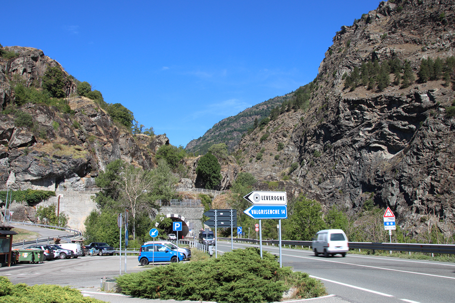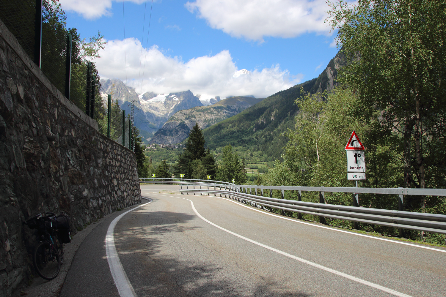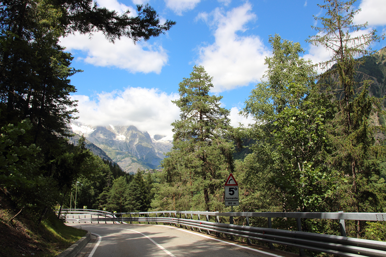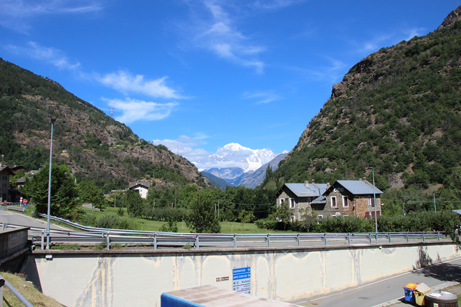 Beschreibung | Diese Etappe verlief zunächst mit durchweg nur geringer Steigung bis Pré-Saint-Didier, wo der eigentliche Anstieg Richtung Col du Petit Saint-Bernard begann. Die Etappe verlief bei sonnigem Wetter. Während der gesamten Etappe blies wieder ein starker Südwestwind. Bei der Ausfahrt aus Leverogne waren zahlreiche Häuser zu sehen, die sich in unterschiedlichen Stadien des Verfalls befanden. Offensichtlich ist Leverogne als Wohnort nicht mehr gefragt. Im Vallée d’Aoste liegt talaufwärts gleich oberhalb von Leverogne eine Talenge, die die Straße in einem Tunnel durchquert. Kurz nach der Tunneldurchfahrt fällt der Blick auf ein auffallend weißes Bergmassiv. Dabei handelt es sich um das Massif du Mont-Blanc. Der Gipfel des Mont Blanc, des höchsten Berges der Alpen, ist von diesem Punkt aus sichtbar. Der von diesem Punkt aus scheinbar höchste Gipfel ist der dem Hauptgipfel südöstlich vorgelagerte Nebengipfel Mont Blanc de Courmayeur. Der vollständig schneebedeckte Hauptgipfel liegt rechts dahinter. Die gute Sichtbarkeit des Massif du Mont-Blanc ergibt sich nicht allein aus seiner Höhe, sondern auch daraus, dass die umliegenden Berge allesamt deutlich niedriger sind und das Bergmassiv somit sehr exponiert steht. Erst ab Morgex talaufwärts verstellen andere Berge aufgrund der sich ändernden Perspektive zunehmend die Sicht auf das Massif du Mont-Blanc, ohne dass dieses bis Pré-Saint-Didier vollständig verdeckt wird. Von der Straße aus fällt der Blick auch immer mal wieder auf vor sich hin gammelnde Trassenabschnitte der Ligne d'Aoste à Pré-Saint-Didier (fra.) | Ferrovia Aosta-Pré-Saint-Didier (ita.), auf der der Betrieb am 24.12.2015 eingestellt wurde. Eine Reaktivierung der Strecke wird diskutiert. Allerdings wächst mit dem Gestrüpp zwischen und neben den Gleisen auch der Aufwand dafür. Das untere Ende der Nordostrampe des Col du Petit Saint-Bernard wird üblicherweise an der Gabelung der von Aosta kommenden Straße in Pré-Saint-Didier verortet. An dieser Gabelung müssen sich Kraftfahrer für die Weiterfahrt Richtung Col du Petit Saint-Bernard über La Thuile oder Richtung Tunnel du Mont-Blanc (fra.) | Traforo del Monte Bianco (ita.) über Courmayeur entscheiden. Fahrradfahrer hingegen müssen sich bereits an dem Kreisel in Aosta, an dem für Fahrradfahrer auch das untere Ende der Südrampe des Col du Grand Saint-Bernard liegt, für eine Fahrtrichtung (Col du Grand Saint-Bernard, Col du Petit Saint-Bernard, Vallée d’Aoste talabwärts) entscheiden. Von Êlevaz bis Pré-Saint-Didier sind die Kehren absteigend durchnummeriert. Oberhalb von Êlevaz gibt es keine Nummerierung der Kehren. Unterhalb von La Thuile führt die Straße durch einem Tunnel, dessen oberes Portal direkt unterhalb von La Thuile liegt. La Thuile selbst war an diesem Tag stark überbevölkert. Da war es ganz angenehm, dass das Quartier in Buic etwas außerhalb des Kernortes lag. Das brachte zwar etwa 80 zusätzliche Höhenmeter bergauf mit sich, die sich aber auf der längeren der beiden Straßen zwischen La Thuile und Buic mit durchgängig moderater Steigung gut treten lassen. Die kürzere der beiden Straßen zwischen La Thuile und Buic ist hingegen sehr steil und daher für Fahrräder mit Mehrtagesgepäck bergauf und bergab ungeeignet. |
