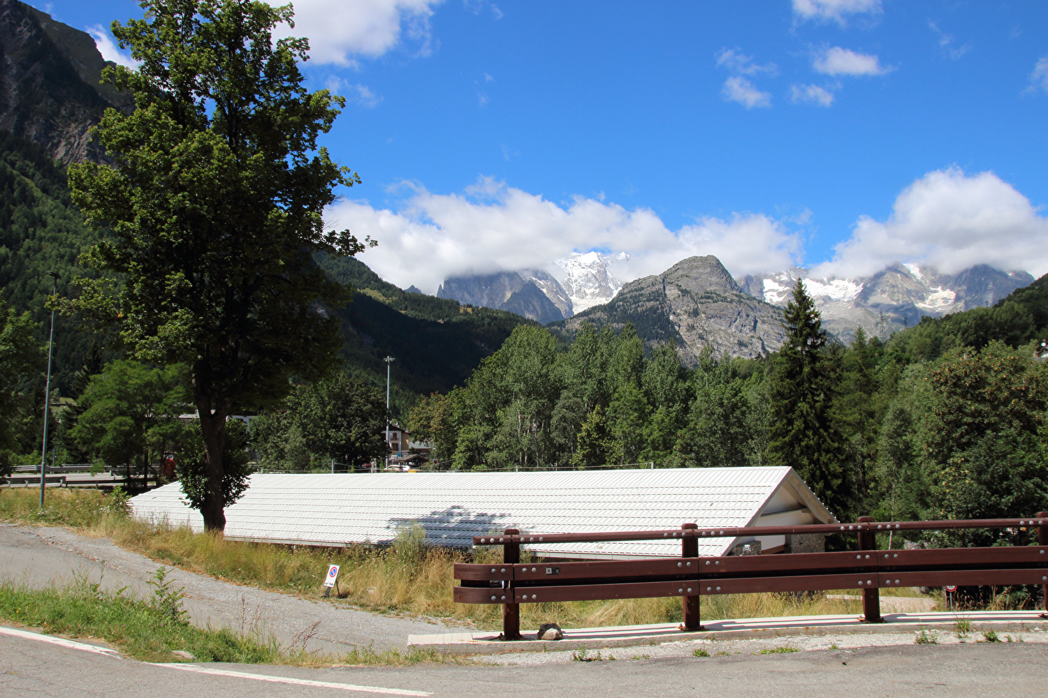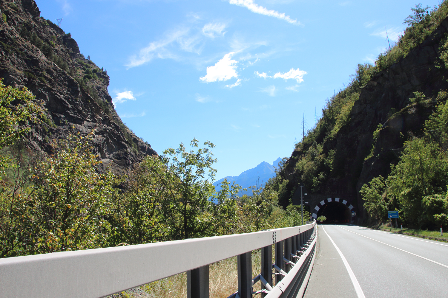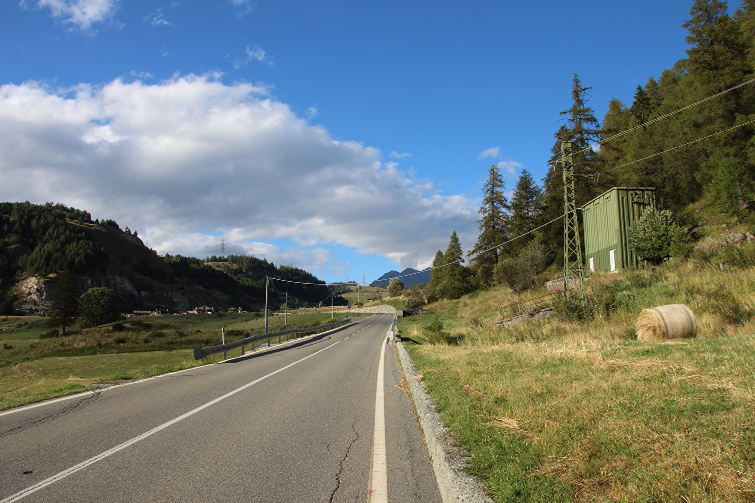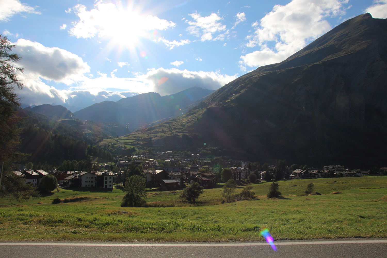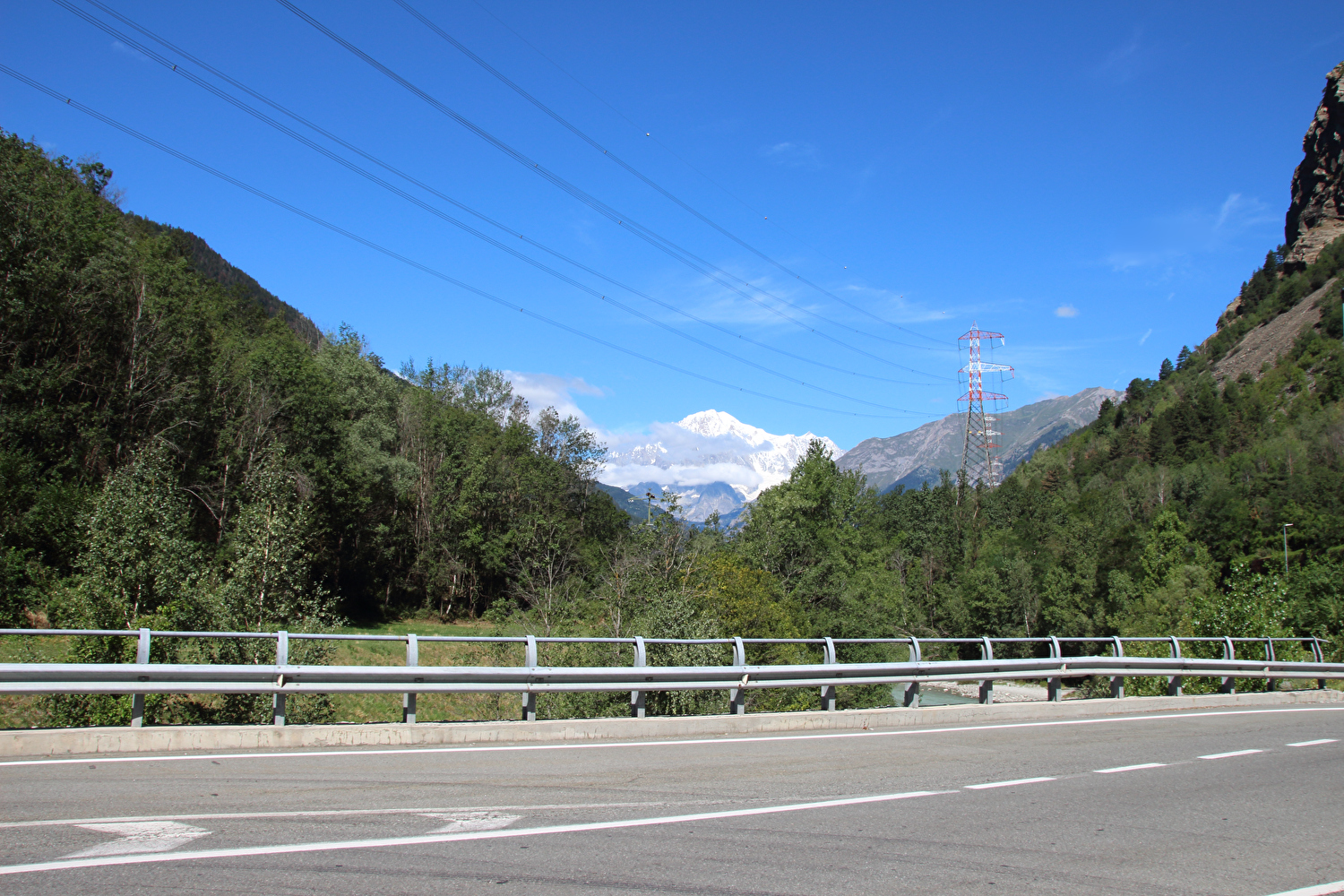 Beschreibung | Diese Etappe verlief zunächst mit durchweg nur geringer Steigung bis Pré-Saint-Didier, wo der eigentliche Anstieg Richtung Col du Petit Saint-Bernard begann. Die Etappe verlief bei sonnigem Wetter. Während der gesamten Etappe blies wieder ein starker Südwestwind. Bei der Ausfahrt aus Leverogne waren zahlreiche Häuser zu sehen, die sich in unterschiedlichen Stadien des Verfalls befanden. Offensichtlich ist Leverogne als Wohnort nicht mehr gefragt. Im Vallée d’Aoste liegt talaufwärts gleich oberhalb von Leverogne eine Talenge, die die Straße in einem Tunnel durchquert. Kurz nach der Tunneldurchfahrt fällt der Blick auf ein auffallend weißes Bergmassiv. Dabei handelt es sich um das Massif du Mont-Blanc. Der Gipfel des Mont Blanc, des höchsten Berges der Alpen, ist von diesem Punkt aus sichtbar. Der von diesem Punkt aus scheinbar höchste Gipfel ist der dem Hauptgipfel südöstlich vorgelagerte Nebengipfel Mont Blanc de Courmayeur. Der vollständig schneebedeckte Hauptgipfel liegt rechts dahinter. Die gute Sichtbarkeit des Massif du Mont-Blanc ergibt sich nicht allein aus seiner Höhe, sondern auch daraus, dass die umliegenden Berge allesamt deutlich niedriger sind und das Bergmassiv somit sehr exponiert steht. Erst ab Morgex talaufwärts verstellen andere Berge aufgrund der sich ändernden Perspektive zunehmend die Sicht auf das Massif du Mont-Blanc, ohne dass dieses bis Pré-Saint-Didier vollständig verdeckt wird. Von der Straße aus fällt der Blick auch immer mal wieder auf vor sich hin gammelnde Trassenabschnitte der Ligne d'Aoste à Pré-Saint-Didier (fra.) | Ferrovia Aosta-Pré-Saint-Didier (ita.), auf der der Betrieb am 24.12.2015 eingestellt wurde. Eine Reaktivierung der Strecke wird diskutiert. Allerdings wächst mit dem Gestrüpp zwischen und neben den Gleisen auch der Aufwand dafür. Das untere Ende der Nordostrampe des Col du Petit Saint-Bernard wird üblicherweise an der Gabelung der von Aosta kommenden Straße in Pré-Saint-Didier verortet. An dieser Gabelung müssen sich Kraftfahrer für die Weiterfahrt Richtung Col du Petit Saint-Bernard über La Thuile oder Richtung Tunnel du Mont-Blanc (fra.) | Traforo del Monte Bianco (ita.) über Courmayeur entscheiden. Fahrradfahrer hingegen müssen sich bereits an dem Kreisel in Aosta, an dem für Fahrradfahrer auch das untere Ende der Südrampe des Col du Grand Saint-Bernard liegt, für eine Fahrtrichtung (Col du Grand Saint-Bernard, Col du Petit Saint-Bernard, Vallée d’Aoste talabwärts) entscheiden. Von Êlevaz bis Pré-Saint-Didier sind die Kehren absteigend durchnummeriert. Oberhalb von Êlevaz gibt es keine Nummerierung der Kehren. Unterhalb von La Thuile führt die Straße durch einem Tunnel, dessen oberes Portal direkt unterhalb von La Thuile liegt. La Thuile selbst war an diesem Tag stark überbevölkert. Da war es ganz angenehm, dass das Quartier in Buic etwas außerhalb des Kernortes lag. Das brachte zwar etwa 80 zusätzliche Höhenmeter bergauf mit sich, die sich aber auf der längeren der beiden Straßen zwischen La Thuile und Buic mit durchgängig moderater Steigung gut treten lassen. Die kürzere der beiden Straßen zwischen La Thuile und Buic ist hingegen sehr steil und daher für Fahrräder mit Mehrtagesgepäck bergauf und bergab ungeeignet. |