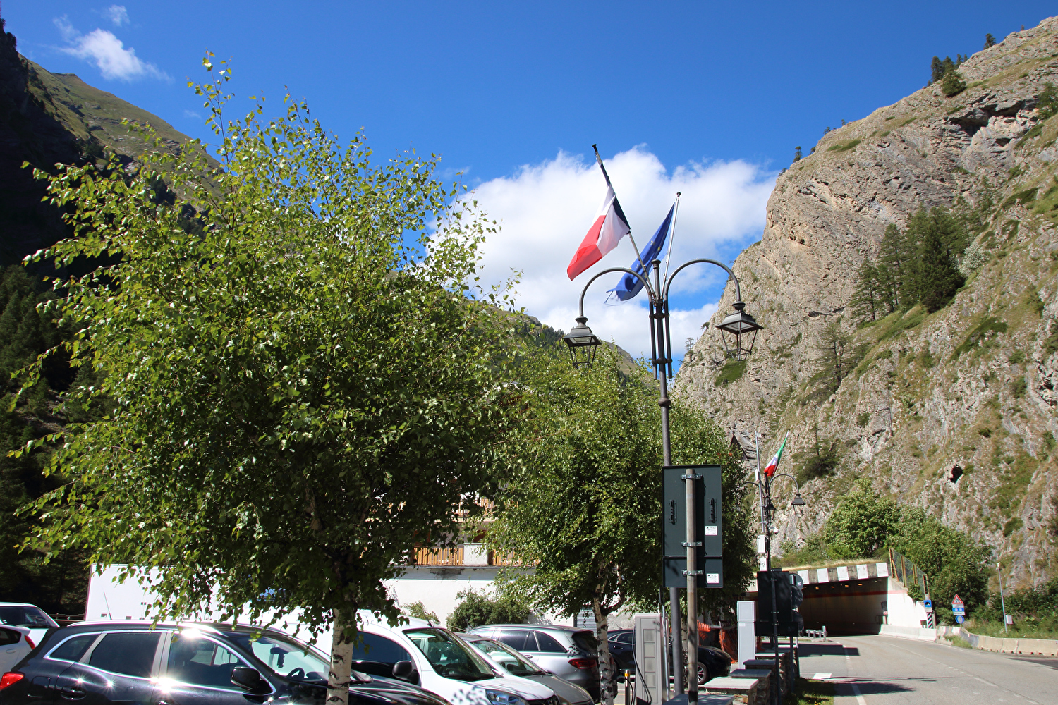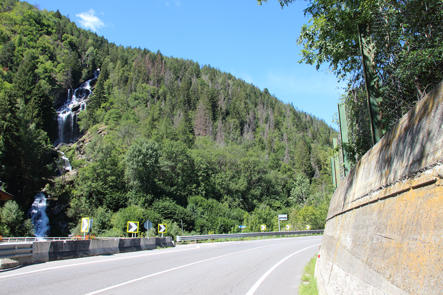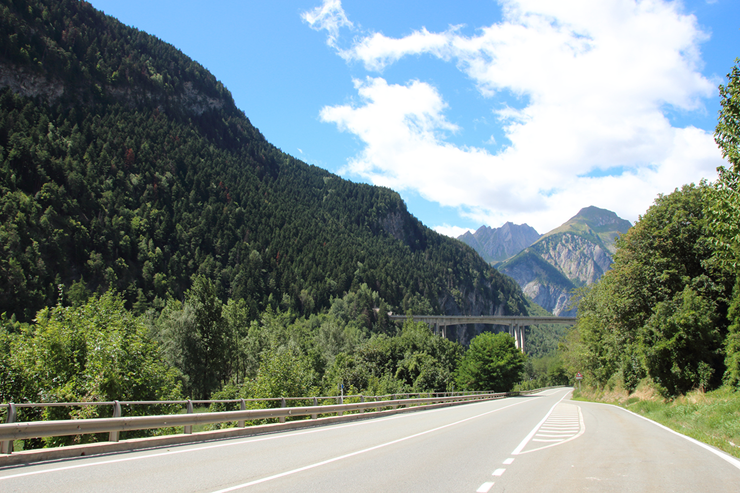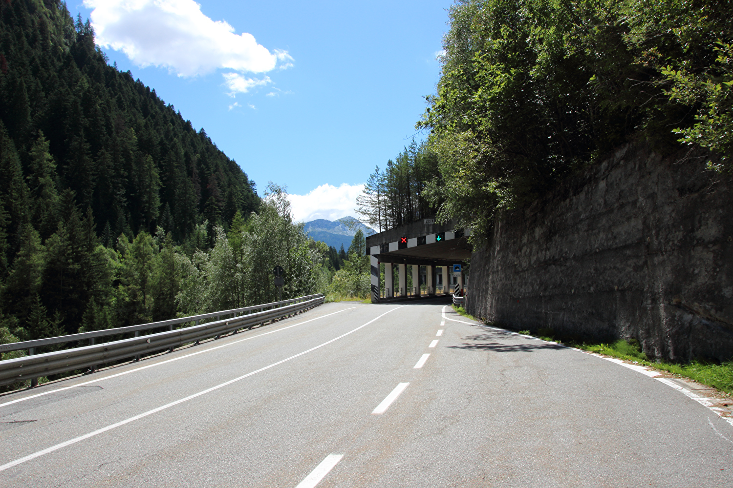 Beschreibung | Diese Etappe verlief zunächst mit durchweg nur geringer Steigung bis Pré-Saint-Didier, wo der eigentliche Anstieg Richtung Col du Petit Saint-Bernard begann. Die Etappe verlief bei sonnigem Wetter. Während der gesamten Etappe blies wieder ein starker Südwestwind. Bei der Ausfahrt aus Leverogne waren zahlreiche Häuser zu sehen, die sich in unterschiedlichen Stadien des Verfalls befanden. Offensichtlich ist Leverogne als Wohnort nicht mehr gefragt. Im Vallée d’Aoste liegt talaufwärts gleich oberhalb von Leverogne eine Talenge, die die Straße in einem Tunnel durchquert. Kurz nach der Tunneldurchfahrt fällt der Blick auf ein auffallend weißes Bergmassiv. Dabei handelt es sich um das Massif du Mont-Blanc. Der Gipfel des Mont Blanc, des höchsten Berges der Alpen, ist von diesem Punkt aus sichtbar. Der von diesem Punkt aus scheinbar höchste Gipfel ist der dem Hauptgipfel südöstlich vorgelagerte Nebengipfel Mont Blanc de Courmayeur. Der vollständig schneebedeckte Hauptgipfel liegt rechts dahinter. Die gute Sichtbarkeit des Massif du Mont-Blanc ergibt sich nicht allein aus seiner Höhe, sondern auch daraus, dass die umliegenden Berge allesamt deutlich niedriger sind und das Bergmassiv somit sehr exponiert steht. Erst ab Morgex talaufwärts verstellen andere Berge aufgrund der sich ändernden Perspektive zunehmend die Sicht auf das Massif du Mont-Blanc, ohne dass dieses bis Pré-Saint-Didier vollständig verdeckt wird. Von der Straße aus fällt der Blick auch immer mal wieder auf vor sich hin gammelnde Trassenabschnitte der Ligne d'Aoste à Pré-Saint-Didier (fra.) | Ferrovia Aosta-Pré-Saint-Didier (ita.), auf der der Betrieb am 24.12.2015 eingestellt wurde. Eine Reaktivierung der Strecke wird diskutiert. Allerdings wächst mit dem Gestrüpp zwischen und neben den Gleisen auch der Aufwand dafür. Das untere Ende der Nordostrampe des Col du Petit Saint-Bernard wird üblicherweise an der Gabelung der von Aosta kommenden Straße in Pré-Saint-Didier verortet. An dieser Gabelung müssen sich Kraftfahrer für die Weiterfahrt Richtung Col du Petit Saint-Bernard über La Thuile oder Richtung Tunnel du Mont-Blanc (fra.) | Traforo del Monte Bianco (ita.) über Courmayeur entscheiden. Fahrradfahrer hingegen müssen sich bereits an dem Kreisel in Aosta, an dem für Fahrradfahrer auch das untere Ende der Südrampe des Col du Grand Saint-Bernard liegt, für eine Fahrtrichtung (Col du Grand Saint-Bernard, Col du Petit Saint-Bernard, Vallée d’Aoste talabwärts) entscheiden. Von Êlevaz bis Pré-Saint-Didier sind die Kehren absteigend durchnummeriert. Oberhalb von Êlevaz gibt es keine Nummerierung der Kehren. Unterhalb von La Thuile führt die Straße durch einem Tunnel, dessen oberes Portal direkt unterhalb von La Thuile liegt. La Thuile selbst war an diesem Tag stark überbevölkert. Da war es ganz angenehm, dass das Quartier in Buic etwas außerhalb des Kernortes lag. Das brachte zwar etwa 80 zusätzliche Höhenmeter bergauf mit sich, die sich aber auf der längeren der beiden Straßen zwischen La Thuile und Buic mit durchgängig moderater Steigung gut treten lassen. Die kürzere der beiden Straßen zwischen La Thuile und Buic ist hingegen sehr steil und daher für Fahrräder mit Mehrtagesgepäck bergauf und bergab ungeeignet. |