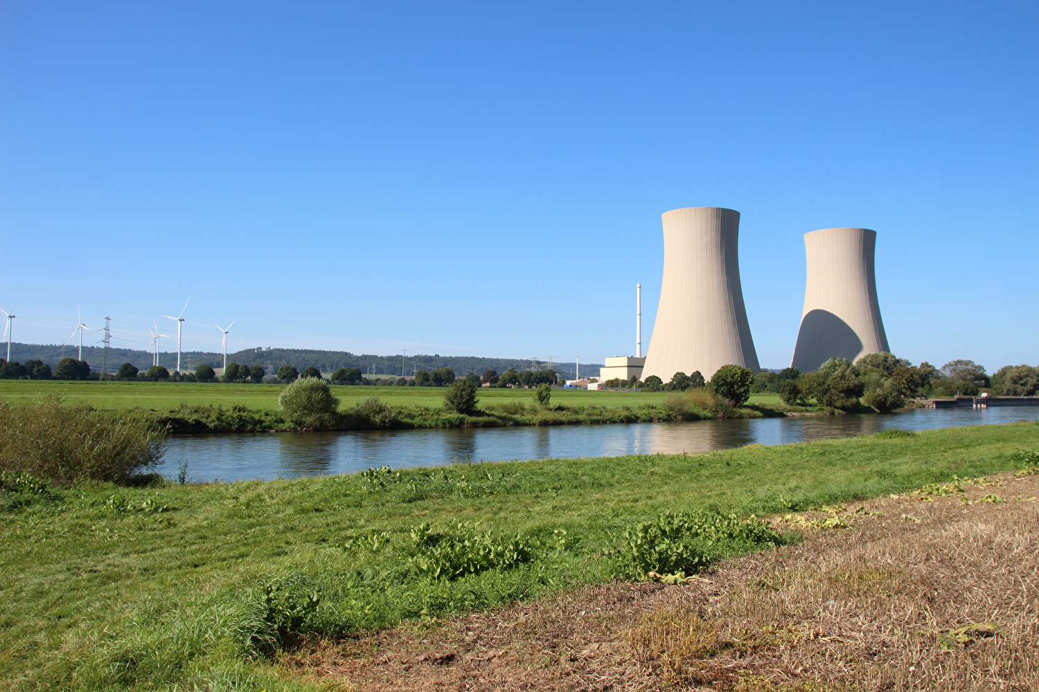 Blick über die Weser auf aktive Windkraftanlagen und das stillgelegte Kernkraftwerk Grohnde ![]() 300 dpi JPEG |