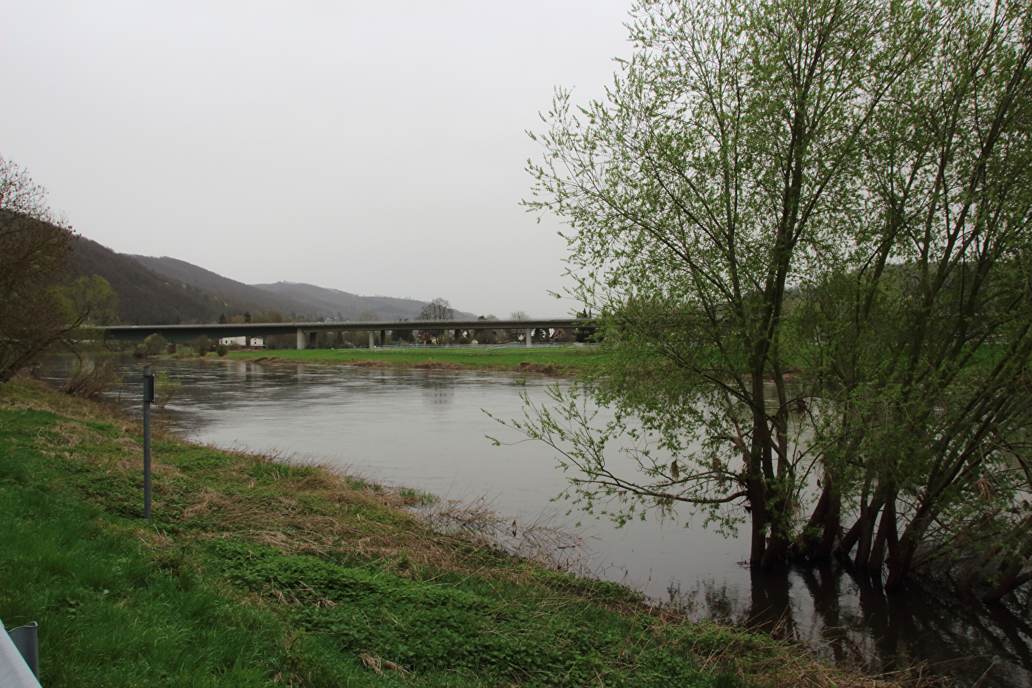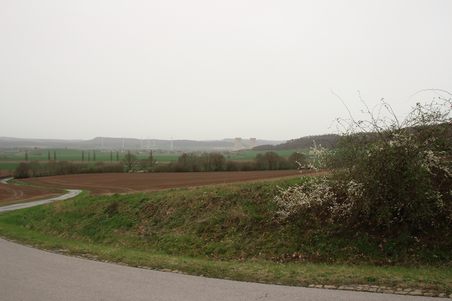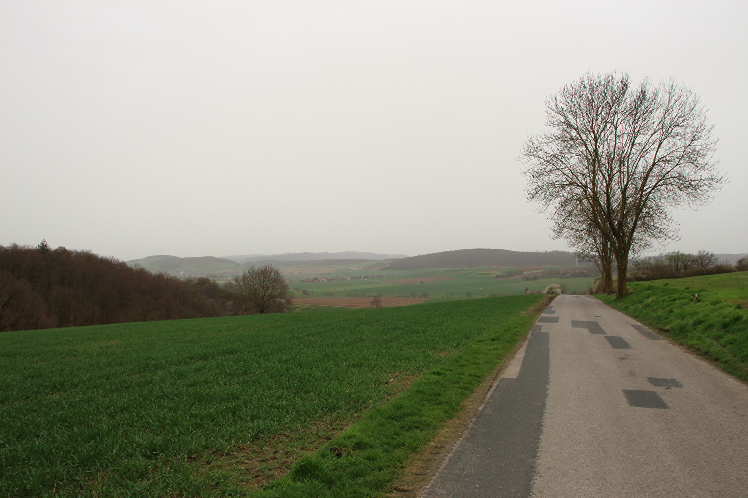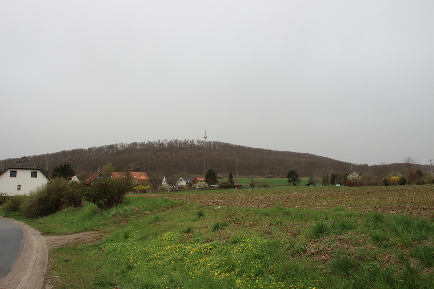 Eigentlich sollte dieser Tag der erste warme Tag in diesem Jahr werden und somit die erste Gelegenheit für eine lange Tour bieten. Mit einer südwestlichen Strömung wurde für die Jahreszeit recht warme Luft heran geführt. Diese aus Afrika stammende Luftmasse hatte allerdings auch extrem viel Sahara-Staub mit im Gepäck. An diesen Staubteilchen kondensierte so viel Wasser, dass sich eine strukturlose geschlossene Wolkendecke bildete, die der Sonne keine Chance ließ. Der Sahara-Staub allein hätte nicht ausgereicht, die Sonne komplett zu verdecken, sondern nur zu einem mehr oder weniger eingetrübten Sonnenschein geführt. An der ungewöhnlichen Farbe der geschlossenen Wolkendecke dürfte der Sahara-Staub hingegen einen Anteil gehabt haben. Ohne Sonnenschein reichte es auch nur für etwa +17 °C während der Tour. Laubbäume und Sträucher zeigten teilweise frischen Laubaustrieb, der Schwarzdorn blühte gerade. In der trüben Lichtstimmung kam das alles nicht so richtig zur Geltung. Dafür blieb der Stinkeverkehr an diesem Tag weitgehend aus. Bei Sonnenschein hätte sich im Weserbergland wahrscheinlich eine Abgasfahne an die nächste gereiht.