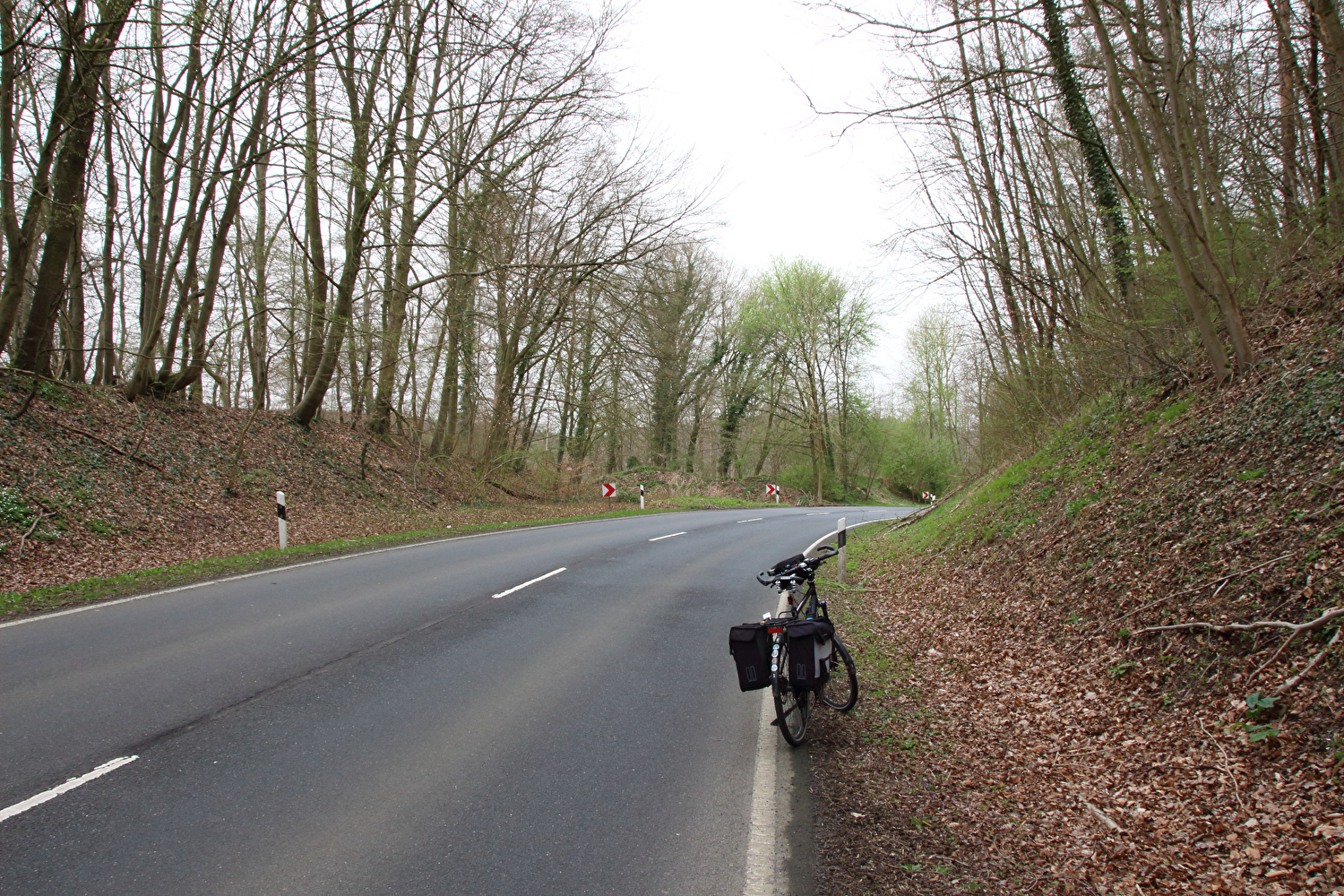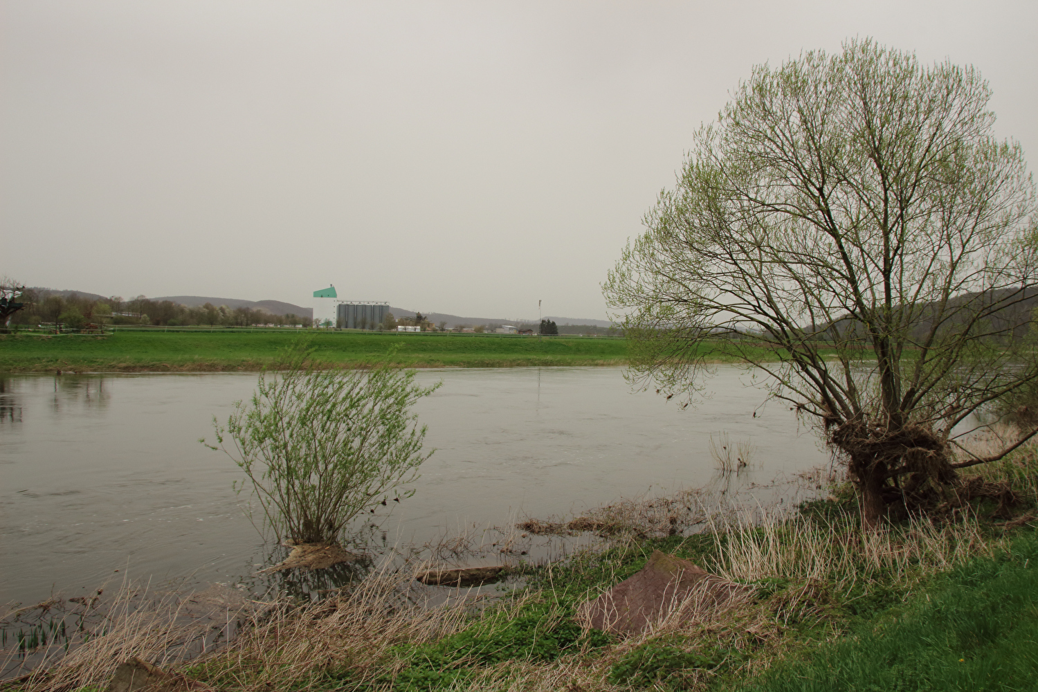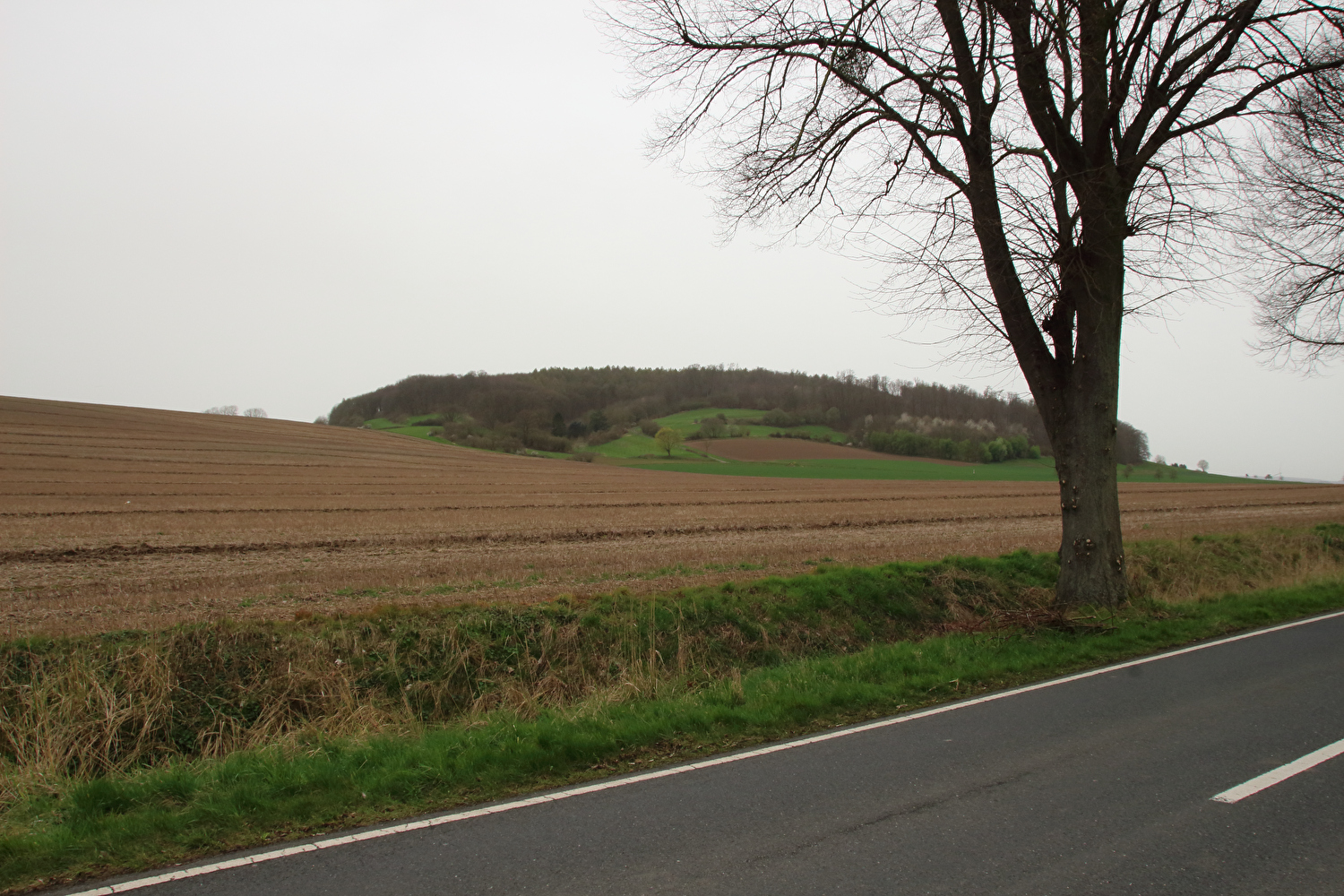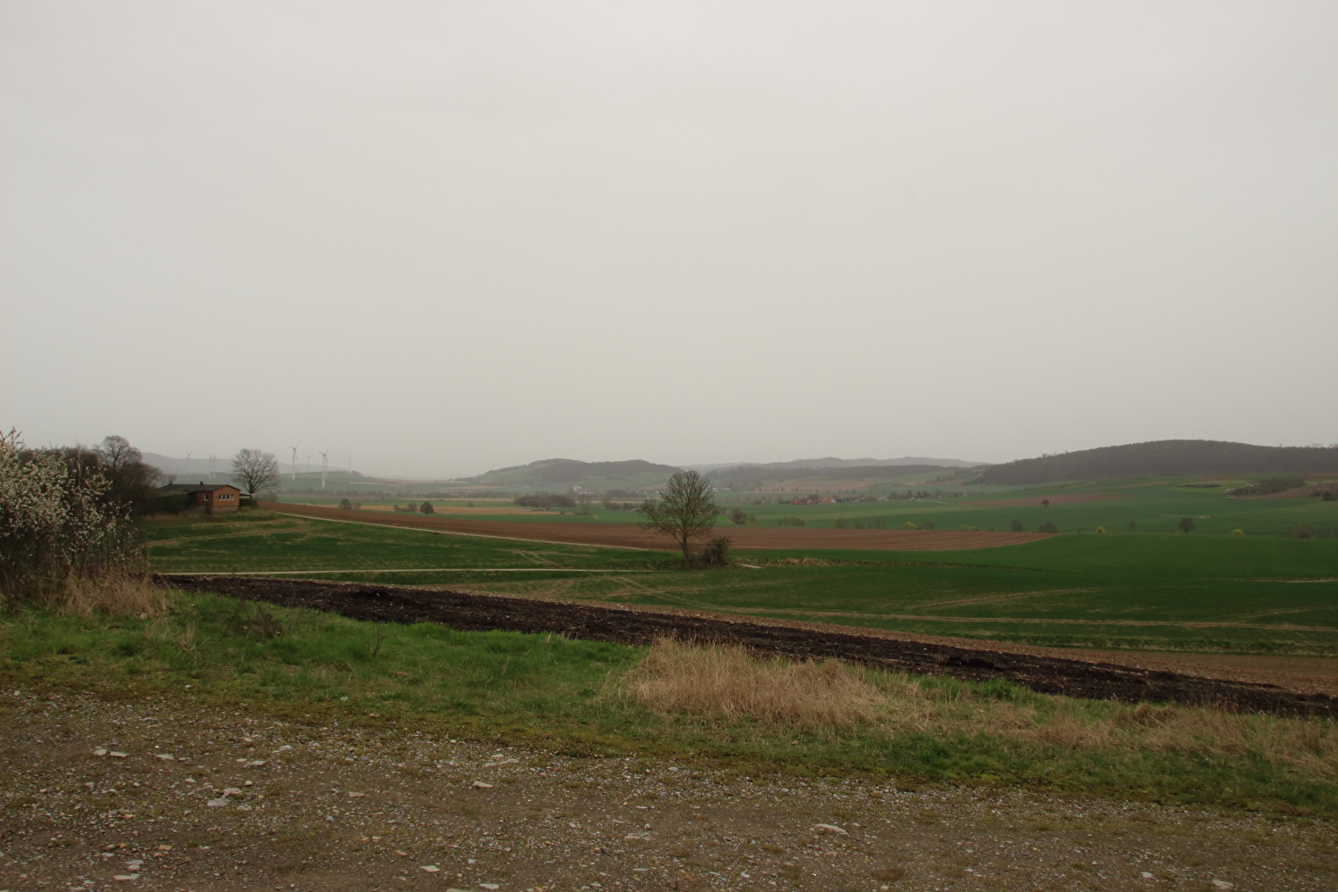 Eigentlich sollte dieser Tag der erste warme Tag in diesem Jahr werden und somit die erste Gelegenheit für eine lange Tour bieten. Mit einer südwestlichen Strömung wurde für die Jahreszeit recht warme Luft heran geführt. Diese aus Afrika stammende Luftmasse hatte allerdings auch extrem viel Sahara-Staub mit im Gepäck. An diesen Staubteilchen kondensierte so viel Wasser, dass sich eine strukturlose geschlossene Wolkendecke bildete, die der Sonne keine Chance ließ. Der Sahara-Staub allein hätte nicht ausgereicht, die Sonne komplett zu verdecken, sondern nur zu einem mehr oder weniger eingetrübten Sonnenschein geführt. An der ungewöhnlichen Farbe der geschlossenen Wolkendecke dürfte der Sahara-Staub hingegen einen Anteil gehabt haben. Ohne Sonnenschein reichte es auch nur für etwa +17 °C während der Tour. Laubbäume und Sträucher zeigten teilweise frischen Laubaustrieb, der Schwarzdorn blühte gerade. In der trüben Lichtstimmung kam das alles nicht so richtig zur Geltung. Dafür blieb der Stinkeverkehr an diesem Tag weitgehend aus. Bei Sonnenschein hätte sich im Weserbergland wahrscheinlich eine Abgasfahne an die nächste gereiht.