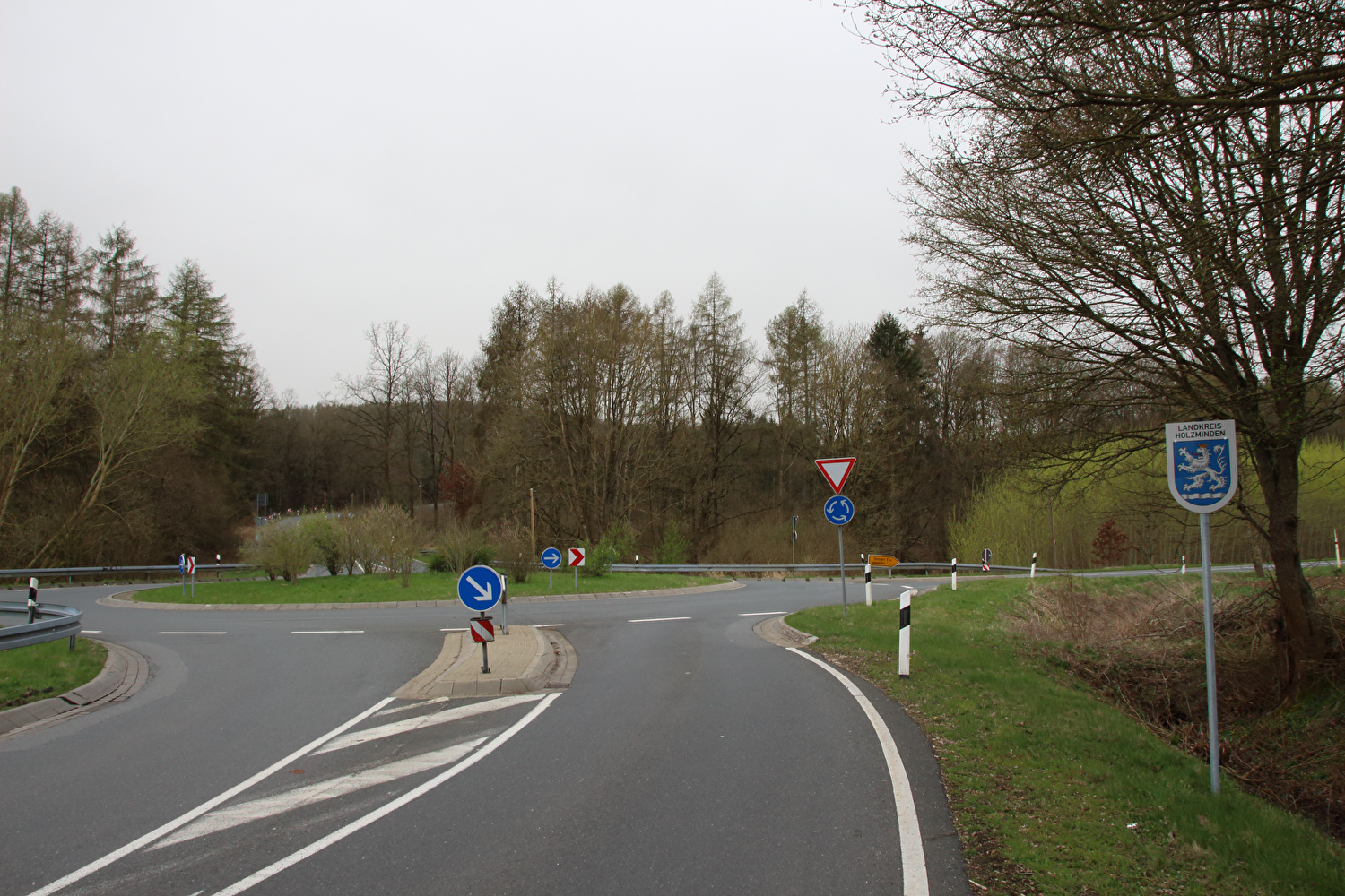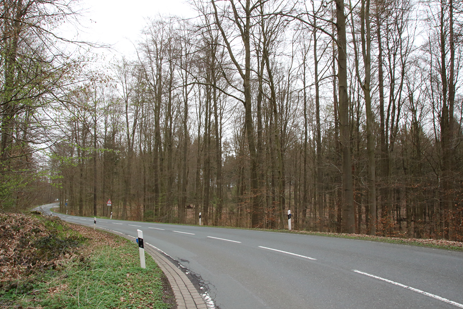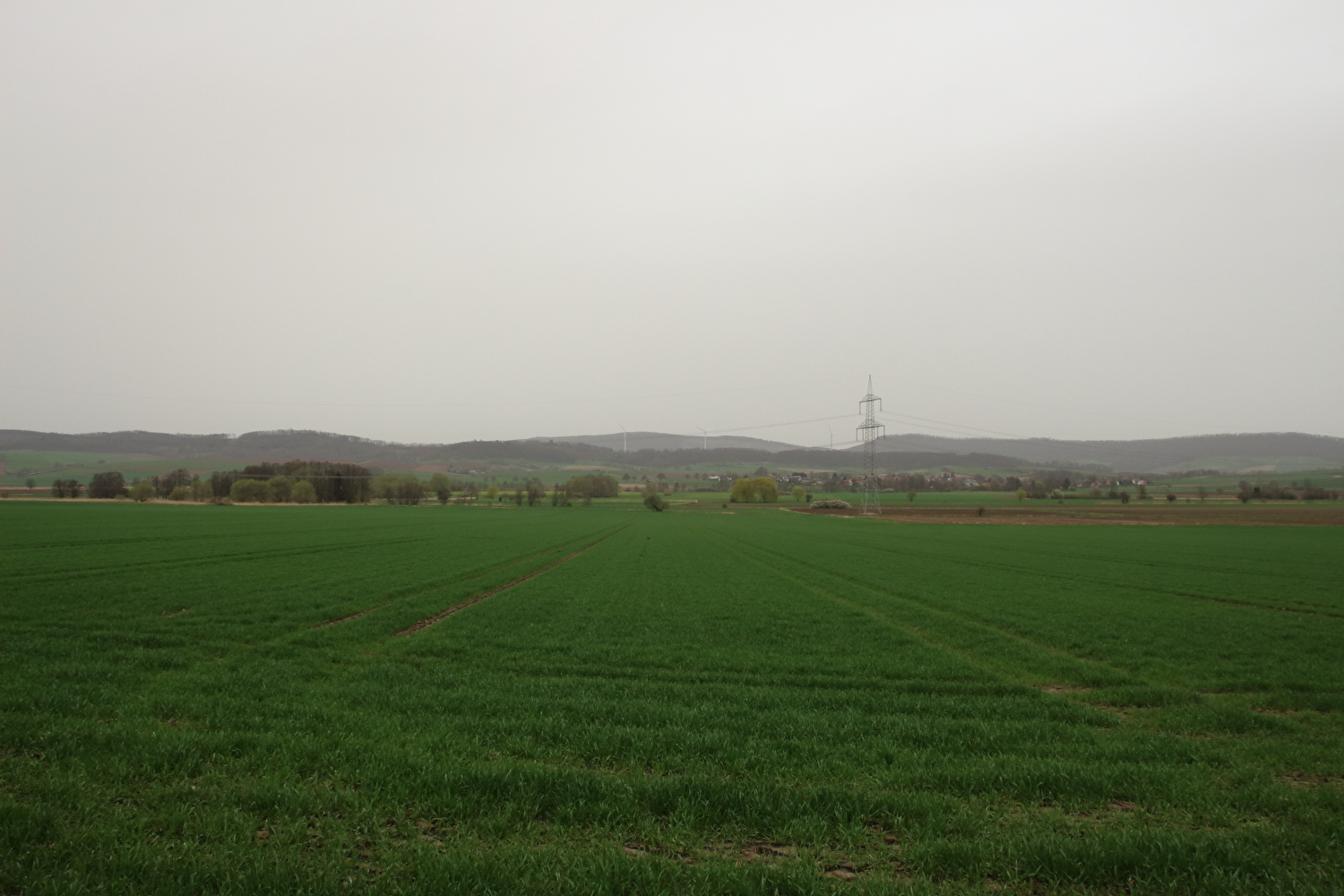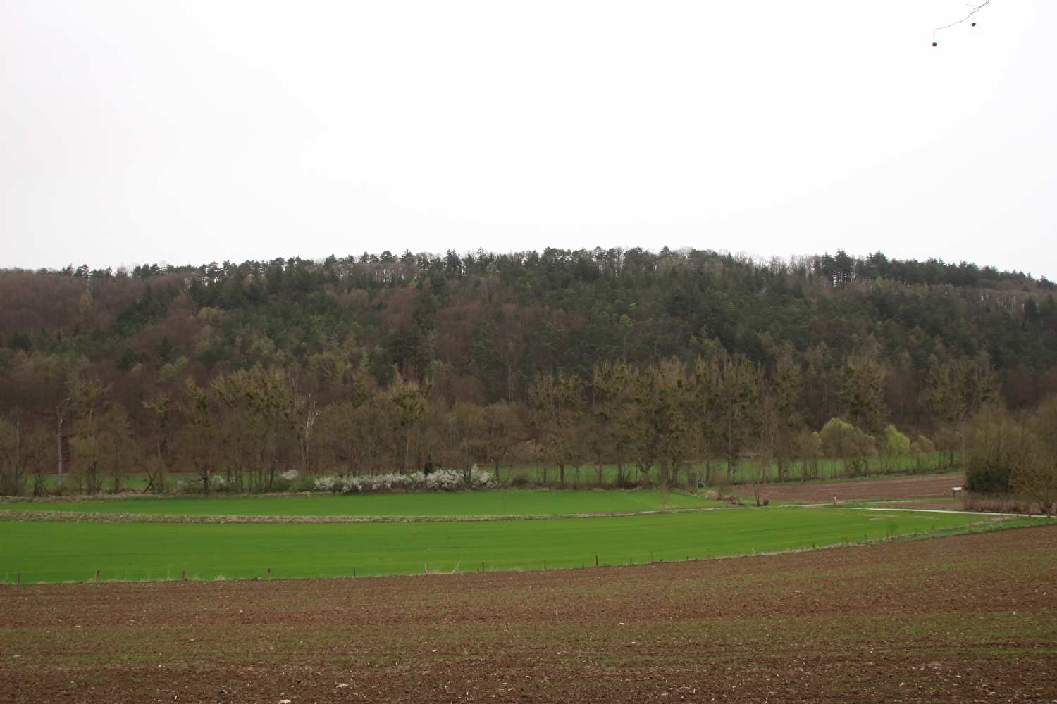 Eigentlich sollte dieser Tag der erste warme Tag in diesem Jahr werden und somit die erste Gelegenheit für eine lange Tour bieten. Mit einer südwestlichen Strömung wurde für die Jahreszeit recht warme Luft heran geführt. Diese aus Afrika stammende Luftmasse hatte allerdings auch extrem viel Sahara-Staub mit im Gepäck. An diesen Staubteilchen kondensierte so viel Wasser, dass sich eine strukturlose geschlossene Wolkendecke bildete, die der Sonne keine Chance ließ. Der Sahara-Staub allein hätte nicht ausgereicht, die Sonne komplett zu verdecken, sondern nur zu einem mehr oder weniger eingetrübten Sonnenschein geführt. An der ungewöhnlichen Farbe der geschlossenen Wolkendecke dürfte der Sahara-Staub hingegen einen Anteil gehabt haben. Ohne Sonnenschein reichte es auch nur für etwa +17 °C während der Tour. Laubbäume und Sträucher zeigten teilweise frischen Laubaustrieb, der Schwarzdorn blühte gerade. In der trüben Lichtstimmung kam das alles nicht so richtig zur Geltung. Dafür blieb der Stinkeverkehr an diesem Tag weitgehend aus. Bei Sonnenschein hätte sich im Weserbergland wahrscheinlich eine Abgasfahne an die nächste gereiht.