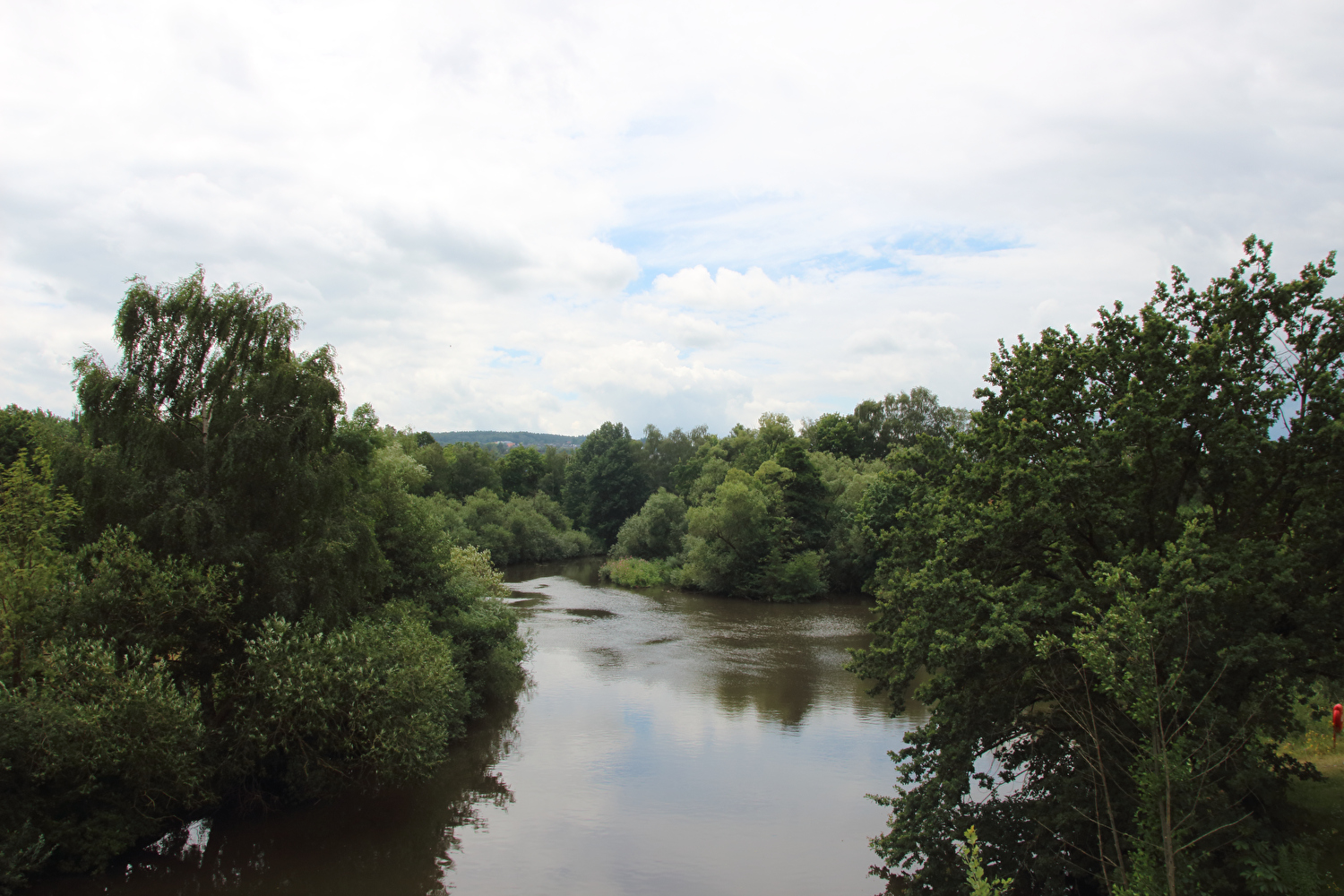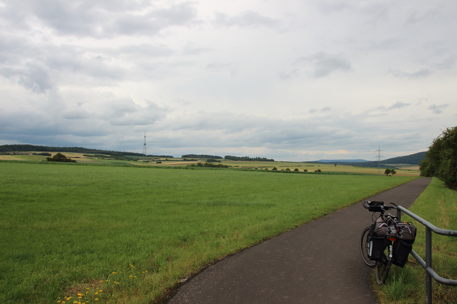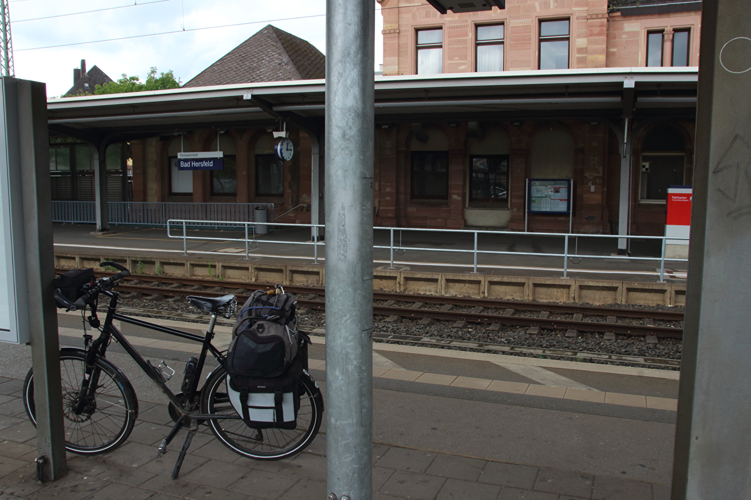 Am Abend vor Tourbeginn ließ sich noch eine Bahnverbindung mit Fahrradmitnahme im ICE bis Kassel-Wilhelmshöhe und Anschluss im durchgehenden Regionalexpress nach Bad Hersfeld buchen. Damit sollte sich eine Bahnreisezeit von 1 h 56 min mit einem Umstieg gegenüber einer Bahnreisezeit von 3 h 33 min mit zwei Umstiegen bei Nutzung nur von Nahverkehrszügen ergeben. Diesen Zeitvorteil wollte die Bahn an diesem Tag nicht komplett gewähren. Als böses Omen fing es bei der Anfahrt zum Hauptbahnhof an zu regnen. Der ICE kam mit so viel Verspätung in Kassel-Wilhelmshöhe an, dass der Anschluss nach Bad Hersfeld nicht mehr erreicht wurde. Mit dem Folgezug ergab sich eine Bahnreisezeit von 2 h 28 min, also mal eben 32 min ≙ 27,6 % Bahnreisezeit oben drauf.