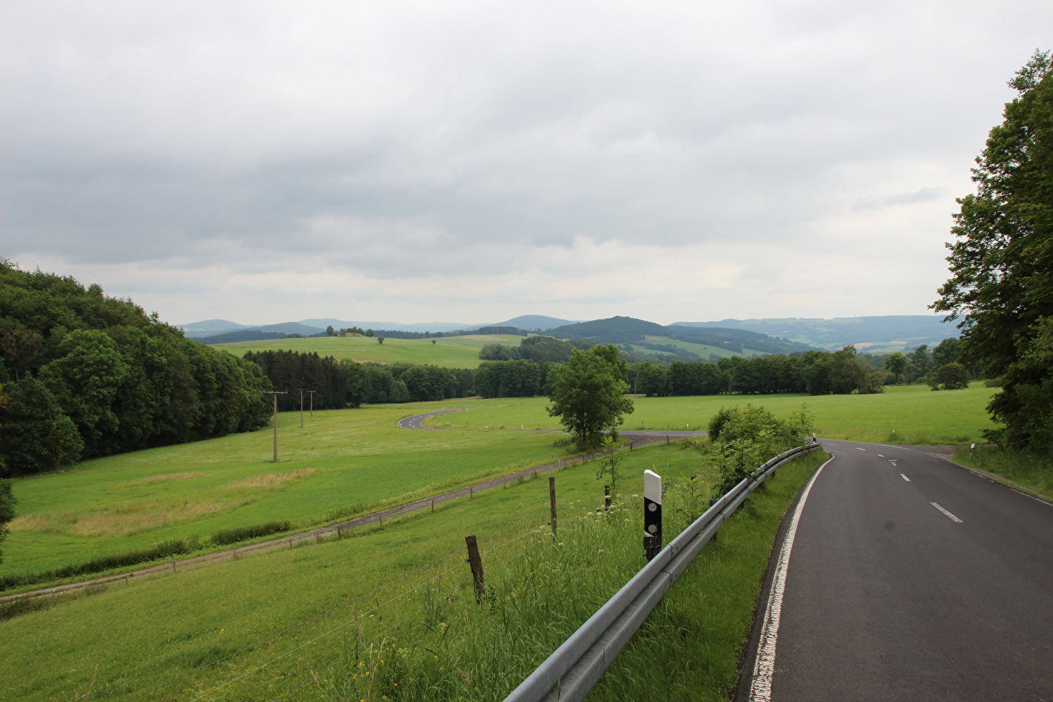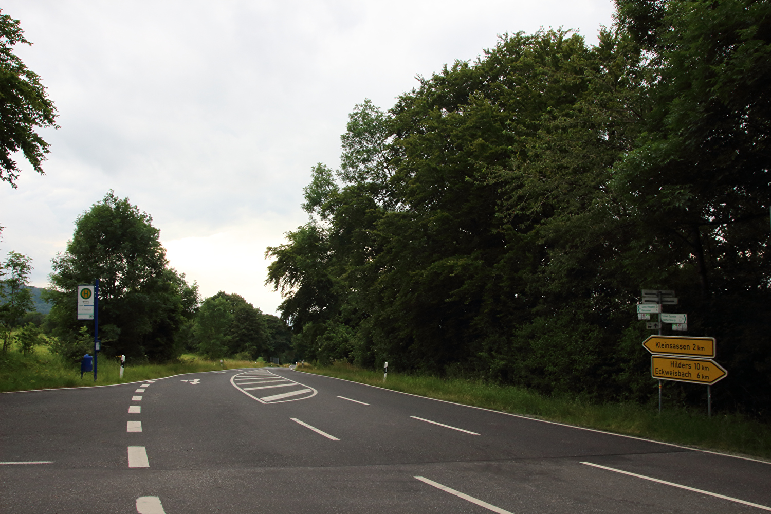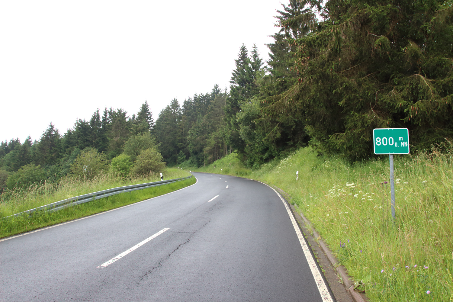 An diesem Tag blieb es bedeckt und für die Jahreszeit zu kalt, aber bis über den 1. Sattelpunkt der Etappe hinaus noch trocken. Wohl witterungsbedingt wurden die Straßen nur von wenig Stinkeverkehr heimgesucht. Insbesondere waren kaum Knatterpötte unterwegs. In Langenbieber oder Schackau wäre ein Wechsel auf den Milseburgradweg bis Rupsroth möglich gewesen. Bei sonnig warmem Wetter mit entsprechend Stinkeverkehr auf den Straßen wäre das sicherlich eine Alternative gewesen. Allerdings liegt im Verlauf dieses Radweges ein 1172 m langer ganzjährig kühler Tunnel, dessen Durchquerung sich nicht gerade aufdrängt, wenn es draußen schon zu kalt und durch eine geschlossene Wolkendecke tagsüber recht dunkel ist. Der 1. Sattelpunkt der Etappe war ein namenloser Pass im Verlauf der L3379 am Abzweig nach Danzwiesen. Auf dessen Passhöhe steht aber wenigstens ein Schild mit Höhenangabe. Mit der Nordauffahrt von Rupsroth zur Wasserkuppe stand eine Streckenwiederholung an. Diese Nordauffahrt war erstmalig am