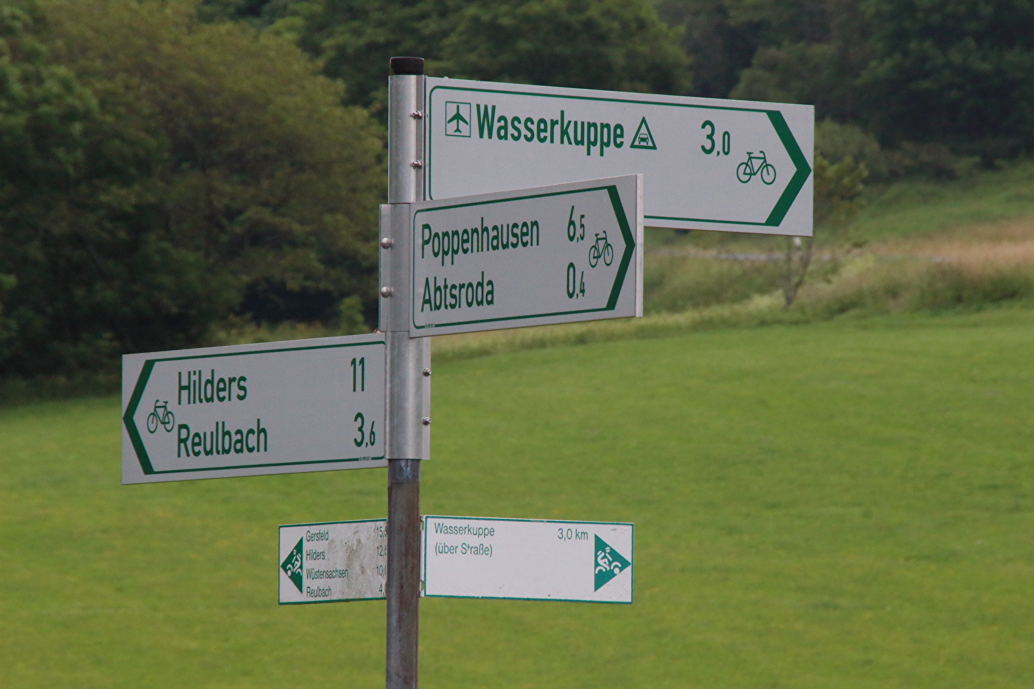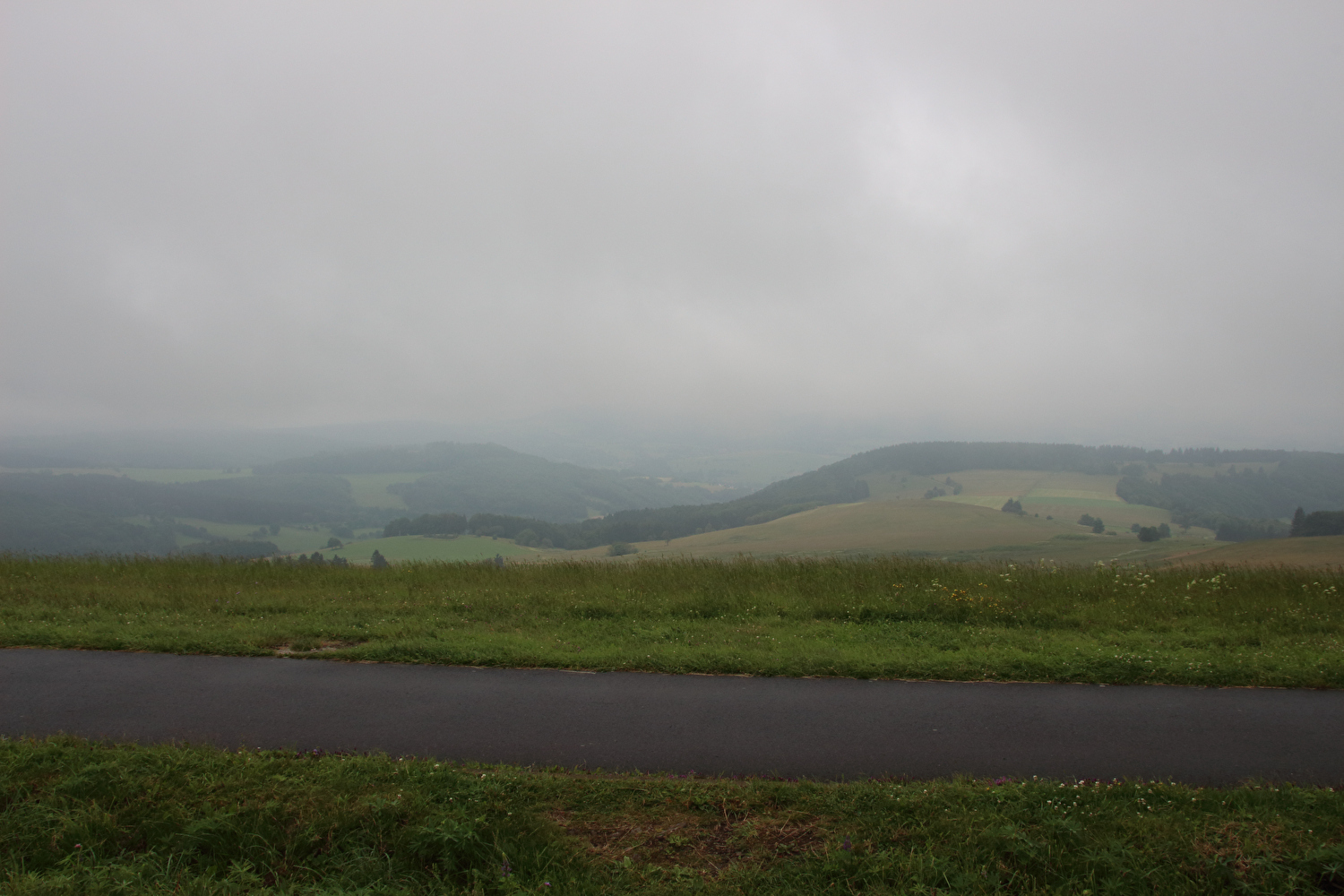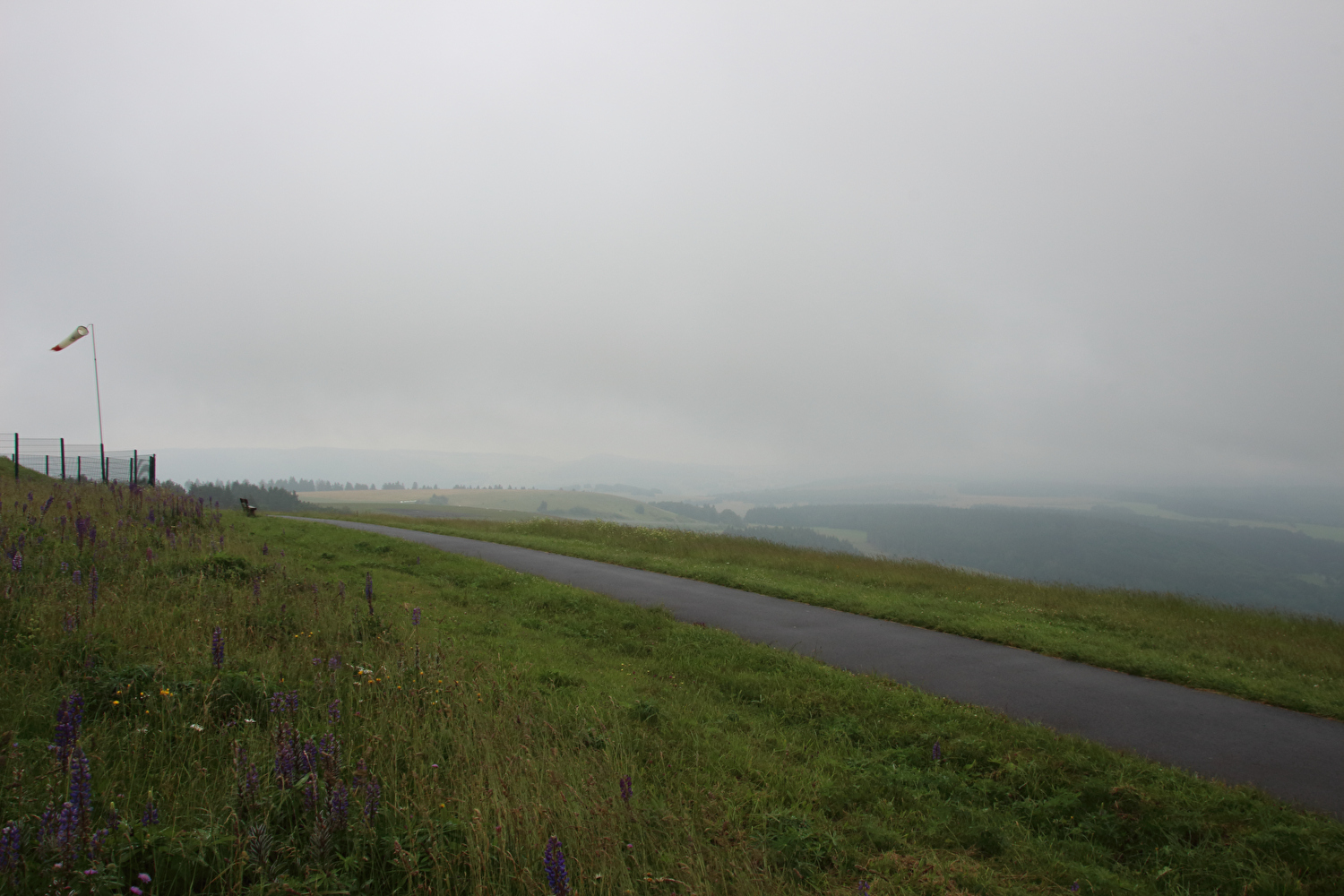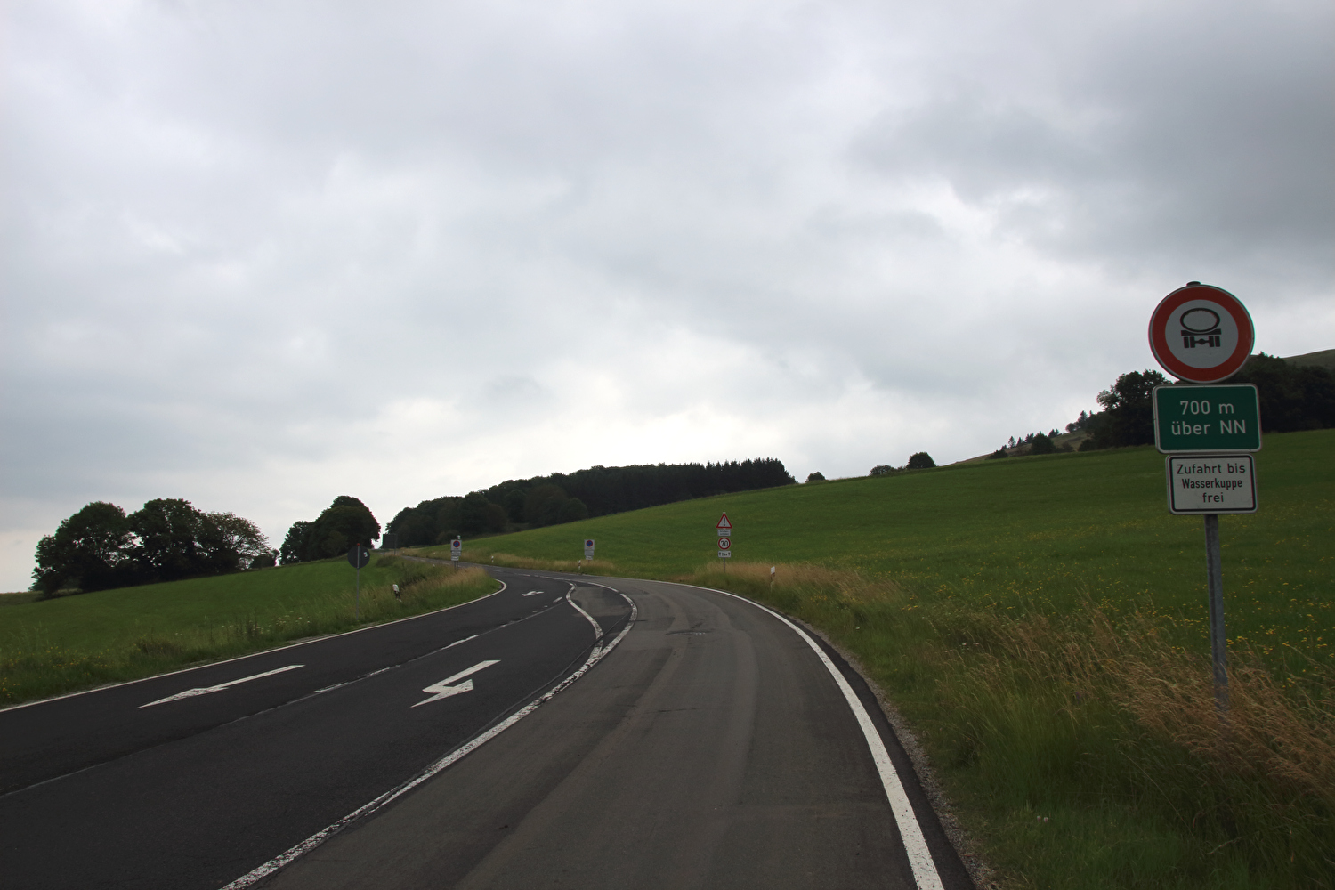 30.06.2015 gefahren worden. Bei Dietges wechselte die Etappe von der Milseburger Kuppenrhön in die Wasserkuppenrhön, die Teil der Hohen Rhön ist. In Dietges fiel während einer Futterpause ein erster vorlaufender Regenschauer, bald darauf während einer unvermeidlichen Pause in einem Wäldchen ein zweiter. Im darauf folgenden steilsten Stück der Nordauffahrt bis zum Abzweig nach Abtsroda mit Neigungen bis zu 14 %, in dem teilweise materialschonend geschoben wurde, blieb es trocken. Nach der Passage des Abzweigs nach Abtsroda setzte oberhalb 700 m ü.NHN Regen ein, der erst kurz vor Erreichen des Gipfels der Wasserkuppe wieder pausierte. Während der Bergauffahrt im Regen bewährte sich die kurze Regenhose, die anders als die lange Regenhose das Treten nicht behindert und bergauf auch warm genug war.