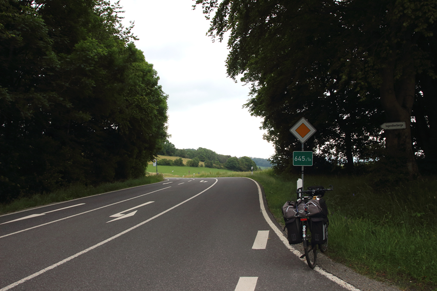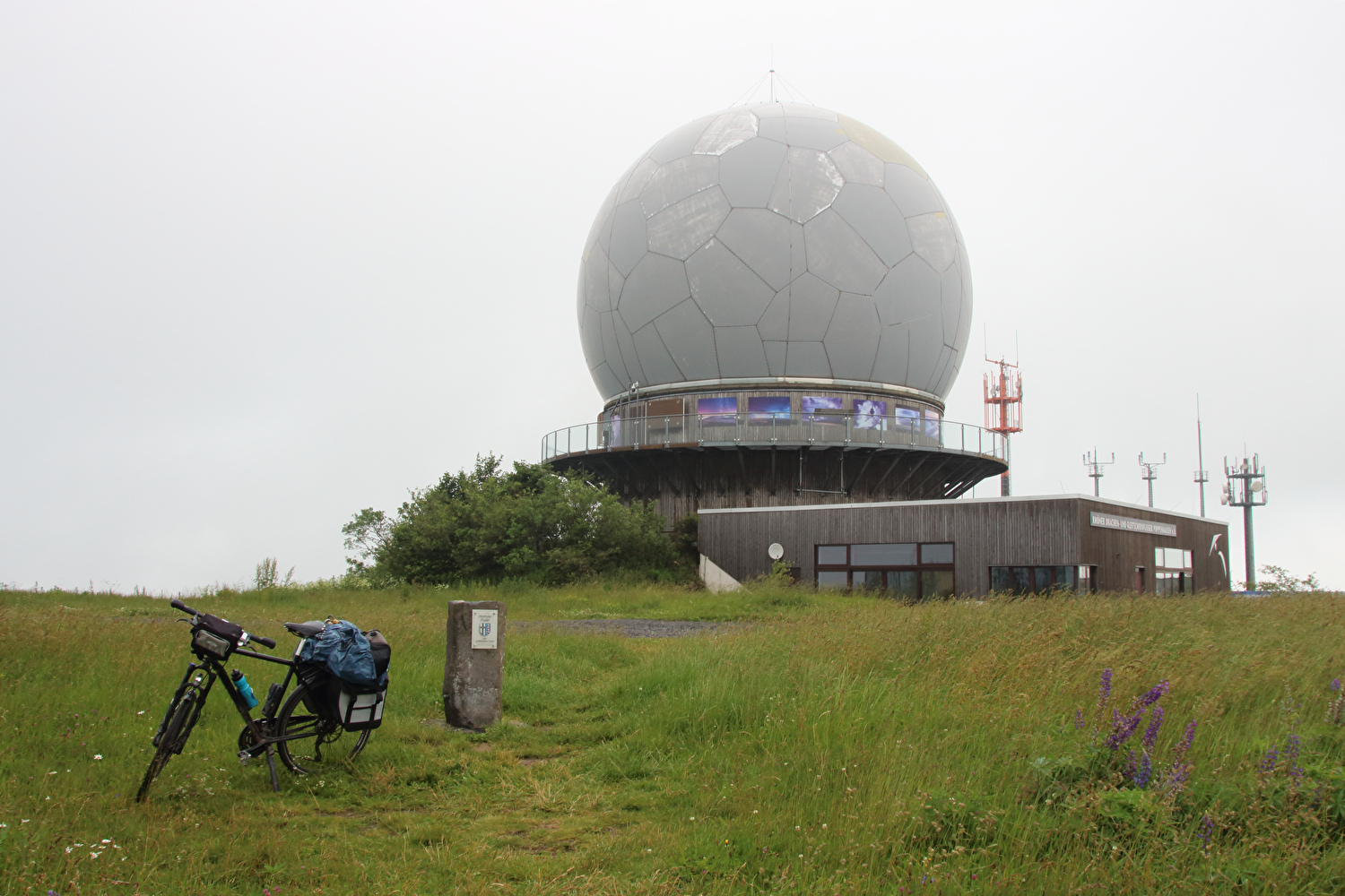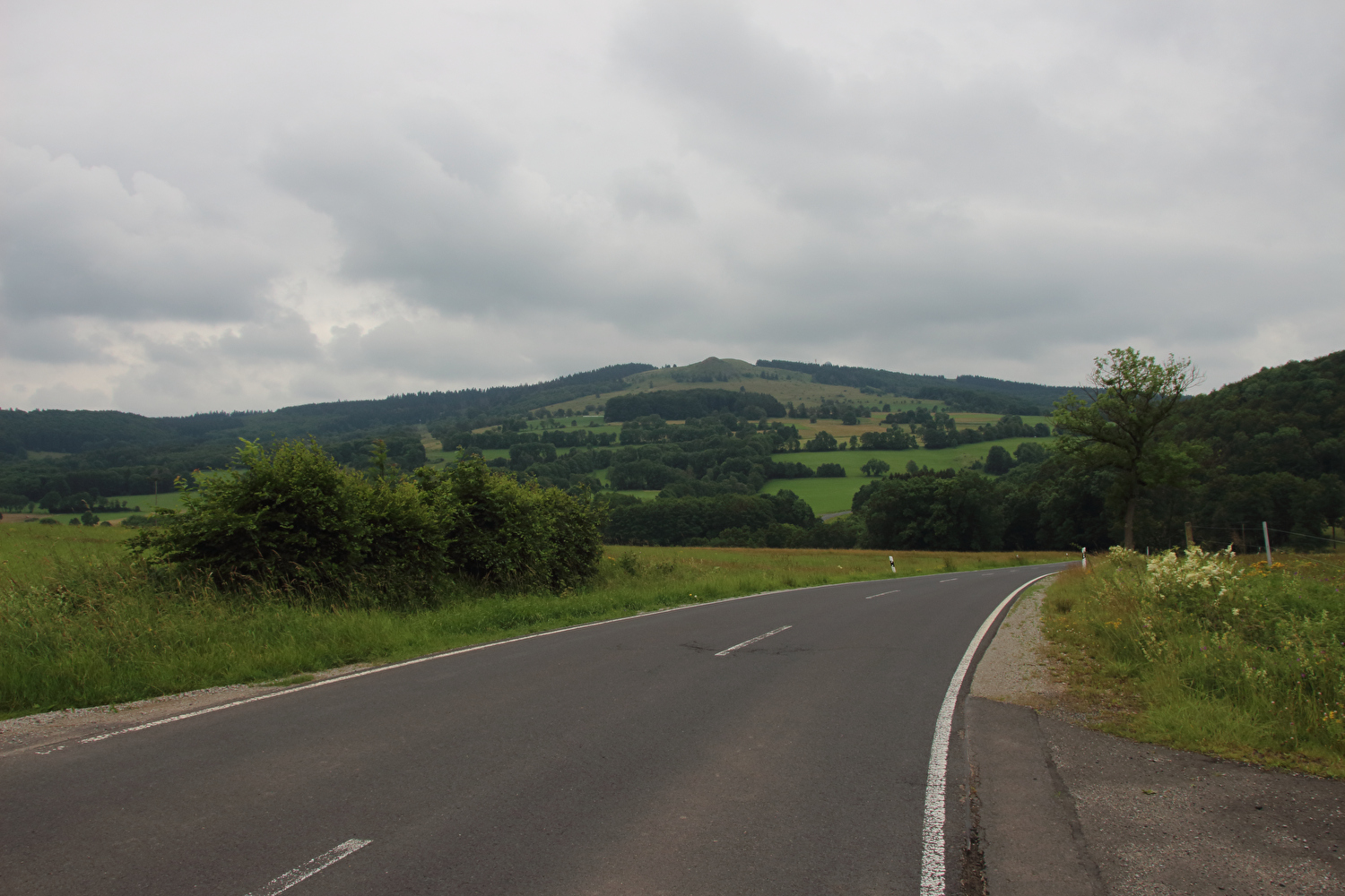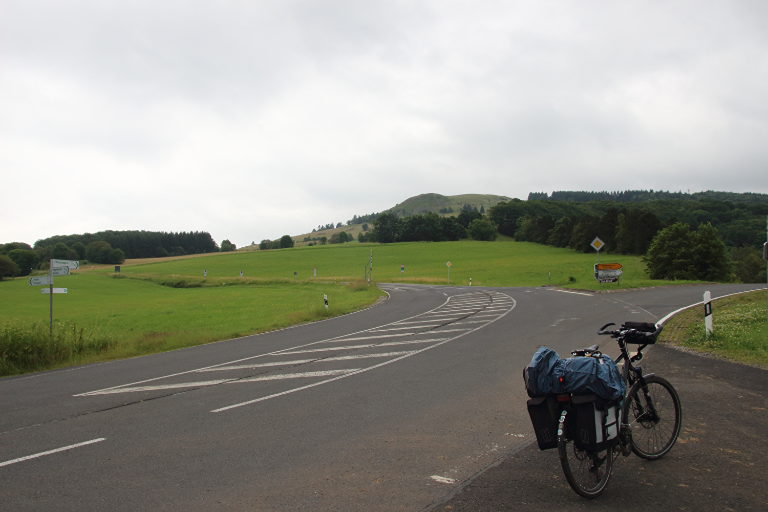 30.06.2015 gefahren worden. Bei Dietges wechselte die Etappe von der Milseburger Kuppenrhön in die Wasserkuppenrhön, die Teil der Hohen Rhön ist. In Dietges fiel während einer Futterpause ein erster vorlaufender Regenschauer, bald darauf während einer unvermeidlichen Pause in einem Wäldchen ein zweiter. Im darauf folgenden steilsten Stück der Nordauffahrt bis zum Abzweig nach Abtsroda mit Neigungen bis zu 14 %, in dem teilweise materialschonend geschoben wurde, blieb es trocken. Nach der Passage des Abzweigs nach Abtsroda setzte oberhalb 700 m ü.NHN Regen ein, der erst kurz vor Erreichen des Gipfels der Wasserkuppe wieder pausierte. Während der Bergauffahrt im Regen bewährte sich die kurze Regenhose, die anders als die lange Regenhose das Treten nicht behindert und bergauf auch warm genug war.