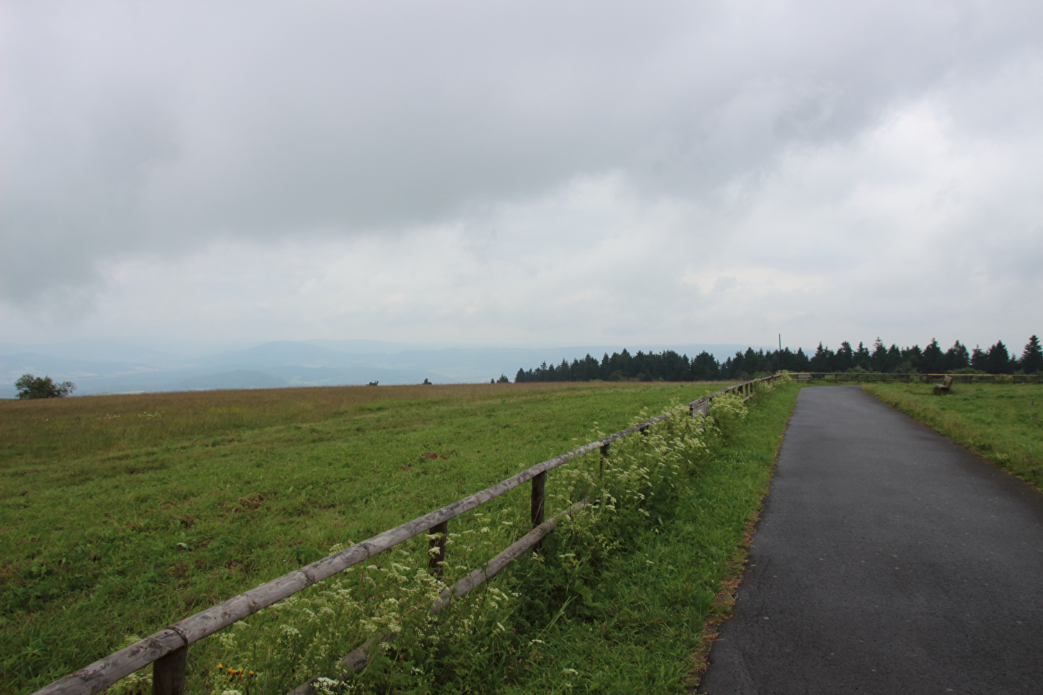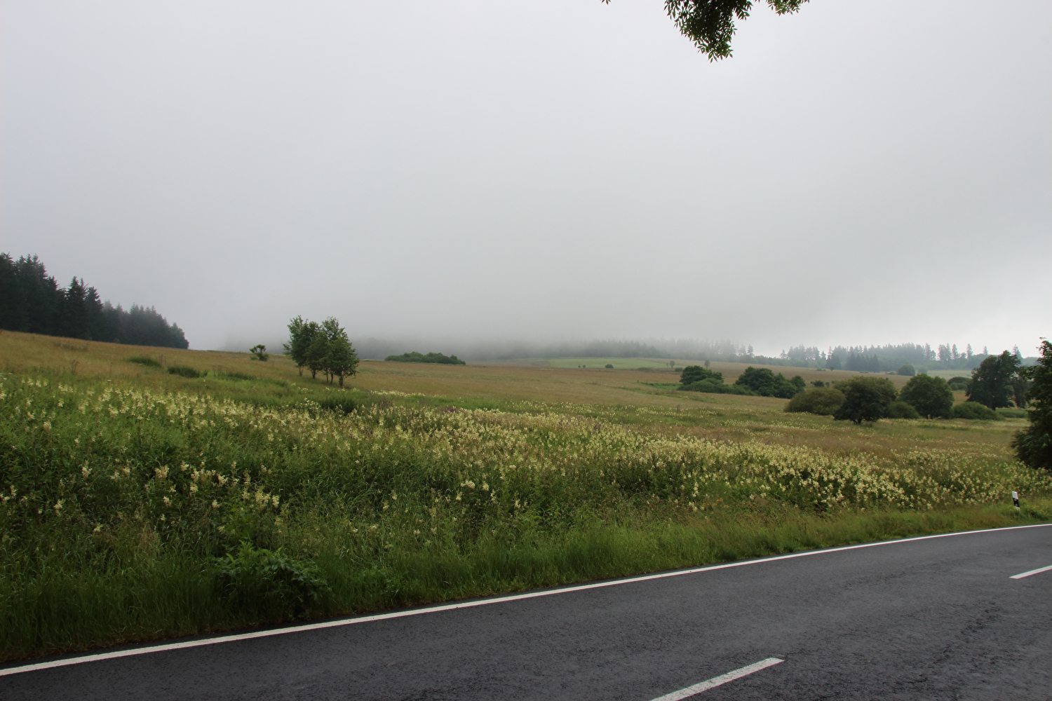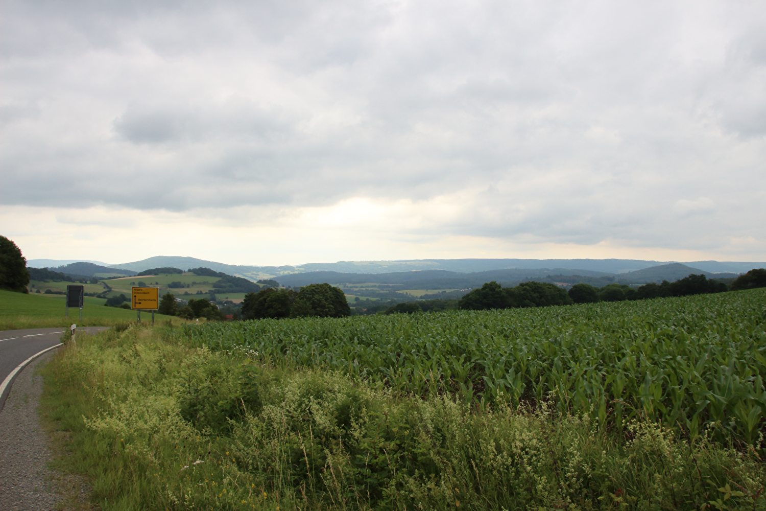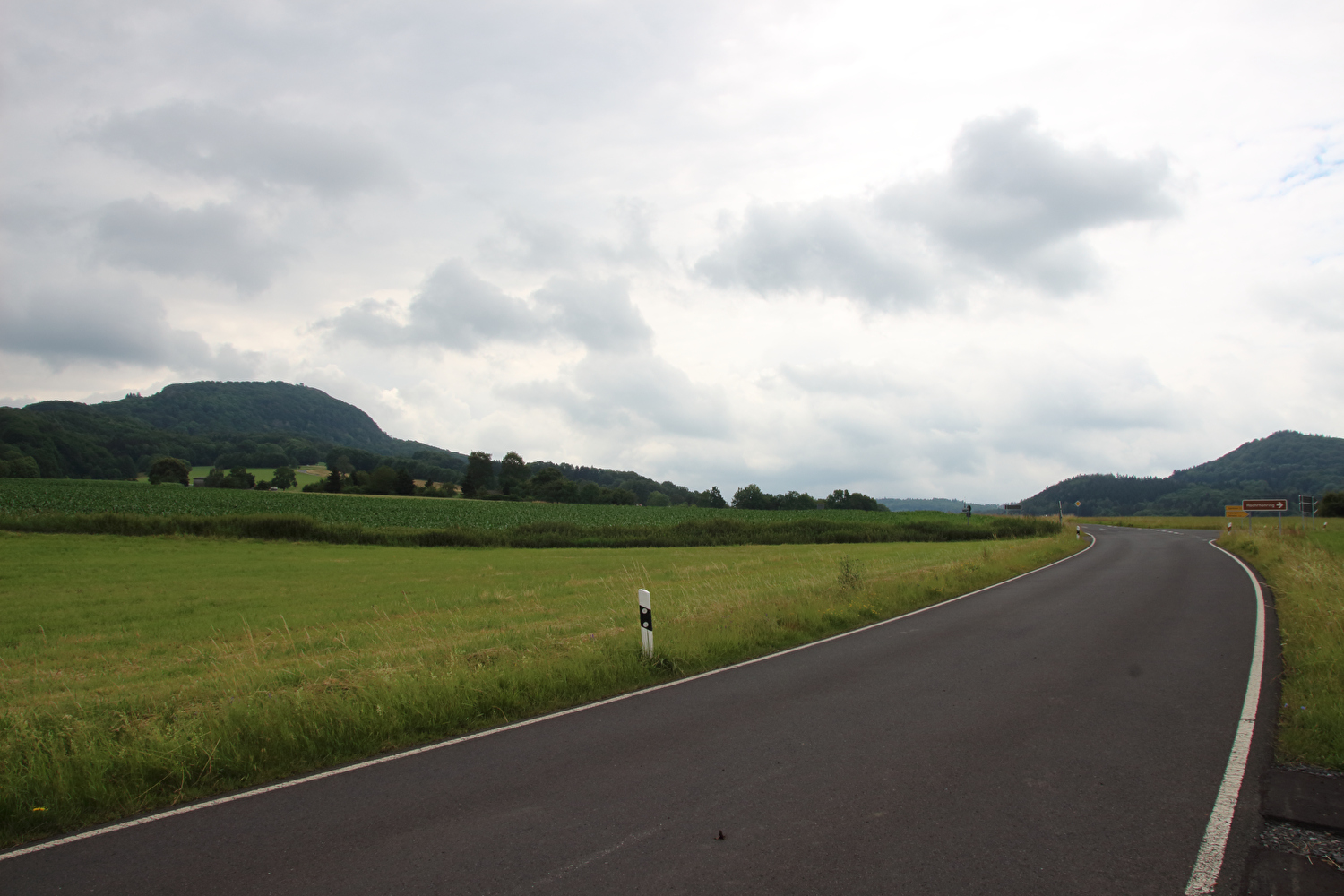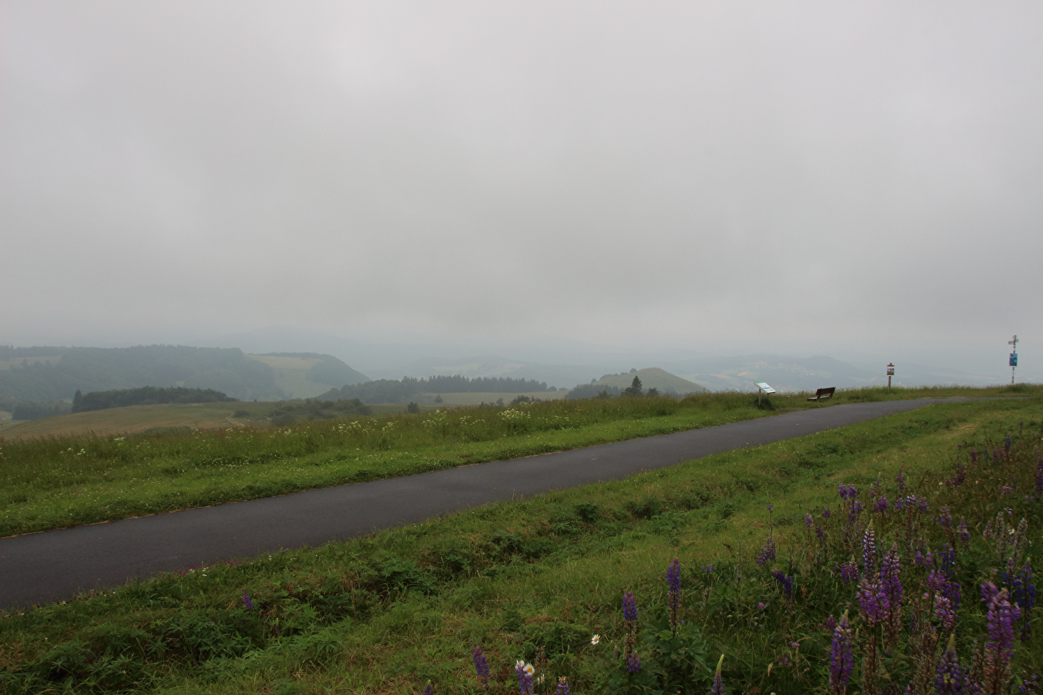 30.06.2015 gefahren worden. Bei Dietges wechselte die Etappe von der Milseburger Kuppenrhön in die Wasserkuppenrhön, die Teil der Hohen Rhön ist. In Dietges fiel während einer Futterpause ein erster vorlaufender Regenschauer, bald darauf während einer unvermeidlichen Pause in einem Wäldchen ein zweiter. Im darauf folgenden steilsten Stück der Nordauffahrt bis zum Abzweig nach Abtsroda mit Neigungen bis zu 14 %, in dem teilweise materialschonend geschoben wurde, blieb es trocken. Nach der Passage des Abzweigs nach Abtsroda setzte oberhalb 700 m ü.NHN Regen ein, der erst kurz vor Erreichen des Gipfels der Wasserkuppe wieder pausierte. Während der Bergauffahrt im Regen bewährte sich die kurze Regenhose, die anders als die lange Regenhose das Treten nicht behindert und bergauf auch warm genug war.