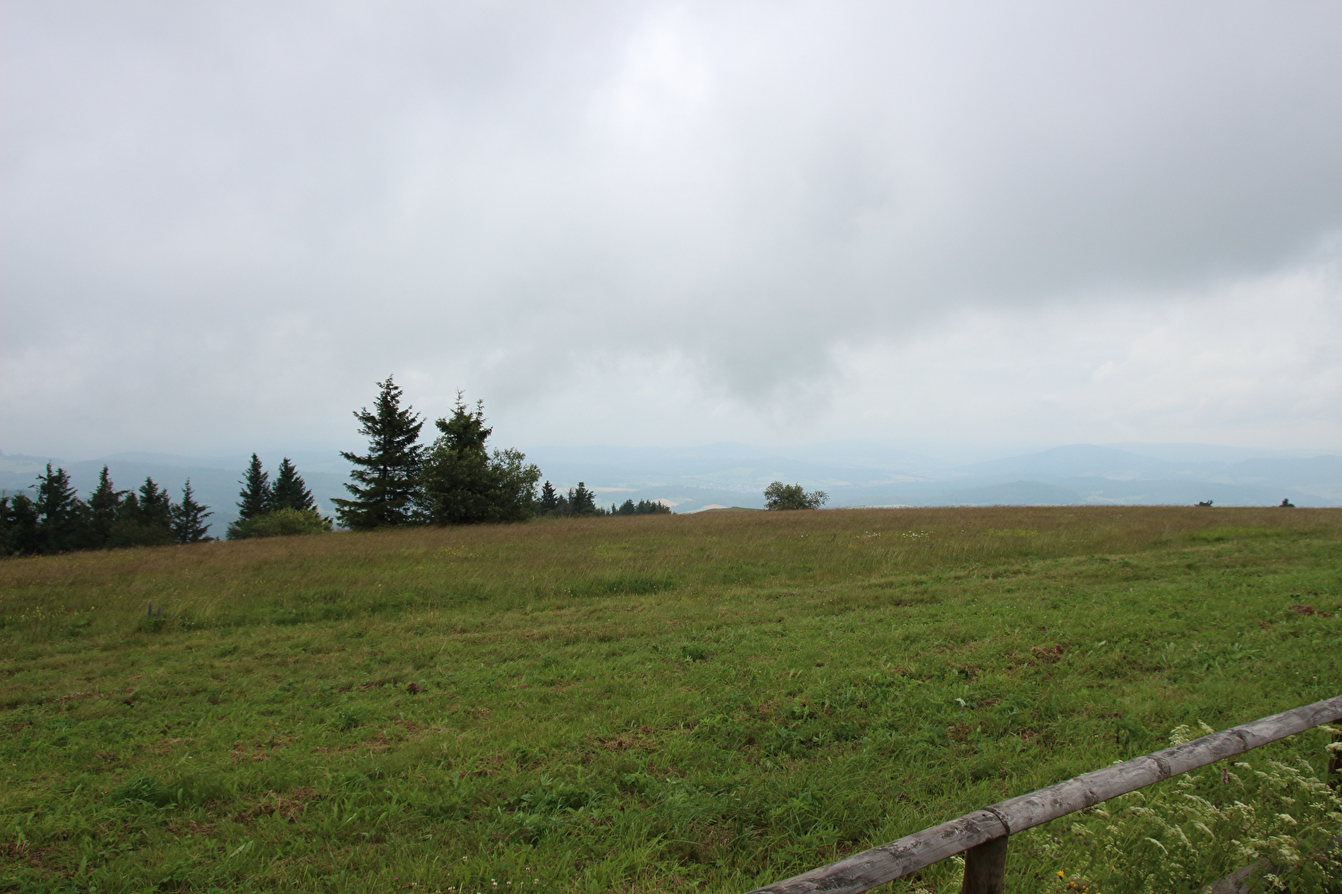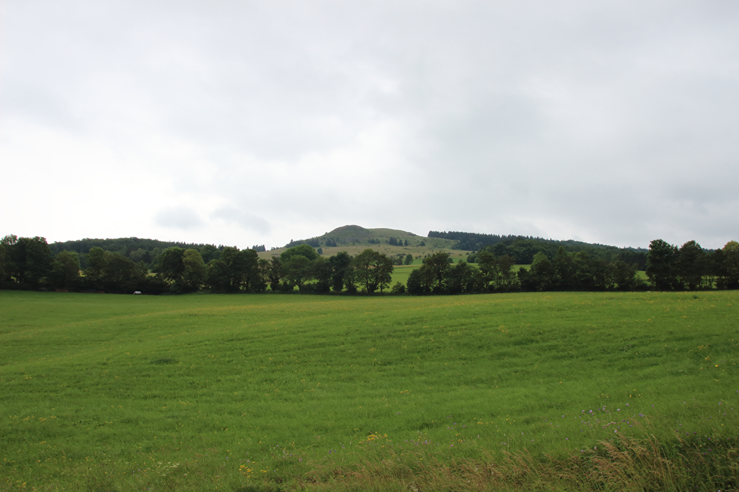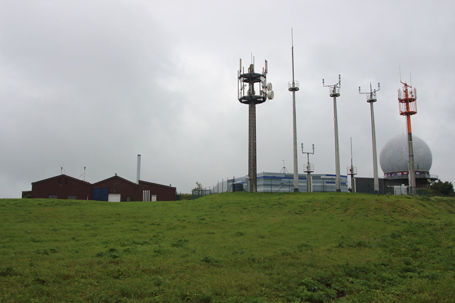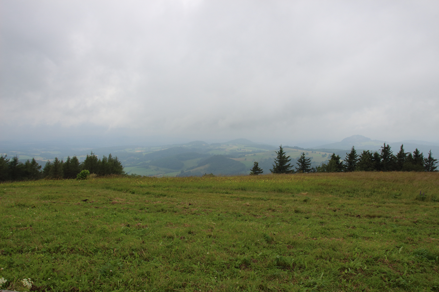 30.06.2015 gefahren worden. Bei Dietges wechselte die Etappe von der Milseburger Kuppenrhön in die Wasserkuppenrhön, die Teil der Hohen Rhön ist. In Dietges fiel während einer Futterpause ein erster vorlaufender Regenschauer, bald darauf während einer unvermeidlichen Pause in einem Wäldchen ein zweiter. Im darauf folgenden steilsten Stück der Nordauffahrt bis zum Abzweig nach Abtsroda mit Neigungen bis zu 14 %, in dem teilweise materialschonend geschoben wurde, blieb es trocken. Nach der Passage des Abzweigs nach Abtsroda setzte oberhalb 700 m ü.NHN Regen ein, der erst kurz vor Erreichen des Gipfels der Wasserkuppe wieder pausierte. Während der Bergauffahrt im Regen bewährte sich die kurze Regenhose, die anders als die lange Regenhose das Treten nicht behindert und bergauf auch warm genug war.