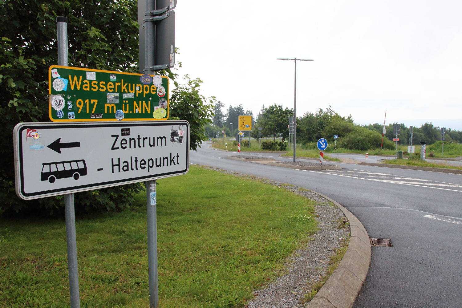 Am auf 917 m ü.NHN gelegenen Kulminationspunkt der L3068 auf der Wasserkuppe, der aber keine Passhöhe ist und auch noch deutlich unterhalb des Gipfels liegt, steht ein Schild mit Höhenangabe, das leider genauso mit diesen dämlichen Bapperln zugekleistert ist wie viele Passhöhenschilder in den Alpen. Am Kulminationspunkt der L3068 liegt ein bebautes Gebiet, das sich in Richtung Gipfel erstreckt, diesen aber nicht erreicht. Die Bebauung erweckt den Anschein einer Ortschaft, aber ein Ortsschild und somit ein Ortsname fehlen. In den Gebäuden nahe der L3068 befinden sich gastronomische Betriebe vom Hotel über Restaurants bis zur Imbissbude sowie Läden mit touristischem Angebot, also auch viel Nippes und Gedöns. Das Ganze erinnert an einige zugebaute Passhöhen in den Alpen wie etwa den