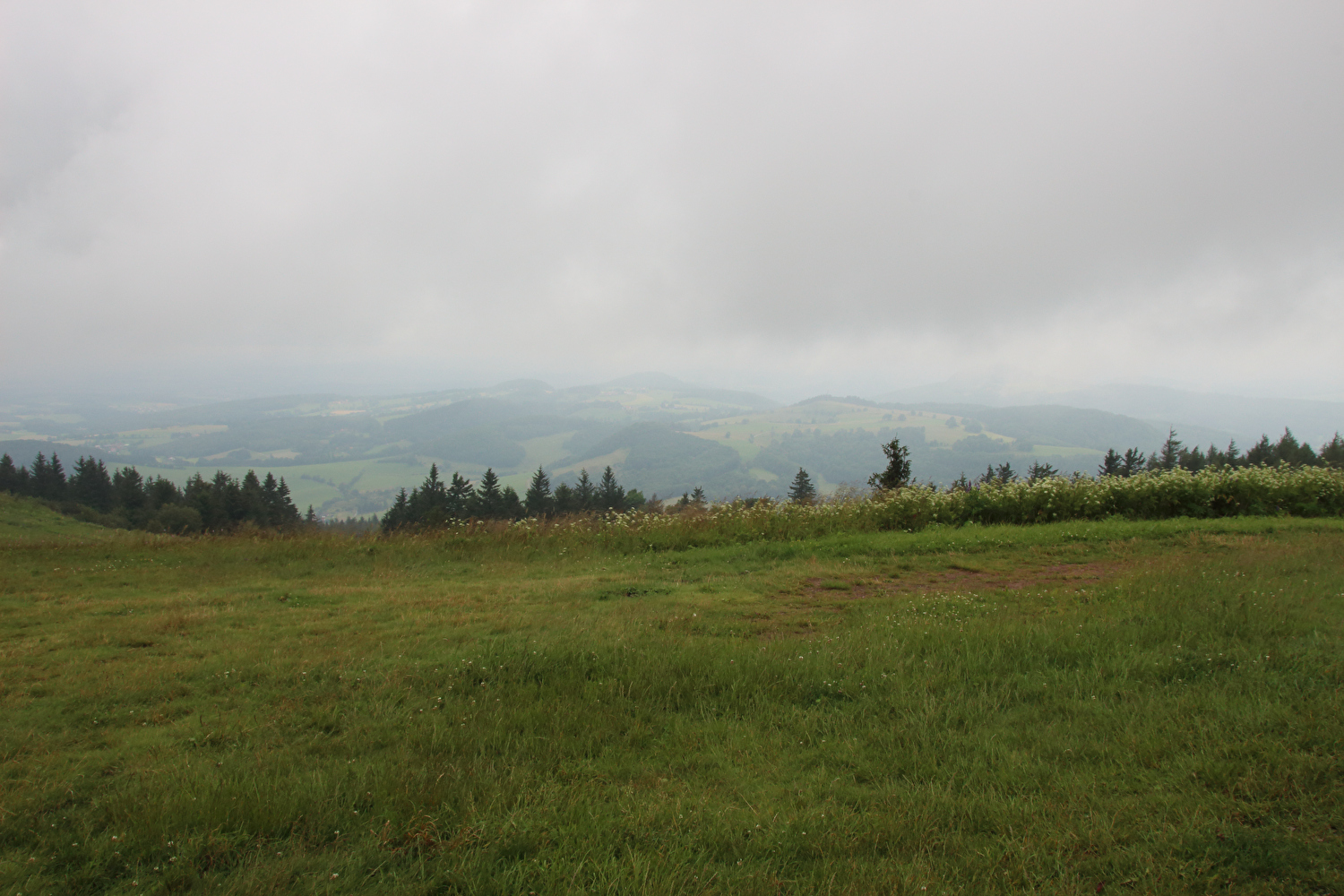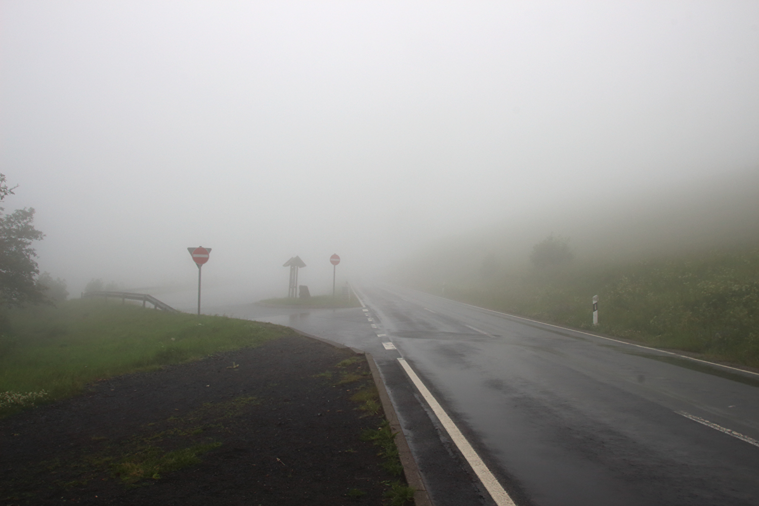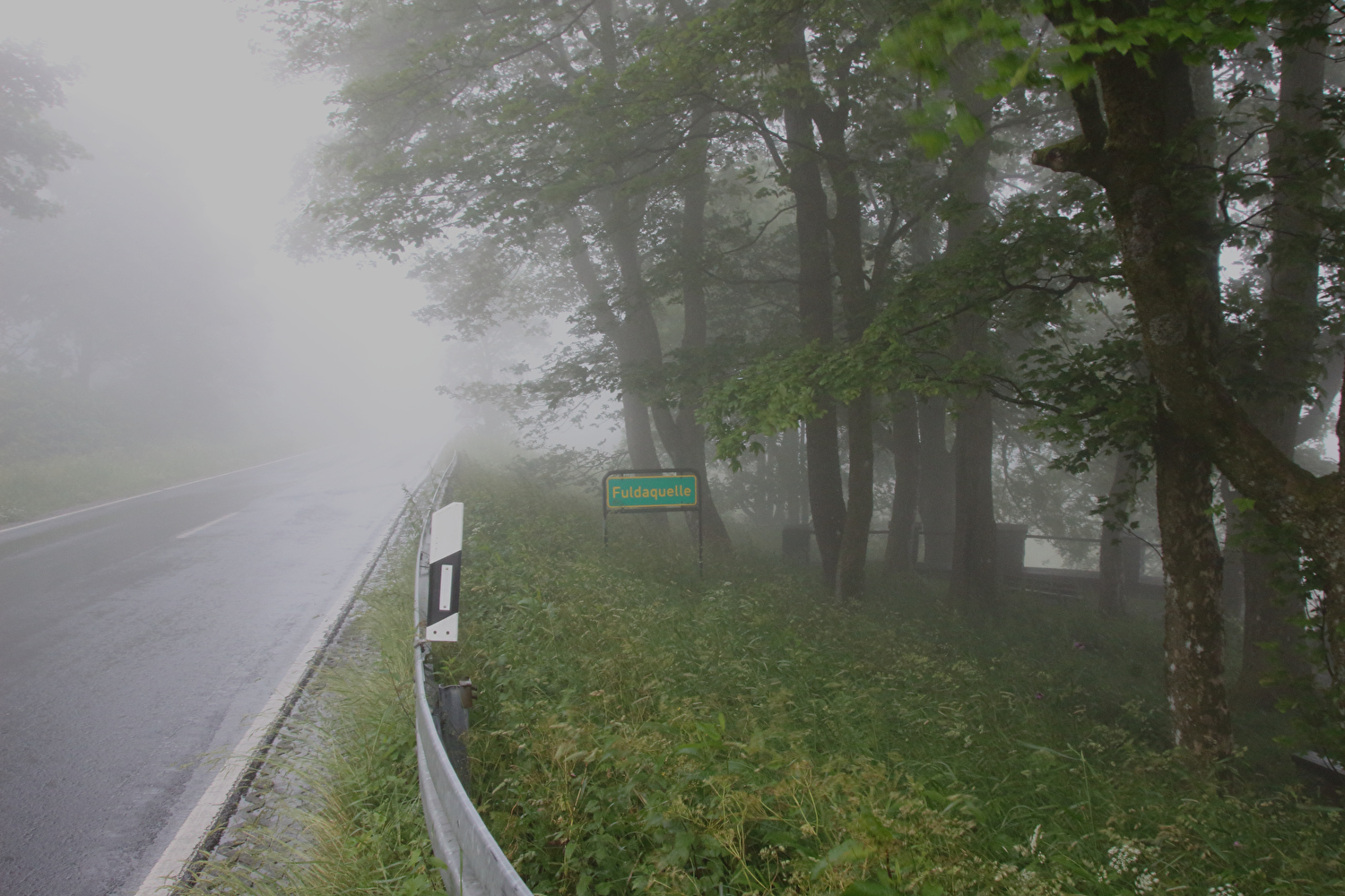 Auf dem Gipfel regnete es zwar nicht, aber der Weitblick endete überwiegend in Wolken und Nebel. Kurzzeitig hellte es sich etwas auf, aber die Wolkendecke hielt der Sonne stand und wenig später in der Abfahrt vom Gipfel setzte wieder Regen ein, der sich rasch intensivierte. Dies wurde in dem bebauten Gebiet zunächst zum Anlass für eine Futterpause an einer Imbissbude genommen. Da sich während dieser Pause aber kein Ende des Regens abzeichnete, wurden für die anstehende längere Abfahrt nach Wüstensachsen die langen Klamotten inklusive des wegen des bereits vor Tourbeginn absehbar kalten Wetters mitgeführten Thermounterhemdes angezogen, und darüber kam dann die komplett lange Garnitur der Norddeutschen Trachtenkleidung. Auf dem Weg zur Fuldaquelle ließ der Regen nach, um dem Nebel Platz zu machen, weshalb dort einige Fotos möglich waren.