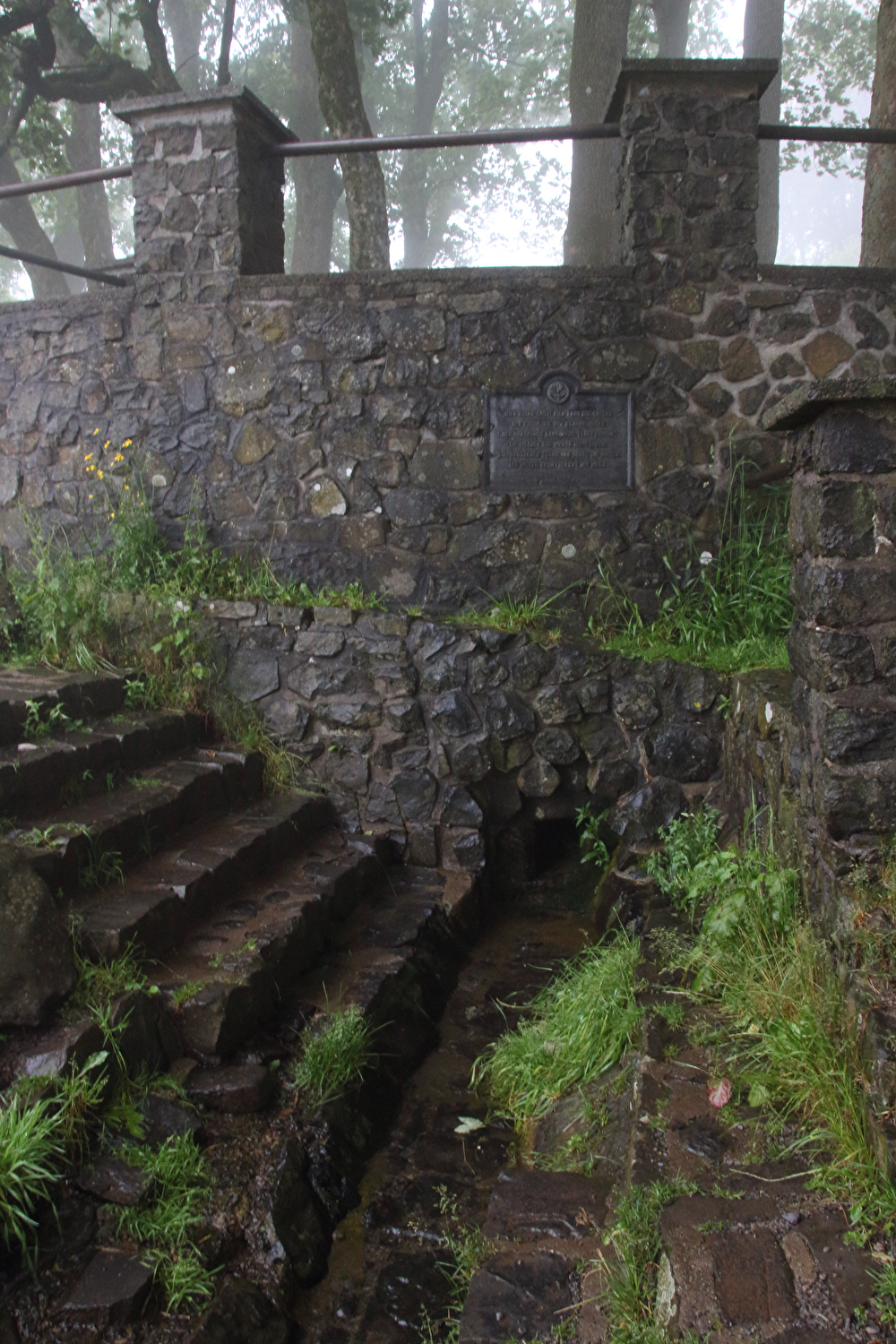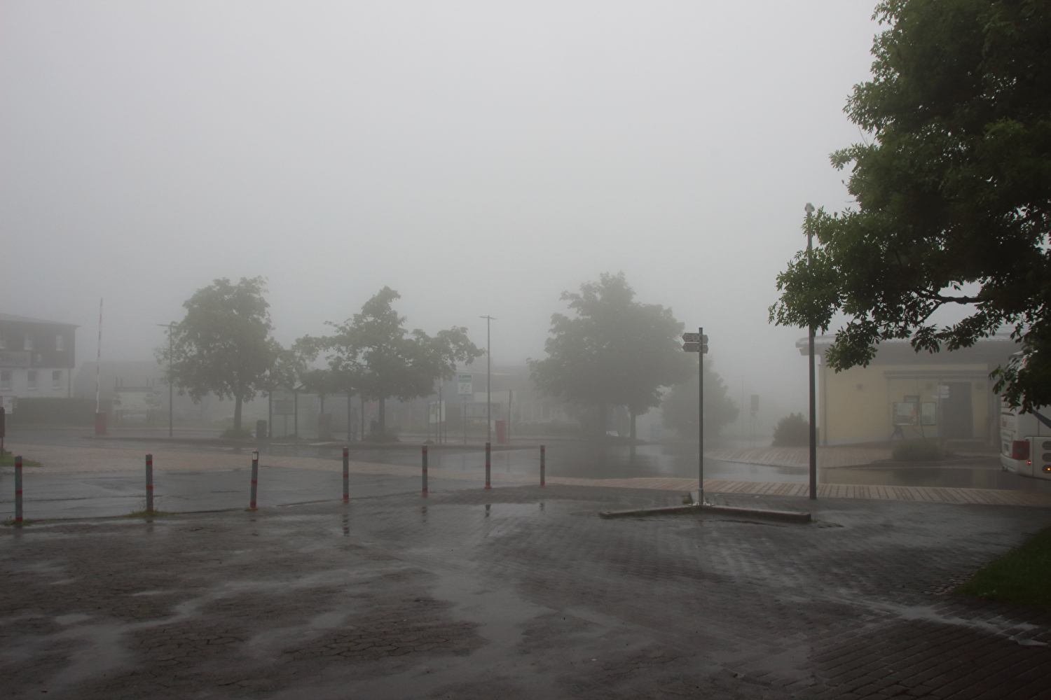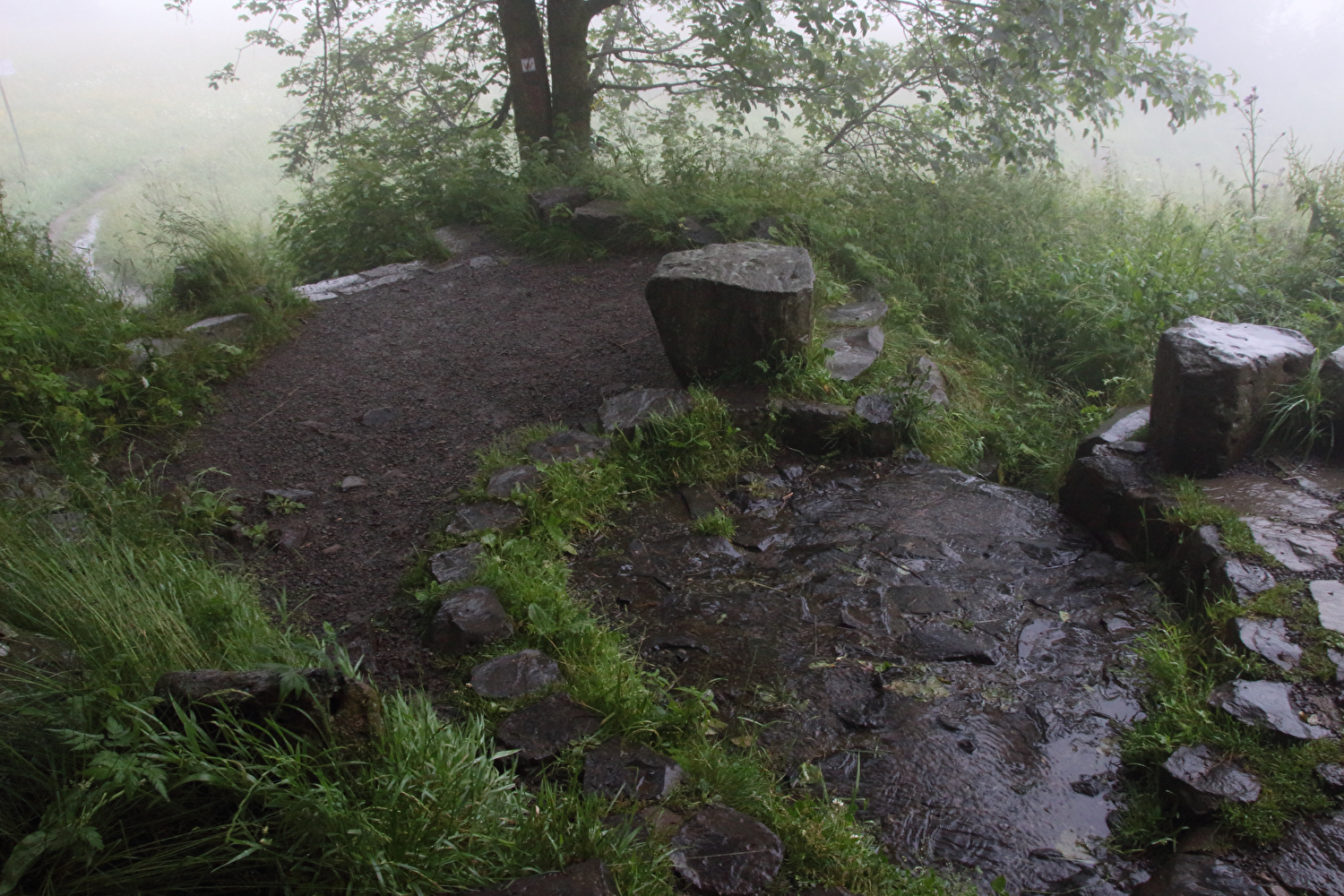 Auf dem Gipfel regnete es zwar nicht, aber der Weitblick endete überwiegend in Wolken und Nebel. Kurzzeitig hellte es sich etwas auf, aber die Wolkendecke hielt der Sonne stand und wenig später in der Abfahrt vom Gipfel setzte wieder Regen ein, der sich rasch intensivierte. Dies wurde in dem bebauten Gebiet zunächst zum Anlass für eine Futterpause an einer Imbissbude genommen. Da sich während dieser Pause aber kein Ende des Regens abzeichnete, wurden für die anstehende längere Abfahrt nach Wüstensachsen die langen Klamotten inklusive des wegen des bereits vor Tourbeginn absehbar kalten Wetters mitgeführten Thermounterhemdes angezogen, und darüber kam dann die komplett lange Garnitur der Norddeutschen Trachtenkleidung. Auf dem Weg zur Fuldaquelle ließ der Regen nach, um dem Nebel Platz zu machen, weshalb dort einige Fotos möglich waren.