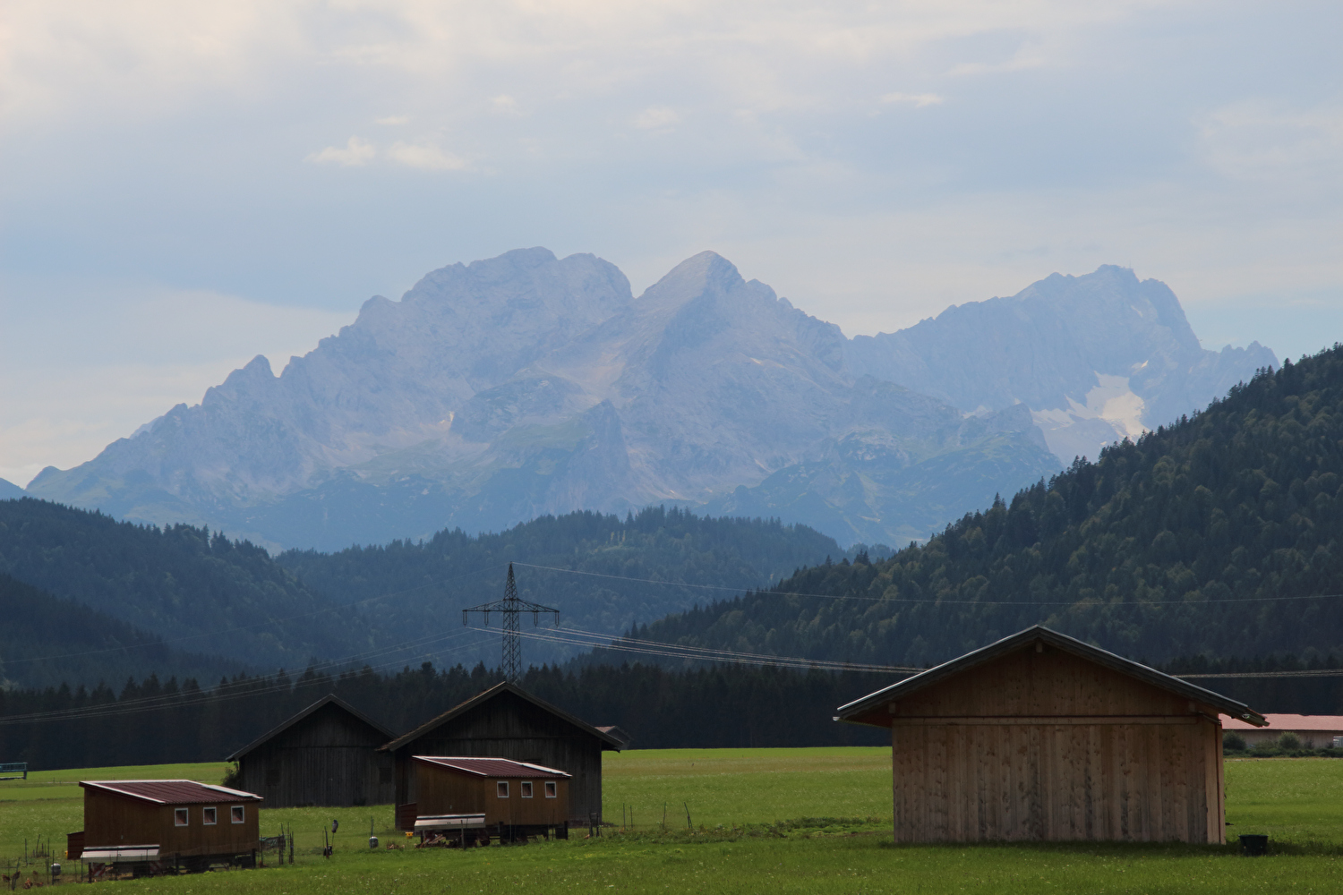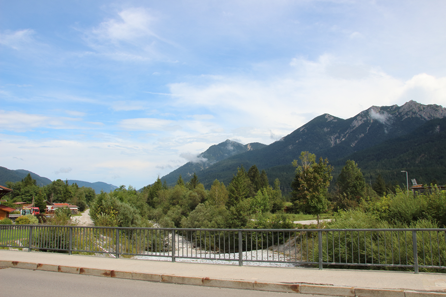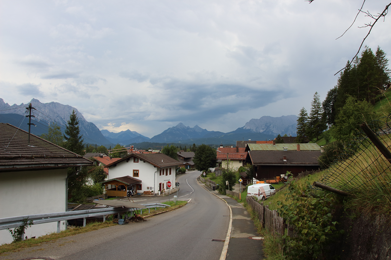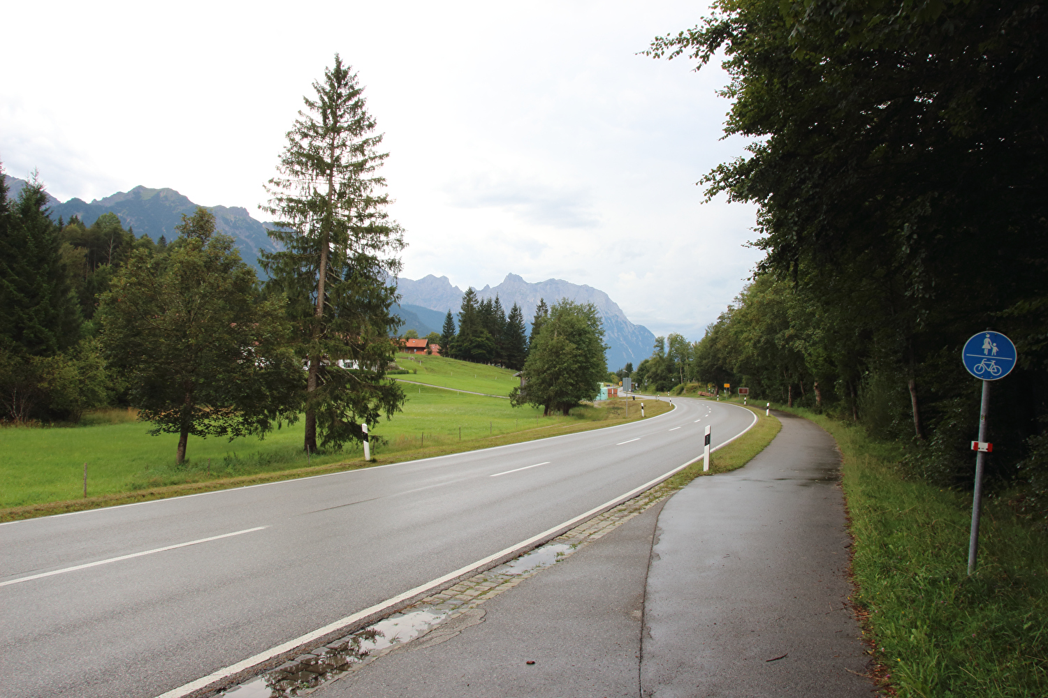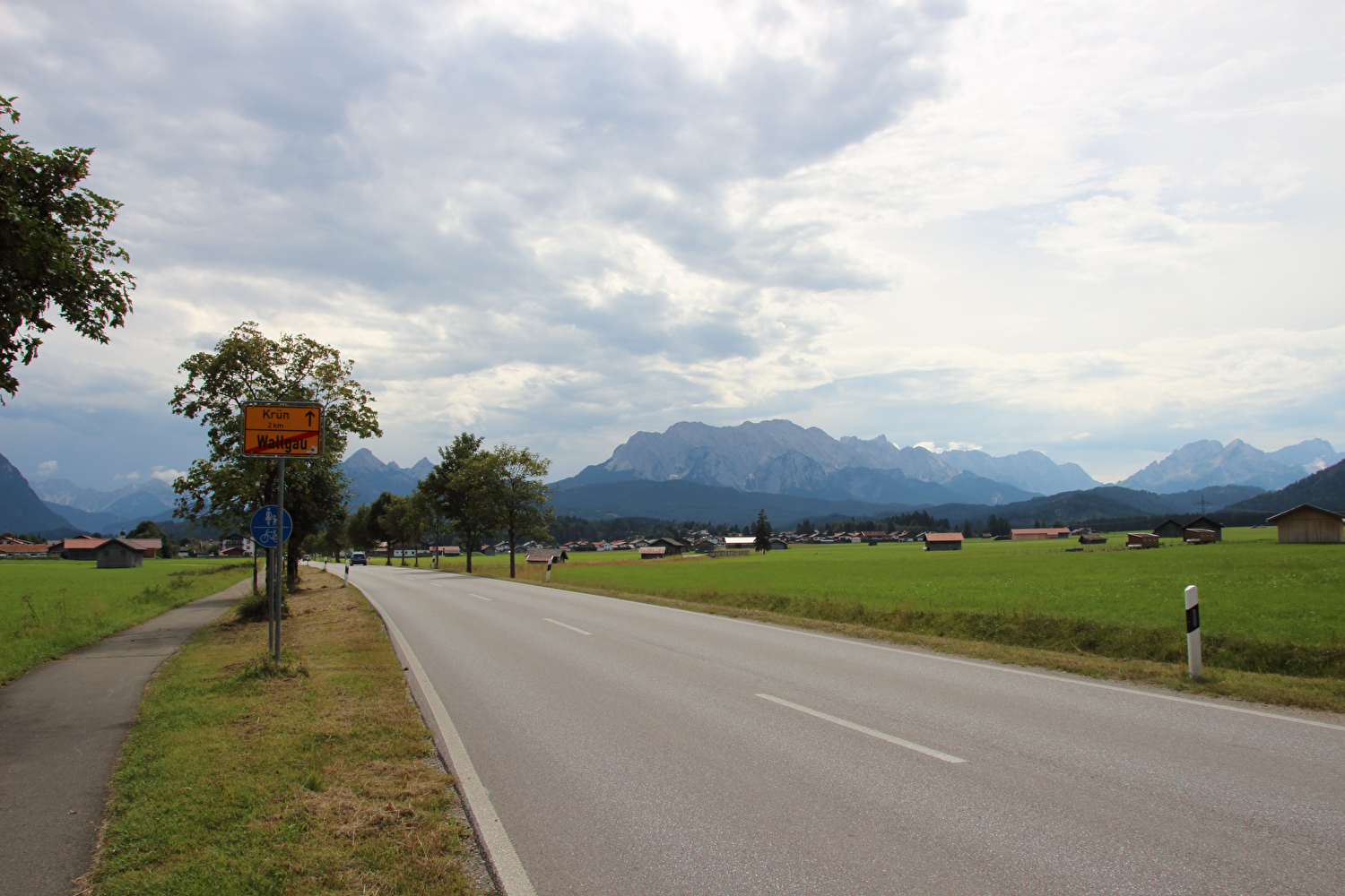 Nach der Überquerung des Kesselberg erreichte die Tour optisch die Alpen. Bei entsprechend freier Sicht zeigten sich in allen Richtungen Berge am Horizont, und das nördliche Alpenvorland mit mittelgebirgigen Landschaften und plattem Land gehörte der Vergangenheit an. Am Walchensee setzte als Konsequenz der schwülwarmen Witterung Regen ein, der sich rasch zu Starkregen intensivierte und somit zunächst die Weiterfahrt in norddeutscher Trachtenkleidung erzwang, wobei die kurze Regenhose ausreichte. Mit dem Verlassen des Walchensee folgte ein mehr oder weniger welliger, allmählich ansteigender Streckenabschnitt mit einem Sattelpunkt in Wallgau, wo der Regen wieder aufhörte. Mit dem Höllentalferner an der Zugspitze kam einer der letzten Gletscher Deutschlands ins Blickfeld. Mittenwald war an diesem Tag total überbevölkert. Das war bereits bei der Tourplanung erwartet worden, weshalb die ursprünglich dort geplante Übernachtung in einen ruhigeren Ort umgeplant worden war. Der letzte Etappenabschnitt ab Mittenwald war schon einmal am