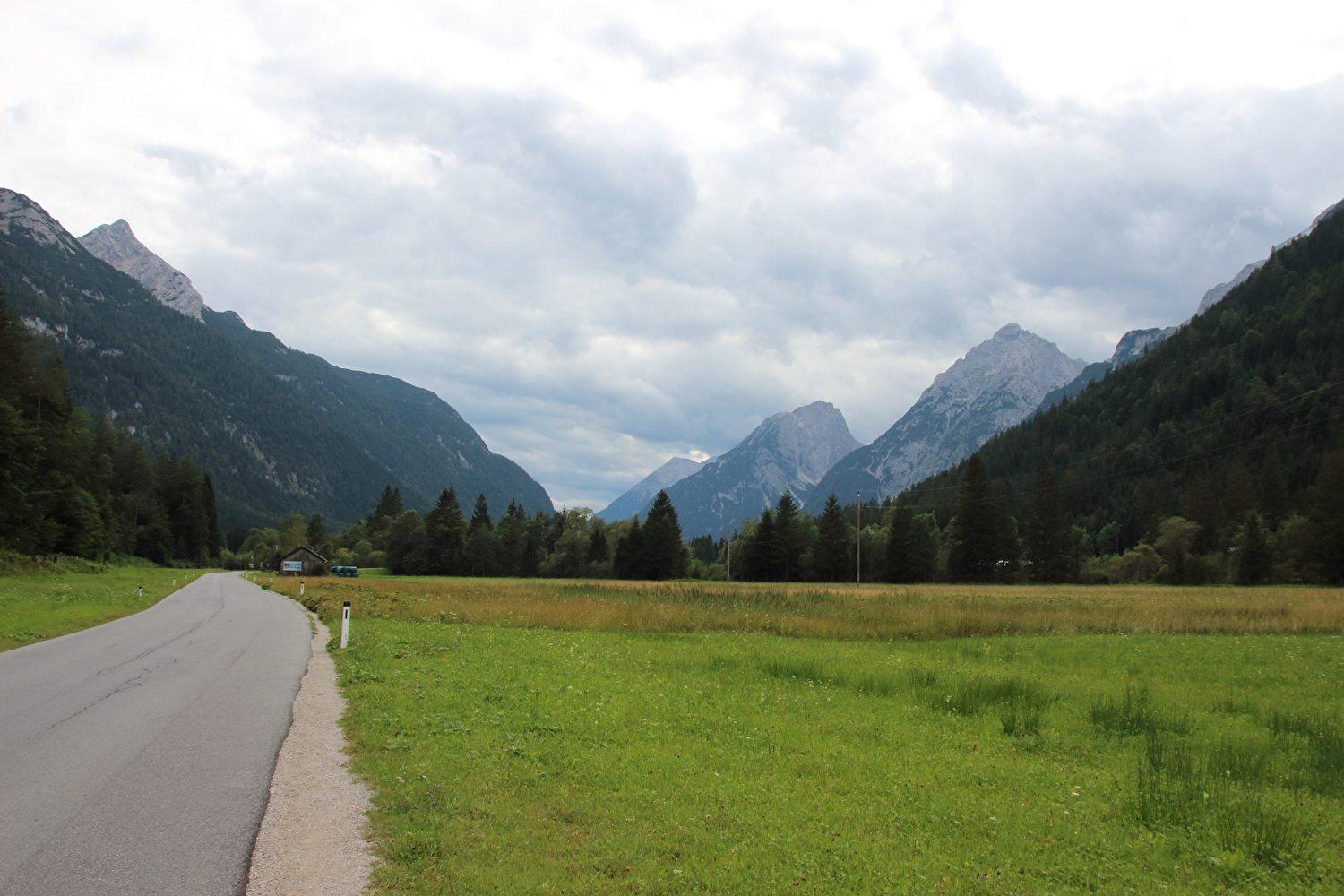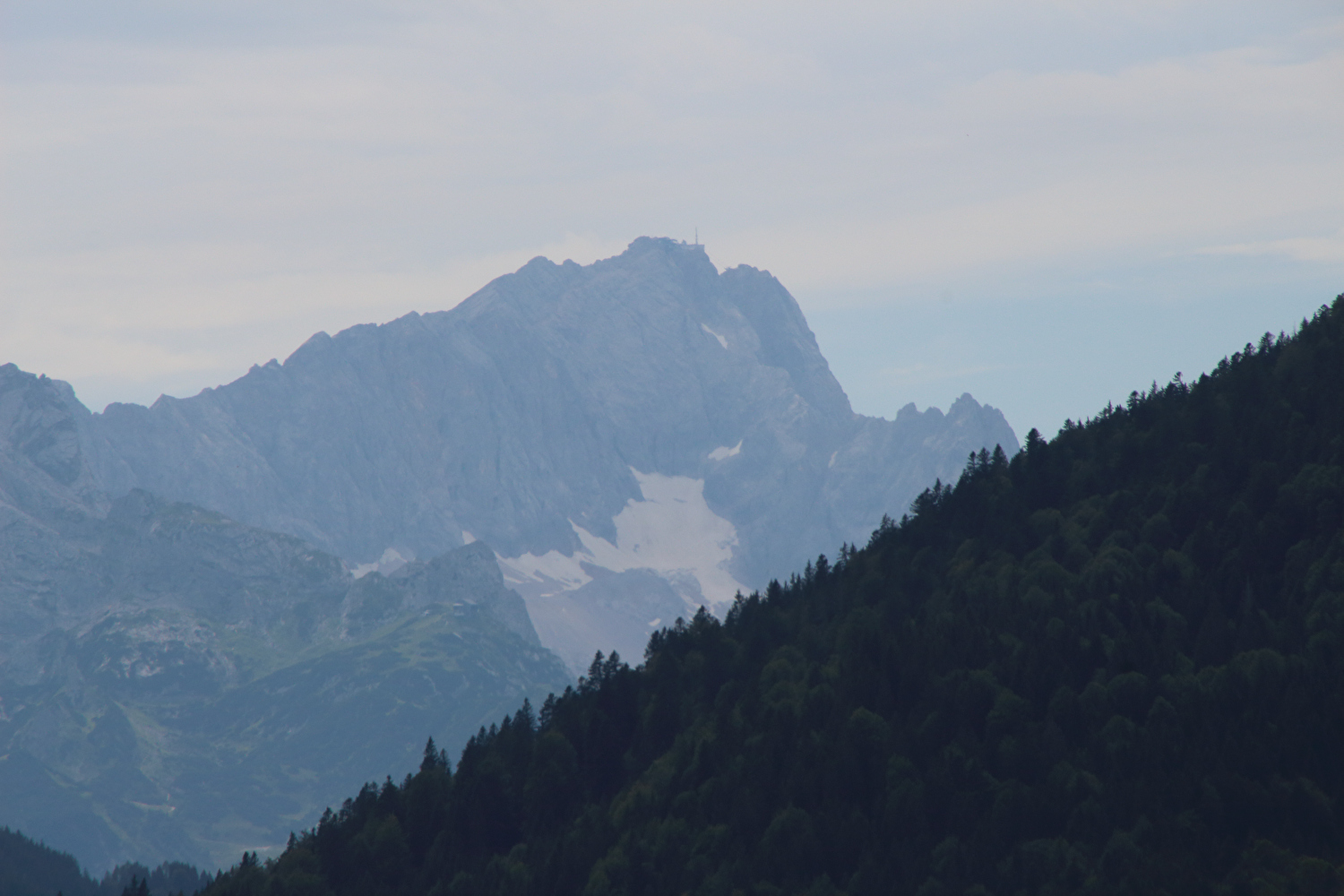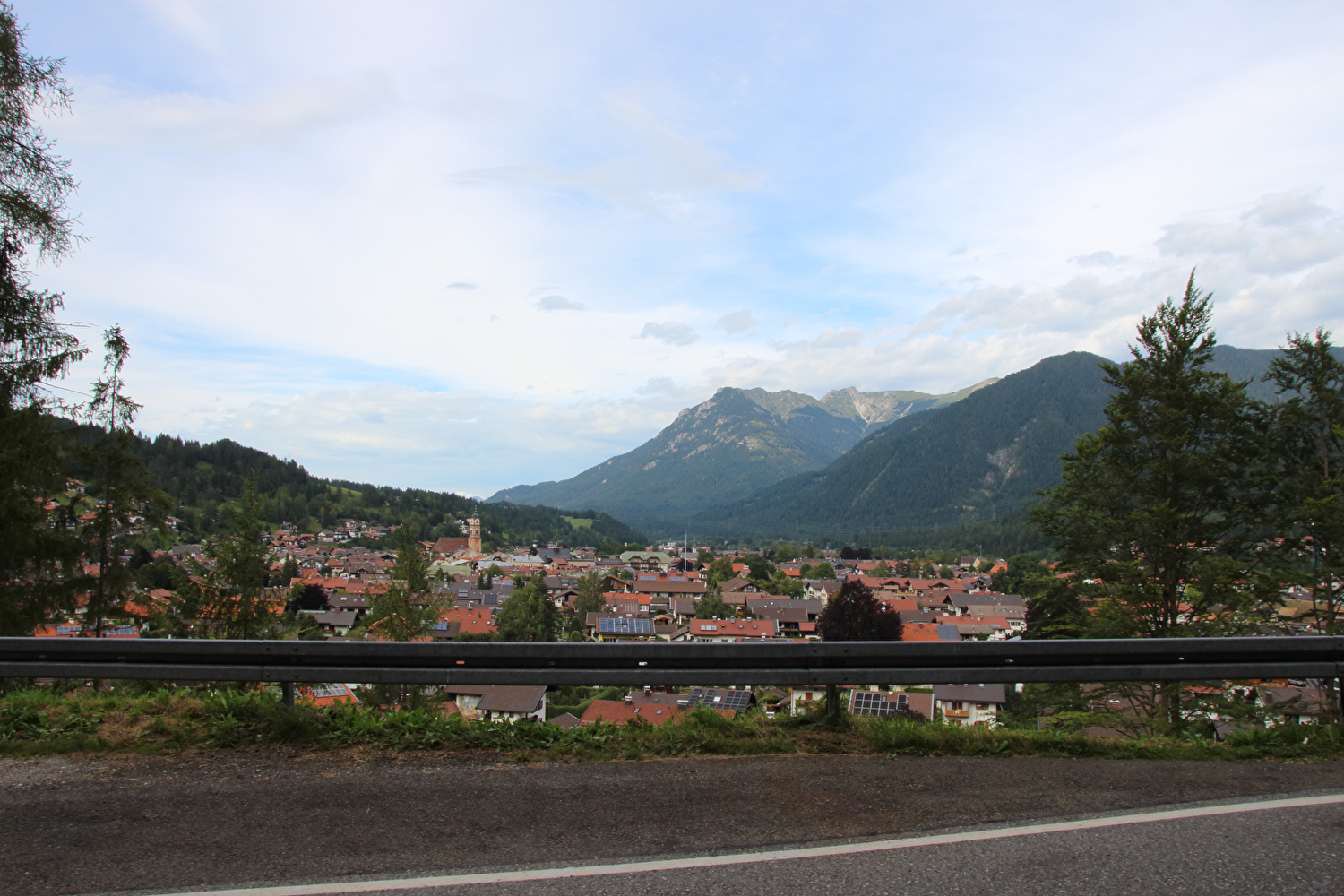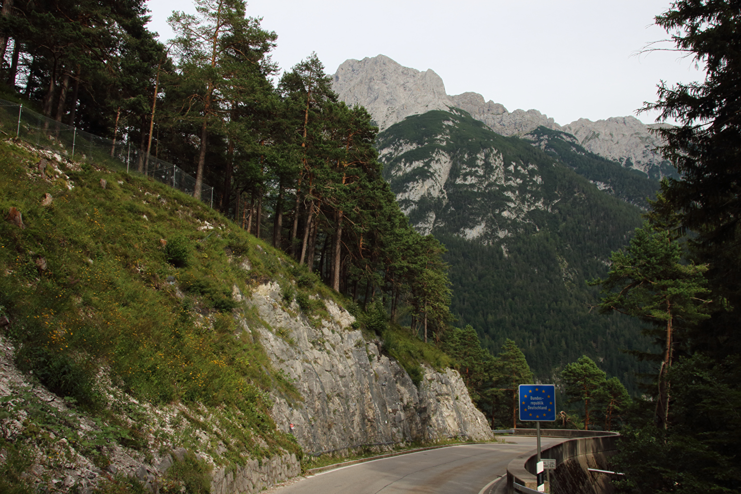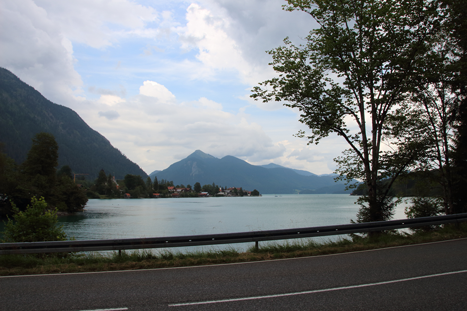 Nach der Überquerung des Kesselberg erreichte die Tour optisch die Alpen. Bei entsprechend freier Sicht zeigten sich in allen Richtungen Berge am Horizont, und das nördliche Alpenvorland mit mittelgebirgigen Landschaften und plattem Land gehörte der Vergangenheit an. Am Walchensee setzte als Konsequenz der schwülwarmen Witterung Regen ein, der sich rasch zu Starkregen intensivierte und somit zunächst die Weiterfahrt in norddeutscher Trachtenkleidung erzwang, wobei die kurze Regenhose ausreichte. Mit dem Verlassen des Walchensee folgte ein mehr oder weniger welliger, allmählich ansteigender Streckenabschnitt mit einem Sattelpunkt in Wallgau, wo der Regen wieder aufhörte. Mit dem Höllentalferner an der Zugspitze kam einer der letzten Gletscher Deutschlands ins Blickfeld. Mittenwald war an diesem Tag total überbevölkert. Das war bereits bei der Tourplanung erwartet worden, weshalb die ursprünglich dort geplante Übernachtung in einen ruhigeren Ort umgeplant worden war. Der letzte Etappenabschnitt ab Mittenwald war schon einmal am