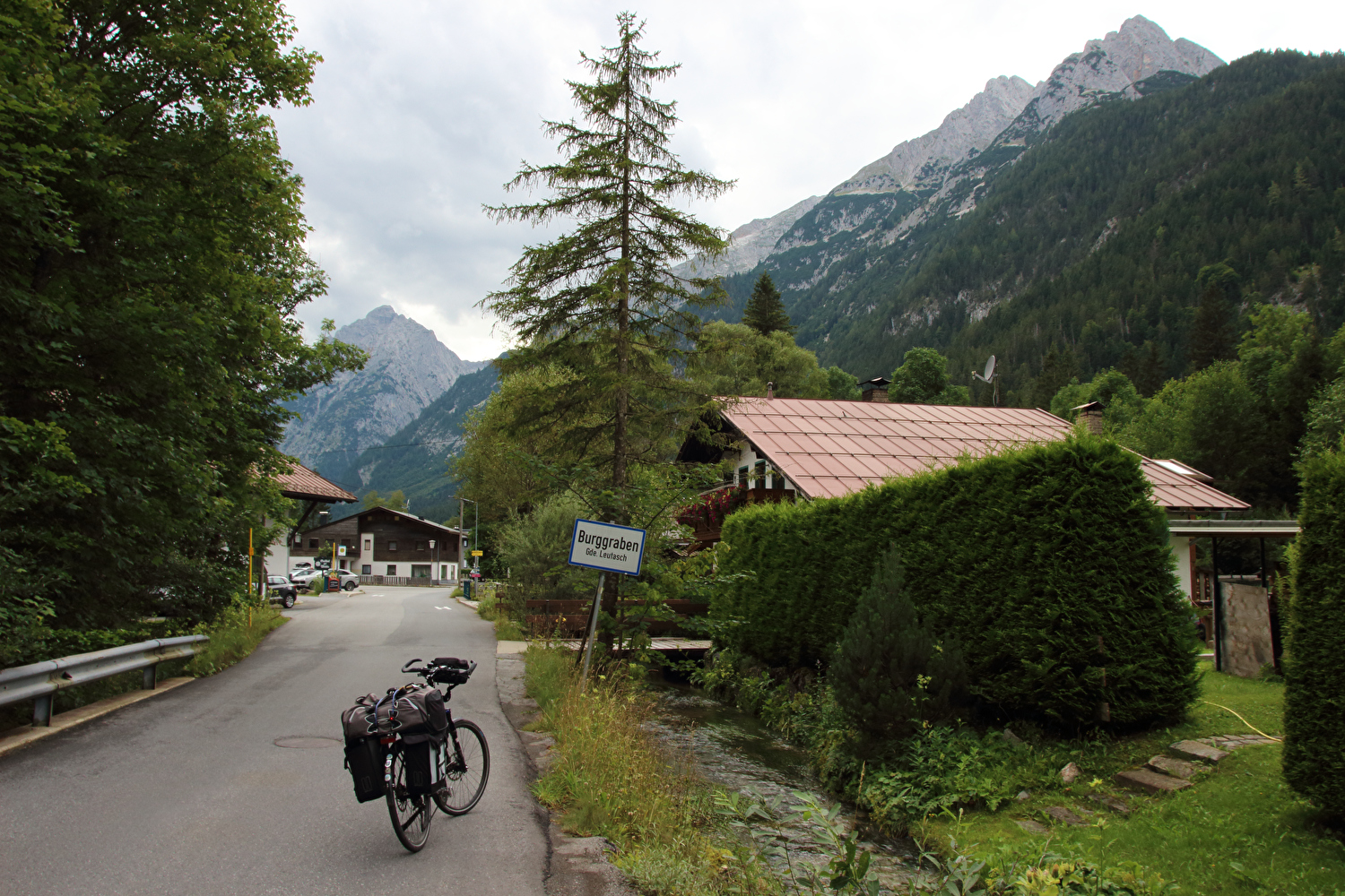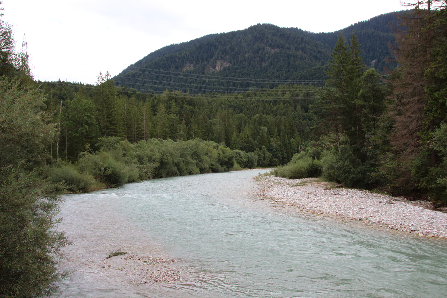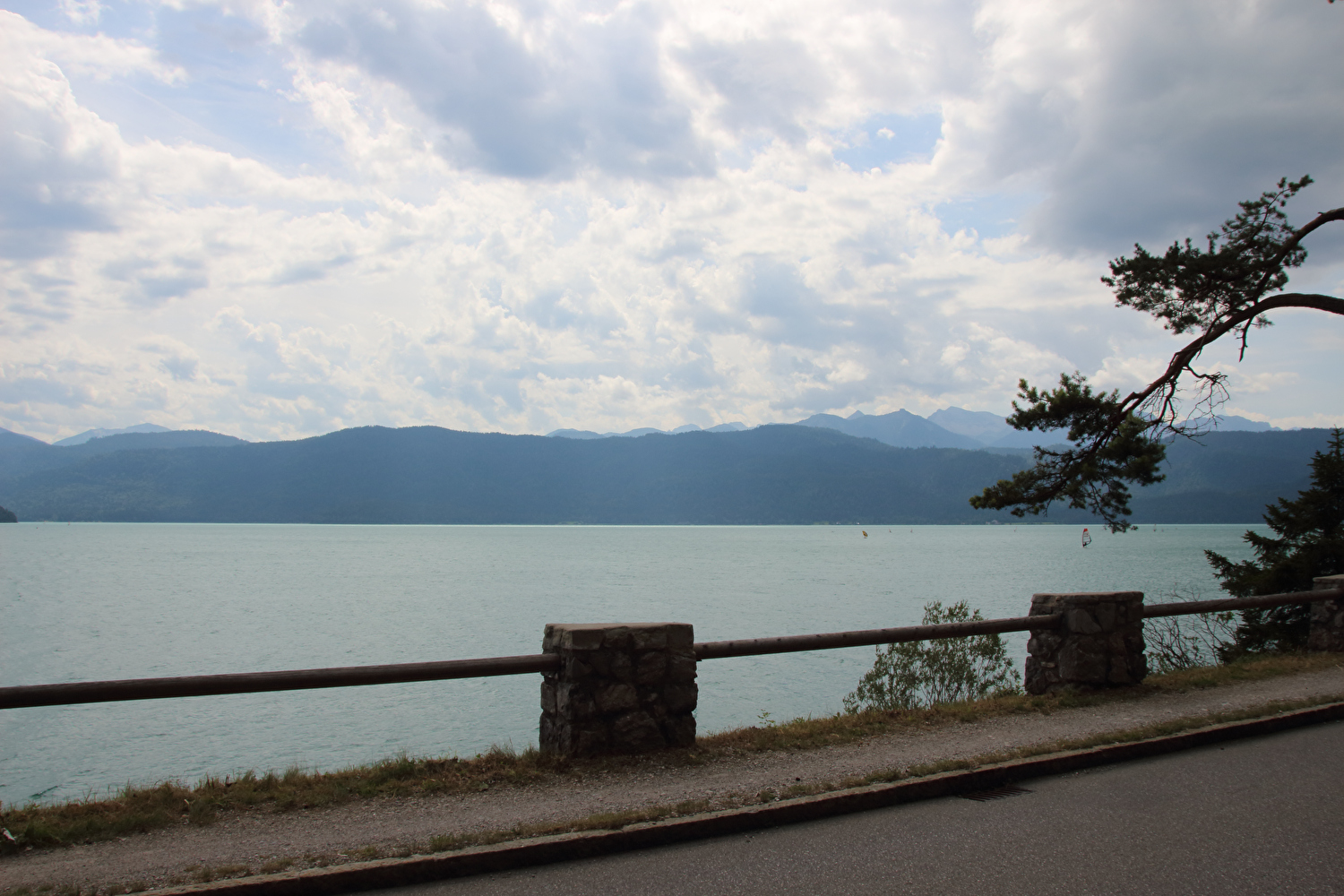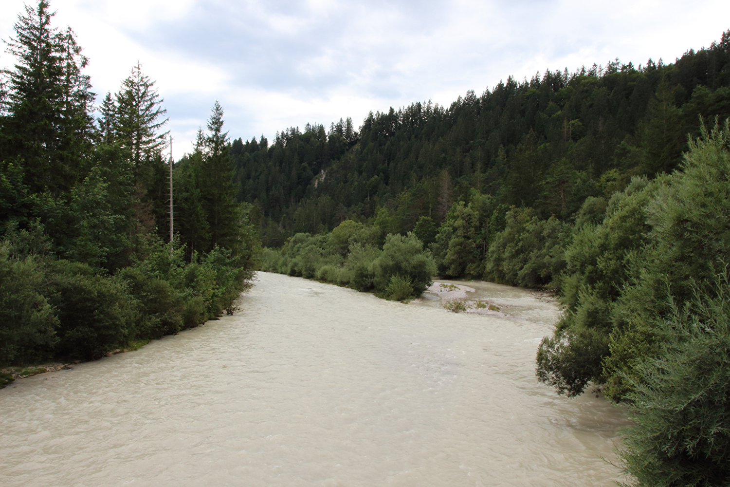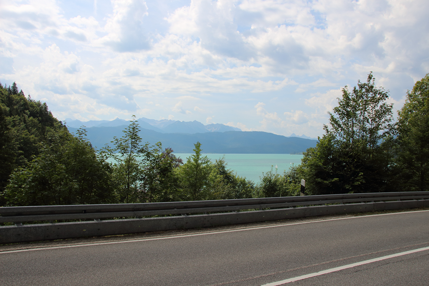 Nach der Überquerung des Kesselberg erreichte die Tour optisch die Alpen. Bei entsprechend freier Sicht zeigten sich in allen Richtungen Berge am Horizont, und das nördliche Alpenvorland mit mittelgebirgigen Landschaften und plattem Land gehörte der Vergangenheit an. Am Walchensee setzte als Konsequenz der schwülwarmen Witterung Regen ein, der sich rasch zu Starkregen intensivierte und somit zunächst die Weiterfahrt in norddeutscher Trachtenkleidung erzwang, wobei die kurze Regenhose ausreichte. Mit dem Verlassen des Walchensee folgte ein mehr oder weniger welliger, allmählich ansteigender Streckenabschnitt mit einem Sattelpunkt in Wallgau, wo der Regen wieder aufhörte. Mit dem Höllentalferner an der Zugspitze kam einer der letzten Gletscher Deutschlands ins Blickfeld. Mittenwald war an diesem Tag total überbevölkert. Das war bereits bei der Tourplanung erwartet worden, weshalb die ursprünglich dort geplante Übernachtung in einen ruhigeren Ort umgeplant worden war. Der letzte Etappenabschnitt ab Mittenwald war schon einmal am