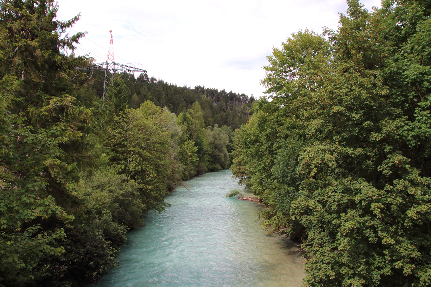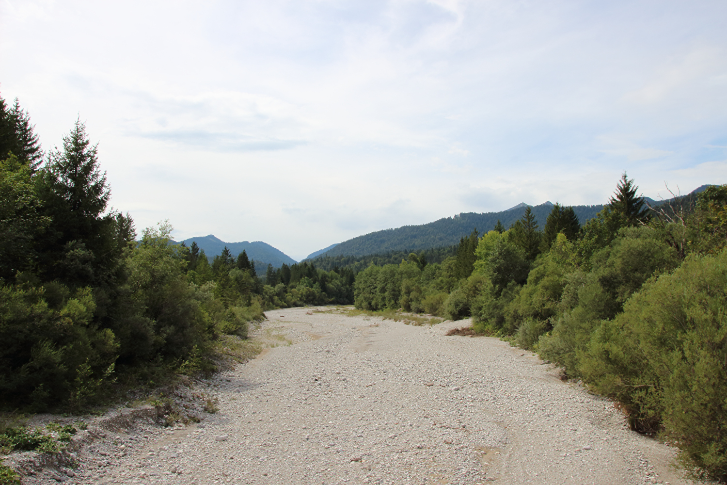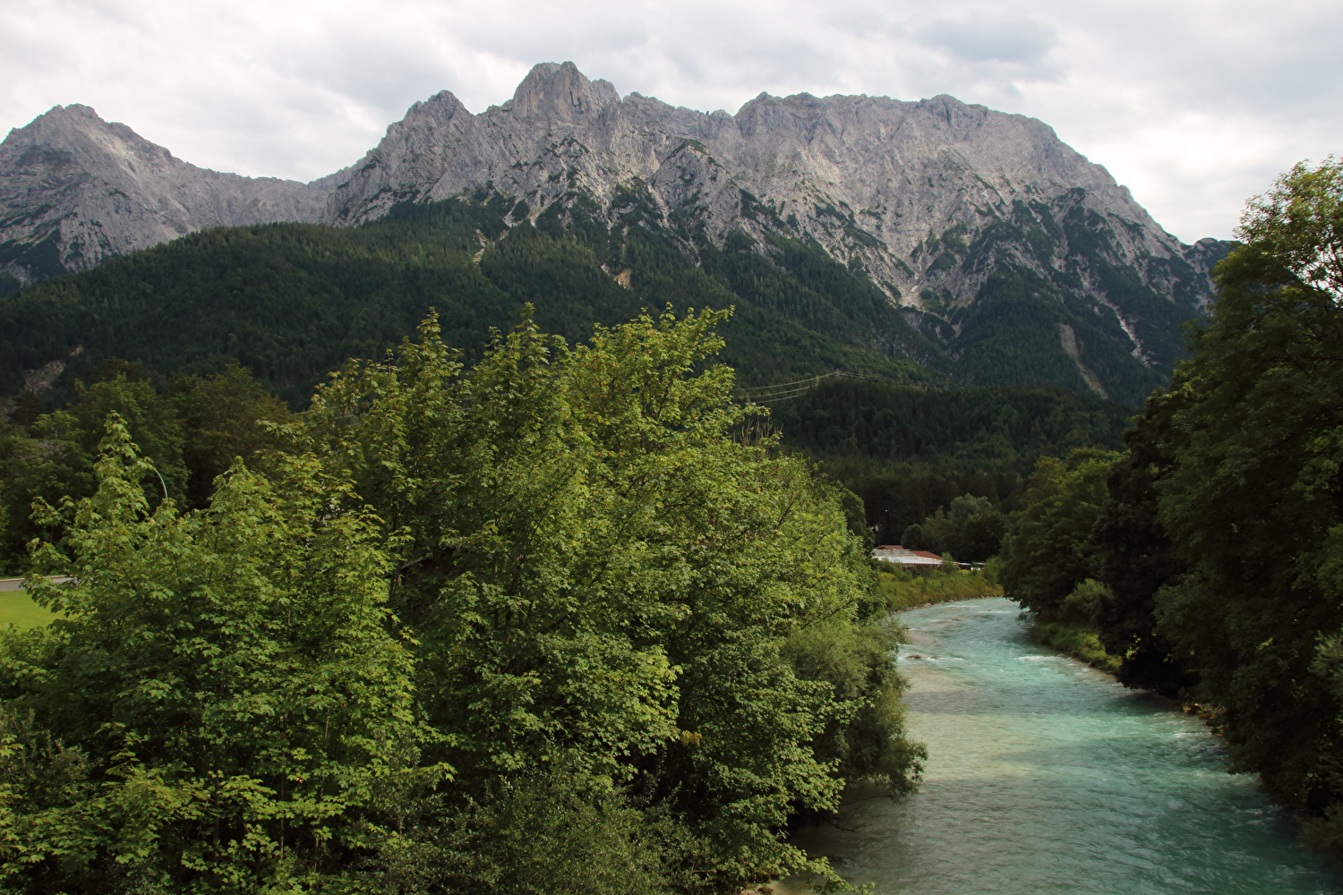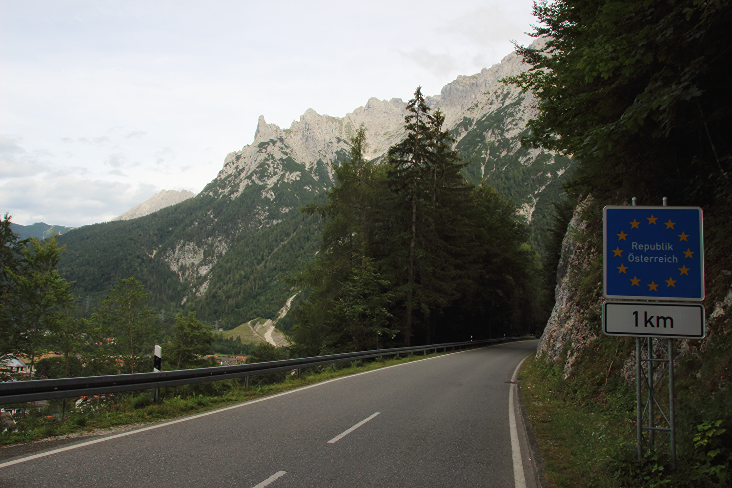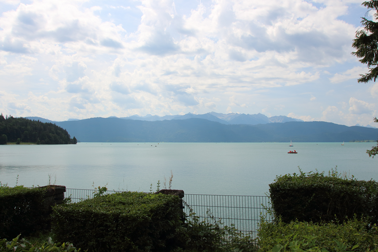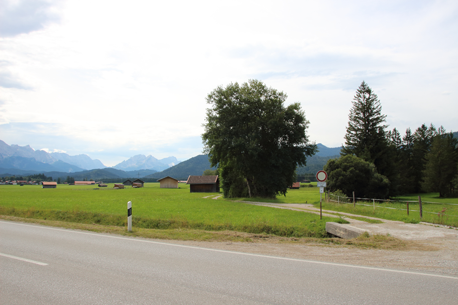 Nach der Überquerung des Kesselberg erreichte die Tour optisch die Alpen. Bei entsprechend freier Sicht zeigten sich in allen Richtungen Berge am Horizont, und das nördliche Alpenvorland mit mittelgebirgigen Landschaften und plattem Land gehörte der Vergangenheit an. Am Walchensee setzte als Konsequenz der schwülwarmen Witterung Regen ein, der sich rasch zu Starkregen intensivierte und somit zunächst die Weiterfahrt in norddeutscher Trachtenkleidung erzwang, wobei die kurze Regenhose ausreichte. Mit dem Verlassen des Walchensee folgte ein mehr oder weniger welliger, allmählich ansteigender Streckenabschnitt mit einem Sattelpunkt in Wallgau, wo der Regen wieder aufhörte. Mit dem Höllentalferner an der Zugspitze kam einer der letzten Gletscher Deutschlands ins Blickfeld. Mittenwald war an diesem Tag total überbevölkert. Das war bereits bei der Tourplanung erwartet worden, weshalb die ursprünglich dort geplante Übernachtung in einen ruhigeren Ort umgeplant worden war. Der letzte Etappenabschnitt ab Mittenwald war schon einmal am