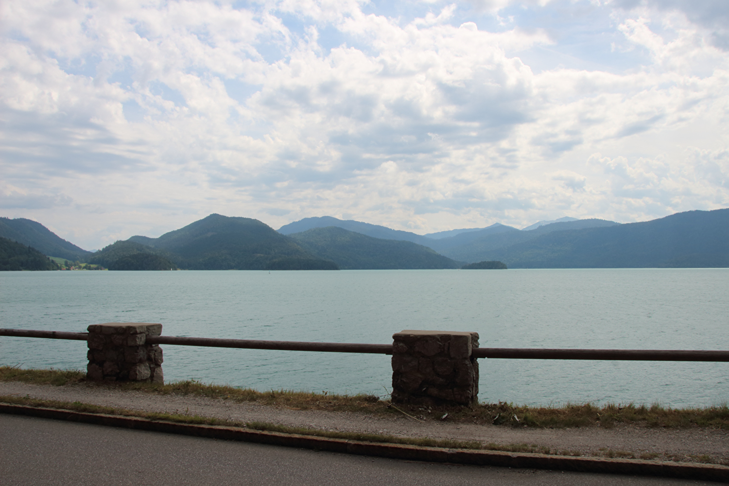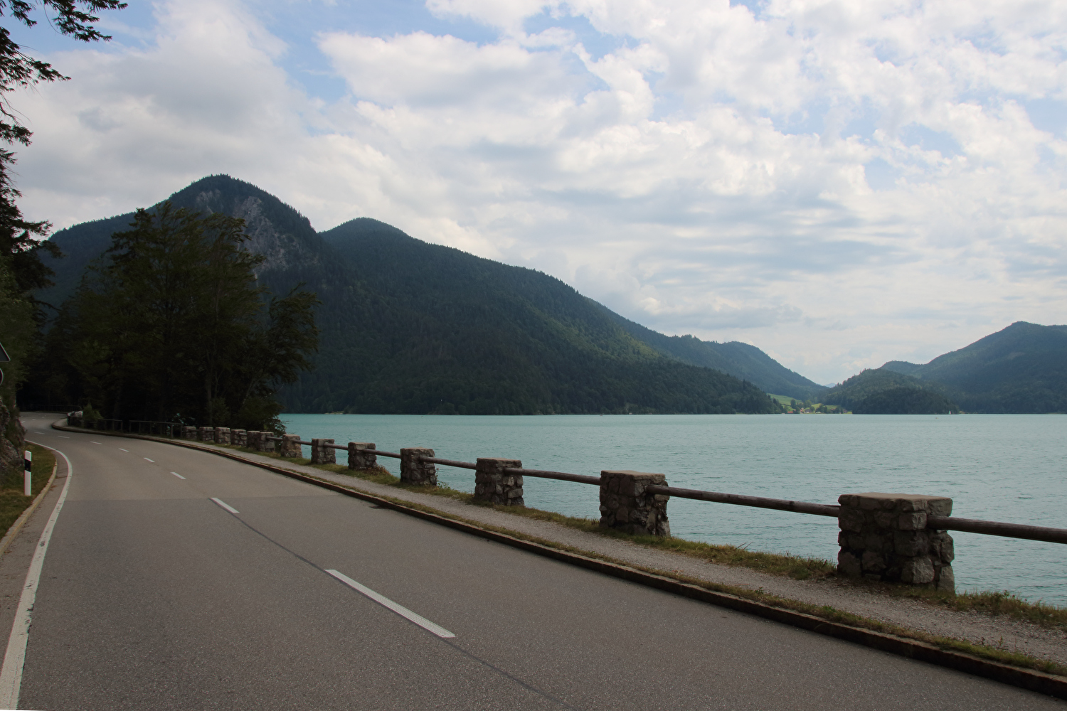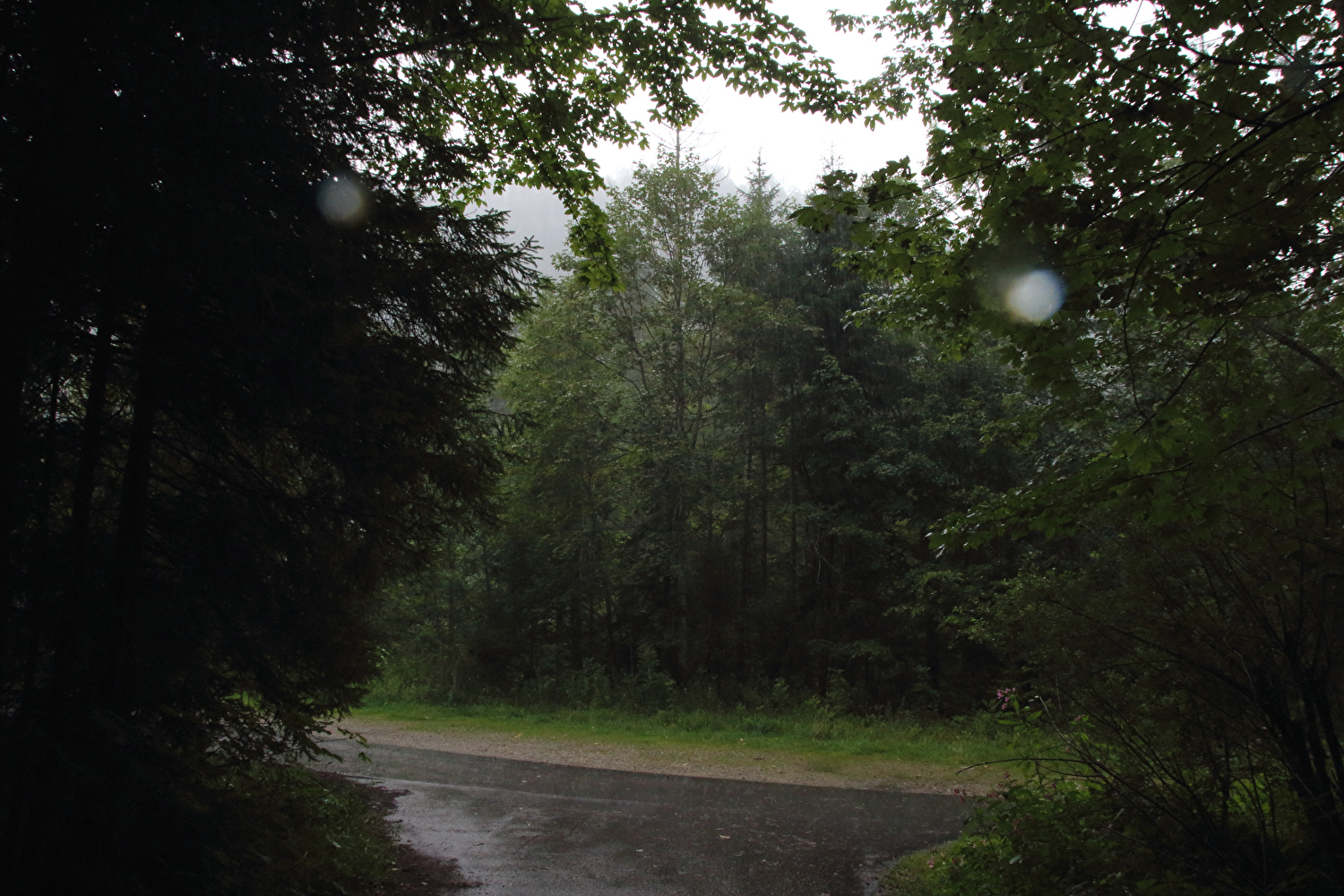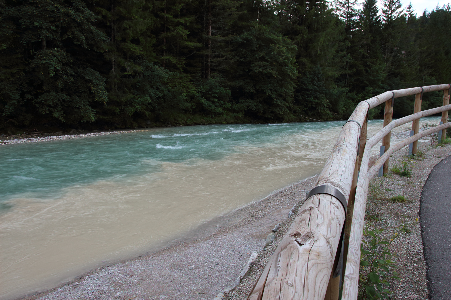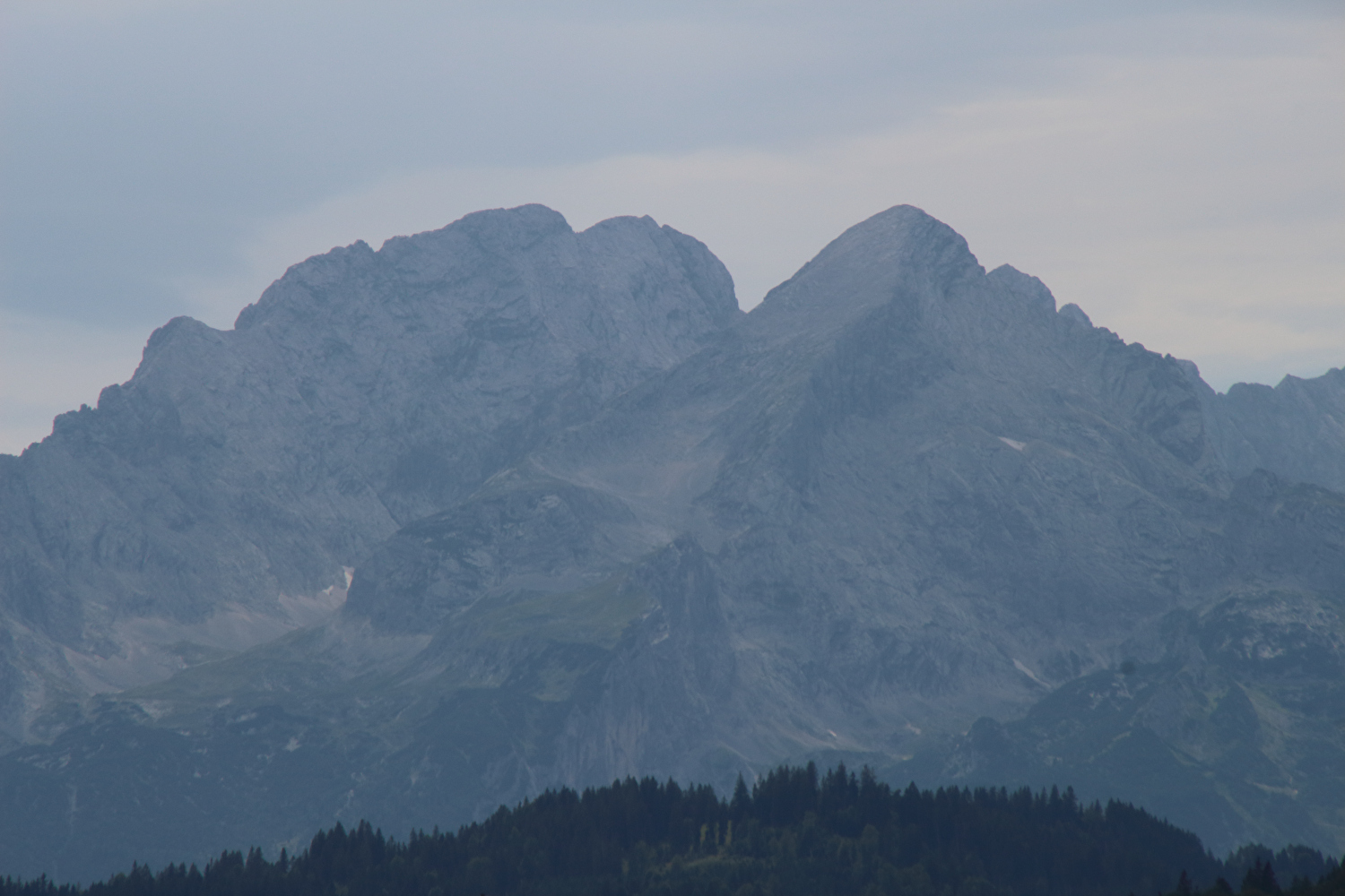 Nach der Überquerung des Kesselberg erreichte die Tour optisch die Alpen. Bei entsprechend freier Sicht zeigten sich in allen Richtungen Berge am Horizont, und das nördliche Alpenvorland mit mittelgebirgigen Landschaften und plattem Land gehörte der Vergangenheit an. Am Walchensee setzte als Konsequenz der schwülwarmen Witterung Regen ein, der sich rasch zu Starkregen intensivierte und somit zunächst die Weiterfahrt in norddeutscher Trachtenkleidung erzwang, wobei die kurze Regenhose ausreichte. Mit dem Verlassen des Walchensee folgte ein mehr oder weniger welliger, allmählich ansteigender Streckenabschnitt mit einem Sattelpunkt in Wallgau, wo der Regen wieder aufhörte. Mit dem Höllentalferner an der Zugspitze kam einer der letzten Gletscher Deutschlands ins Blickfeld. Mittenwald war an diesem Tag total überbevölkert. Das war bereits bei der Tourplanung erwartet worden, weshalb die ursprünglich dort geplante Übernachtung in einen ruhigeren Ort umgeplant worden war. Der letzte Etappenabschnitt ab Mittenwald war schon einmal am