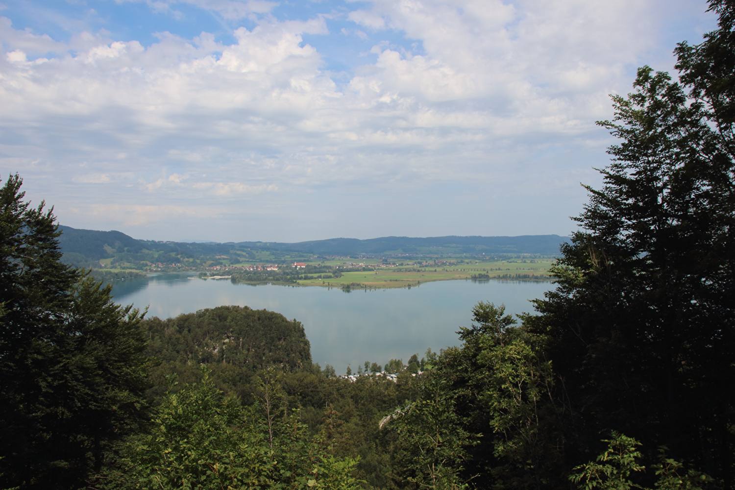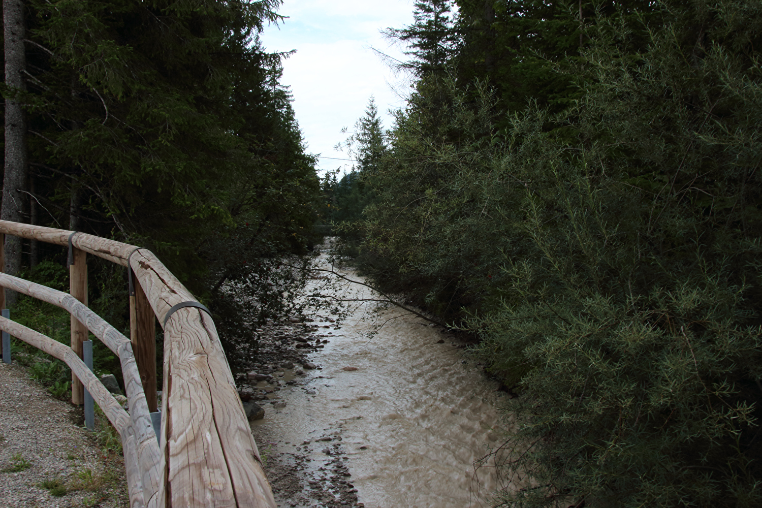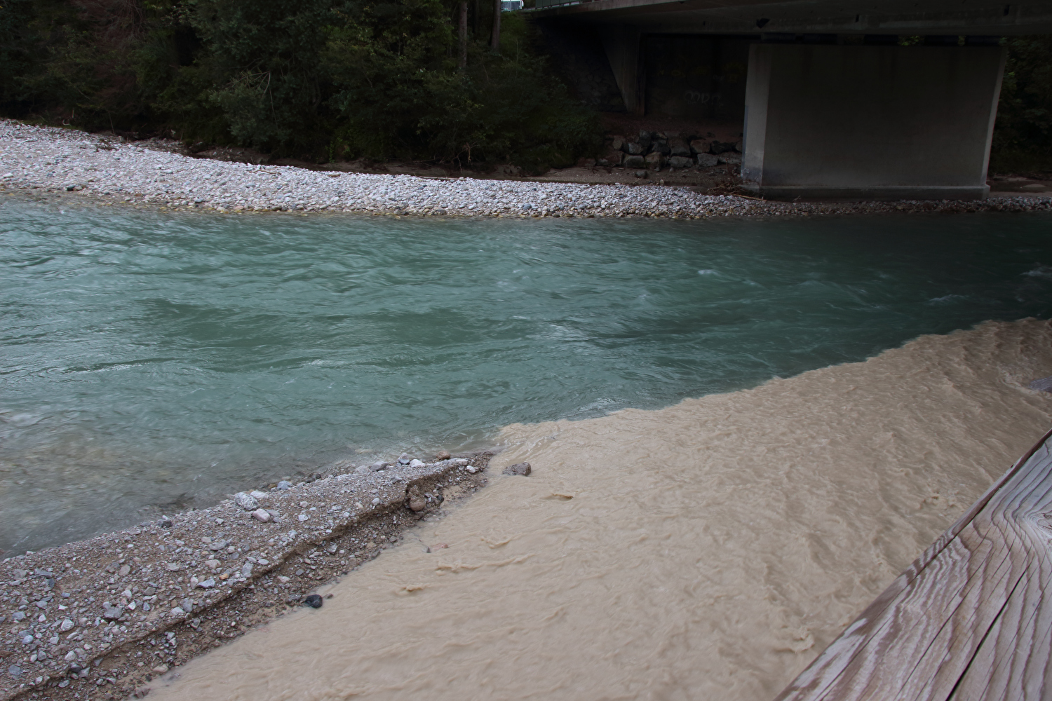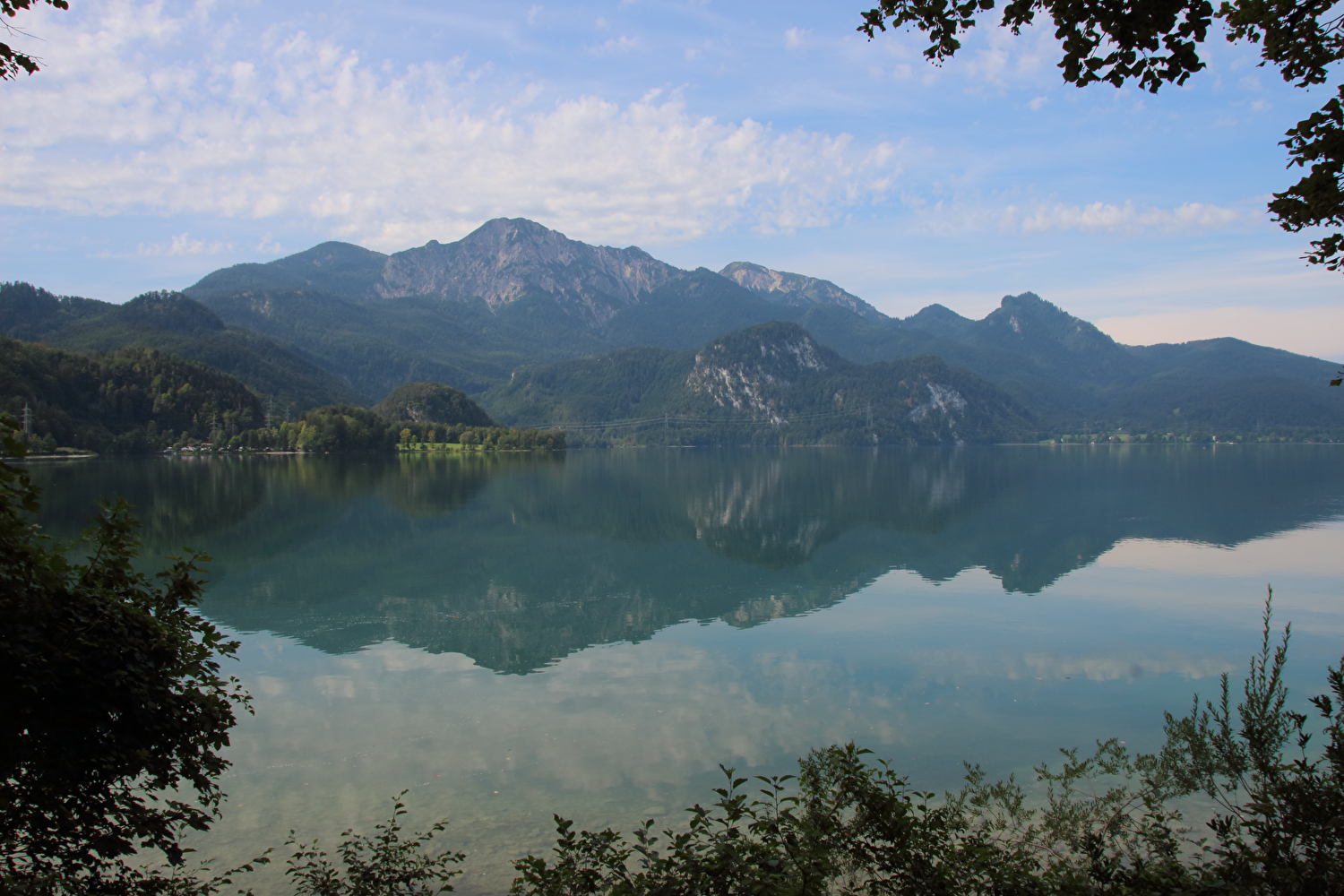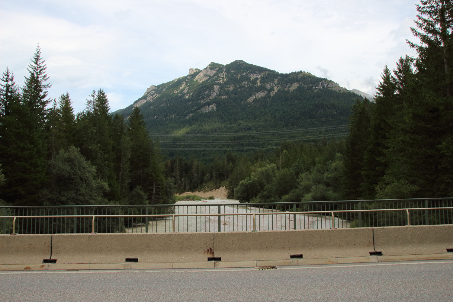 Nach der Überquerung des Kesselberg erreichte die Tour optisch die Alpen. Bei entsprechend freier Sicht zeigten sich in allen Richtungen Berge am Horizont, und das nördliche Alpenvorland mit mittelgebirgigen Landschaften und plattem Land gehörte der Vergangenheit an. Am Walchensee setzte als Konsequenz der schwülwarmen Witterung Regen ein, der sich rasch zu Starkregen intensivierte und somit zunächst die Weiterfahrt in norddeutscher Trachtenkleidung erzwang, wobei die kurze Regenhose ausreichte. Mit dem Verlassen des Walchensee folgte ein mehr oder weniger welliger, allmählich ansteigender Streckenabschnitt mit einem Sattelpunkt in Wallgau, wo der Regen wieder aufhörte. Mit dem Höllentalferner an der Zugspitze kam einer der letzten Gletscher Deutschlands ins Blickfeld. Mittenwald war an diesem Tag total überbevölkert. Das war bereits bei der Tourplanung erwartet worden, weshalb die ursprünglich dort geplante Übernachtung in einen ruhigeren Ort umgeplant worden war. Der letzte Etappenabschnitt ab Mittenwald war schon einmal am