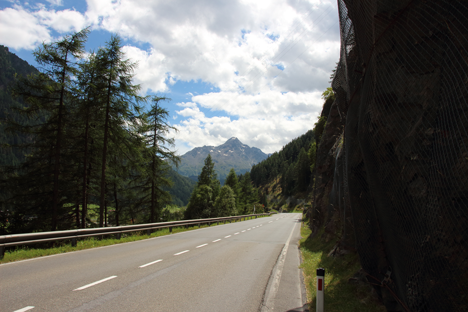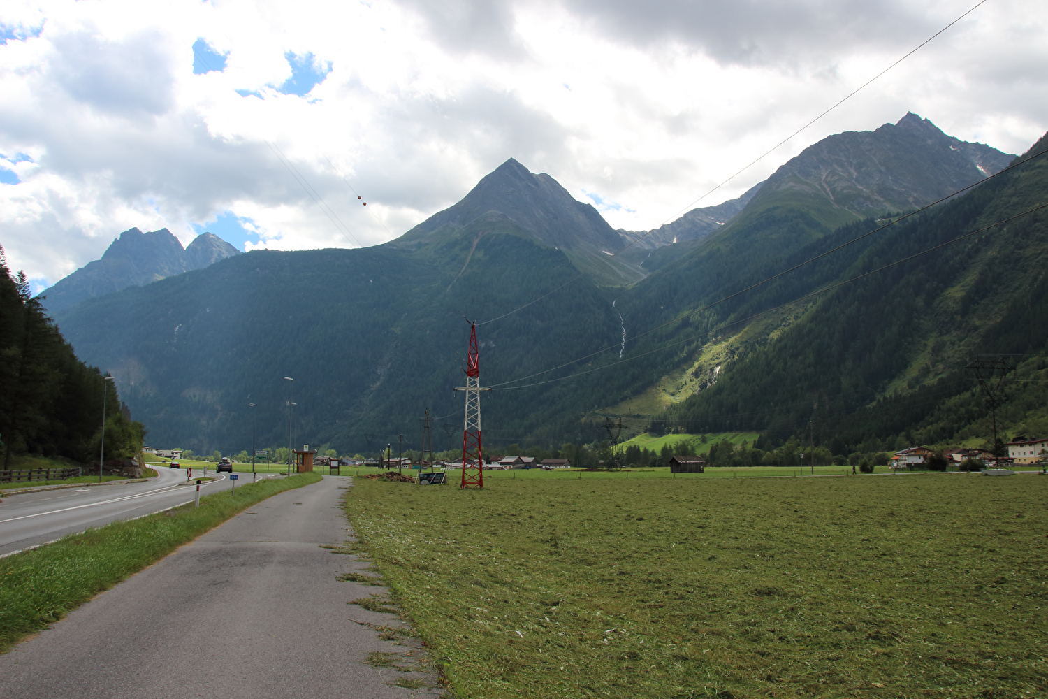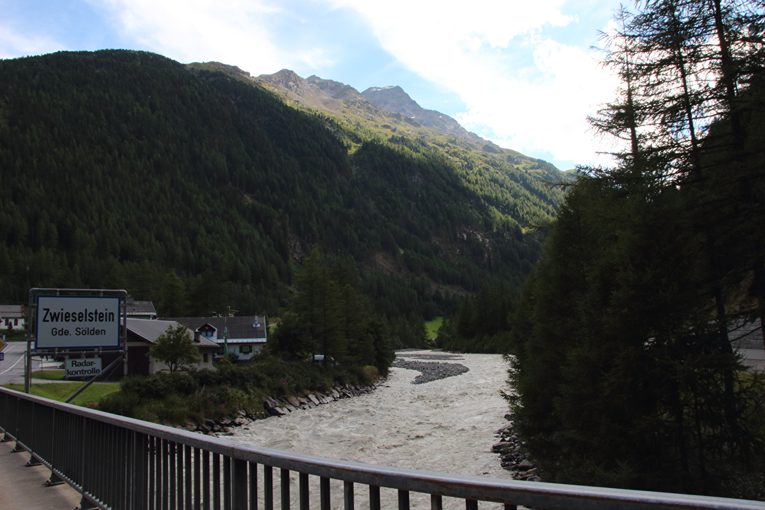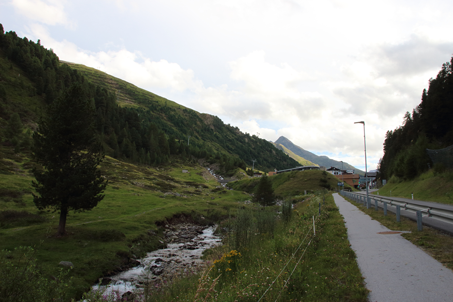 26.07.2012 in der gleichen Richtung gefahren worden. Bei deutlich schönerem Wetter als am Vortag erreichte diese Etappe endlich hochalpines Gebiet. Die montane Waldgrenze wurde zwar noch nicht überschritten, lag aber nur noch wenig oberhalb des Etappenziels. Oberhalb von Umhausen wurde von der Ötztalstraße B186 über eine Brücke über die Ötztaler Ache zum Ötztal Radweg abgezweigt. Da dieser dort aber als Schotterpiste ausgeführt ist, wurde dort nicht aufgefahren und auf der Straße weiter gefahren. An der nächst oberen Brücke über die Ötztaler Ache wurde dann doch auf den Ötztal Radweg aufgefahren.