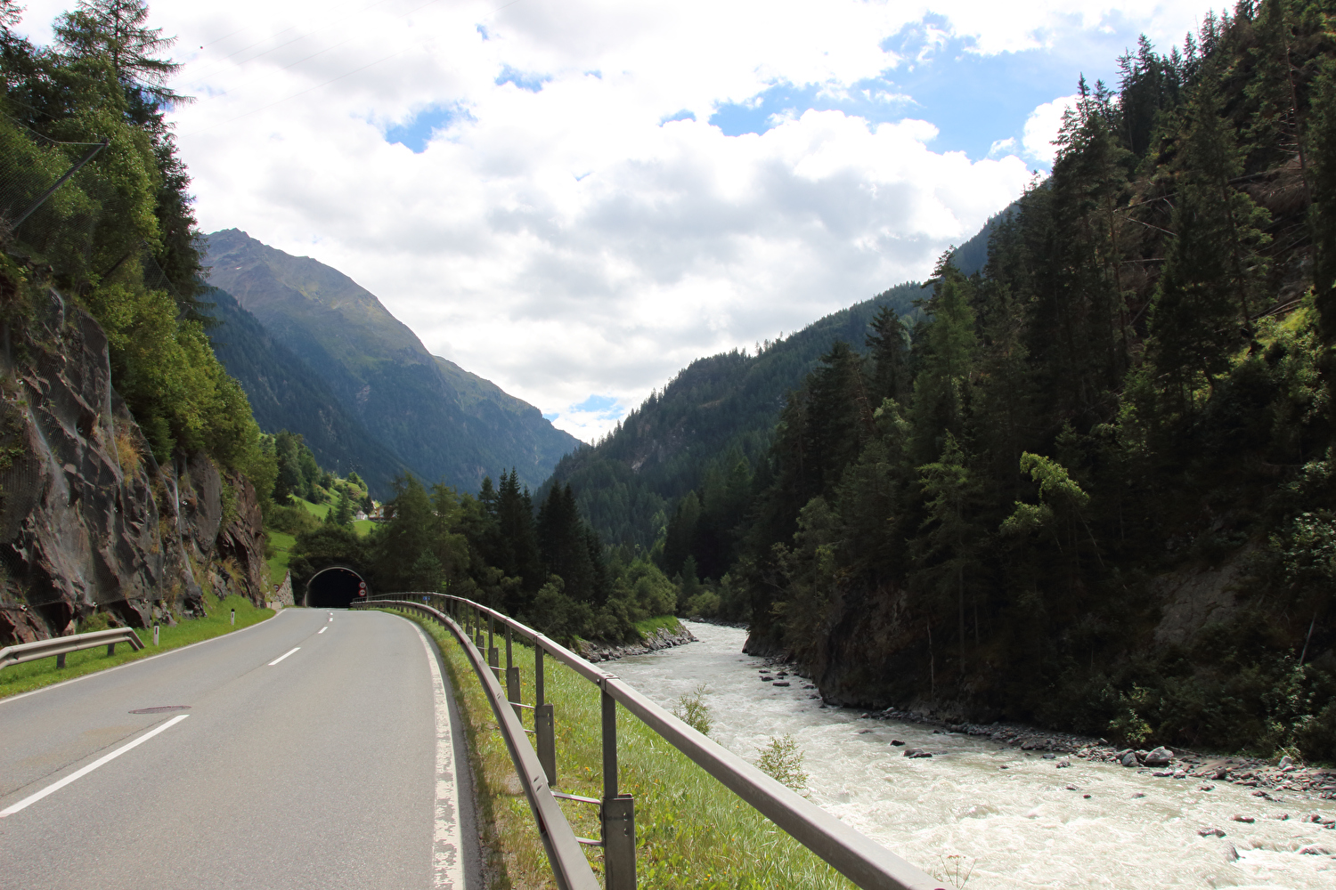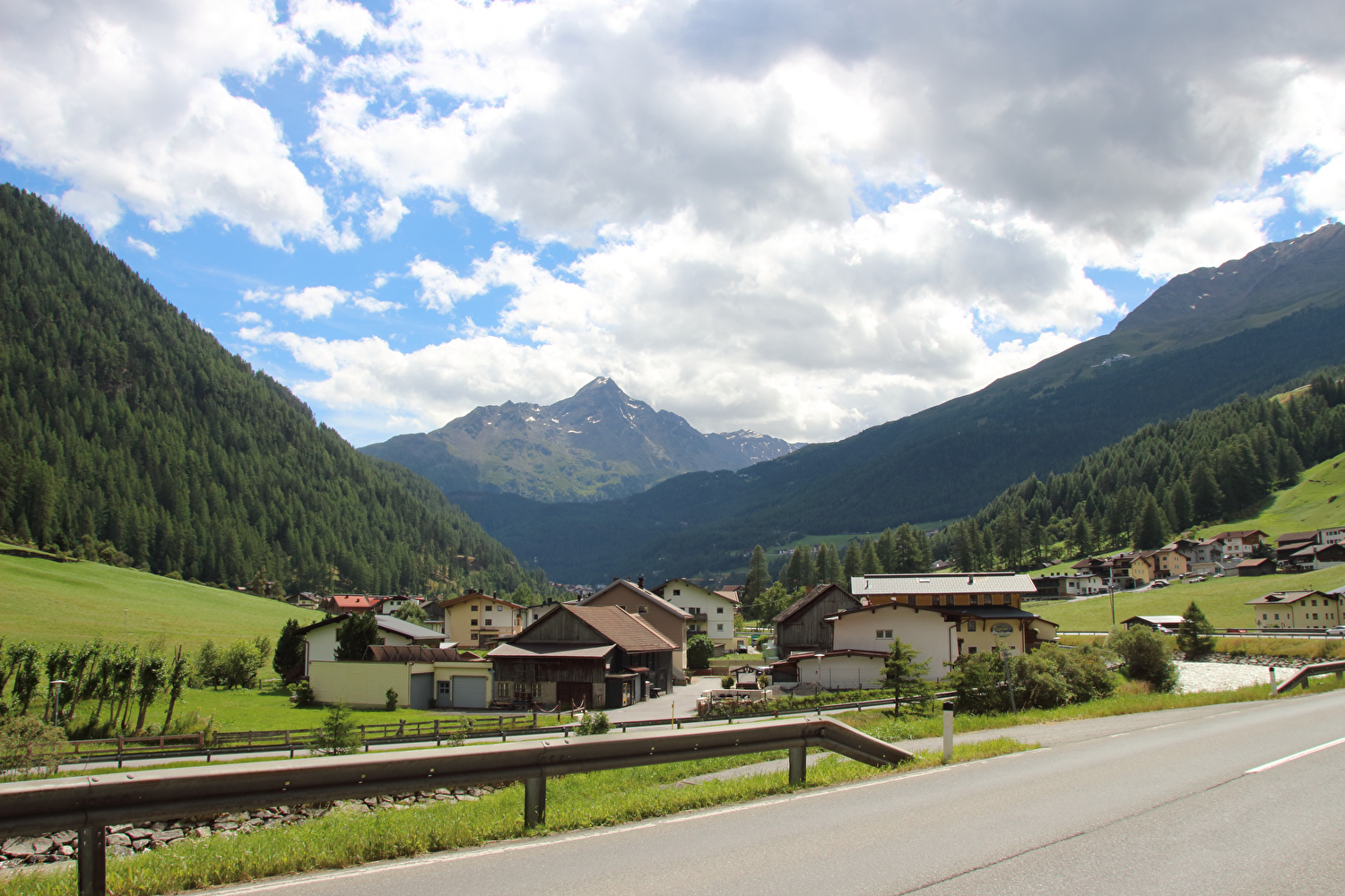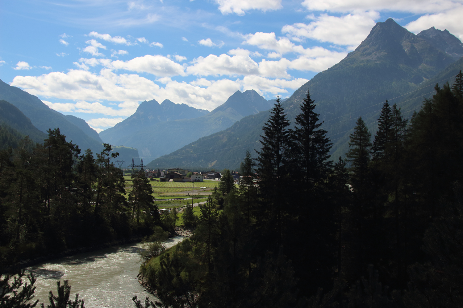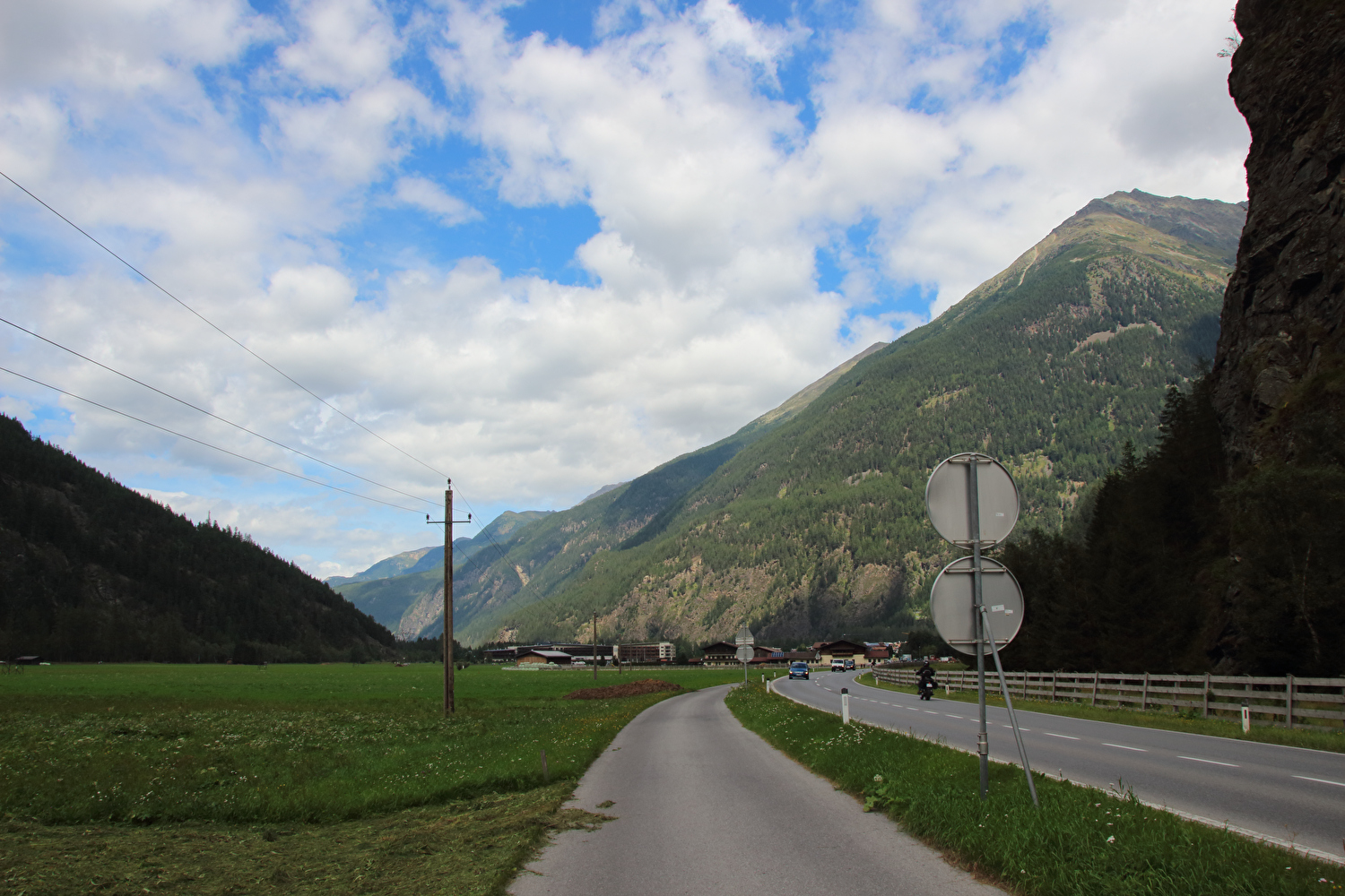 26.07.2012 in der gleichen Richtung gefahren worden. Bei deutlich schönerem Wetter als am Vortag erreichte diese Etappe endlich hochalpines Gebiet. Die montane Waldgrenze wurde zwar noch nicht überschritten, lag aber nur noch wenig oberhalb des Etappenziels. Oberhalb von Umhausen wurde von der Ötztalstraße B186 über eine Brücke über die Ötztaler Ache zum Ötztal Radweg abgezweigt. Da dieser dort aber als Schotterpiste ausgeführt ist, wurde dort nicht aufgefahren und auf der Straße weiter gefahren. An der nächst oberen Brücke über die Ötztaler Ache wurde dann doch auf den Ötztal Radweg aufgefahren.