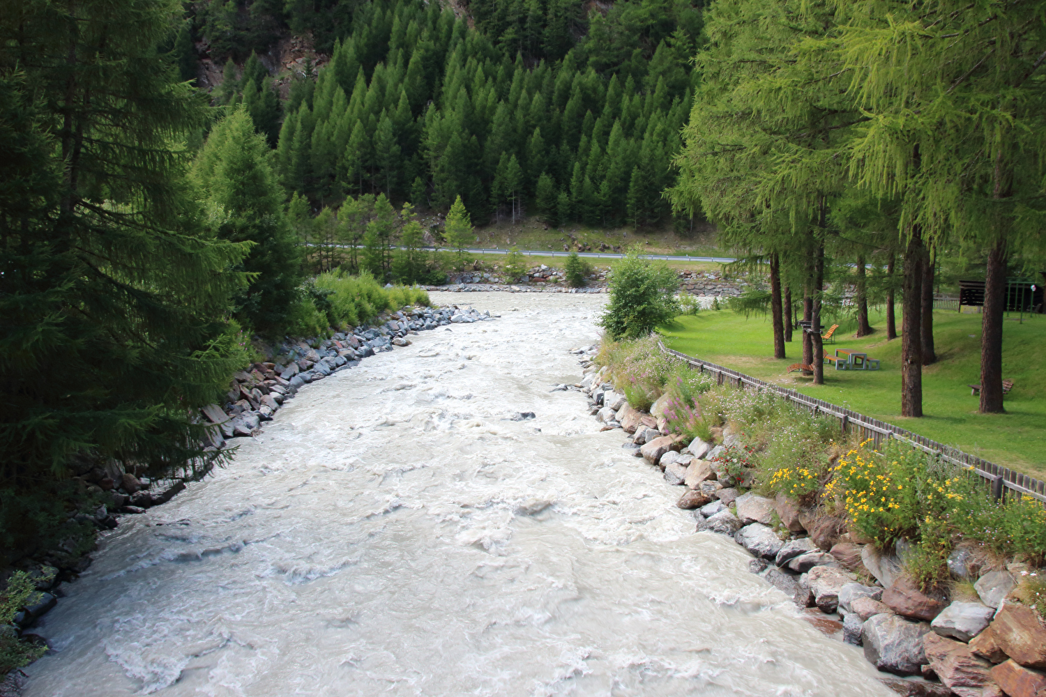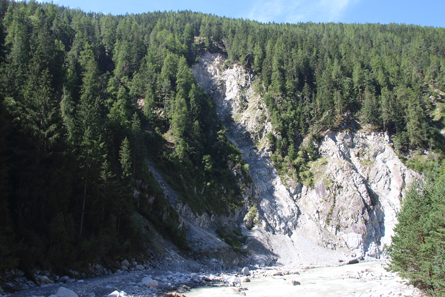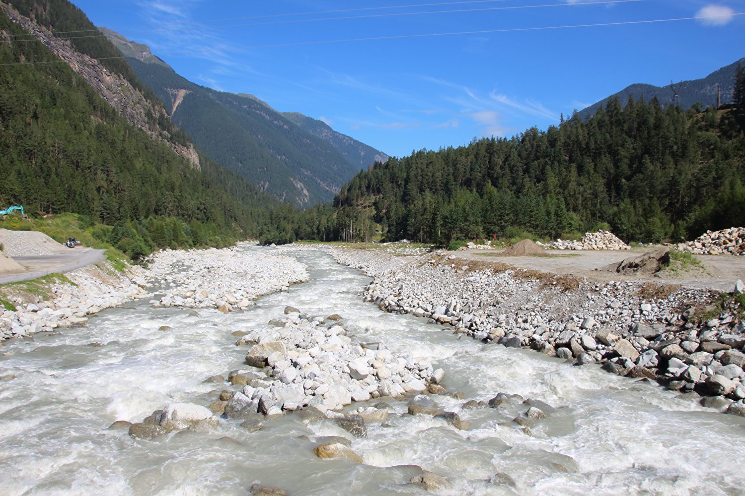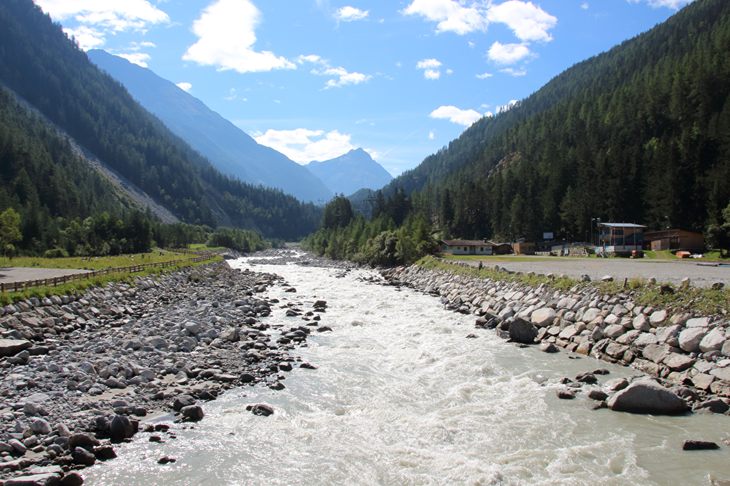 26.07.2012 in der gleichen Richtung gefahren worden. Bei deutlich schönerem Wetter als am Vortag erreichte diese Etappe endlich hochalpines Gebiet. Die montane Waldgrenze wurde zwar noch nicht überschritten, lag aber nur noch wenig oberhalb des Etappenziels. Oberhalb von Umhausen wurde von der Ötztalstraße B186 über eine Brücke über die Ötztaler Ache zum Ötztal Radweg abgezweigt. Da dieser dort aber als Schotterpiste ausgeführt ist, wurde dort nicht aufgefahren und auf der Straße weiter gefahren. An der nächst oberen Brücke über die Ötztaler Ache wurde dann doch auf den Ötztal Radweg aufgefahren.