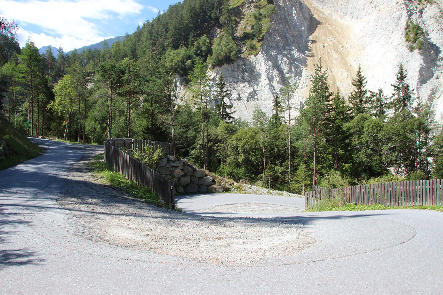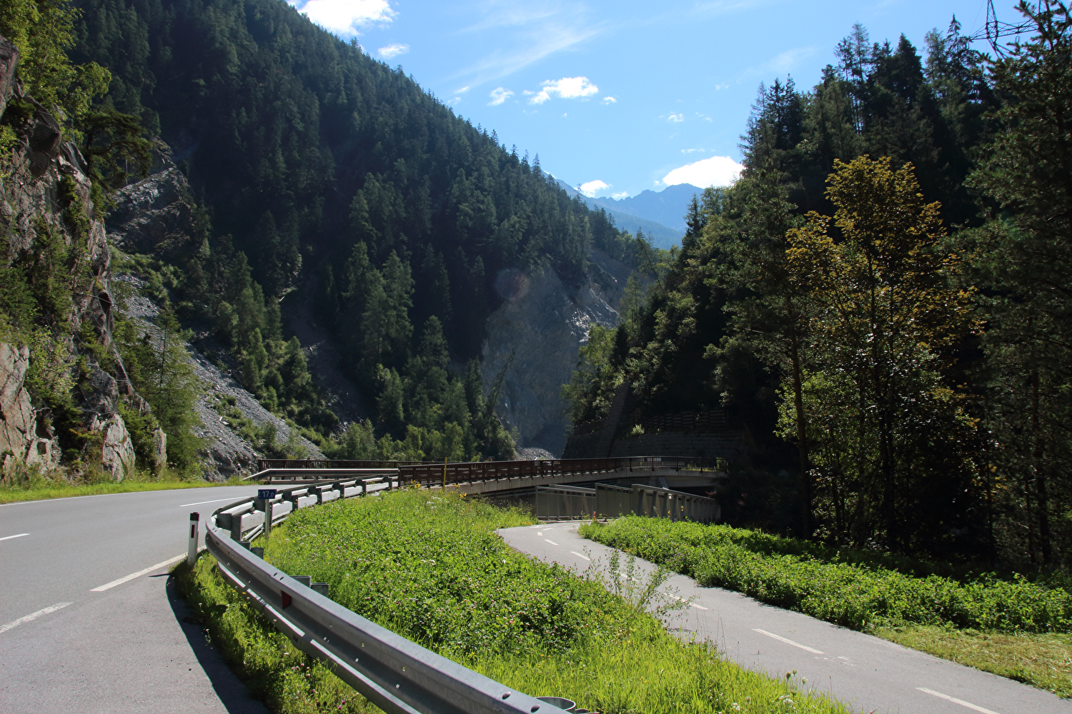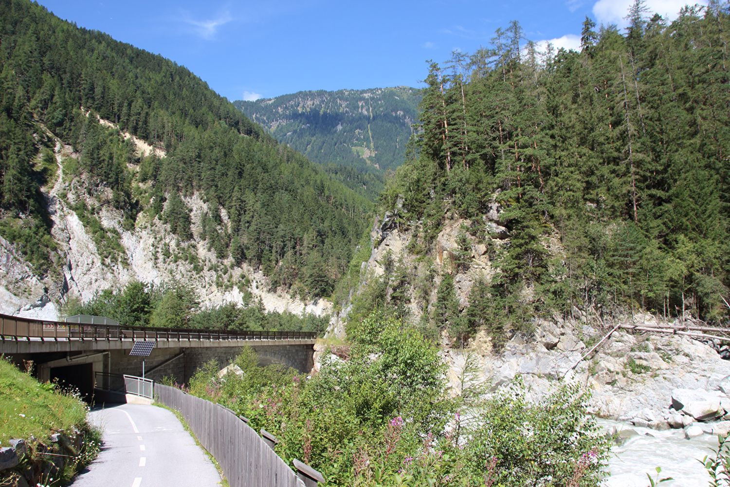 Ab dieser Brücke ist der Radweg asphaltiert. Die folgende Streckenführung mit zwei engen Kehren ist zwar interessant, aber auf dem Sattelpunkt oberhalb der Kehren zeigt sich, dass ein Teil der zuvor überwundenen Höhenmeter wieder verloren werden. Zwischen Winklen und Längenfeld weitet sich das Ötztal auf, der Talboden ist eben. Der Ötztal Radweg wird dort allerdings schon wieder als Schotterpiste geführt.