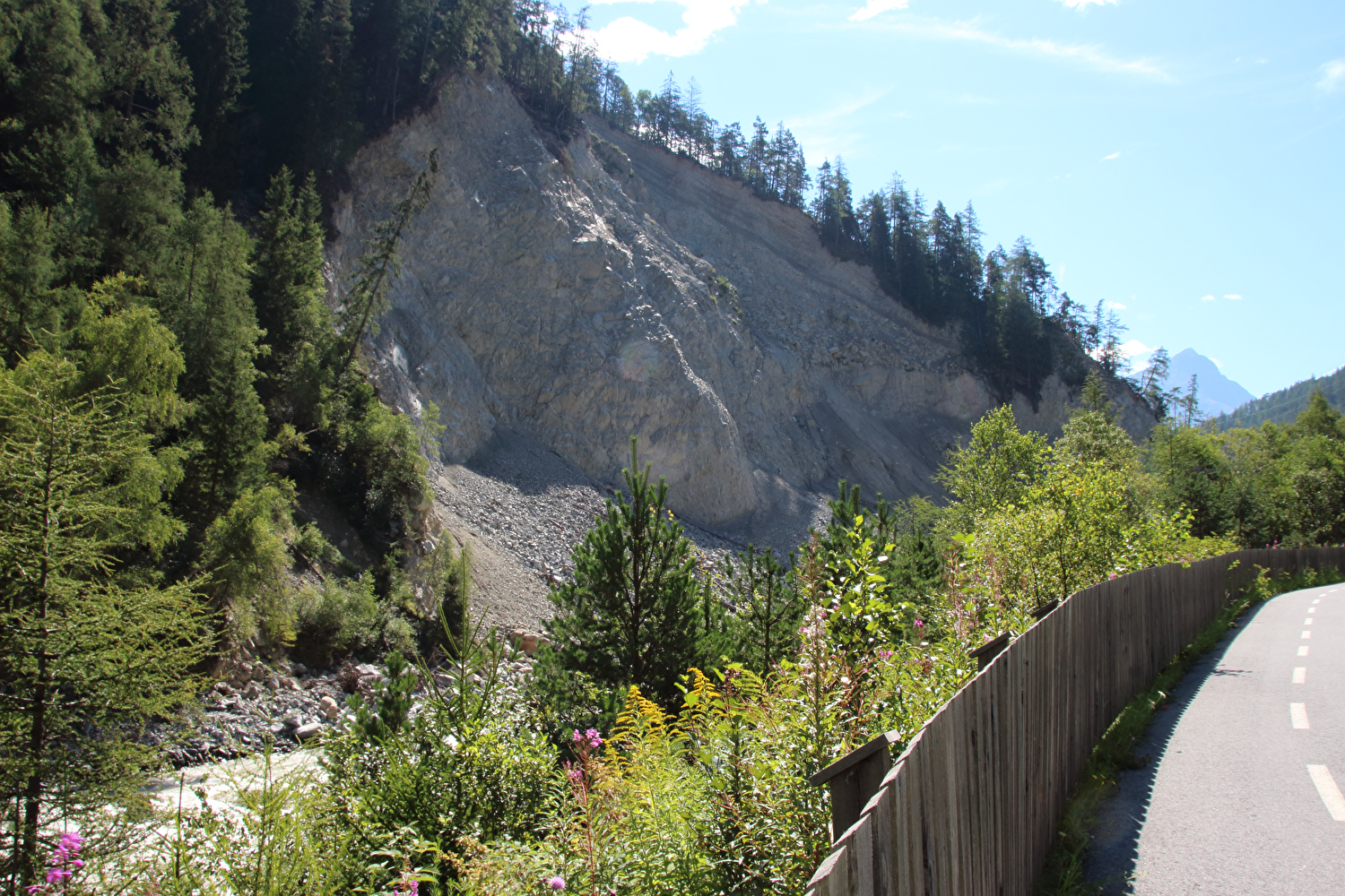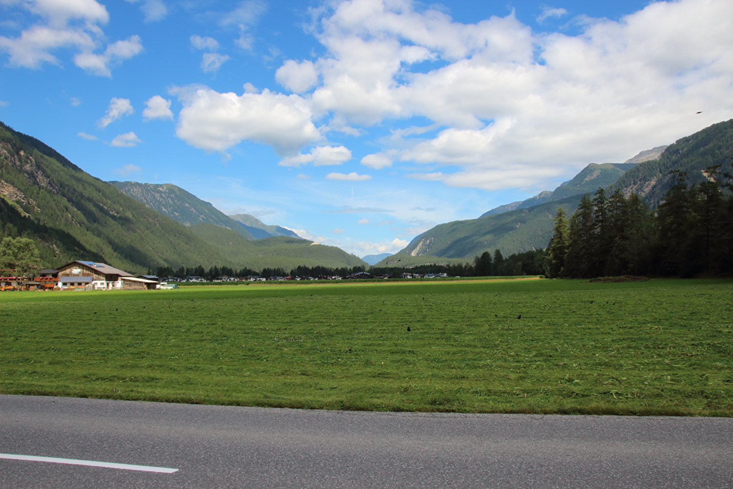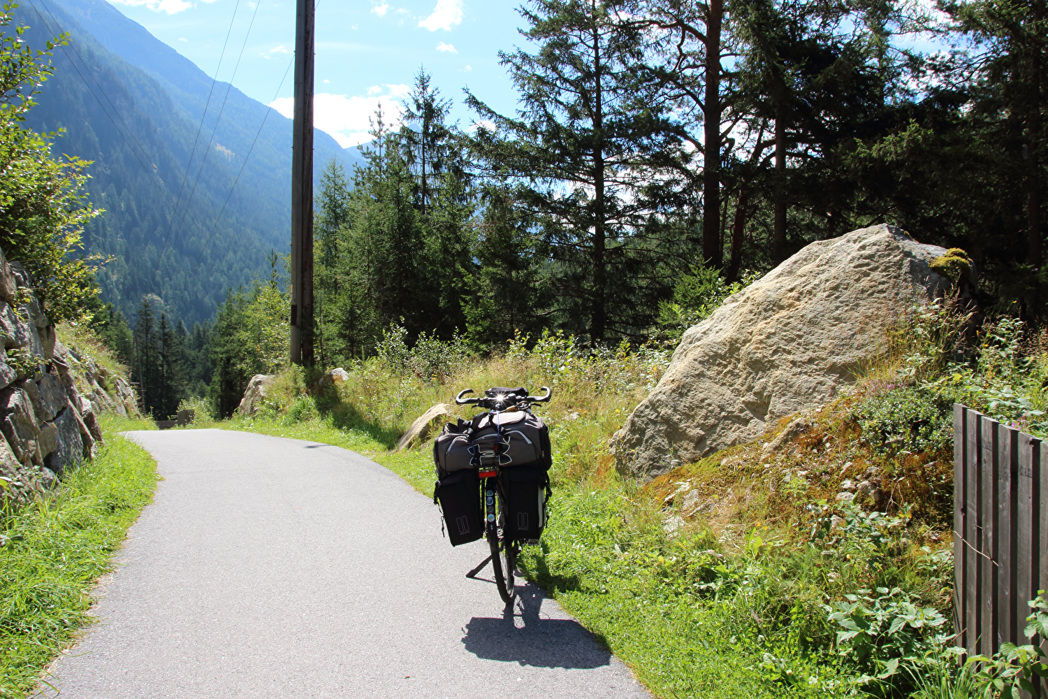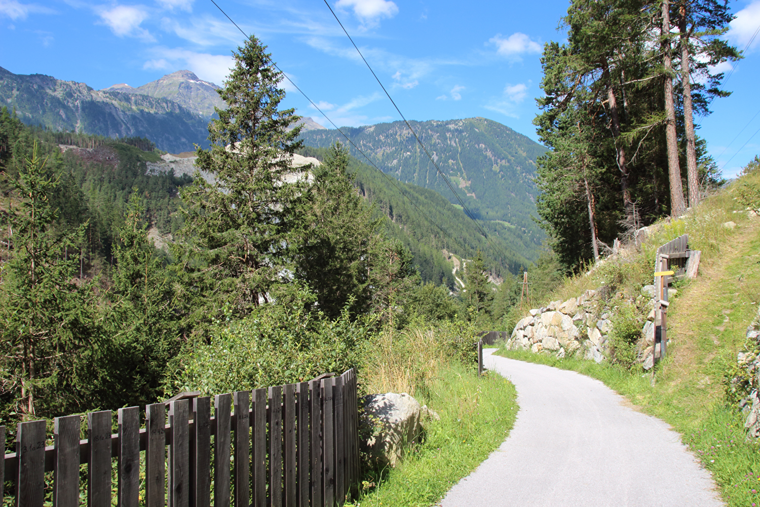 Ab dieser Brücke ist der Radweg asphaltiert. Die folgende Streckenführung mit zwei engen Kehren ist zwar interessant, aber auf dem Sattelpunkt oberhalb der Kehren zeigt sich, dass ein Teil der zuvor überwundenen Höhenmeter wieder verloren werden. Zwischen Winklen und Längenfeld weitet sich das Ötztal auf, der Talboden ist eben. Der Ötztal Radweg wird dort allerdings schon wieder als Schotterpiste geführt.