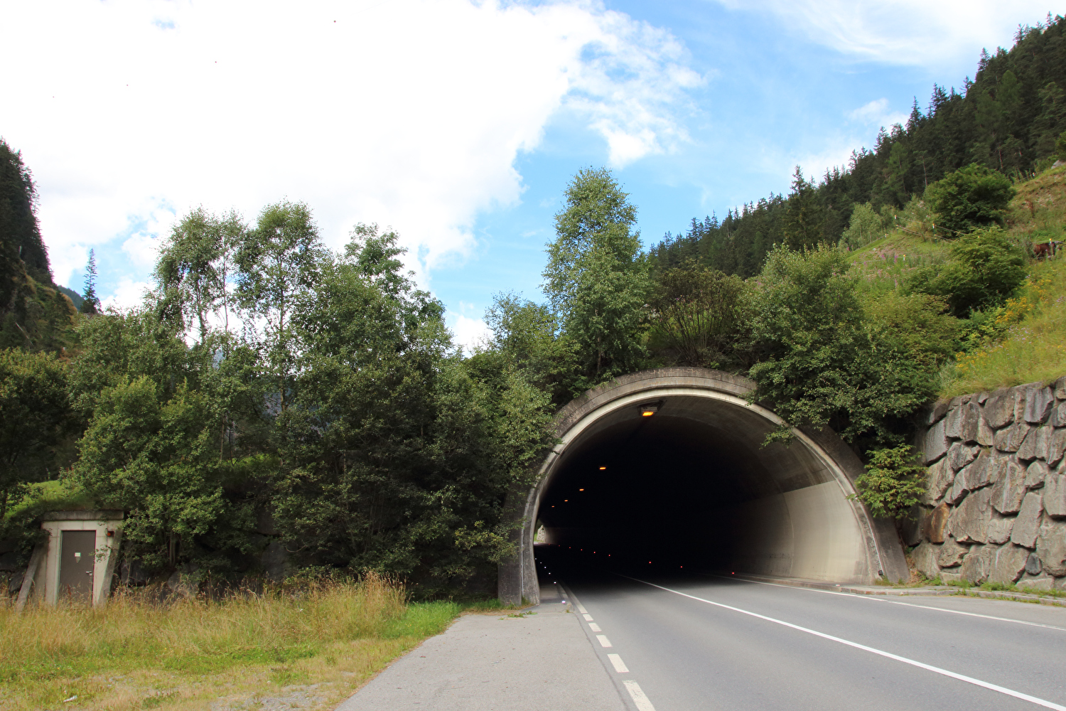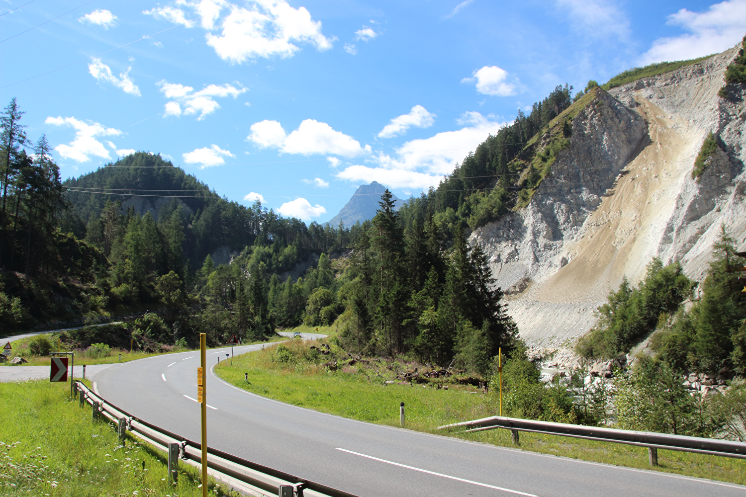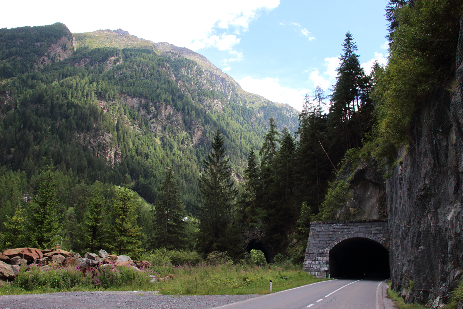 Diese Schotterpiste wurde auf der Nebenstraße durch den Talboden umfahren. Während der Mittagspause in Längenfeld fiel die Entscheidung, den Rest der Etappe auf der Straße zu fahren, um zusätzliche verlorene Höhenmeter und Schotterpisten zu vermeiden.