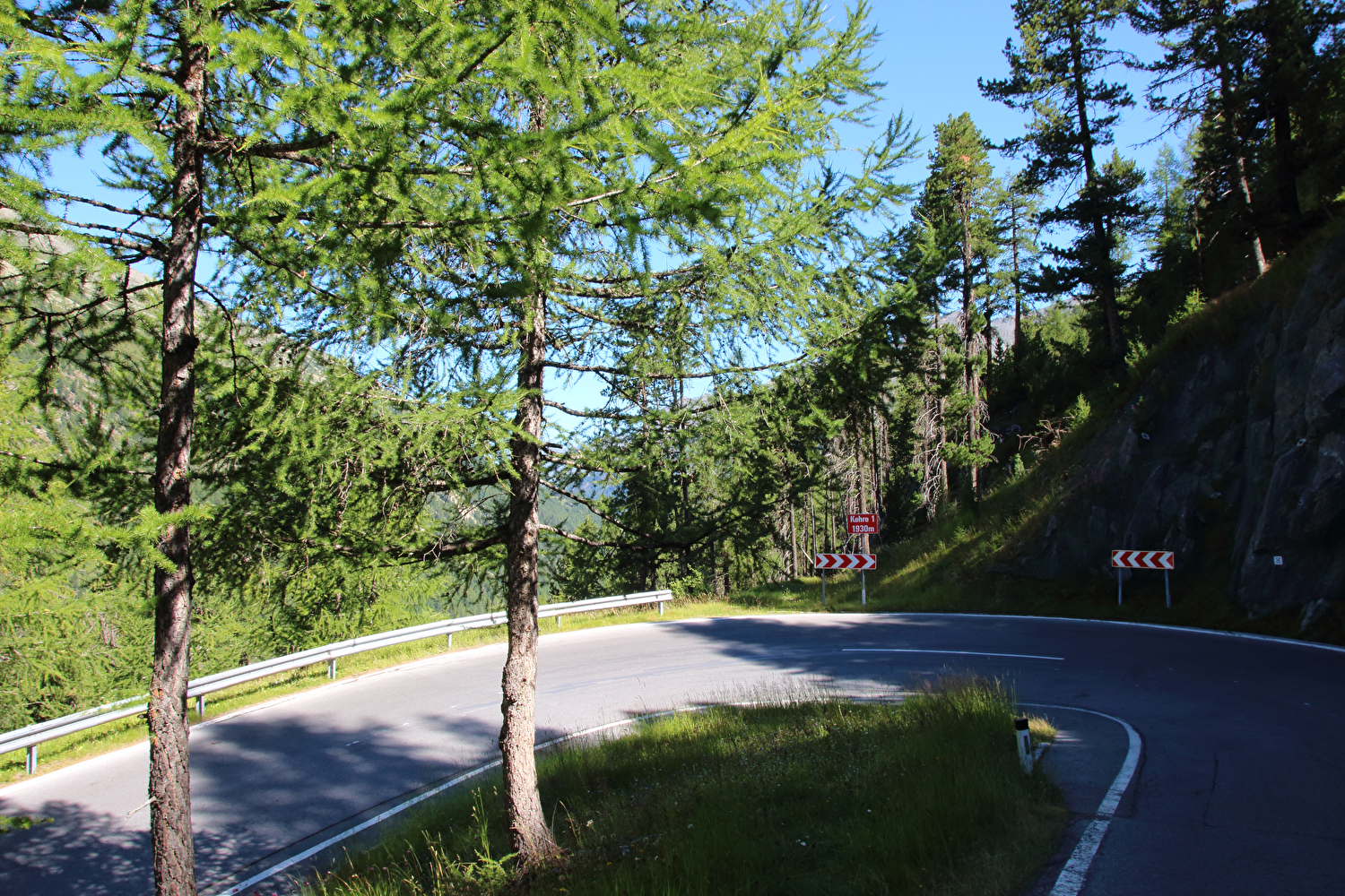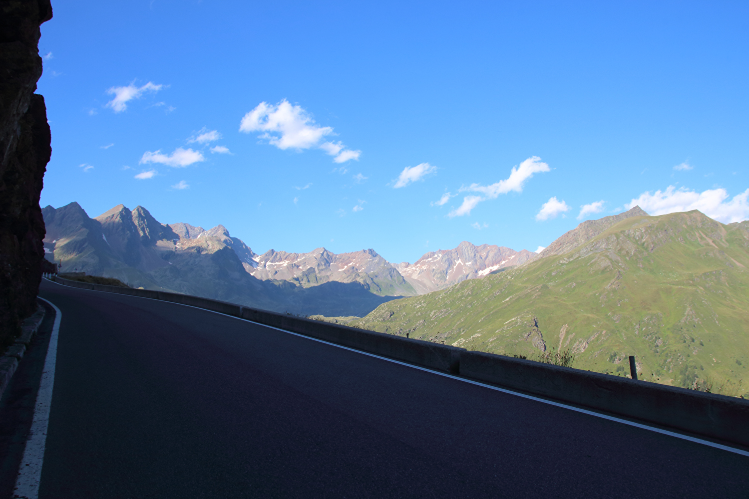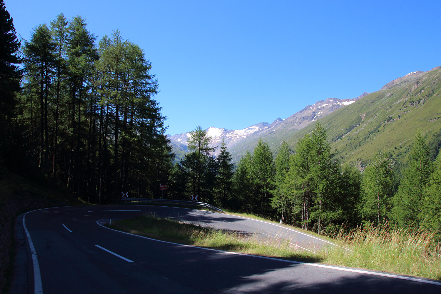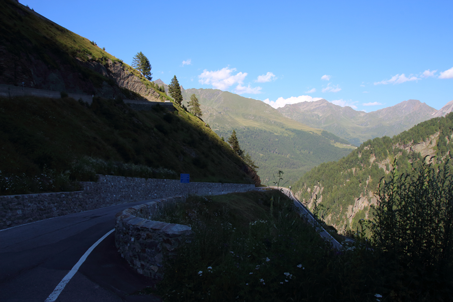 Durch den Etappenstart in Obergurgl kam auf der Passhöhe keine Hektik auf. Die Abfahrt, bei der 1796 Höhenmeter bergab zu fahren waren, zog sich dann doch etwas in die Länge, denn „Wer bremst, verliert!“ … zwar Zeit, aber dafür nicht das Leben. Die Entscheidung für fahrsicherheitstechnisch vertretbare Geschwindigkeiten bergab führte allerdings dazu, dass der Lichteinfall das Schießen ansprechender Fotos zunehmend erschwerte. Unterhalb von Moos in Passeier nahm die Temperatur trotz der bereits hinter den Bergen versunkenen Sonne spürbar zu, was für den folgenden Tag nichts Gutes erahnen ließ. Mit Sankt Leonhard in Passeier wurde „der Süden“ erreicht. Passend zur Wärme vor Ort rückten im Freiland wachsende Chinesische Hanfpalmen ins Blickfeld. Vor der Anfahrt zum Quartier wurde das untere Ende der Südostrampe des Timmelsjoch angefahren.