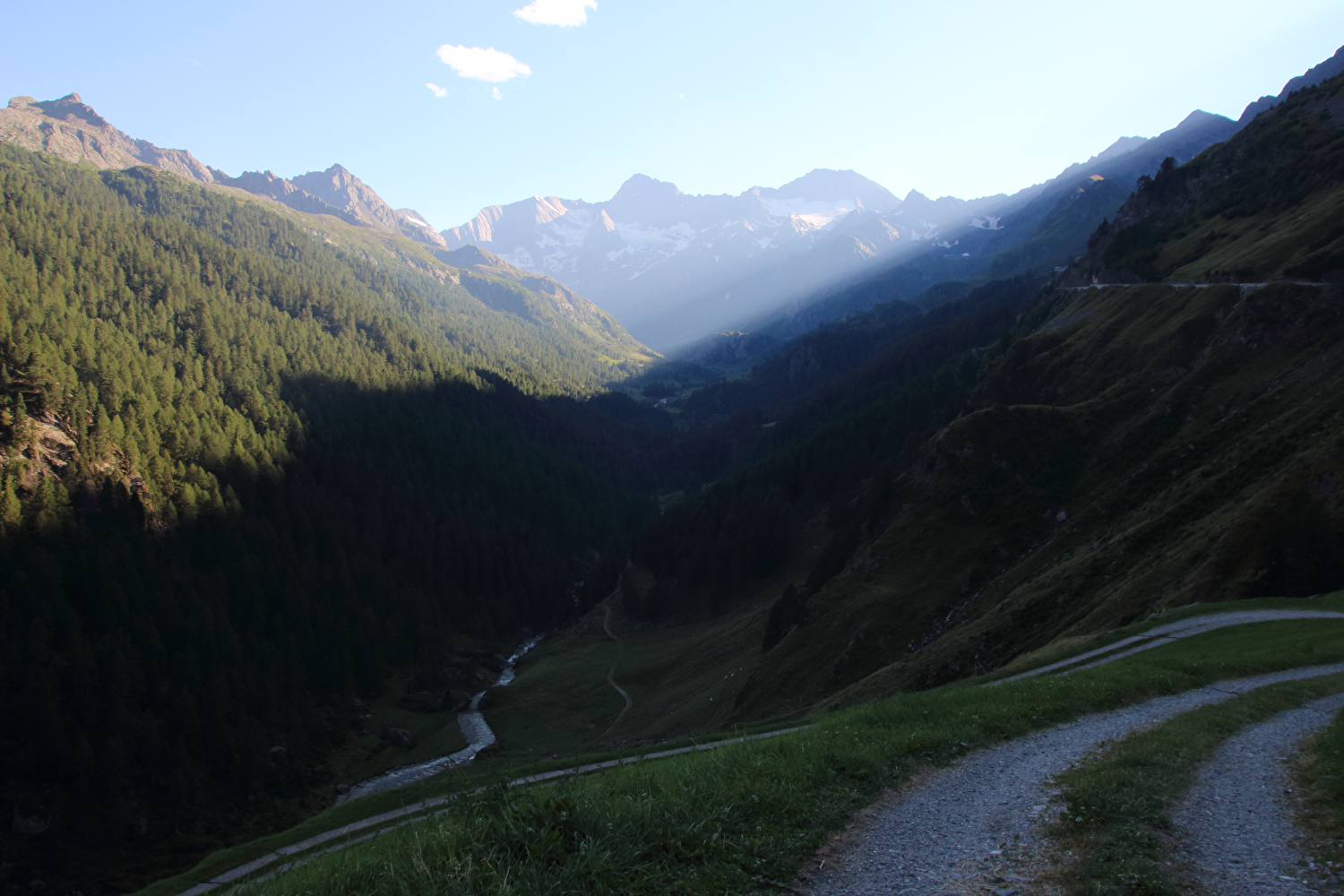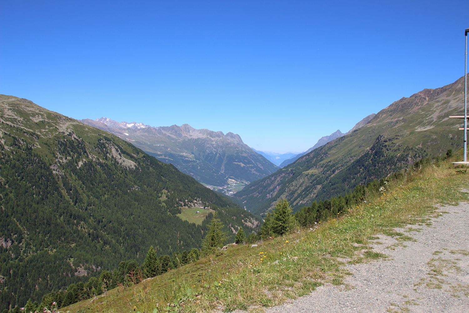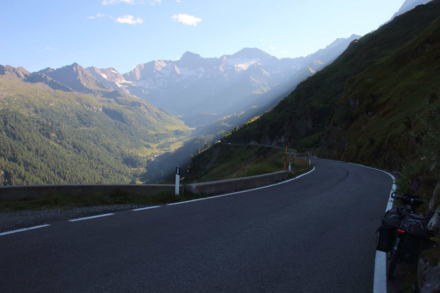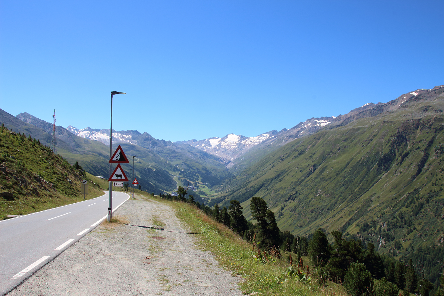 Durch den Etappenstart in Obergurgl kam auf der Passhöhe keine Hektik auf. Die Abfahrt, bei der 1796 Höhenmeter bergab zu fahren waren, zog sich dann doch etwas in die Länge, denn „Wer bremst, verliert!“ … zwar Zeit, aber dafür nicht das Leben. Die Entscheidung für fahrsicherheitstechnisch vertretbare Geschwindigkeiten bergab führte allerdings dazu, dass der Lichteinfall das Schießen ansprechender Fotos zunehmend erschwerte. Unterhalb von Moos in Passeier nahm die Temperatur trotz der bereits hinter den Bergen versunkenen Sonne spürbar zu, was für den folgenden Tag nichts Gutes erahnen ließ. Mit Sankt Leonhard in Passeier wurde „der Süden“ erreicht. Passend zur Wärme vor Ort rückten im Freiland wachsende Chinesische Hanfpalmen ins Blickfeld. Vor der Anfahrt zum Quartier wurde das untere Ende der Südostrampe des Timmelsjoch angefahren.