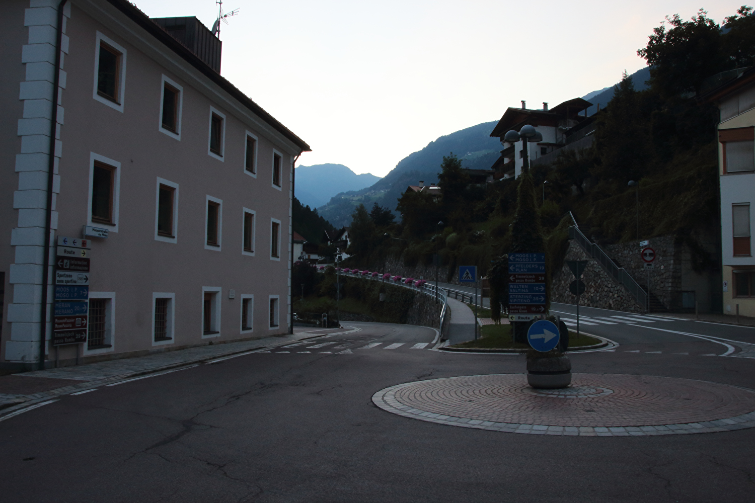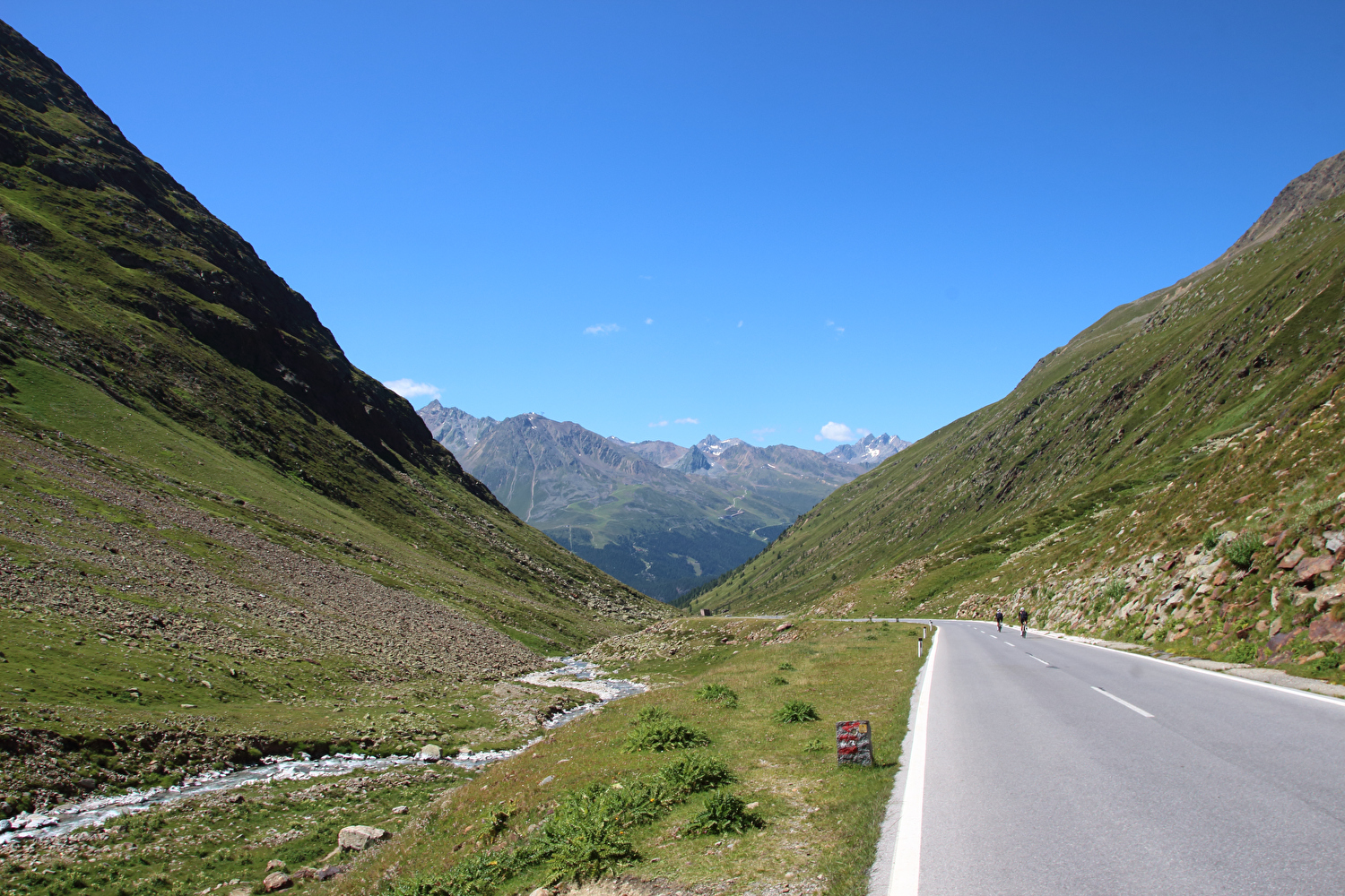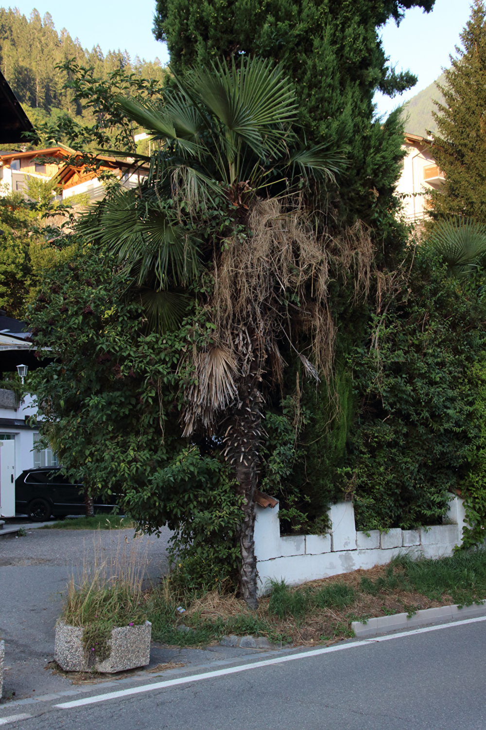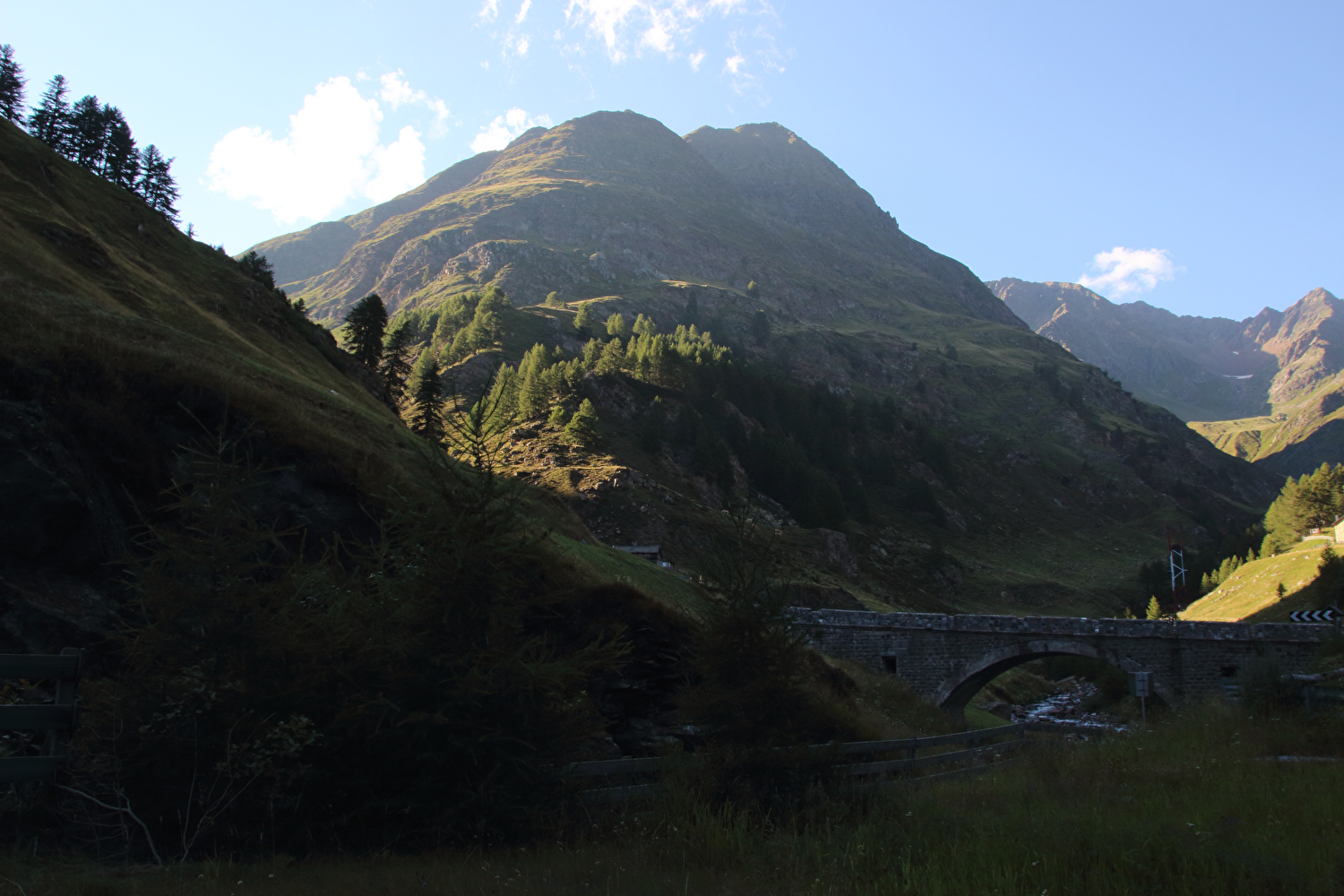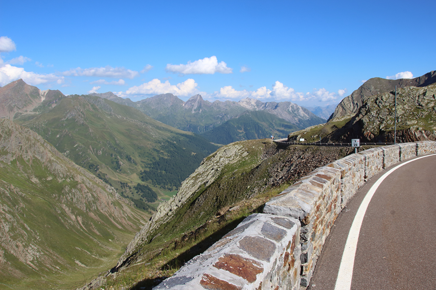 Durch den Etappenstart in Obergurgl kam auf der Passhöhe keine Hektik auf. Die Abfahrt, bei der 1796 Höhenmeter bergab zu fahren waren, zog sich dann doch etwas in die Länge, denn „Wer bremst, verliert!“ … zwar Zeit, aber dafür nicht das Leben. Die Entscheidung für fahrsicherheitstechnisch vertretbare Geschwindigkeiten bergab führte allerdings dazu, dass der Lichteinfall das Schießen ansprechender Fotos zunehmend erschwerte. Unterhalb von Moos in Passeier nahm die Temperatur trotz der bereits hinter den Bergen versunkenen Sonne spürbar zu, was für den folgenden Tag nichts Gutes erahnen ließ. Mit Sankt Leonhard in Passeier wurde „der Süden“ erreicht. Passend zur Wärme vor Ort rückten im Freiland wachsende Chinesische Hanfpalmen ins Blickfeld. Vor der Anfahrt zum Quartier wurde das untere Ende der Südostrampe des Timmelsjoch angefahren.