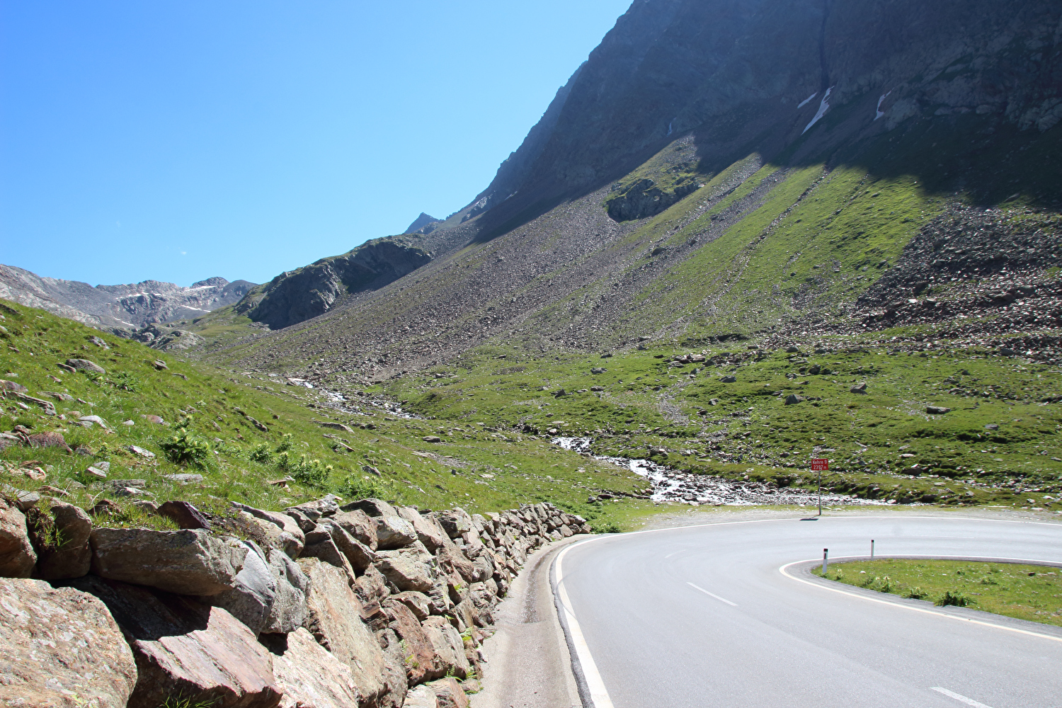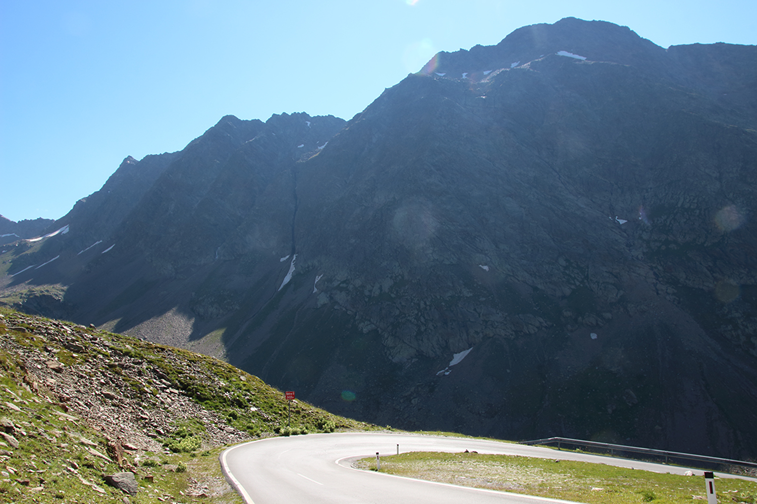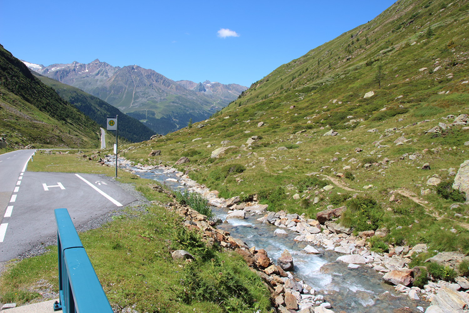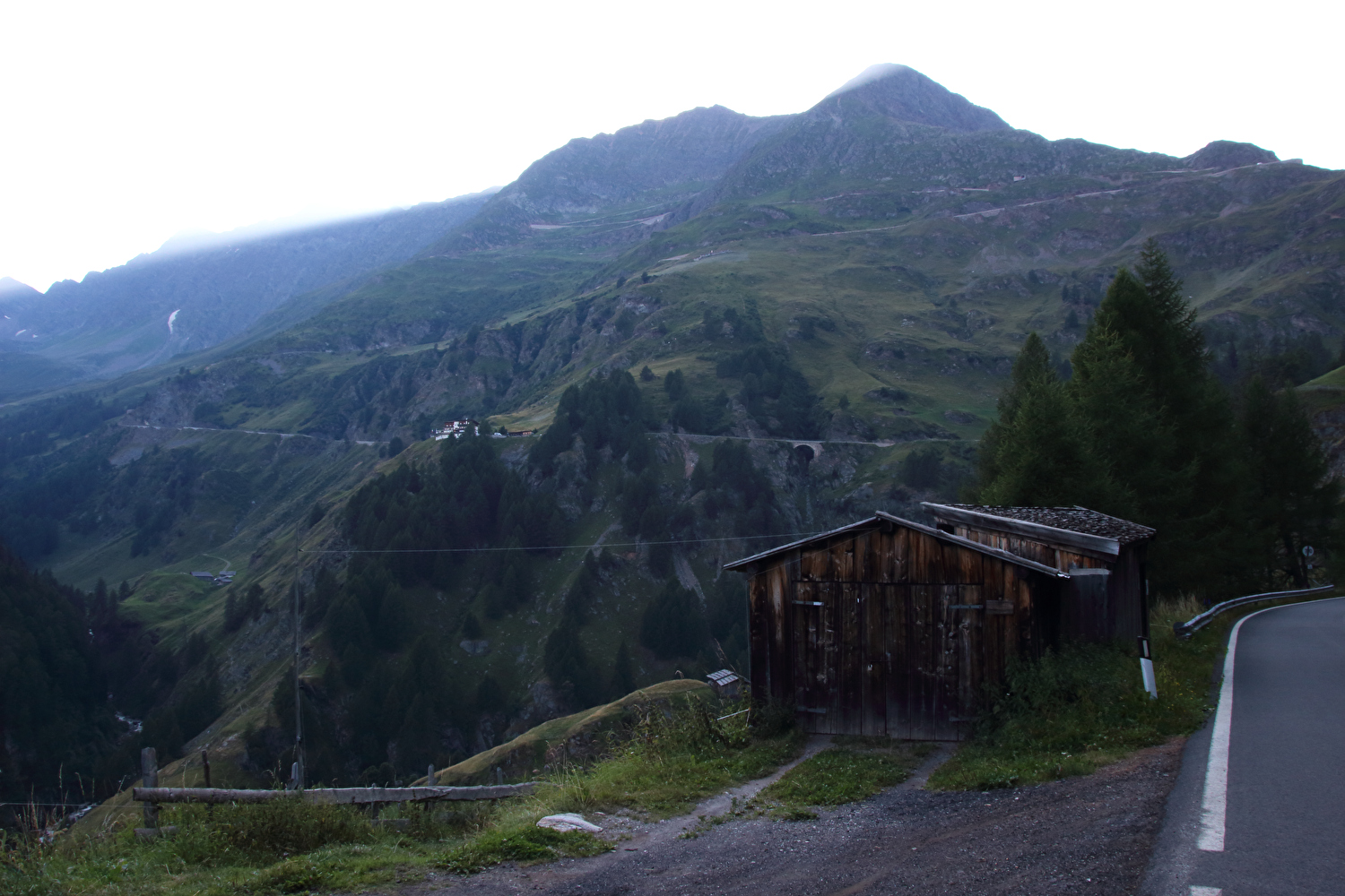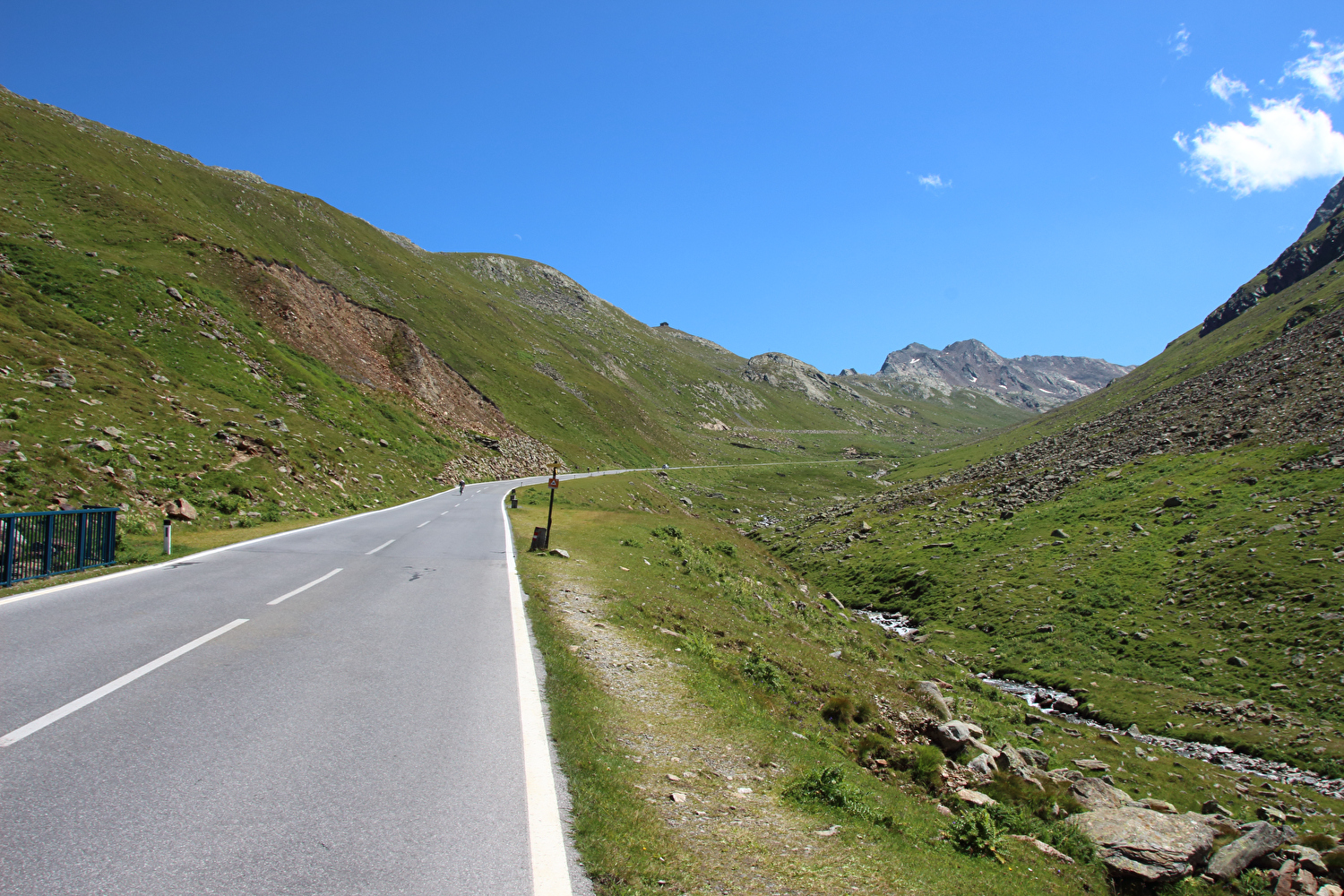 Ab dem Timmelseck nehmen die Steilstücke in der Nordwestrampe in Anzahl und Längen zu, weshalb längere Schiebepassagen bis zur Passhöhe nicht ausblieben. Dafür blieben bei dieser Etappe ein Speichenriss wie bei der Etappe am 26.07.2012 oder andere Schäden am Fahrrad aus. Stinkeverkehr quälte sich leider reichlich über die Passstraße. Die Fotos mögen darüber hinweg täuschen, da nach Möglichkeit die wenigen im Fokus der Kamera autofreien Momente dafür genutzt wurden. Diese Etappe war die einzige im Rahmen dieser Tour, die zumindest zeitweise oberhalb der montanen Baumgrenze verlief. Sie war auch die letzte Etappe im Rahmen dieser Tour, die Blicke auf Gletscher oder deren traurige Reste in der näheren Umgebung bot.