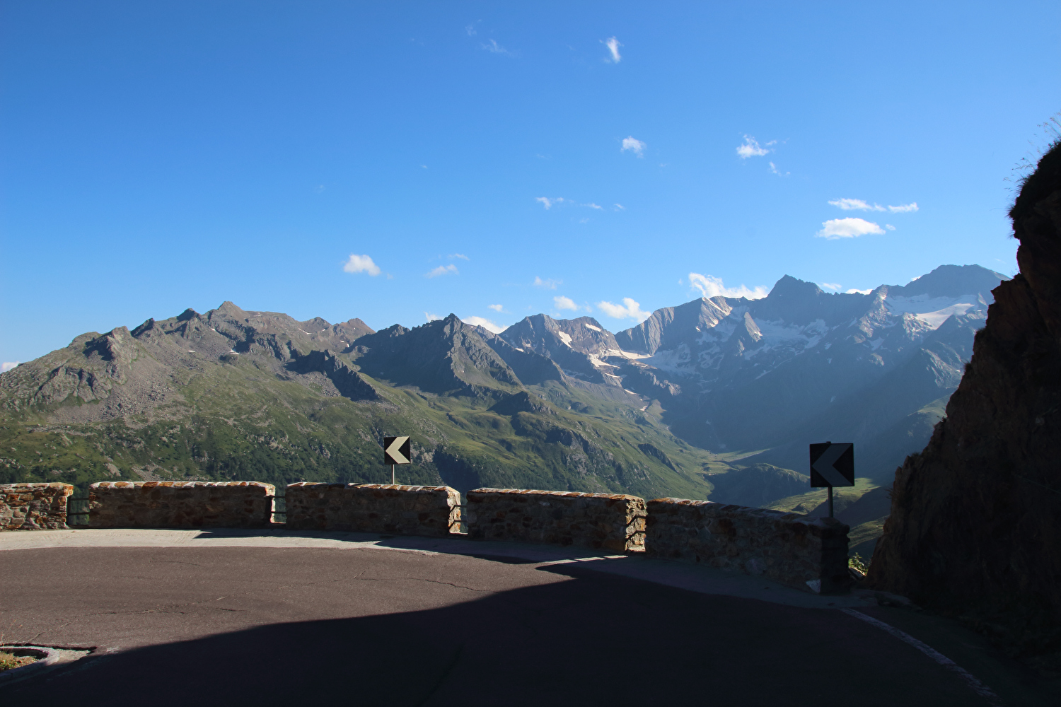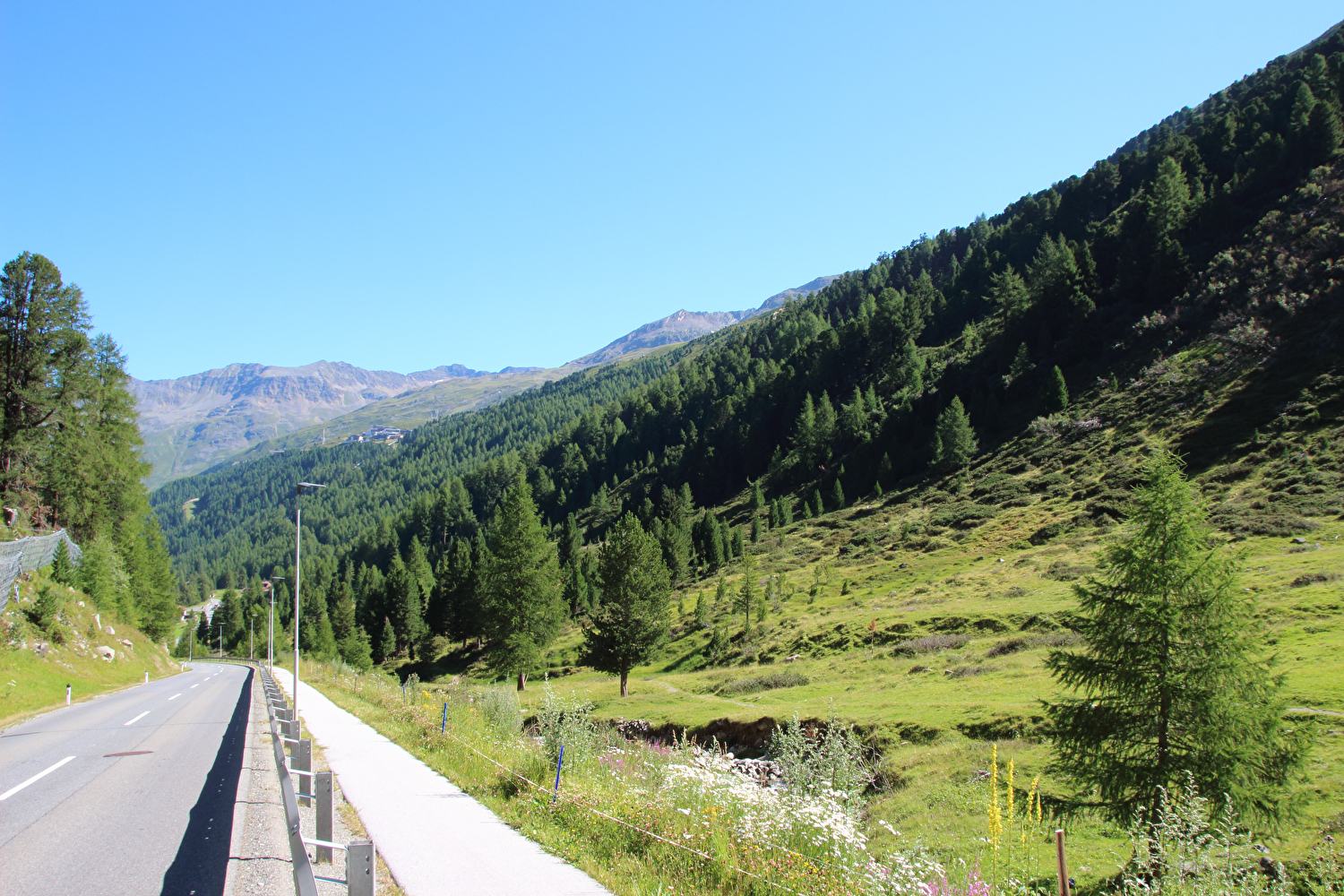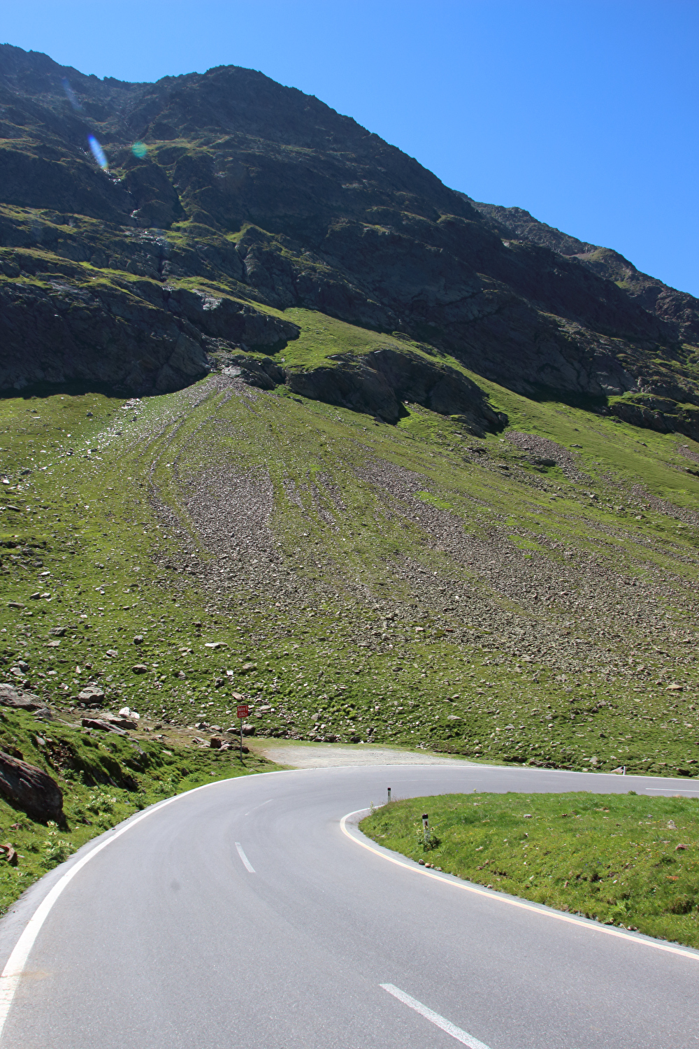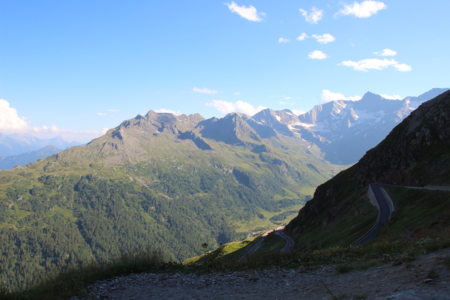 Ab dem Timmelseck nehmen die Steilstücke in der Nordwestrampe in Anzahl und Längen zu, weshalb längere Schiebepassagen bis zur Passhöhe nicht ausblieben. Dafür blieben bei dieser Etappe ein Speichenriss wie bei der Etappe am 26.07.2012 oder andere Schäden am Fahrrad aus. Stinkeverkehr quälte sich leider reichlich über die Passstraße. Die Fotos mögen darüber hinweg täuschen, da nach Möglichkeit die wenigen im Fokus der Kamera autofreien Momente dafür genutzt wurden. Diese Etappe war die einzige im Rahmen dieser Tour, die zumindest zeitweise oberhalb der montanen Baumgrenze verlief. Sie war auch die letzte Etappe im Rahmen dieser Tour, die Blicke auf Gletscher oder deren traurige Reste in der näheren Umgebung bot.