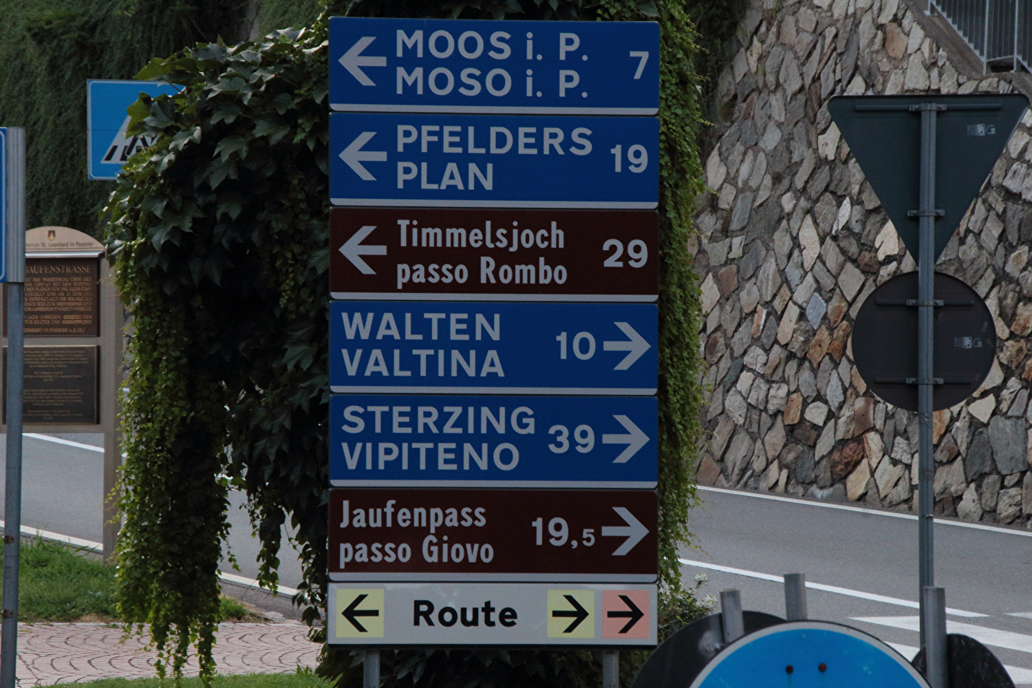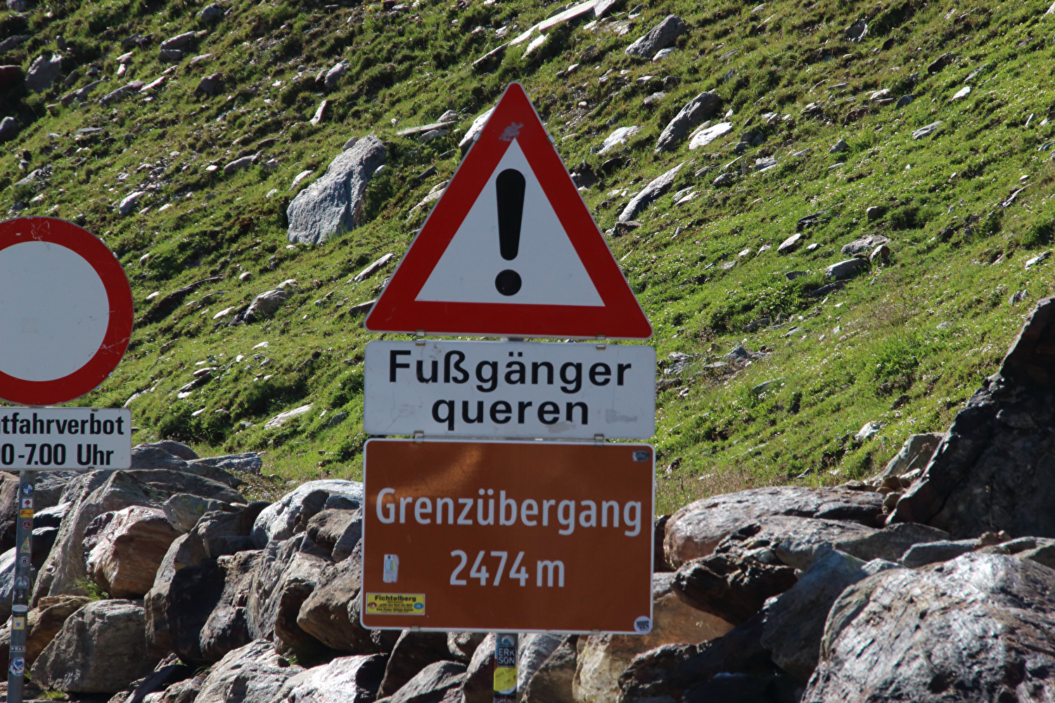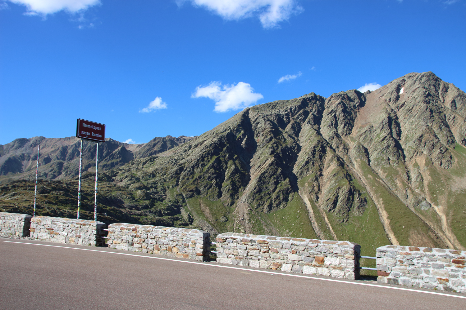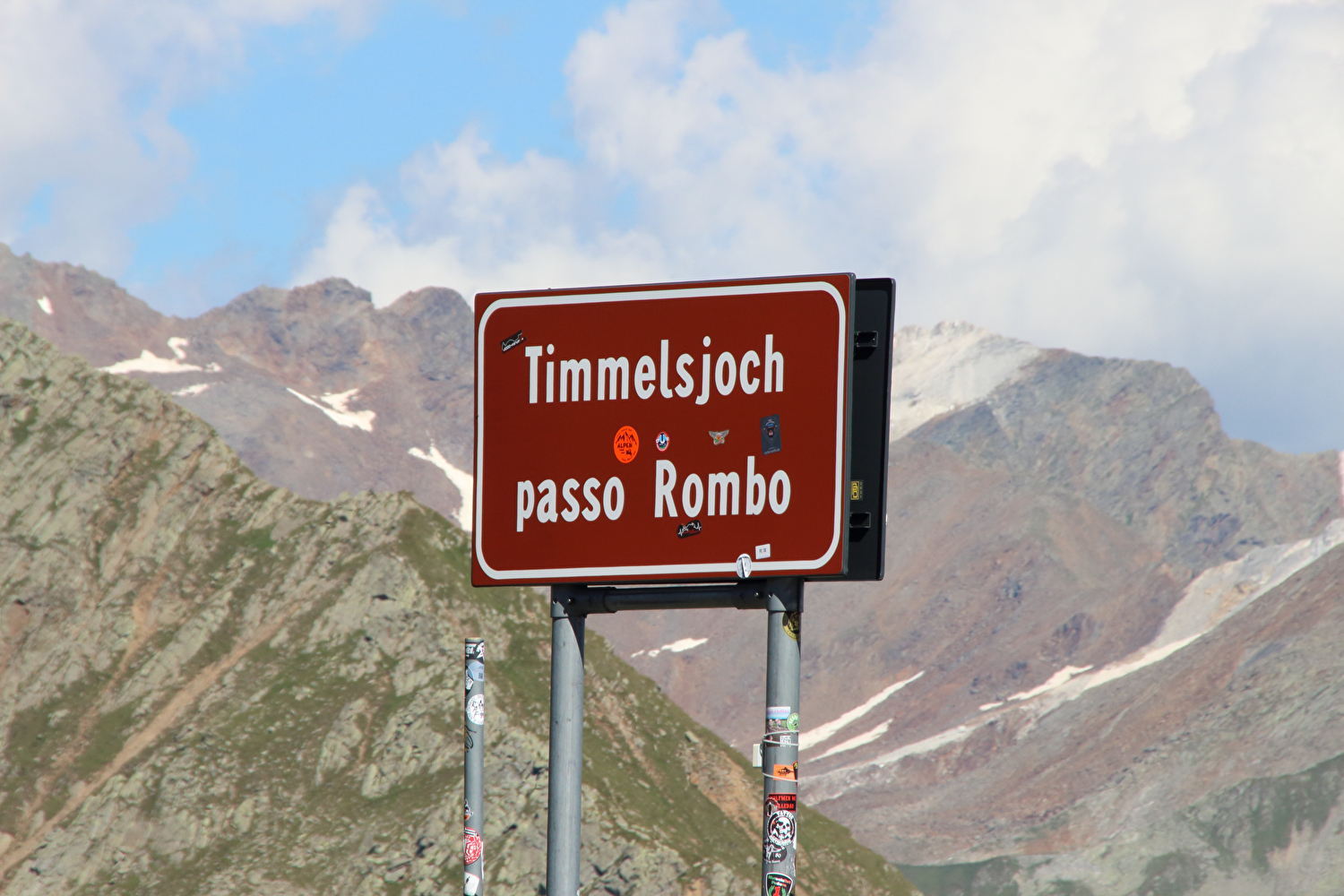Bemerkenswert ist, dass anders als am 26.07.2012 auf der Passhöhe eines so hohen Passes ein Passhöhenschild ohne Höhenangabe steht. Die mag damit zusammenhängen, dass für die Passhöhe teilweise immer noch die falsche Höhenangabe 2509 m.ü.A. kursiert, obwohl die Passhöhe auf 2474 m.ü.A. liegt, was in den offiziellen österreichischen Karten schon lange korrekt vermerkt ist. Anders als am 26.07.2012 steht auf der Passhöhe einige Meter entfernt vom Passhöhenschild ein etwas unauffälliges Schild mit der korrekten Höhenangabe. Im Bereich der Passhöhe verläuft die Staatsgrenze zwischen Österreich und Italien. Die sonst an europäischen Staatsgrenzen übliche Beschilderung fehlt, weshalb der genaue Grenzverlauf ohne Hilfsmittel nicht ersichtlich ist. An der Staatsgrenze wechselt die Passstraße ihren Namen. Auf italienischer Seite heißt sie „Strada Statale 44 bis Passo del Rombo“ oder deutsch „Timmelsjochstraße“, abgekürzt in beiden Sprachen „SS44bis“, wobei das Kürzel „SS“ in Italien und damit auch in Südtirol für „Strada Statale“ sowie in Südtirol auch für „Staatsstraße“ steht und in diesem Kontext absolut nichts mit einer Organisation aus der dunkelsten deutschen Vergangenheit zu tun hat. Die SS44bis bildet die Südostrampe des Timmelsjoch, italienisch „Passo del Rombo“. „bis“ hinter der Straßennummer bezeichnet in Italien einen Abzweig von der Straße gleicher Bezeichnung, hier also der SS44, die zwischen Meran und Sterzing verläuft und von der die SS44bis in Sankt Leonhard in Passeier abzweigt.