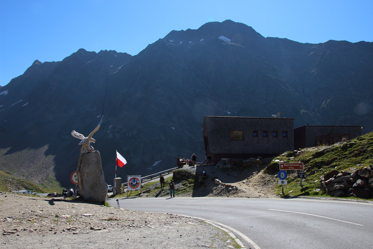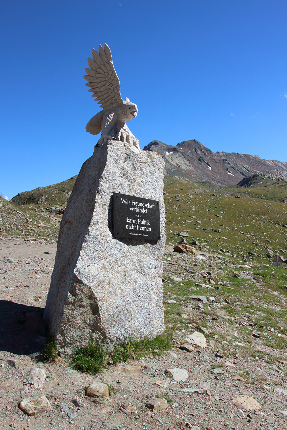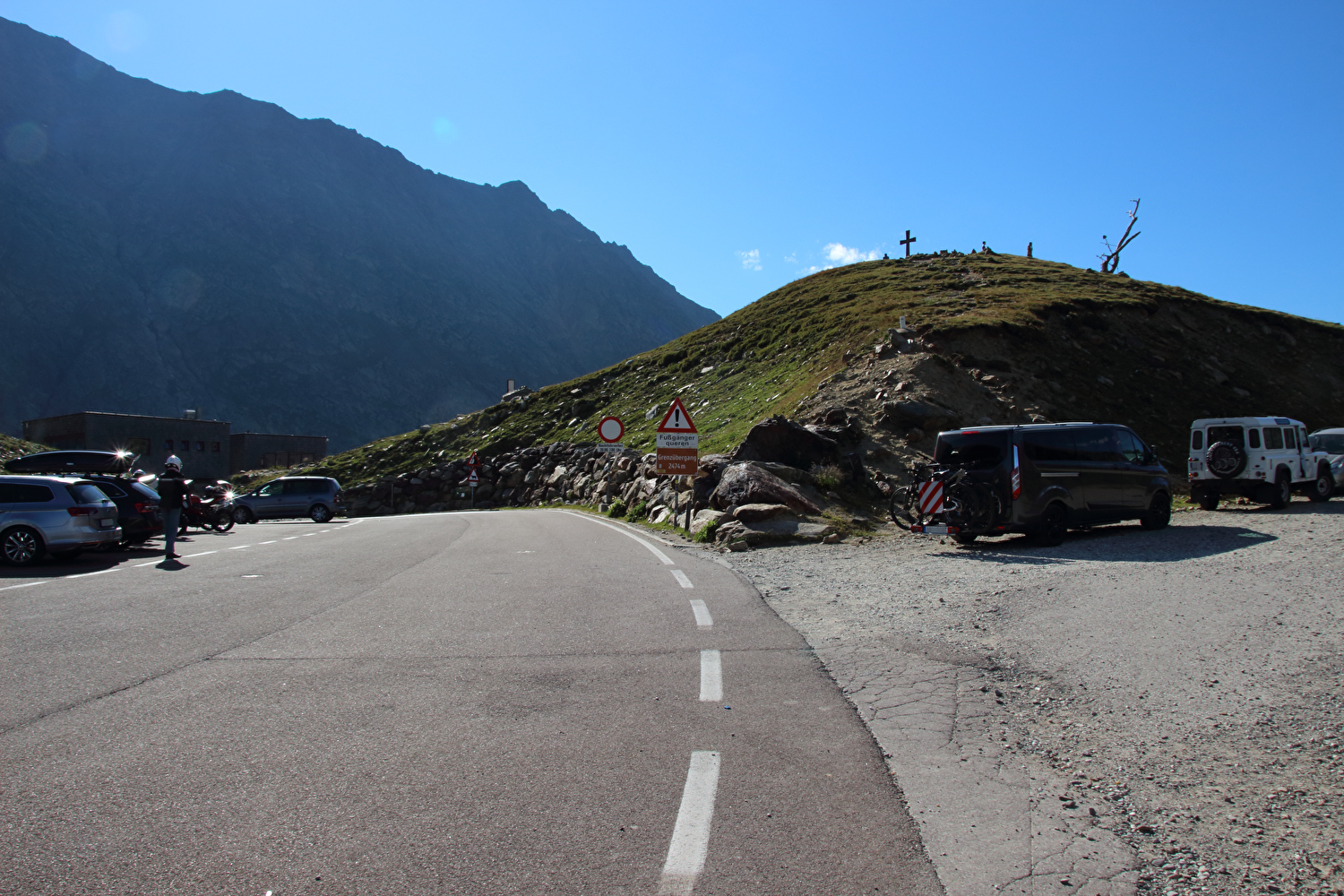 Bemerkenswert ist, dass anders als am 26.07.2012 auf der Passhöhe eines so hohen Passes ein Passhöhenschild ohne Höhenangabe steht. Die mag damit zusammenhängen, dass für die Passhöhe teilweise immer noch die falsche Höhenangabe 2509 m.ü.A. kursiert, obwohl die Passhöhe auf 2474 m.ü.A. liegt, was in den offiziellen österreichischen Karten schon lange korrekt vermerkt ist. Anders als am 26.07.2012 steht auf der Passhöhe einige Meter entfernt vom Passhöhenschild ein etwas unauffälliges Schild mit der korrekten Höhenangabe. Im Bereich der Passhöhe verläuft die Staatsgrenze zwischen Österreich und Italien. Die sonst an europäischen Staatsgrenzen übliche Beschilderung fehlt, weshalb der genaue Grenzverlauf ohne Hilfsmittel nicht ersichtlich ist. An der Staatsgrenze wechselt die Passstraße ihren Namen. Auf italienischer Seite heißt sie „Strada Statale 44 bis Passo del Rombo“ oder deutsch „Timmelsjochstraße“, abgekürzt in beiden Sprachen „SS44bis“, wobei das Kürzel „SS“ in Italien und damit auch in Südtirol für „Strada Statale“ sowie in Südtirol auch für „Staatsstraße“ steht und in diesem Kontext absolut nichts mit einer Organisation aus der dunkelsten deutschen Vergangenheit zu tun hat. Die SS44bis bildet die Südostrampe des Timmelsjoch, italienisch „Passo del Rombo“. „bis“ hinter der Straßennummer bezeichnet in Italien einen Abzweig von der Straße gleicher Bezeichnung, hier also der SS44, die zwischen Meran und Sterzing verläuft und von der die SS44bis in Sankt Leonhard in Passeier abzweigt.