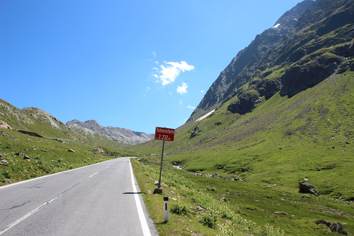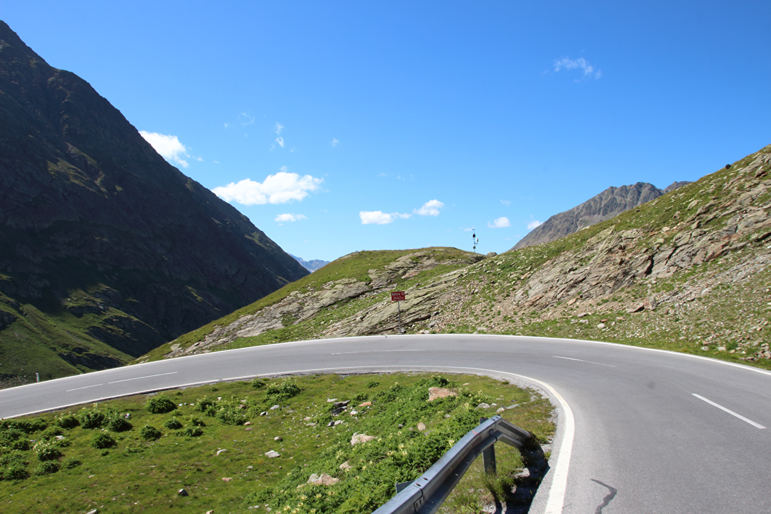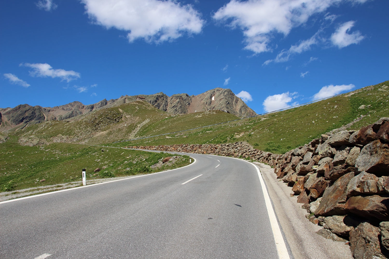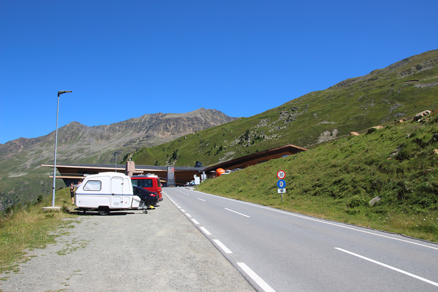 Bemerkenswert ist, dass anders als am 26.07.2012 auf der Passhöhe eines so hohen Passes ein Passhöhenschild ohne Höhenangabe steht. Die mag damit zusammenhängen, dass für die Passhöhe teilweise immer noch die falsche Höhenangabe 2509 m.ü.A. kursiert, obwohl die Passhöhe auf 2474 m.ü.A. liegt, was in den offiziellen österreichischen Karten schon lange korrekt vermerkt ist. Anders als am 26.07.2012 steht auf der Passhöhe einige Meter entfernt vom Passhöhenschild ein etwas unauffälliges Schild mit der korrekten Höhenangabe. Im Bereich der Passhöhe verläuft die Staatsgrenze zwischen Österreich und Italien. Die sonst an europäischen Staatsgrenzen übliche Beschilderung fehlt, weshalb der genaue Grenzverlauf ohne Hilfsmittel nicht ersichtlich ist. An der Staatsgrenze wechselt die Passstraße ihren Namen. Auf italienischer Seite heißt sie „Strada Statale 44 bis Passo del Rombo“ oder deutsch „Timmelsjochstraße“, abgekürzt in beiden Sprachen „SS44bis“, wobei das Kürzel „SS“ in Italien und damit auch in Südtirol für „Strada Statale“ sowie in Südtirol auch für „Staatsstraße“ steht und in diesem Kontext absolut nichts mit einer Organisation aus der dunkelsten deutschen Vergangenheit zu tun hat. Die SS44bis bildet die Südostrampe des Timmelsjoch, italienisch „Passo del Rombo“. „bis“ hinter der Straßennummer bezeichnet in Italien einen Abzweig von der Straße gleicher Bezeichnung, hier also der SS44, die zwischen Meran und Sterzing verläuft und von der die SS44bis in Sankt Leonhard in Passeier abzweigt.