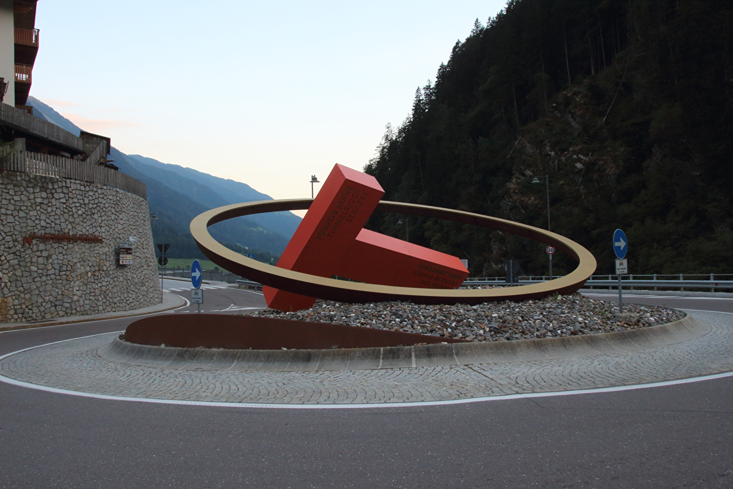 Die große Metallskulptur in der Mitte eines Kreisels, die ein rotes T, das von einem goldfarbenen Kreis umgeben ist, zeigt und vermutlich zum fünfzigjährigen Bestehen der Timmelsjochstraße (SS44bis) errichtet wurde, täuscht. Dort liegt nicht das untere Ende der Südostrampe des Timmelsjoch. Dieses befindet sich etwas versteckt mitten im Ort an einem anderen Kreisel und fällt dort mit dem unteren Ende der Südwestrampe des Jaufenpass, der Jaufenpassstraße (SS44) zusammen.