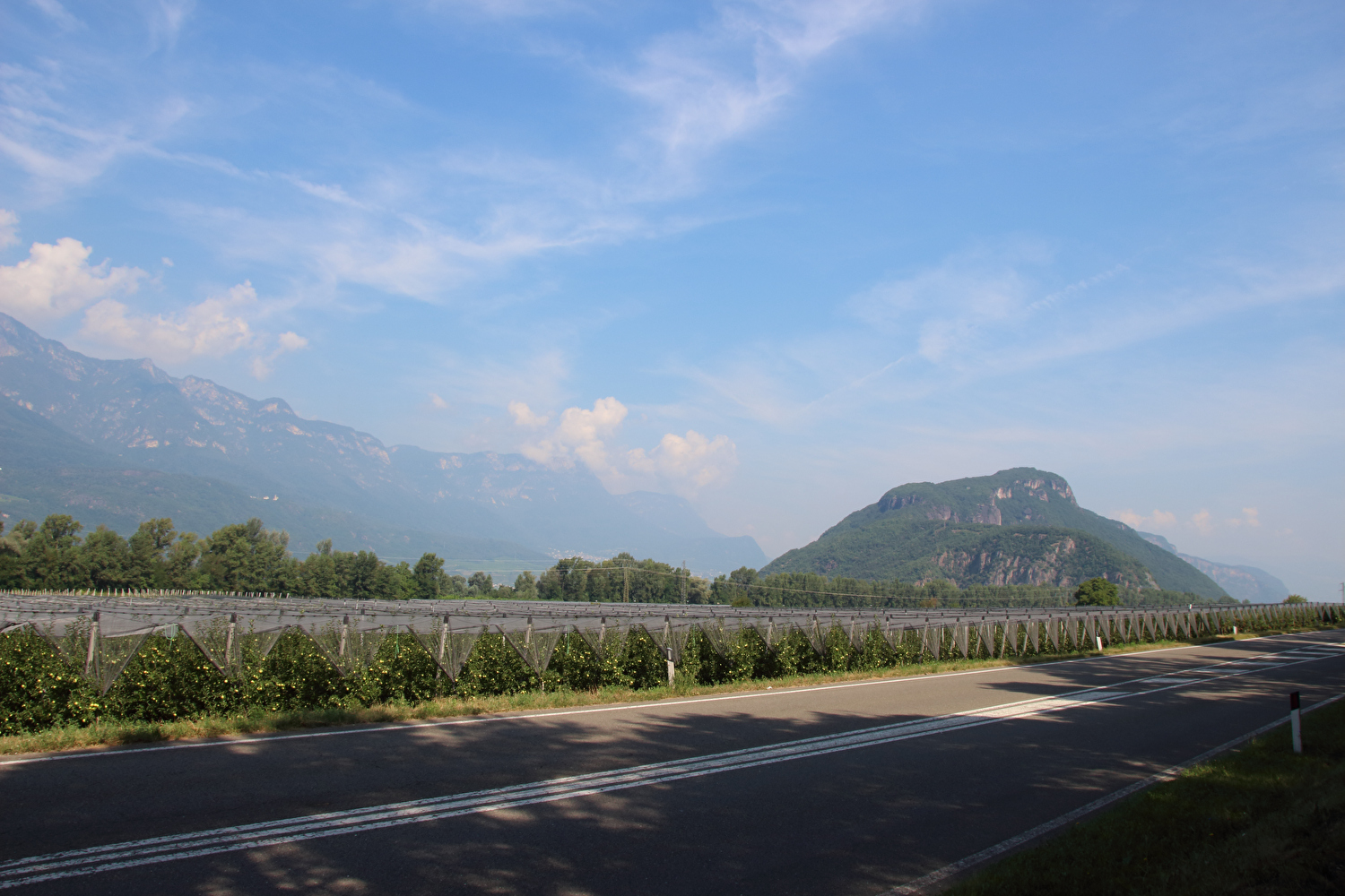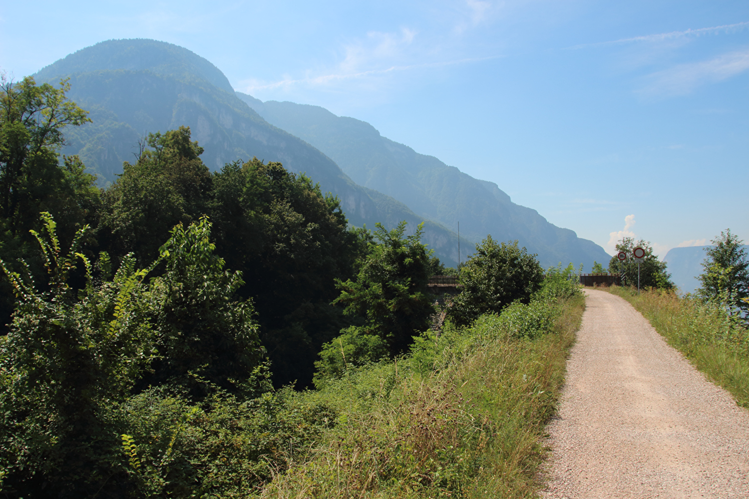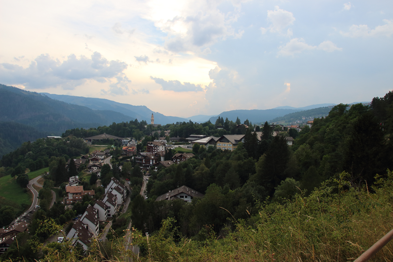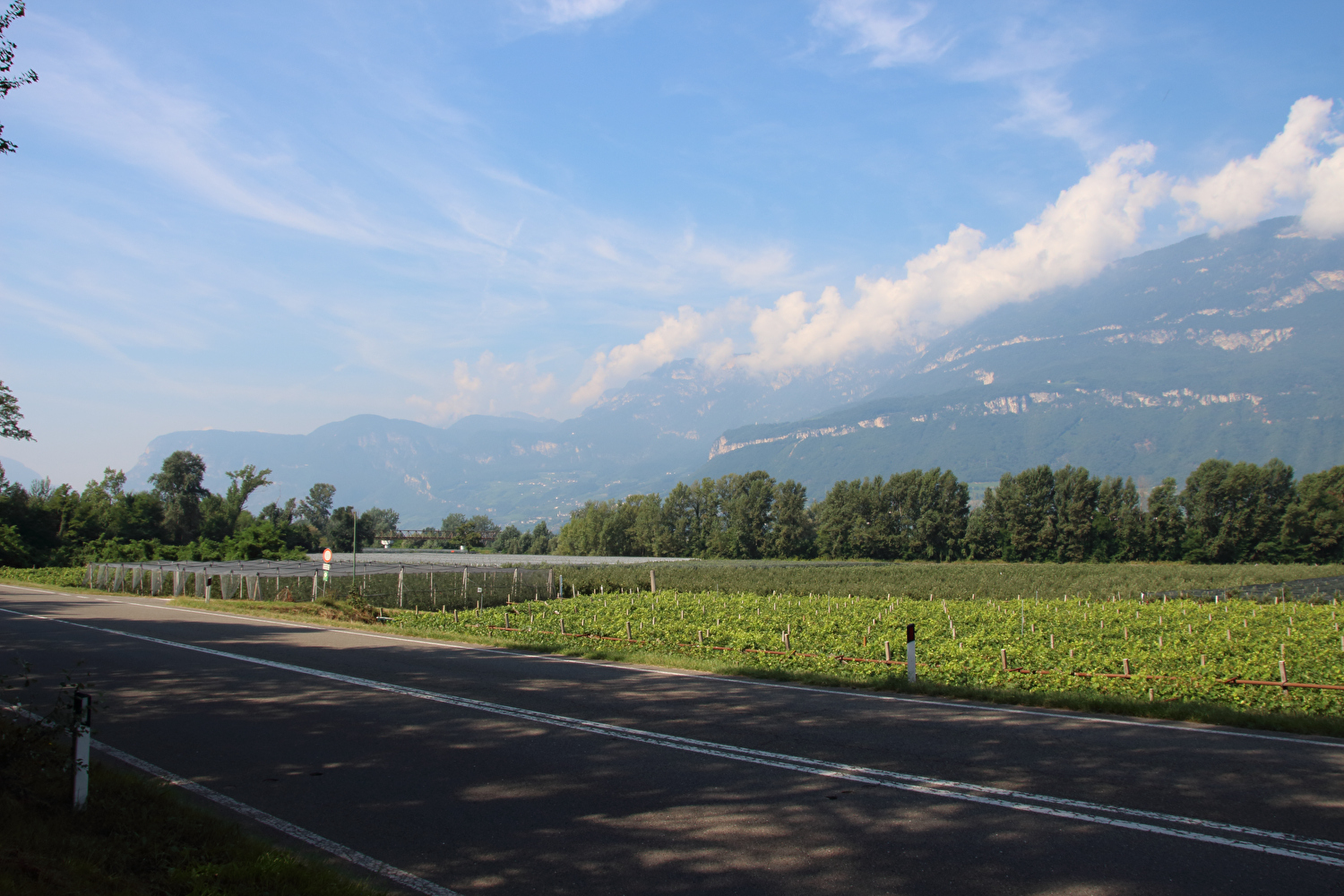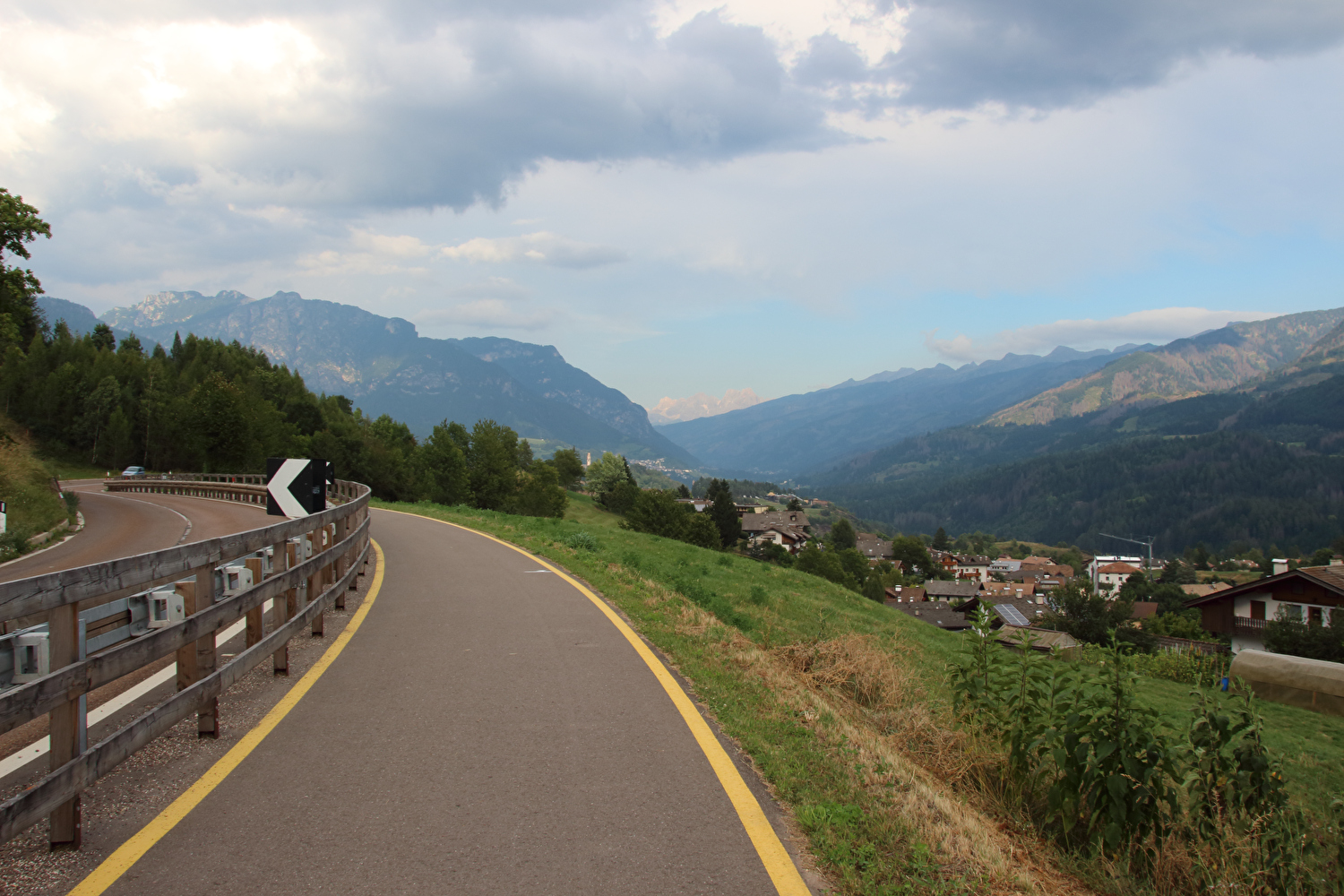 Wegen des sonnig-schwülheißen Wetters fiel die Wahl auf den Fleimstalbahn-Radweg. Die Luft war schon am Morgen zum Schneiden. Da musste nicht auch noch eine Wolke aus Autoabgasen und Feinstaub bergauf durchgezogen werden. Anders als auf dem Etsch-Radweg am Vortag hielt sich der Fahrradverkehr auf dem Fleimstalbahn-Radweg in überschaubaren Grenzen. Oberhalb des 2. Tunnels erfolgte eine baustellenbedingte Umleitung auf einem sehr steilen Weg nach Kalditsch, womit nach der kurzen steilen Rampe zwischen SS12 und ehemaliger Bahntrasse und der Ortsdurchfahrt Pinzon die dritte Schiebestrecke anstand. Von Kalditsch aus boten sich die letzten weiten Blicke ins Etschtal. Etwa ab Kalditsch besserte sich auch allmählich die Luftqualität, schwülwarm blieb es aber bis zum Etappenende. Nach reichlich mittelgebirgiger Landschaft zeigten sich mit dem Blick über San-Lugano auch wieder alpine Landschaften am Horizont. In San Lugano wurde für den Rest der Etappe auf die im Hang verlaufende SS48 gewechselt. Ein Wechsel auf den knapp südlich von San Lugano ausgeschildeten Radweg „pista ciclabile val di Fiemme-Fassa“ hätte zusätzliche Streckenkilometer und vor allem zusätzliche Höhenmeter bergauf gebracht, was im Rahmen dieser Etappe entbehrlich war. Zudem hätte der Wechsel eine Fahrt auf dem Talboden des Val di Fiemme bedeutet, wo es zum Abend hin schneller dunkel wurde und sich auch keine so weiten Blicke über das Tal wie von der SS48 aus geboten hätten. Knapp südlich von San-Lugano wurde die Grenze zwischen den Provinzen Südtirol (amtlich: „Autonome Provinz Bozen – Südtirol | Provincia Autonoma di Bolzano – Alto Adige“) und Trentino (amtlich: „Provincia autonoma di Trento“) und damit einhergehend auch die Sprachgrenze zwischen „bilingual deutsch & italienisch“ und „italienisch“ überquert. Zum späteren Nachmittag und Abend hin bildeten sich auch höhere Quellwolken, von denen einige nach Regen aussahen, aber es blieb bis zum Ende der Etappe trocken. Von der SS48 aus reichte der Blick bis zur Gruppo delle Pale in den Dolomiten, die kurz vor Etappenende Alpenglühen zeigte.