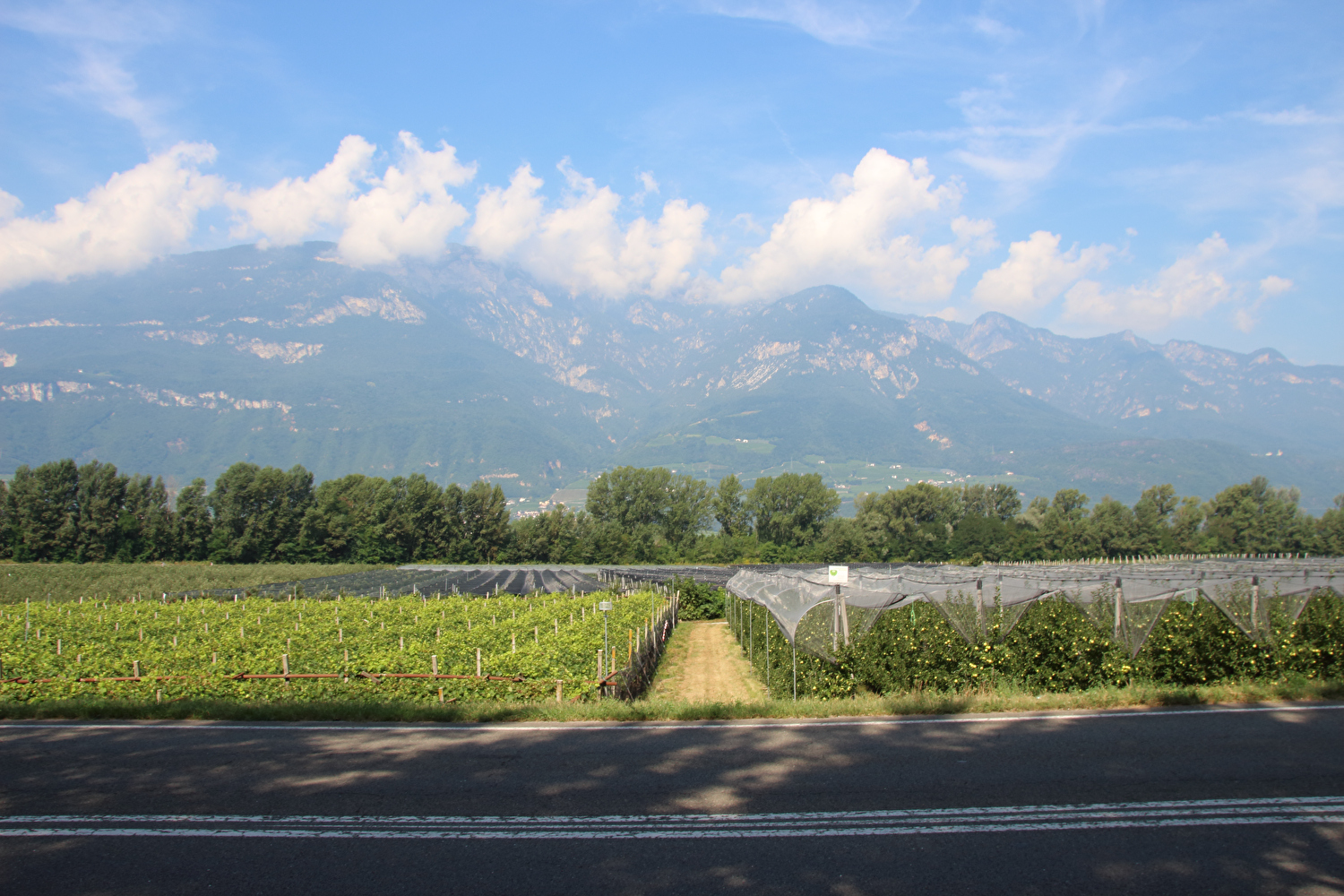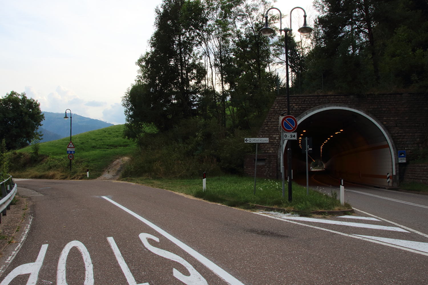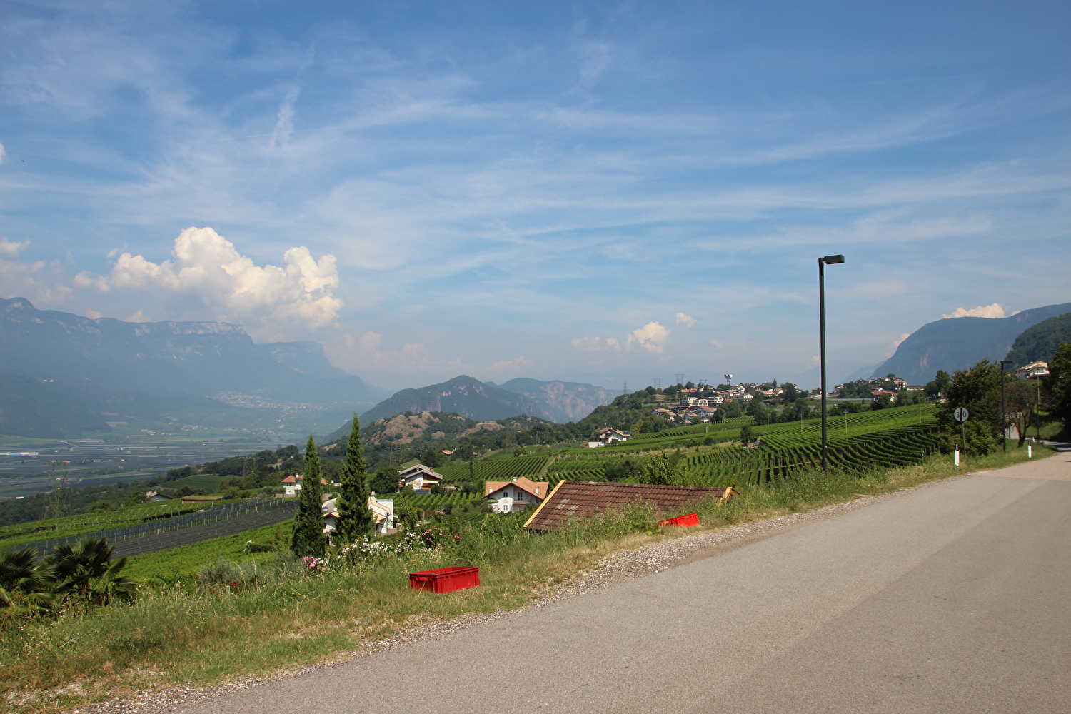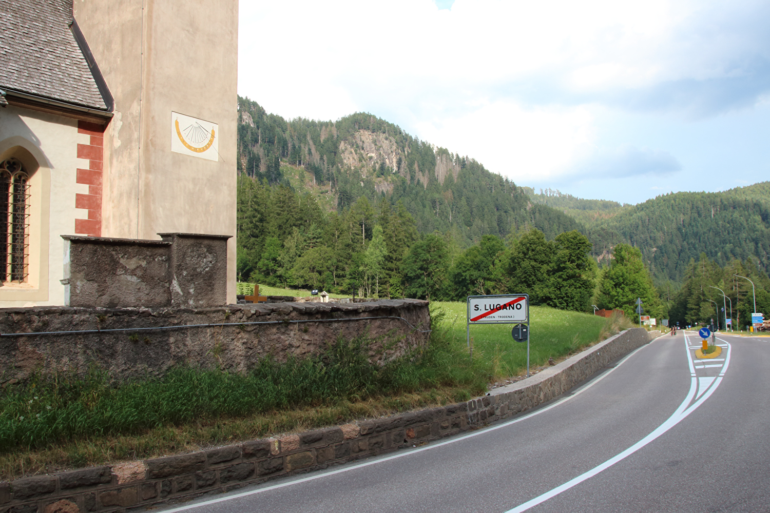 Wegen des sonnig-schwülheißen Wetters fiel die Wahl auf den Fleimstalbahn-Radweg. Die Luft war schon am Morgen zum Schneiden. Da musste nicht auch noch eine Wolke aus Autoabgasen und Feinstaub bergauf durchgezogen werden. Anders als auf dem Etsch-Radweg am Vortag hielt sich der Fahrradverkehr auf dem Fleimstalbahn-Radweg in überschaubaren Grenzen. Oberhalb des 2. Tunnels erfolgte eine baustellenbedingte Umleitung auf einem sehr steilen Weg nach Kalditsch, womit nach der kurzen steilen Rampe zwischen SS12 und ehemaliger Bahntrasse und der Ortsdurchfahrt Pinzon die dritte Schiebestrecke anstand. Von Kalditsch aus boten sich die letzten weiten Blicke ins Etschtal. Etwa ab Kalditsch besserte sich auch allmählich die Luftqualität, schwülwarm blieb es aber bis zum Etappenende. Nach reichlich mittelgebirgiger Landschaft zeigten sich mit dem Blick über San-Lugano auch wieder alpine Landschaften am Horizont. In San Lugano wurde für den Rest der Etappe auf die im Hang verlaufende SS48 gewechselt. Ein Wechsel auf den knapp südlich von San Lugano ausgeschildeten Radweg „pista ciclabile val di Fiemme-Fassa“ hätte zusätzliche Streckenkilometer und vor allem zusätzliche Höhenmeter bergauf gebracht, was im Rahmen dieser Etappe entbehrlich war. Zudem hätte der Wechsel eine Fahrt auf dem Talboden des Val di Fiemme bedeutet, wo es zum Abend hin schneller dunkel wurde und sich auch keine so weiten Blicke über das Tal wie von der SS48 aus geboten hätten. Knapp südlich von San-Lugano wurde die Grenze zwischen den Provinzen Südtirol (amtlich: „Autonome Provinz Bozen – Südtirol | Provincia Autonoma di Bolzano – Alto Adige“) und Trentino (amtlich: „Provincia autonoma di Trento“) und damit einhergehend auch die Sprachgrenze zwischen „bilingual deutsch & italienisch“ und „italienisch“ überquert. Zum späteren Nachmittag und Abend hin bildeten sich auch höhere Quellwolken, von denen einige nach Regen aussahen, aber es blieb bis zum Ende der Etappe trocken. Von der SS48 aus reichte der Blick bis zur Gruppo delle Pale in den Dolomiten, die kurz vor Etappenende Alpenglühen zeigte.
