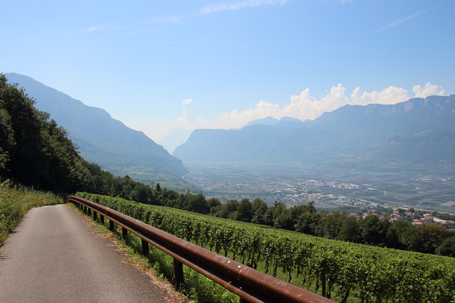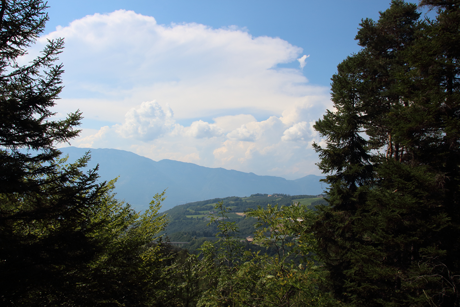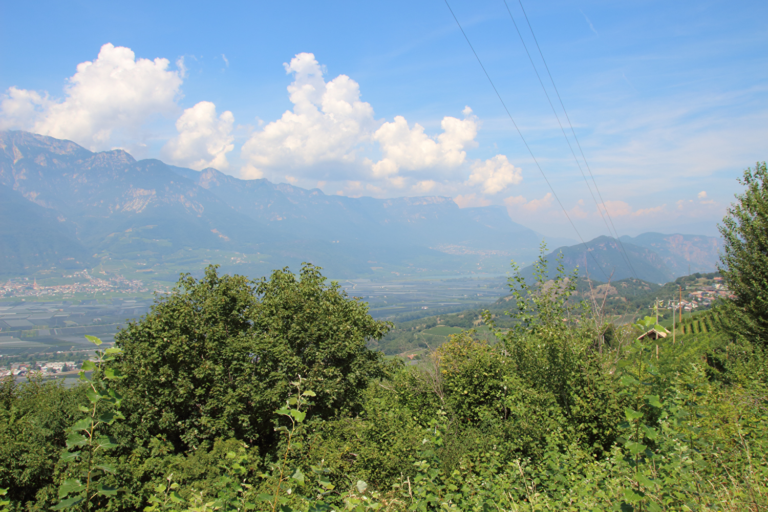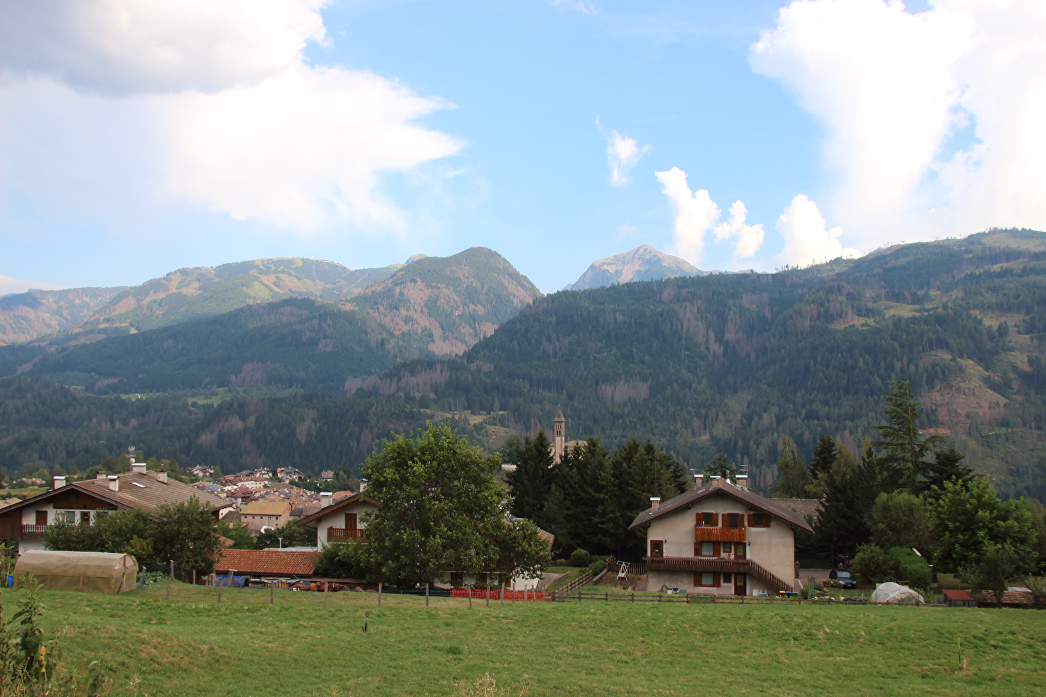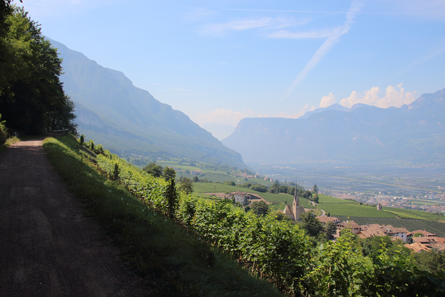 Wegen des sonnig-schwülheißen Wetters fiel die Wahl auf den Fleimstalbahn-Radweg. Die Luft war schon am Morgen zum Schneiden. Da musste nicht auch noch eine Wolke aus Autoabgasen und Feinstaub bergauf durchgezogen werden. Anders als auf dem Etsch-Radweg am Vortag hielt sich der Fahrradverkehr auf dem Fleimstalbahn-Radweg in überschaubaren Grenzen. Oberhalb des 2. Tunnels erfolgte eine baustellenbedingte Umleitung auf einem sehr steilen Weg nach Kalditsch, womit nach der kurzen steilen Rampe zwischen SS12 und ehemaliger Bahntrasse und der Ortsdurchfahrt Pinzon die dritte Schiebestrecke anstand. Von Kalditsch aus boten sich die letzten weiten Blicke ins Etschtal. Etwa ab Kalditsch besserte sich auch allmählich die Luftqualität, schwülwarm blieb es aber bis zum Etappenende. Nach reichlich mittelgebirgiger Landschaft zeigten sich mit dem Blick über San-Lugano auch wieder alpine Landschaften am Horizont. In San Lugano wurde für den Rest der Etappe auf die im Hang verlaufende SS48 gewechselt. Ein Wechsel auf den knapp südlich von San Lugano ausgeschildeten Radweg „pista ciclabile val di Fiemme-Fassa“ hätte zusätzliche Streckenkilometer und vor allem zusätzliche Höhenmeter bergauf gebracht, was im Rahmen dieser Etappe entbehrlich war. Zudem hätte der Wechsel eine Fahrt auf dem Talboden des Val di Fiemme bedeutet, wo es zum Abend hin schneller dunkel wurde und sich auch keine so weiten Blicke über das Tal wie von der SS48 aus geboten hätten. Knapp südlich von San-Lugano wurde die Grenze zwischen den Provinzen Südtirol (amtlich: „Autonome Provinz Bozen – Südtirol | Provincia Autonoma di Bolzano – Alto Adige“) und Trentino (amtlich: „Provincia autonoma di Trento“) und damit einhergehend auch die Sprachgrenze zwischen „bilingual deutsch & italienisch“ und „italienisch“ überquert. Zum späteren Nachmittag und Abend hin bildeten sich auch höhere Quellwolken, von denen einige nach Regen aussahen, aber es blieb bis zum Ende der Etappe trocken. Von der SS48 aus reichte der Blick bis zur Gruppo delle Pale in den Dolomiten, die kurz vor Etappenende Alpenglühen zeigte.