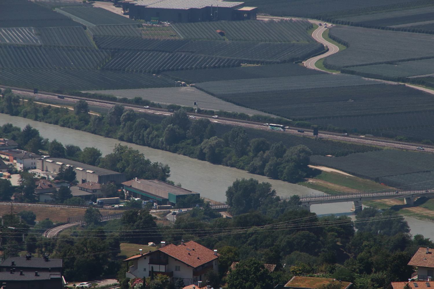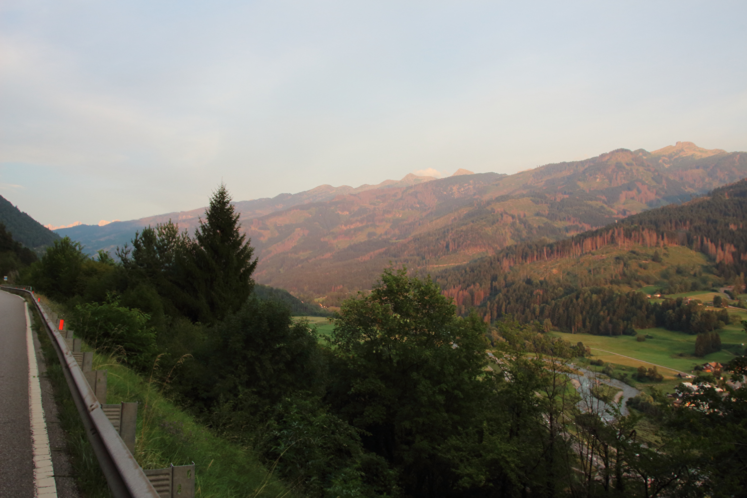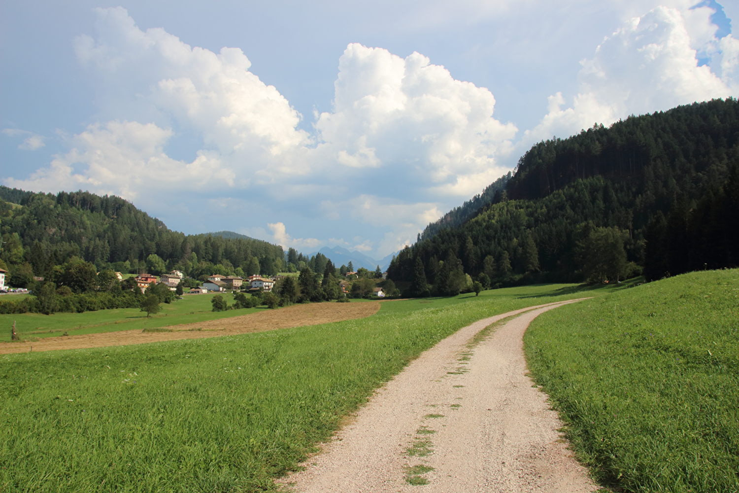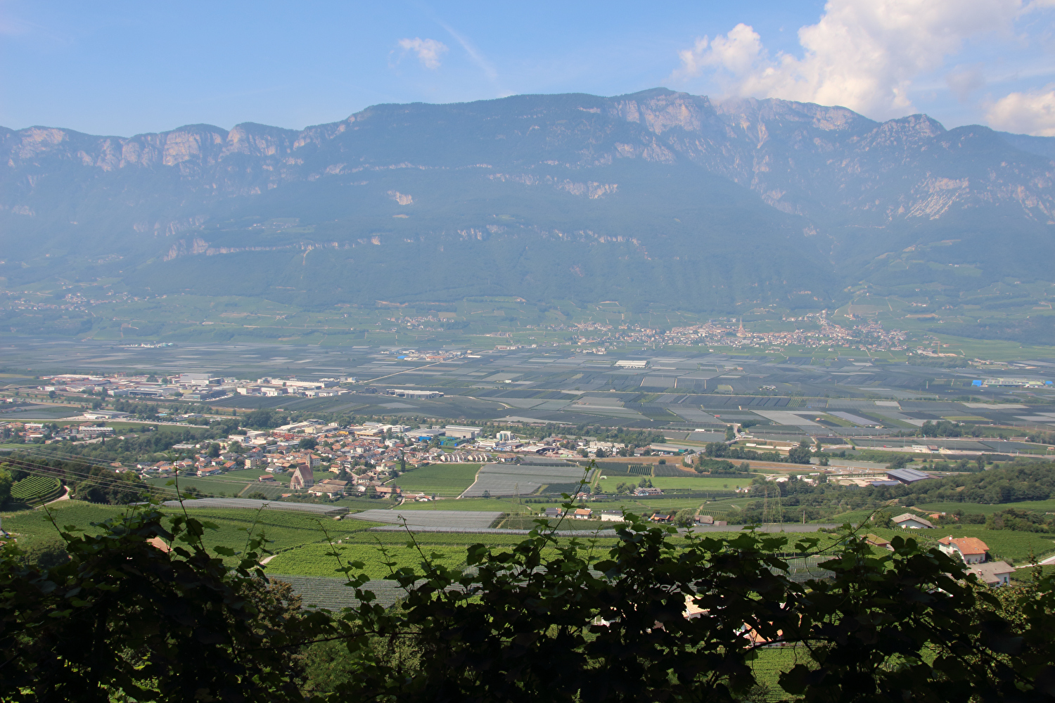 Wegen des sonnig-schwülheißen Wetters fiel die Wahl auf den Fleimstalbahn-Radweg. Die Luft war schon am Morgen zum Schneiden. Da musste nicht auch noch eine Wolke aus Autoabgasen und Feinstaub bergauf durchgezogen werden. Anders als auf dem Etsch-Radweg am Vortag hielt sich der Fahrradverkehr auf dem Fleimstalbahn-Radweg in überschaubaren Grenzen. Oberhalb des 2. Tunnels erfolgte eine baustellenbedingte Umleitung auf einem sehr steilen Weg nach Kalditsch, womit nach der kurzen steilen Rampe zwischen SS12 und ehemaliger Bahntrasse und der Ortsdurchfahrt Pinzon die dritte Schiebestrecke anstand. Von Kalditsch aus boten sich die letzten weiten Blicke ins Etschtal. Etwa ab Kalditsch besserte sich auch allmählich die Luftqualität, schwülwarm blieb es aber bis zum Etappenende. Nach reichlich mittelgebirgiger Landschaft zeigten sich mit dem Blick über San-Lugano auch wieder alpine Landschaften am Horizont. In San Lugano wurde für den Rest der Etappe auf die im Hang verlaufende SS48 gewechselt. Ein Wechsel auf den knapp südlich von San Lugano ausgeschildeten Radweg „pista ciclabile val di Fiemme-Fassa“ hätte zusätzliche Streckenkilometer und vor allem zusätzliche Höhenmeter bergauf gebracht, was im Rahmen dieser Etappe entbehrlich war. Zudem hätte der Wechsel eine Fahrt auf dem Talboden des Val di Fiemme bedeutet, wo es zum Abend hin schneller dunkel wurde und sich auch keine so weiten Blicke über das Tal wie von der SS48 aus geboten hätten. Knapp südlich von San-Lugano wurde die Grenze zwischen den Provinzen Südtirol (amtlich: „Autonome Provinz Bozen – Südtirol | Provincia Autonoma di Bolzano – Alto Adige“) und Trentino (amtlich: „Provincia autonoma di Trento“) und damit einhergehend auch die Sprachgrenze zwischen „bilingual deutsch & italienisch“ und „italienisch“ überquert. Zum späteren Nachmittag und Abend hin bildeten sich auch höhere Quellwolken, von denen einige nach Regen aussahen, aber es blieb bis zum Ende der Etappe trocken. Von der SS48 aus reichte der Blick bis zur Gruppo delle Pale in den Dolomiten, die kurz vor Etappenende Alpenglühen zeigte.